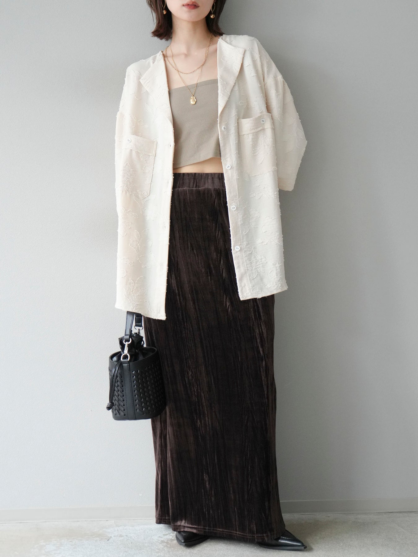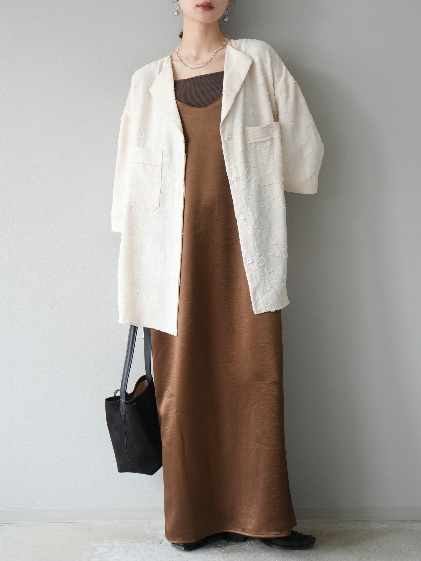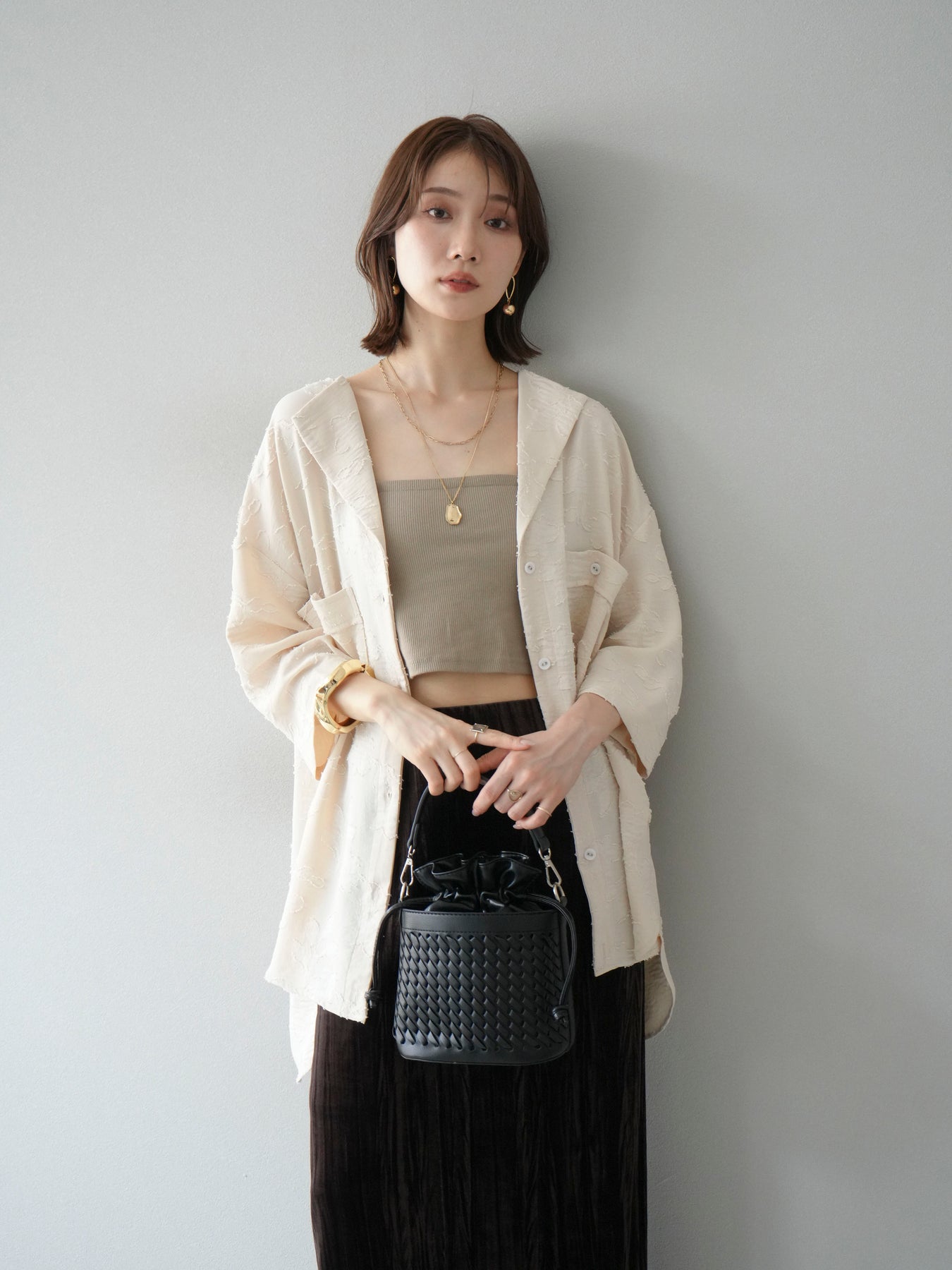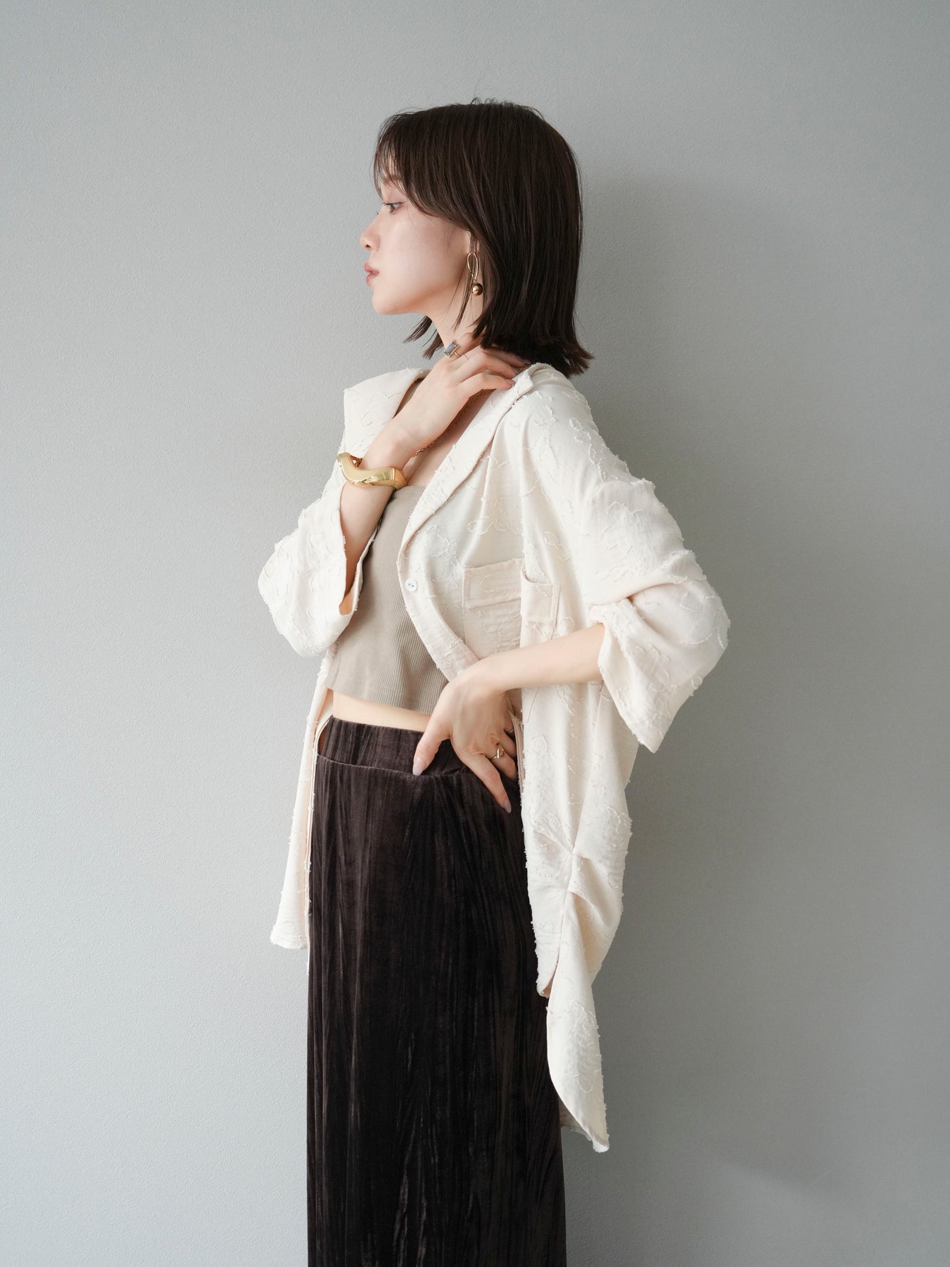 表情豊かなジャガード生地を使用したハーフスリーブシャツ。織りで浮き上がる柄が立体感を生み、シンプルながらも高級感のある雰囲気に仕上げています。ゆったりとしたシルエットとドロップショルダーが抜け感を演出し、さらりと羽織るだけでスタイリングが完成。軽やかな素材感で着心地も良く、デイリーにはもちろん、ジャケット感覚でライトアウターとしても活躍します。パンツにもスカートにも合わせやすく、季節の変わり目に取り入れたい一枚です。 ※ボトムス、キャミソール(インナー)以外の商品は一律でインナーは付属していません。