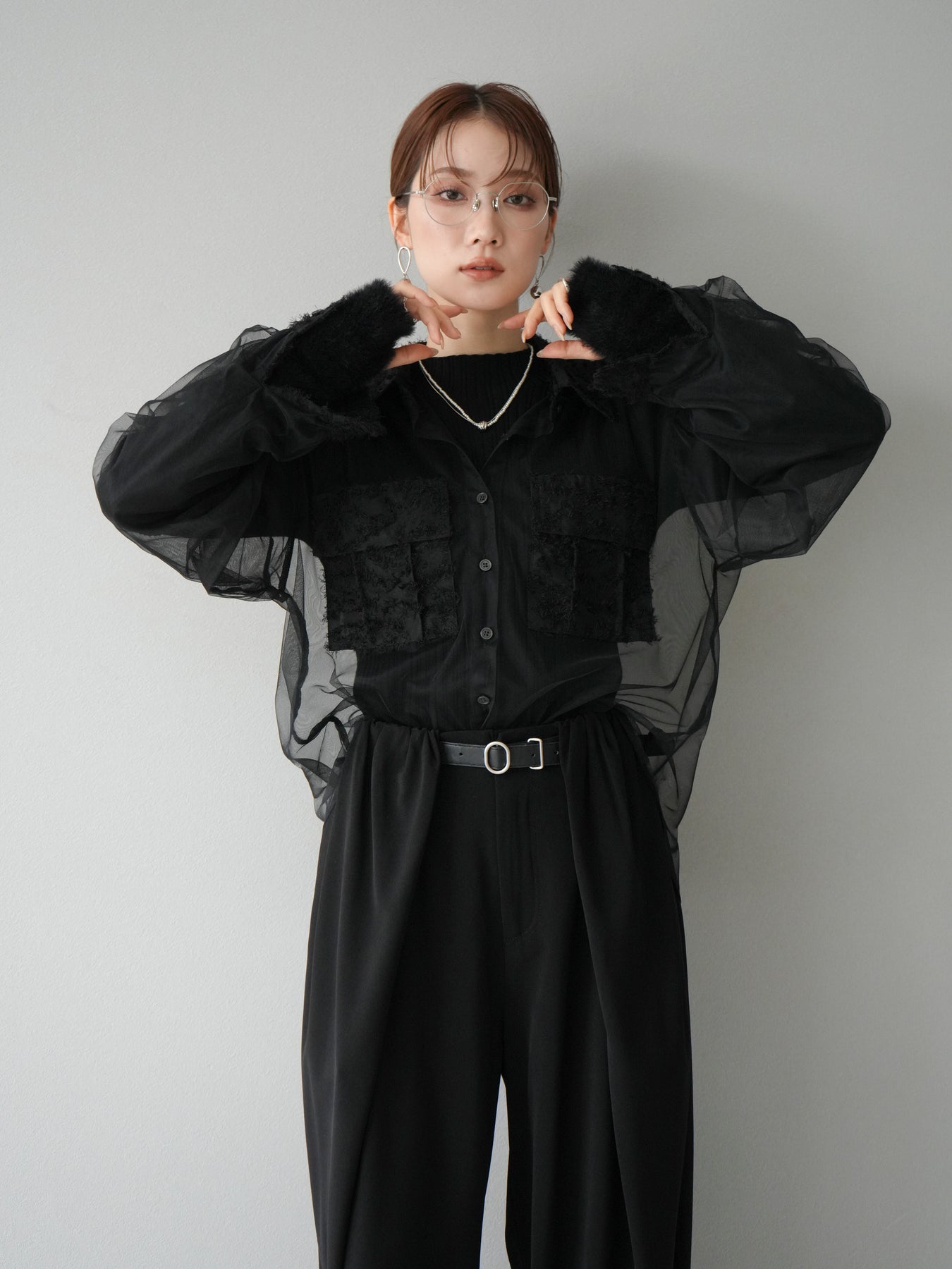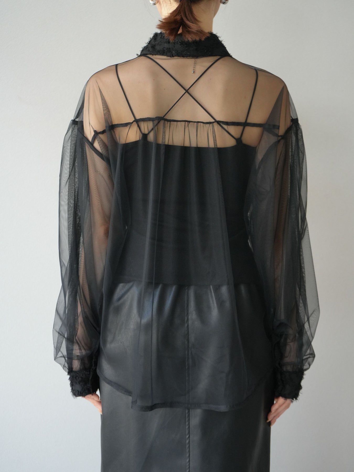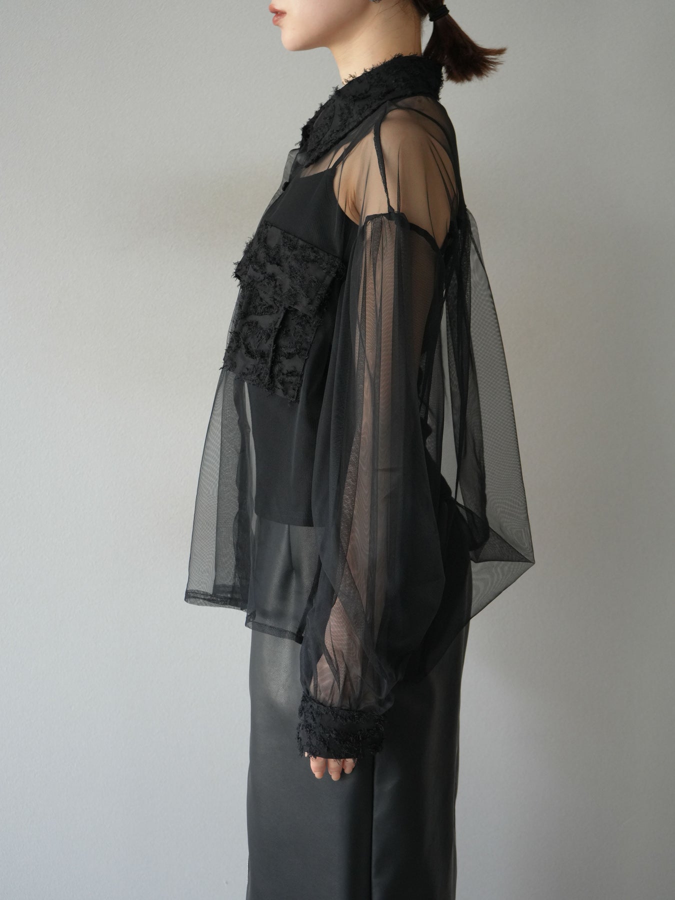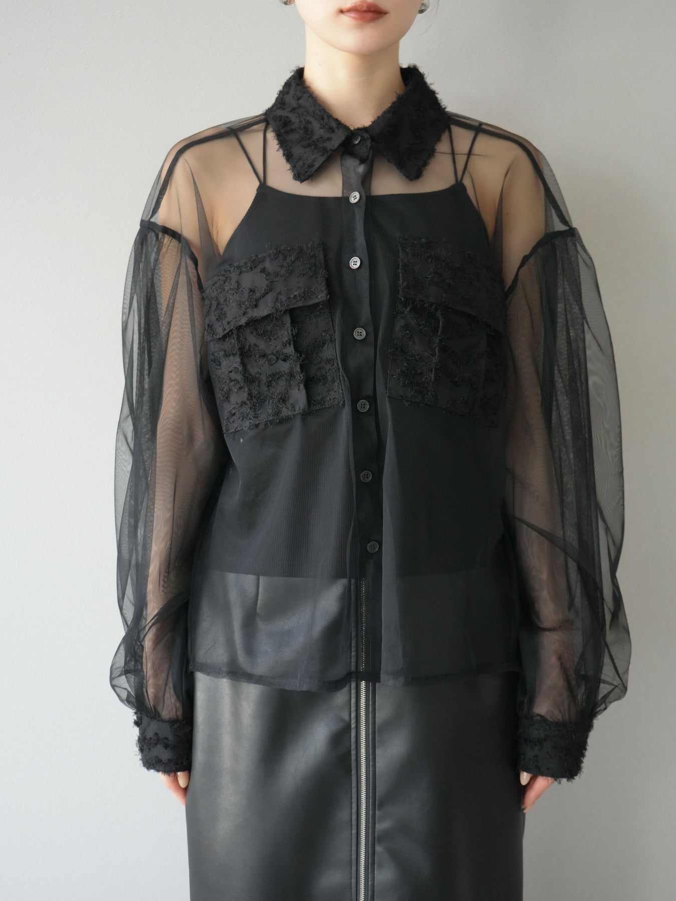[予約]フリンジジャガード×チュールレイヤードシャツ/ブラック