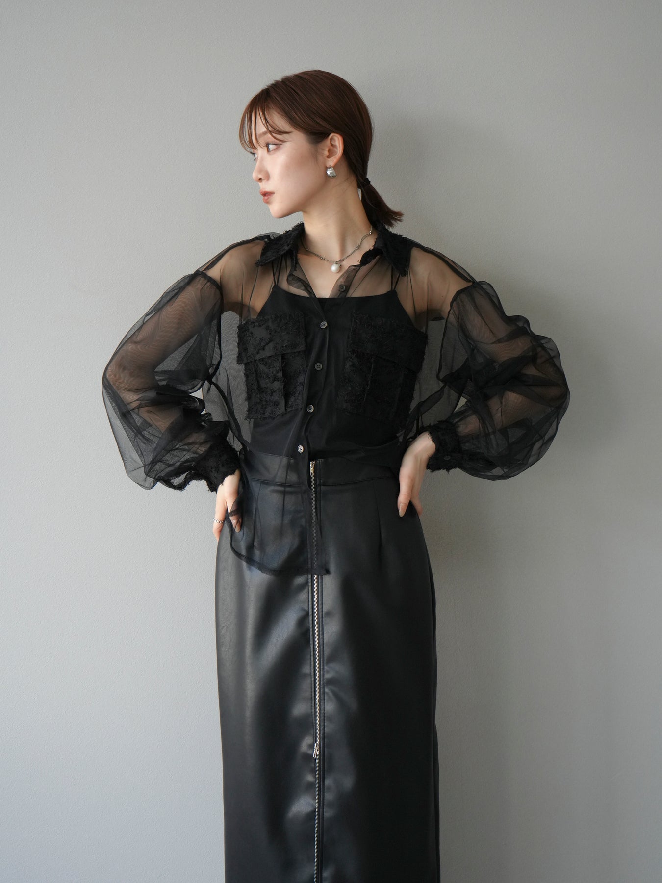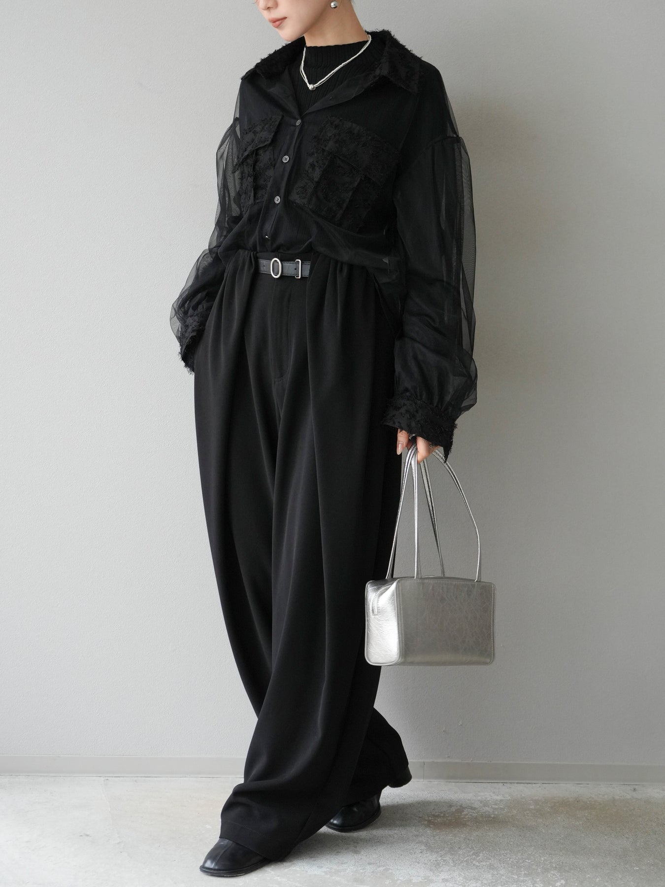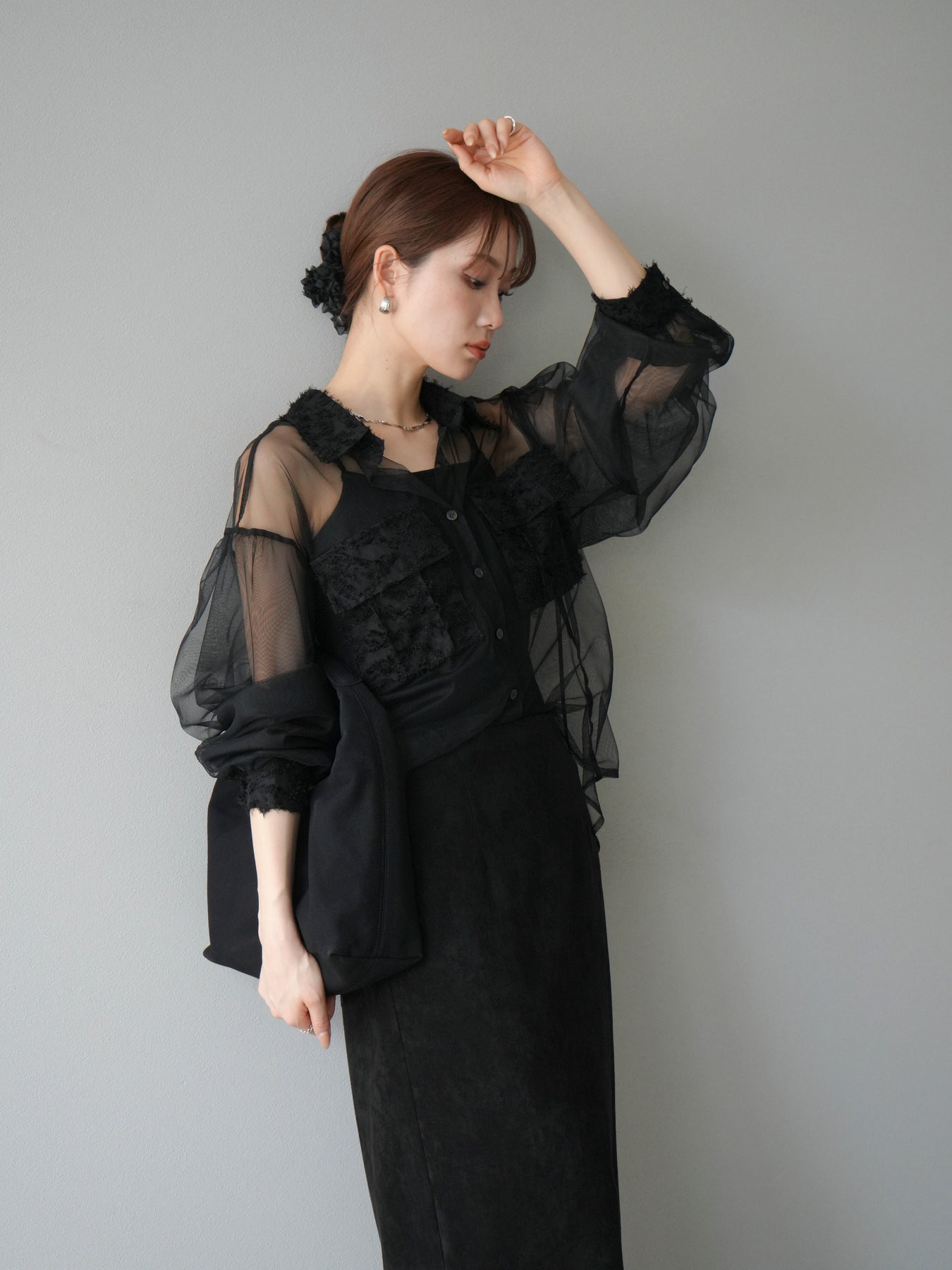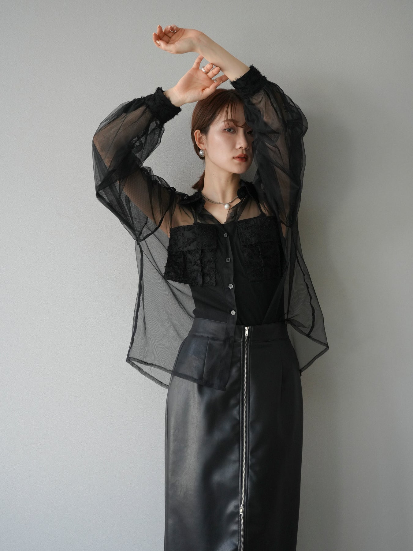 [予約]フリンジジャガード×チュールレイヤードシャツ/ブラック