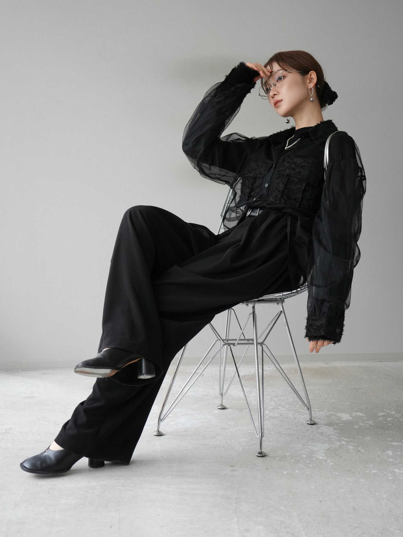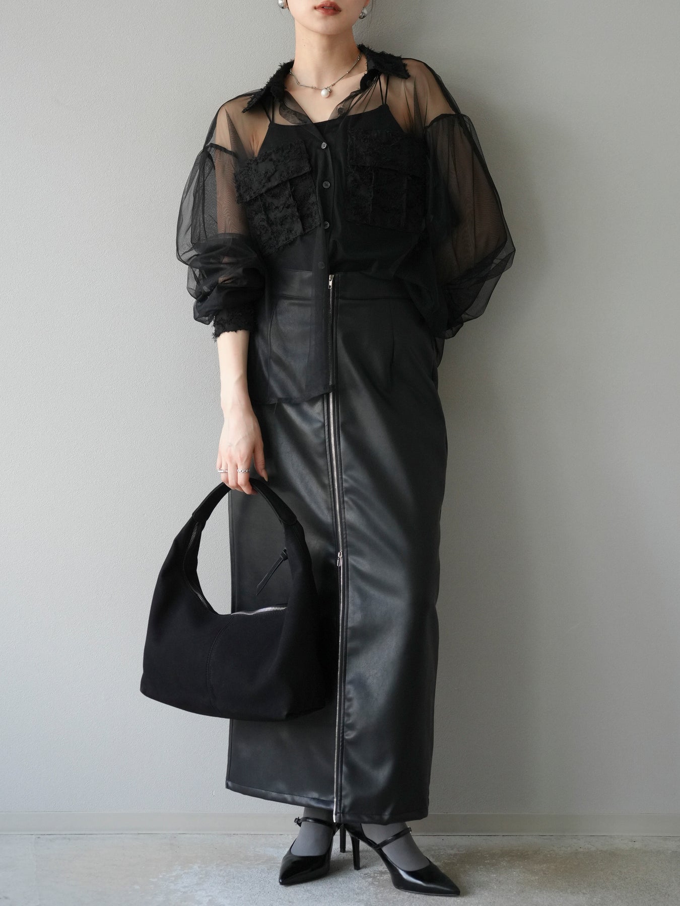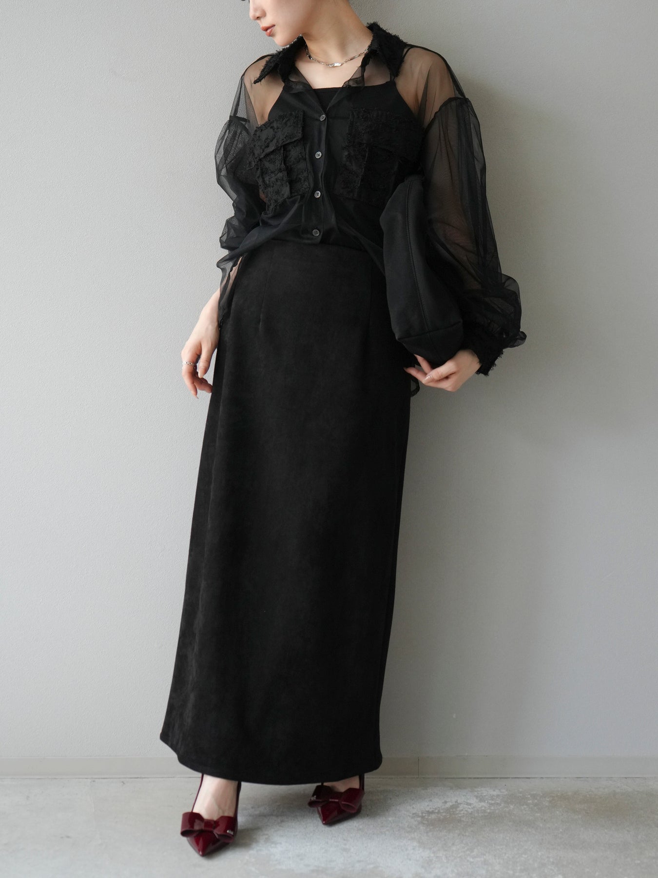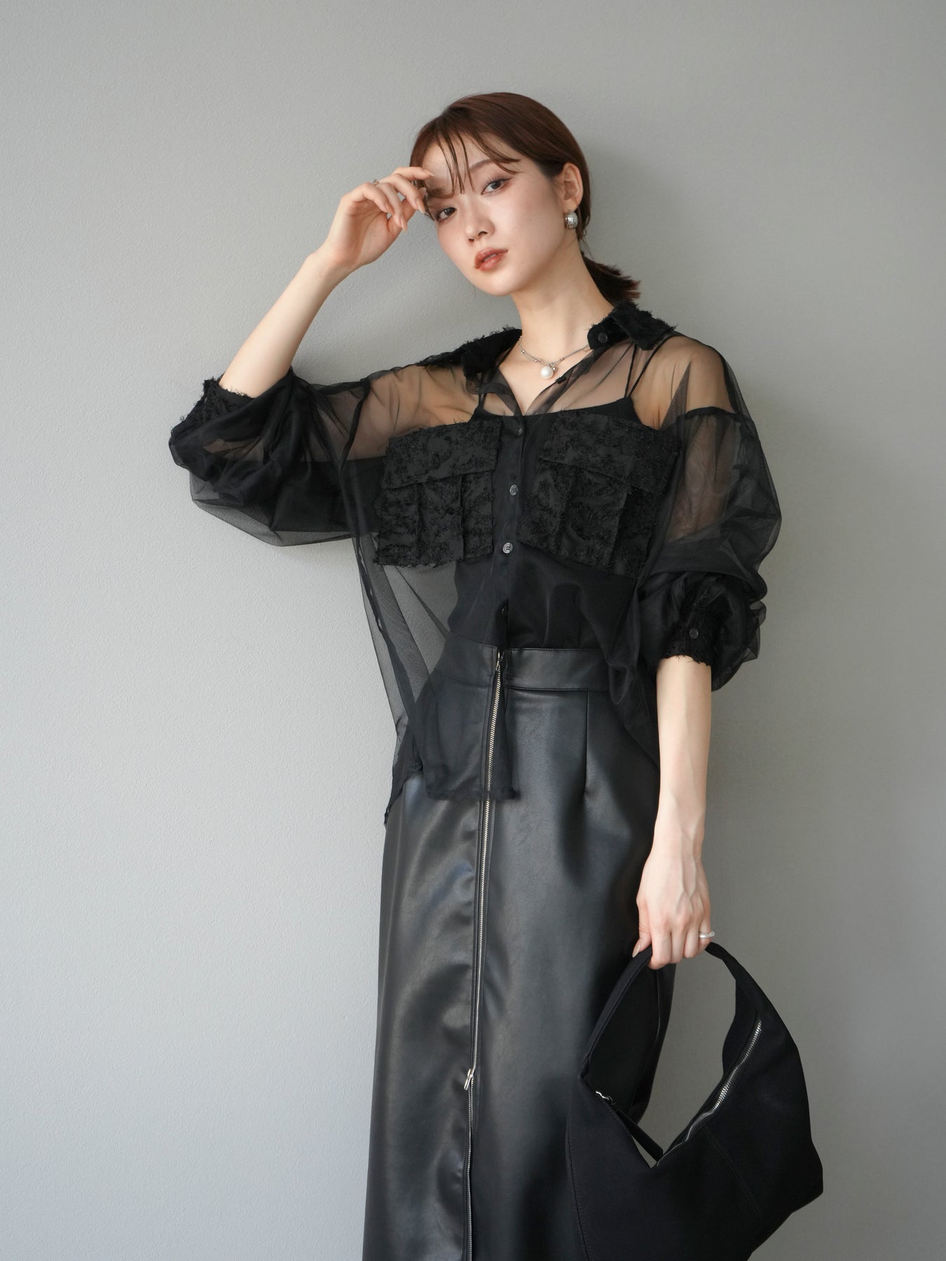 [予約]フリンジジャガード×チュールレイヤードシャツ/ブラック