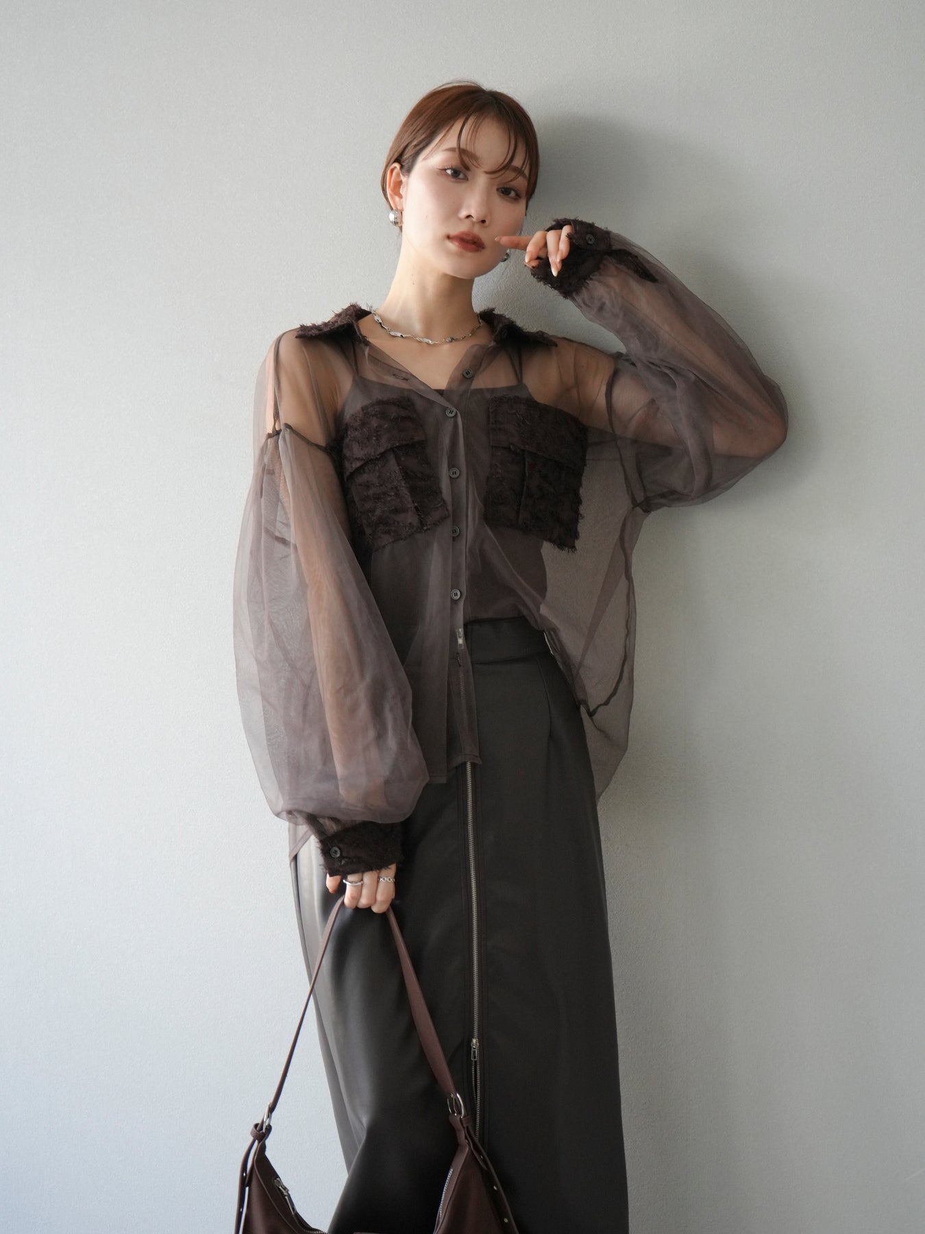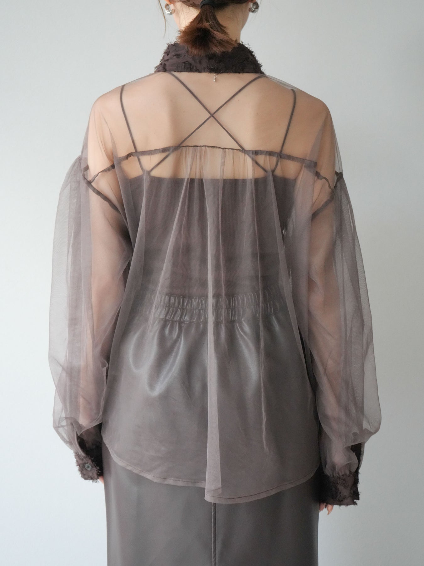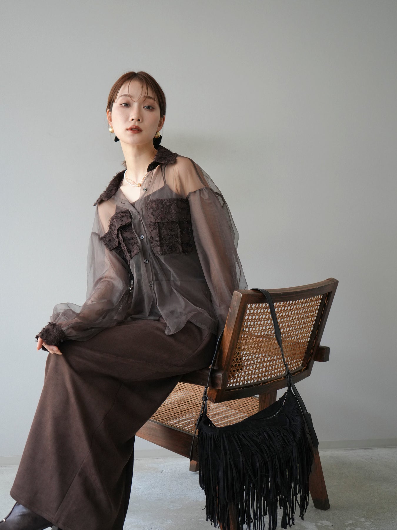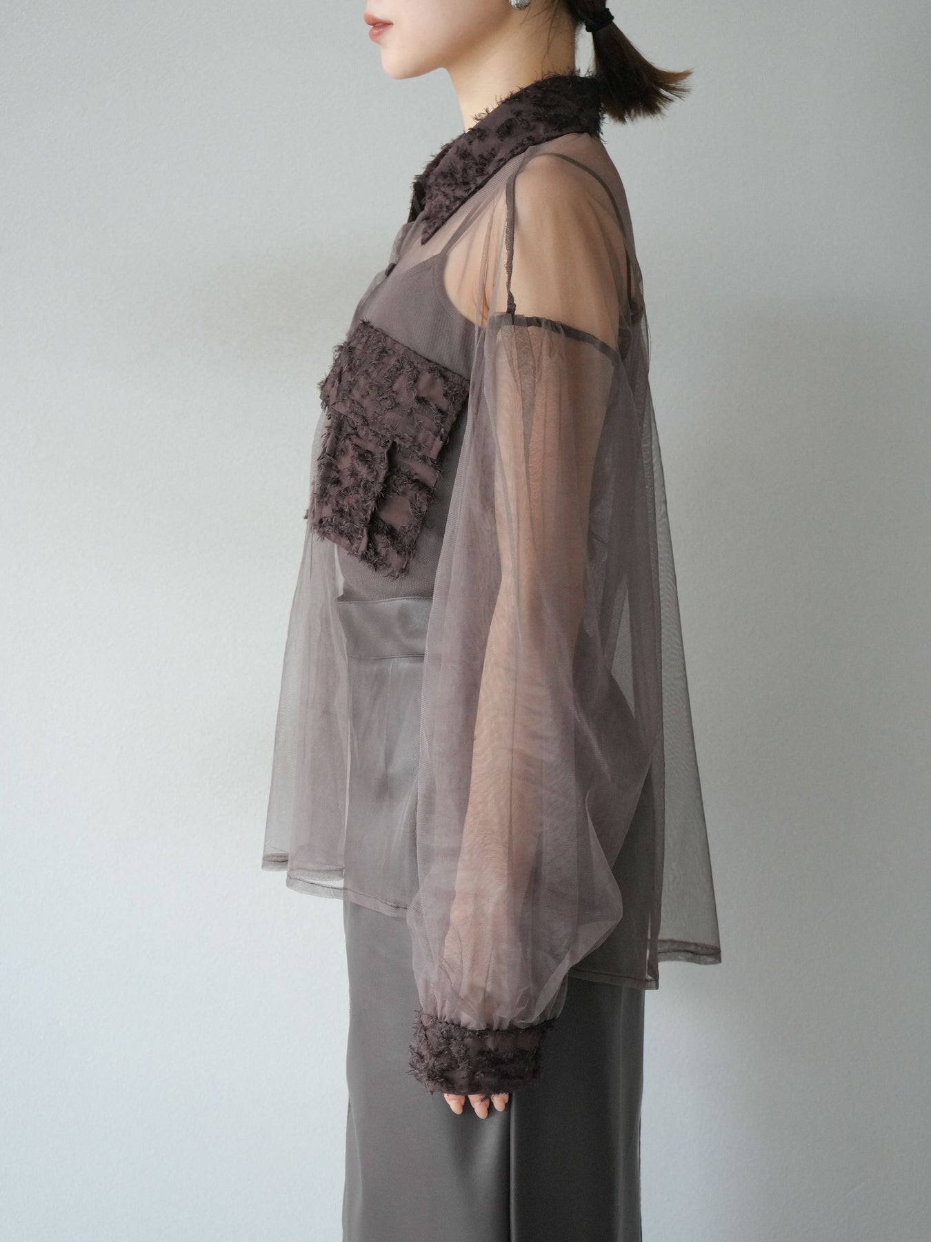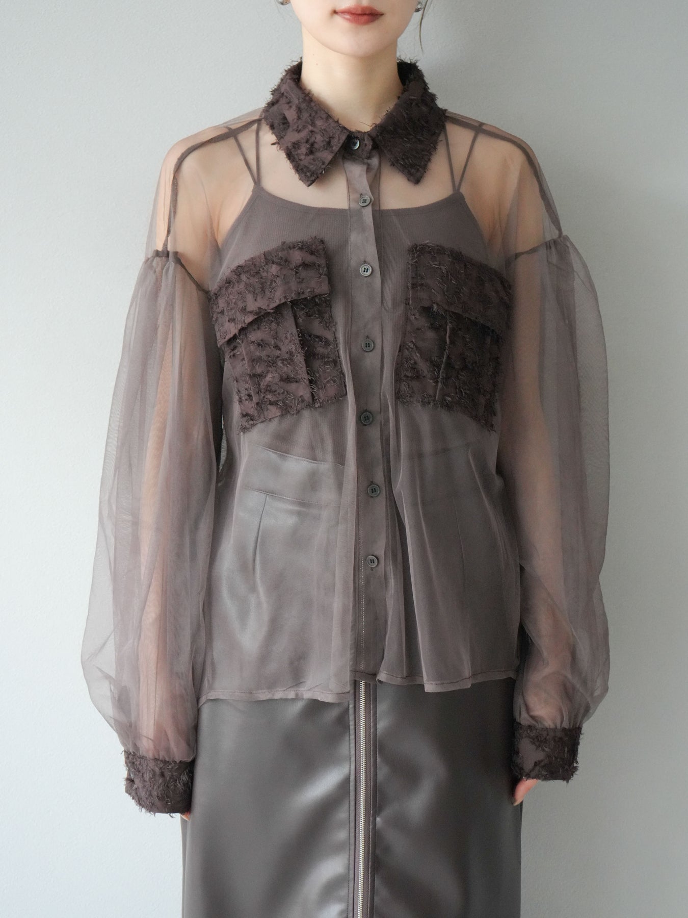 [予約]フリンジジャガード×チュールレイヤードシャツ/ブラウン