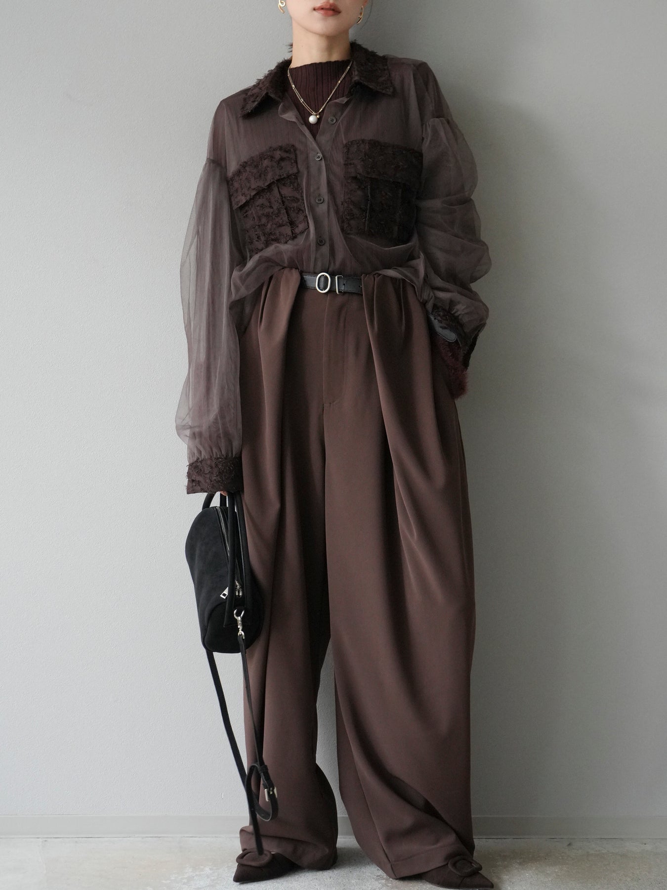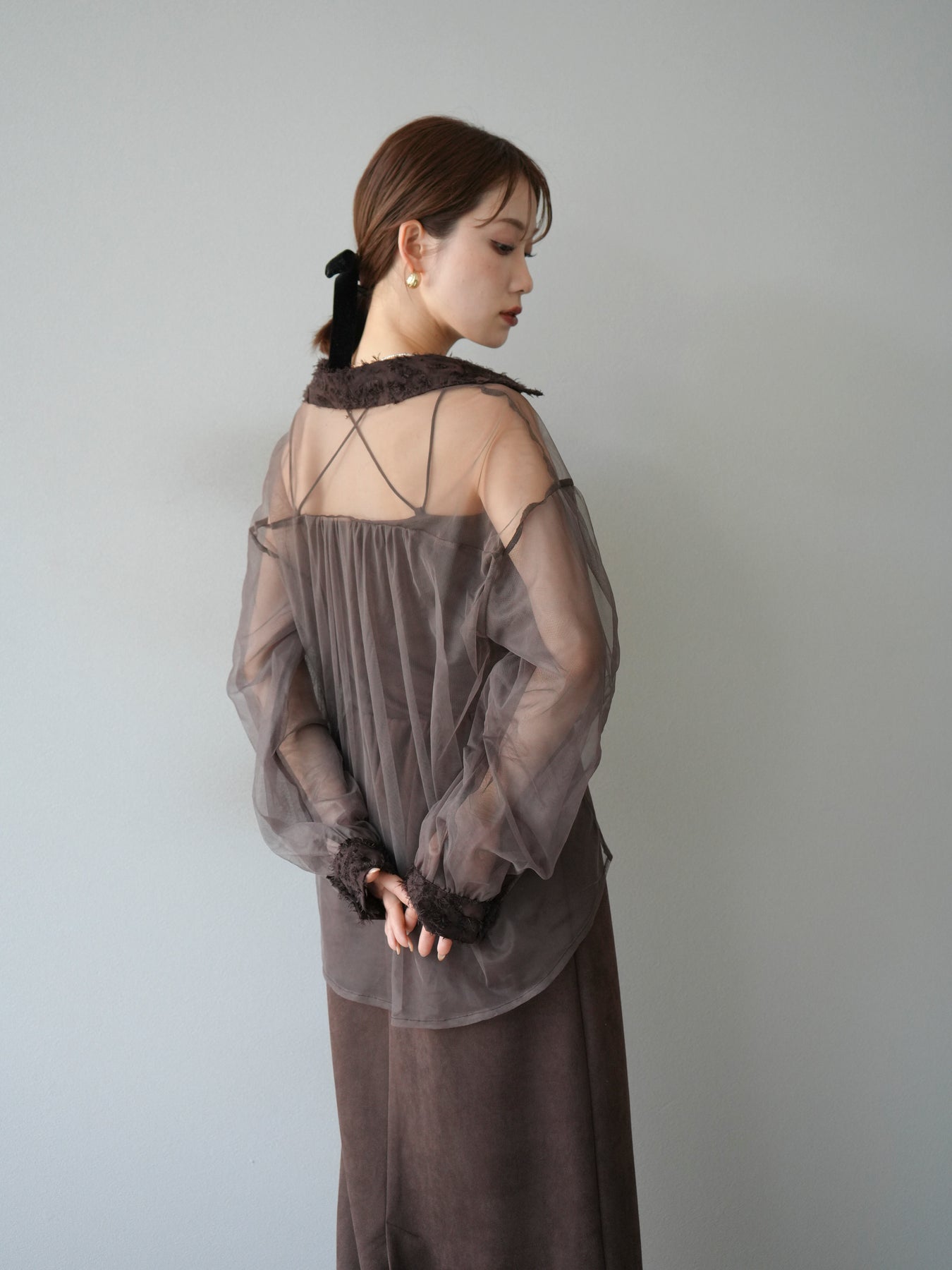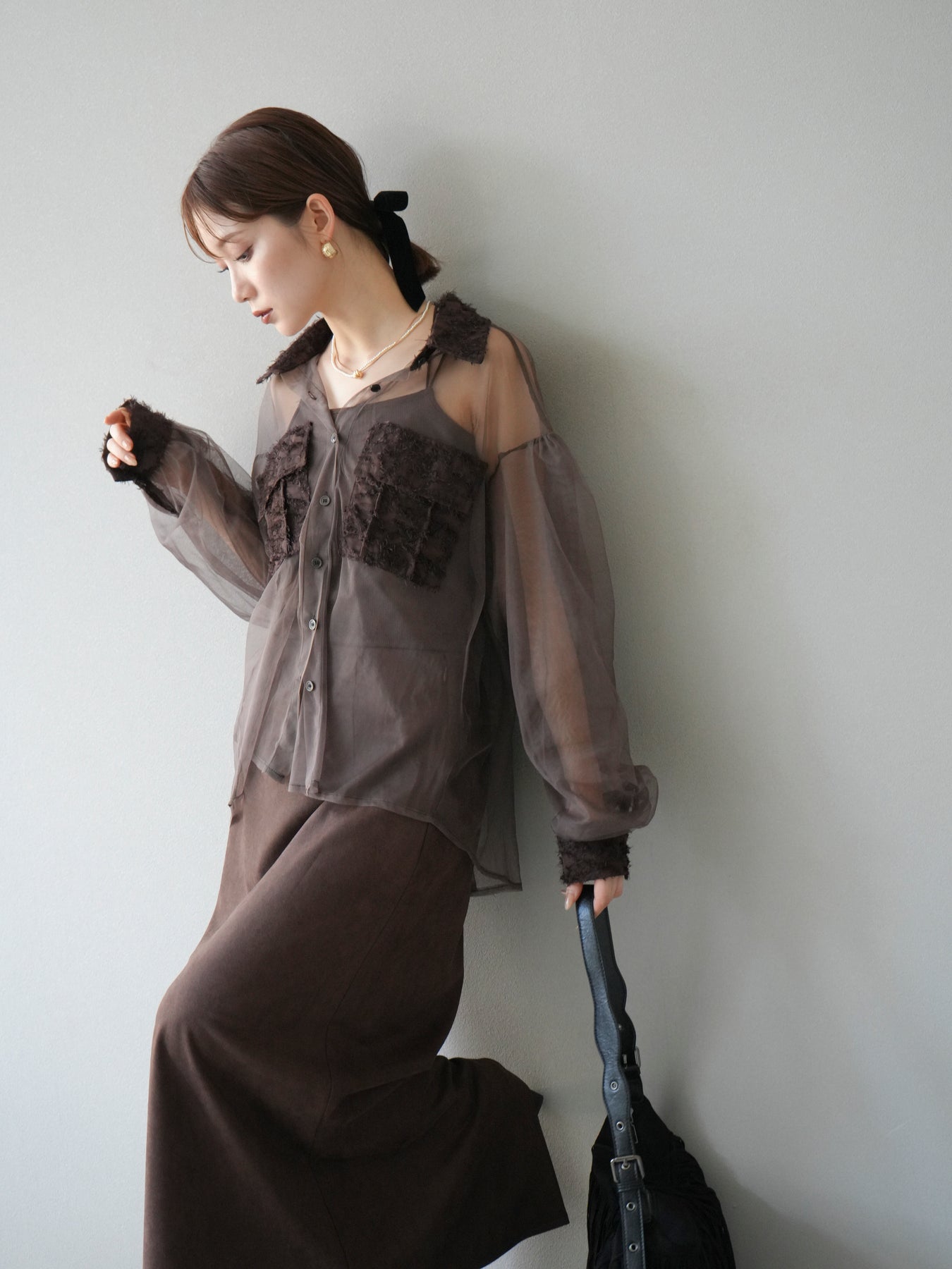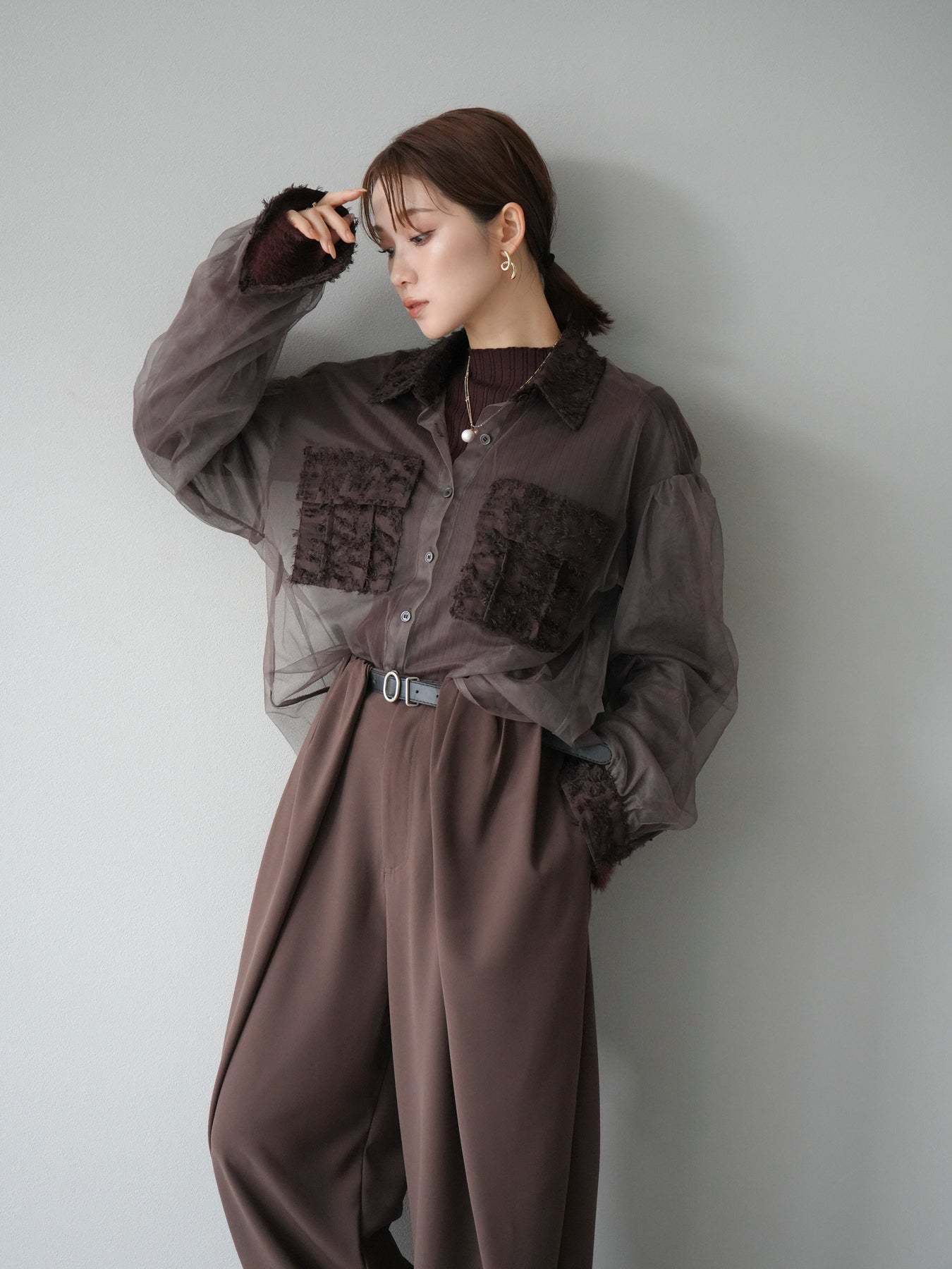 [予約]フリンジジャガード×チュールレイヤードシャツ/ブラウン
