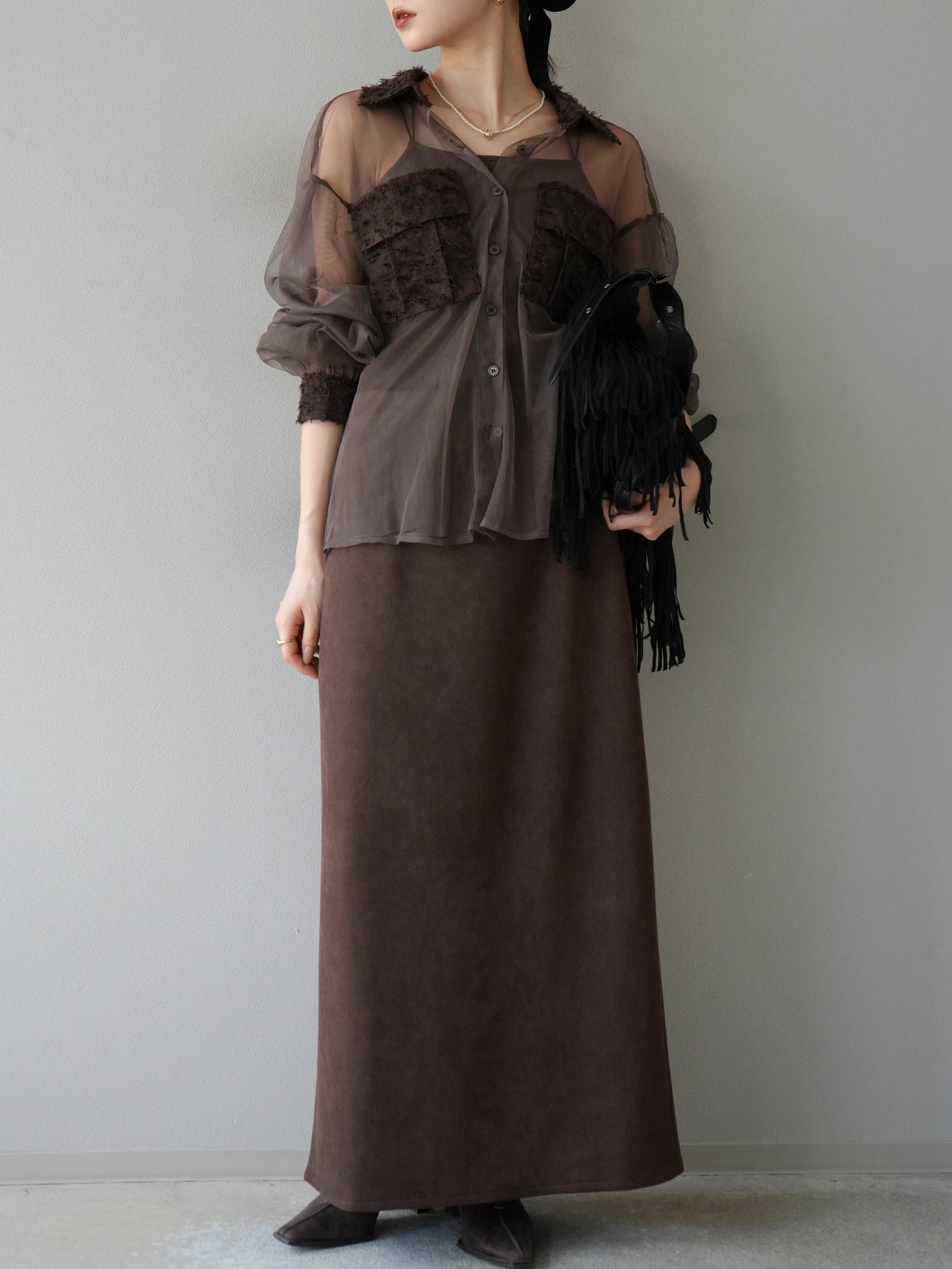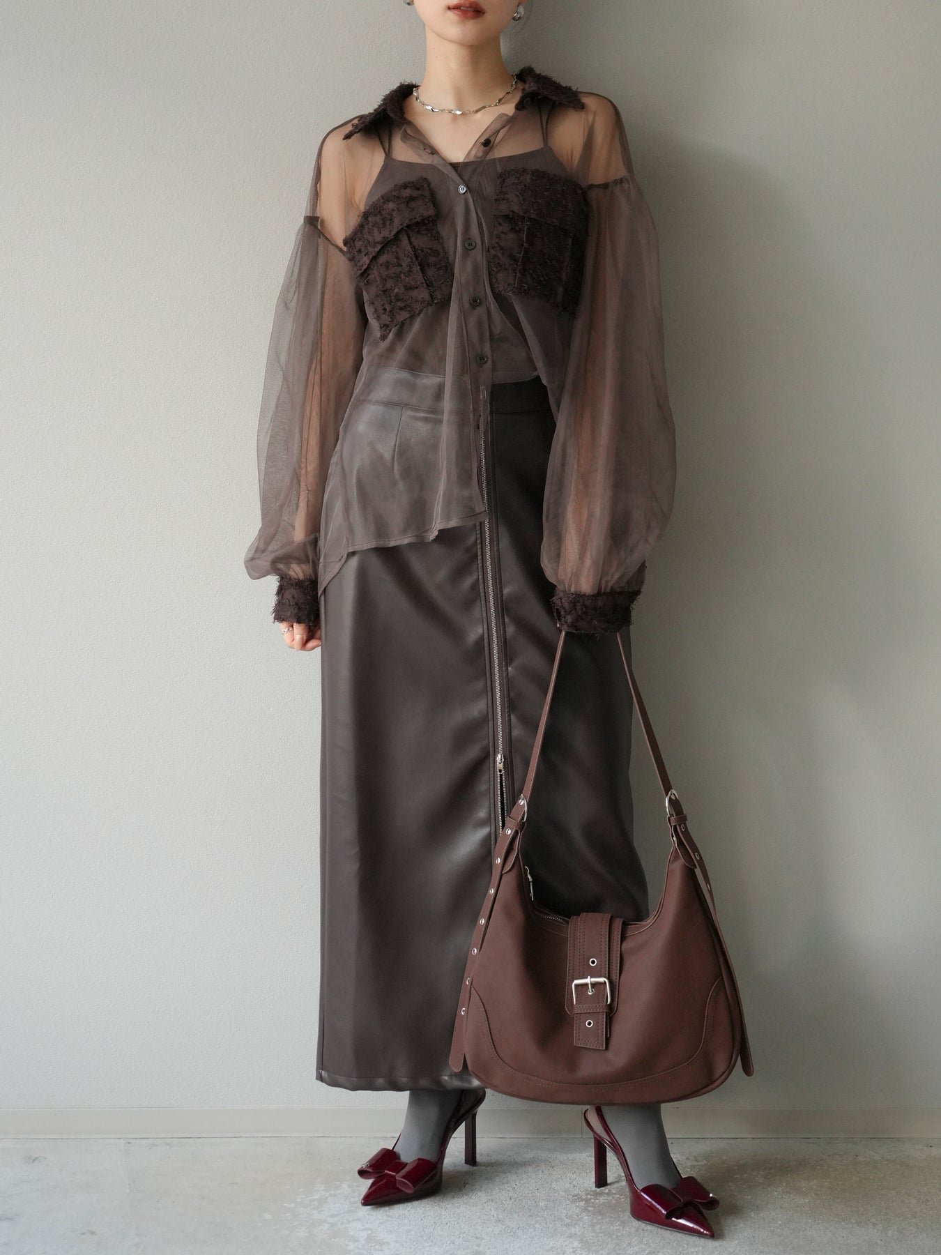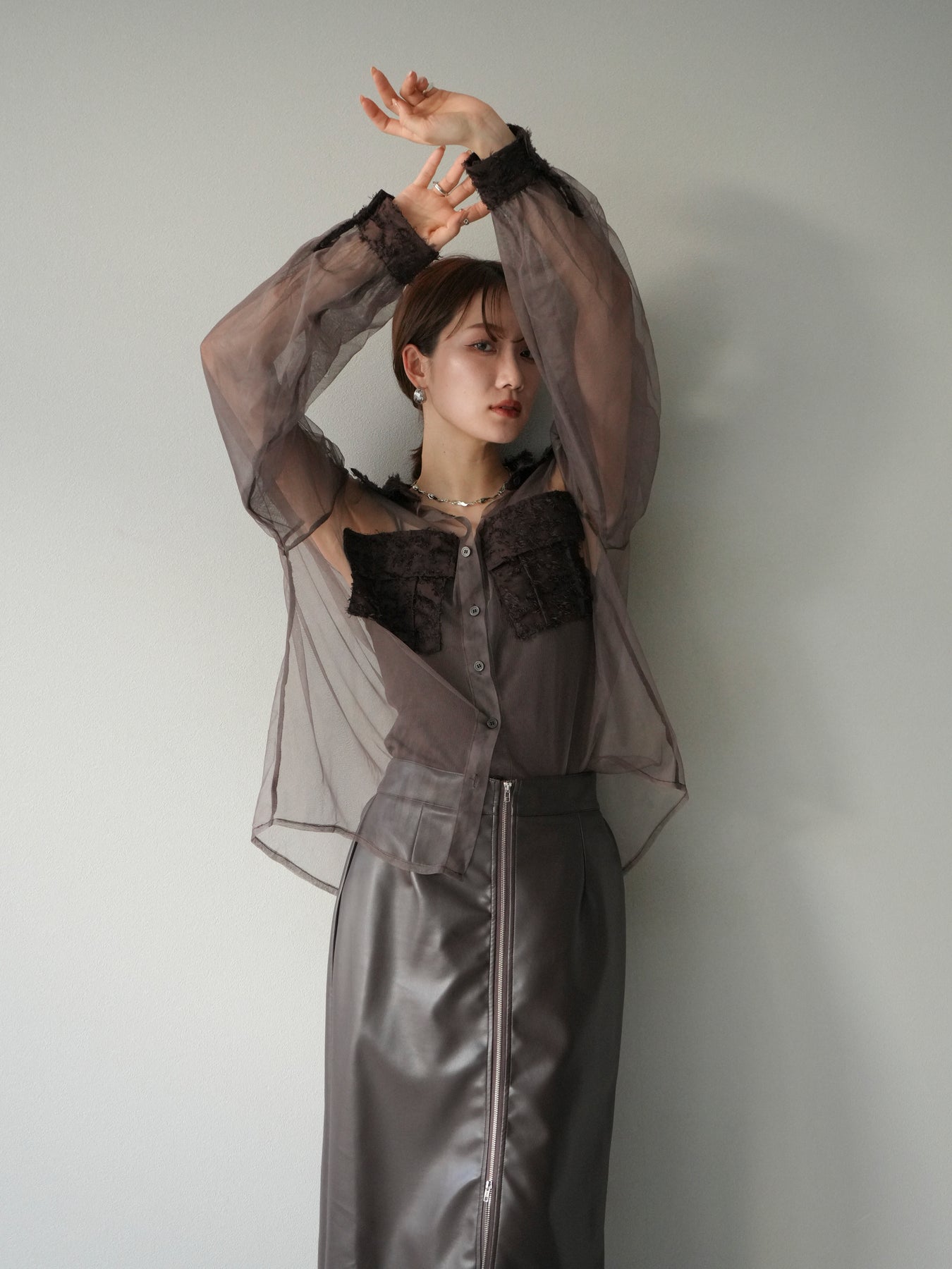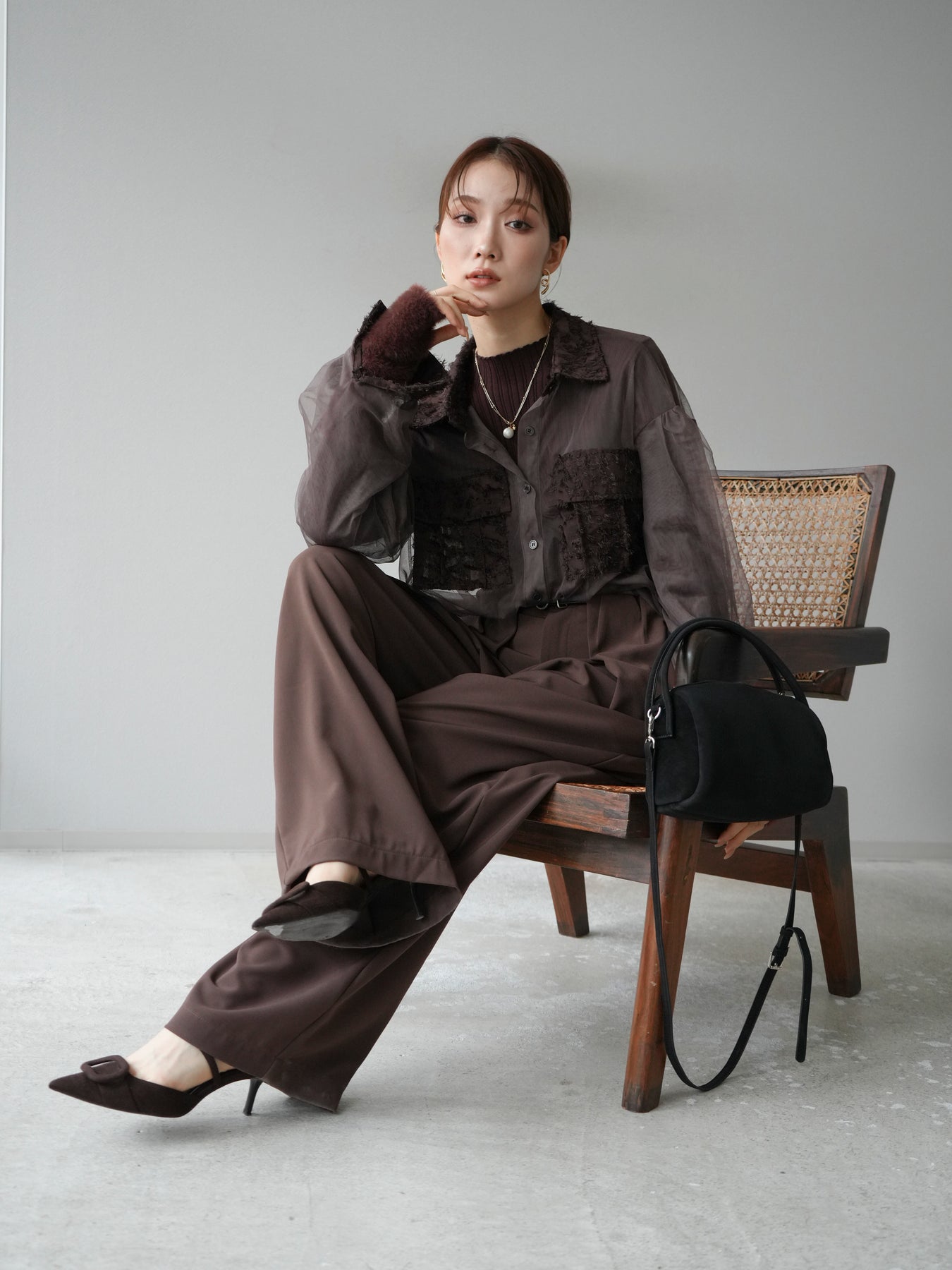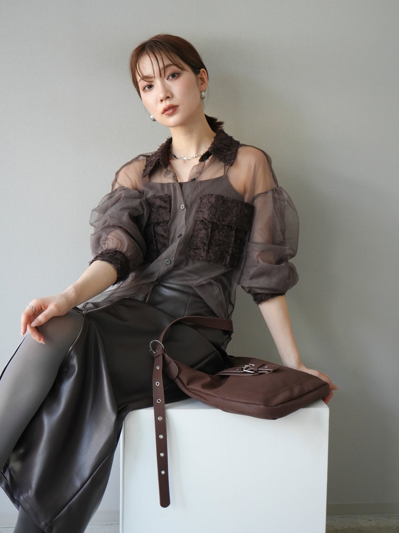 [予約]フリンジジャガード×チュールレイヤードシャツ/ブラウン