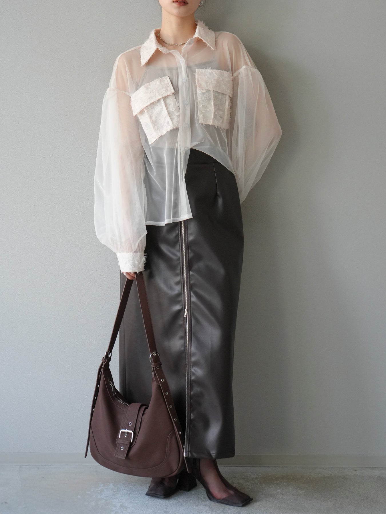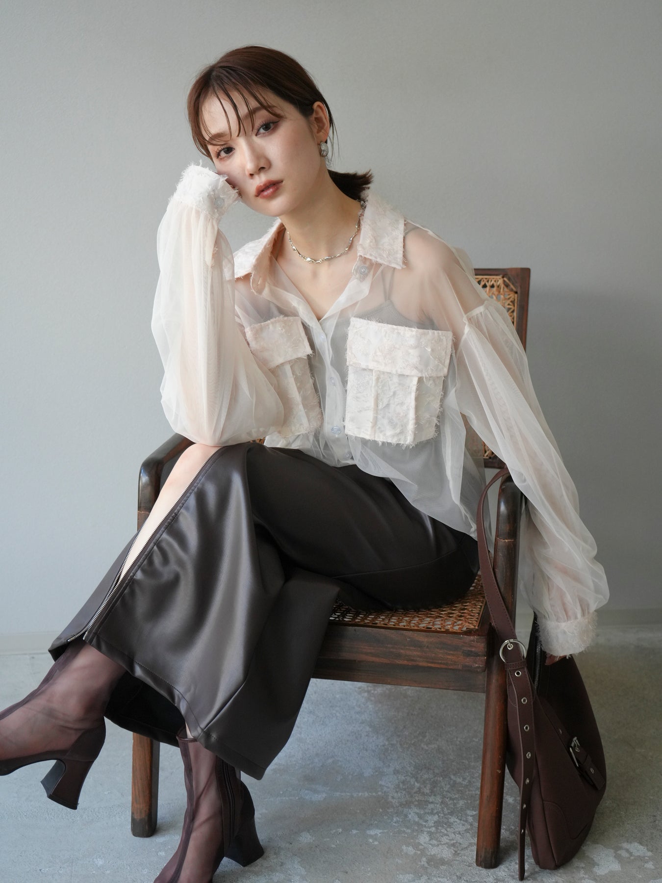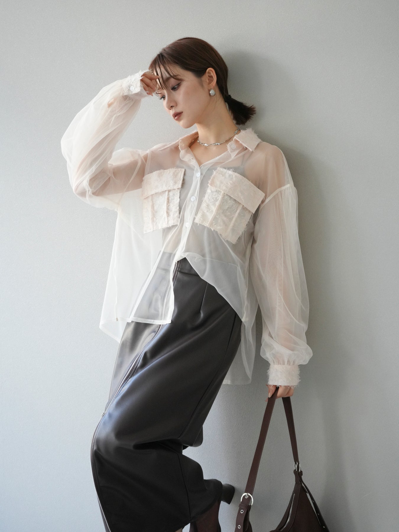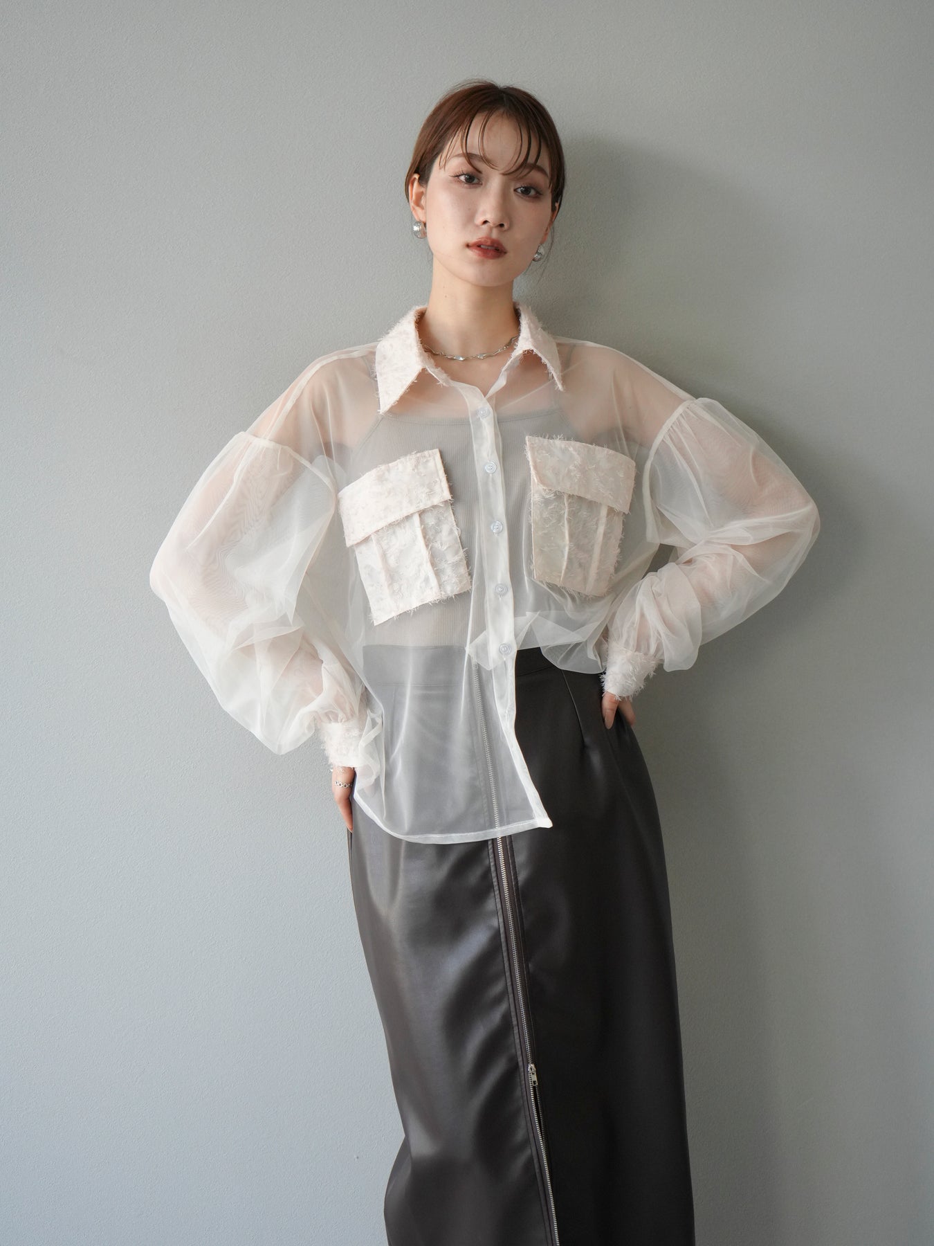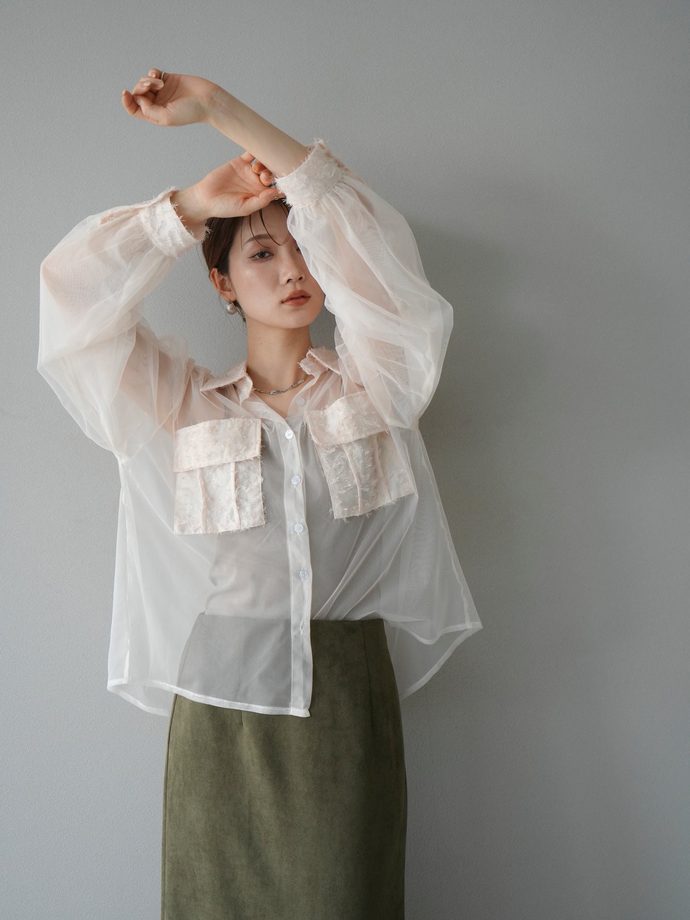 繊細なチュールにフリンジジャガードを組み合わせた、デザイン性の高いレイヤードシャツ。透け感のある軽やかな素材が抜け感を演出し、立体的なポケットや襟元のジャガードが華やかなアクセントになります。程よくゆったりとしたシルエットでレイヤードスタイルもしやすく、インナー次第で印象を変えられるのも魅力。デイリーコーデにモードなエッセンスを加えたいときや、特別なお出かけシーンにも活躍する一着です。 ※ボトムス、キャミソール(インナー)以外の商品は一律でインナーは付属していません。