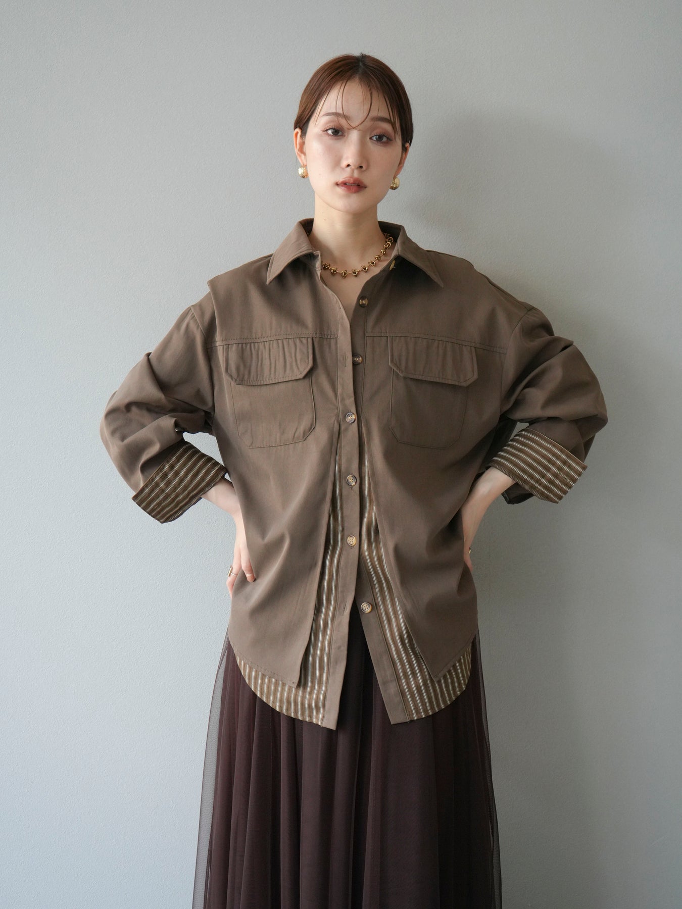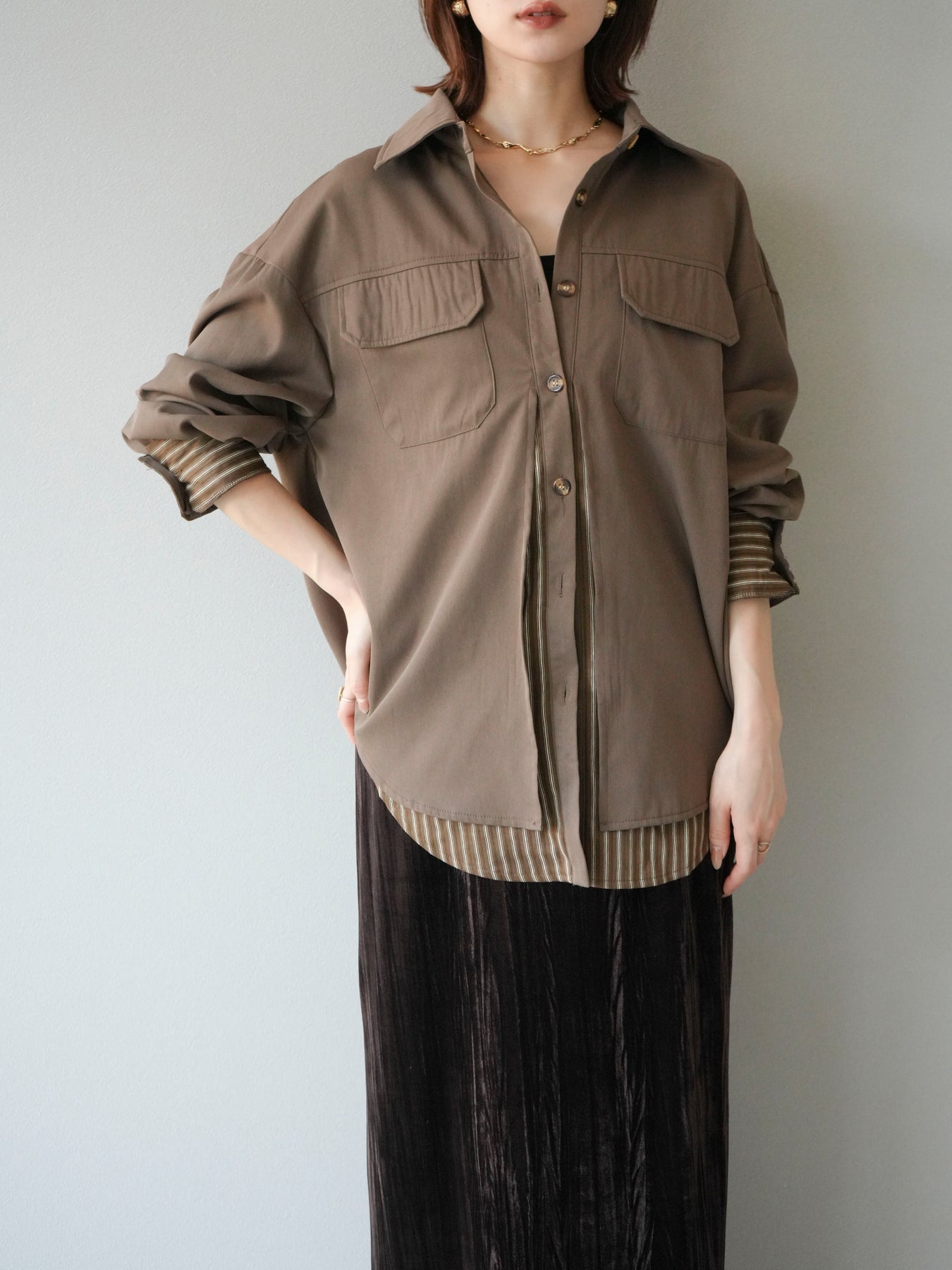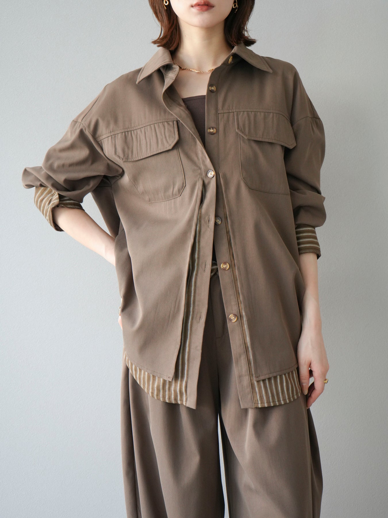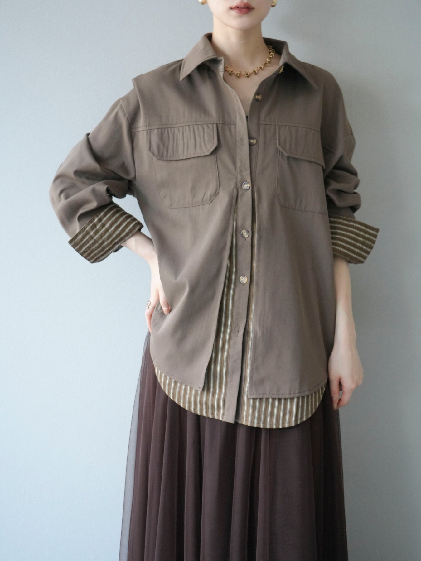 ベーシックなシャツにストライプ柄の裾をレイヤードしたデザインシャツ。フロントのフラップポケットが程よいカジュアル感を添えつつ、レイヤード部分がスタイリングにアクセントを加えてくれます。1枚で着映えする存在感があり、パンツにもスカートにも合わせやすい万能アイテム。羽織りとしても活躍し、季節の変わり目に重宝する一着です。 ※ボトムス、キャミソール(インナー)以外の商品は一律でインナーは付属していません。