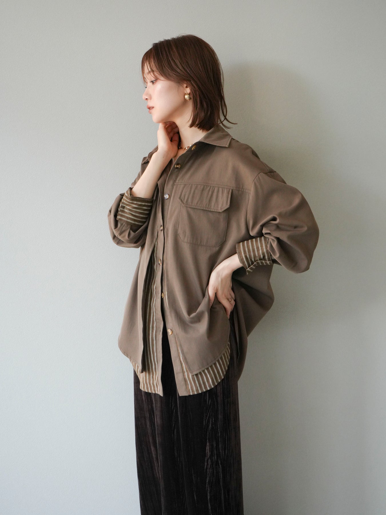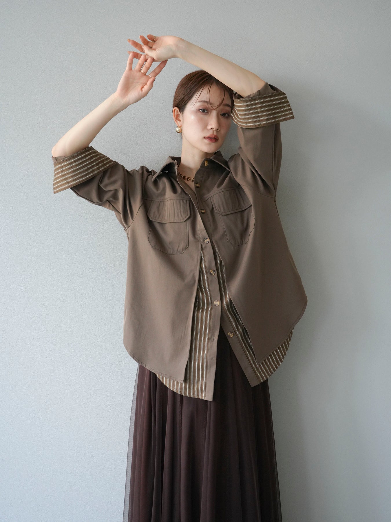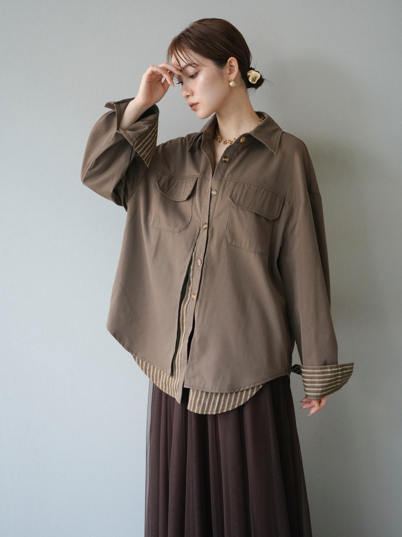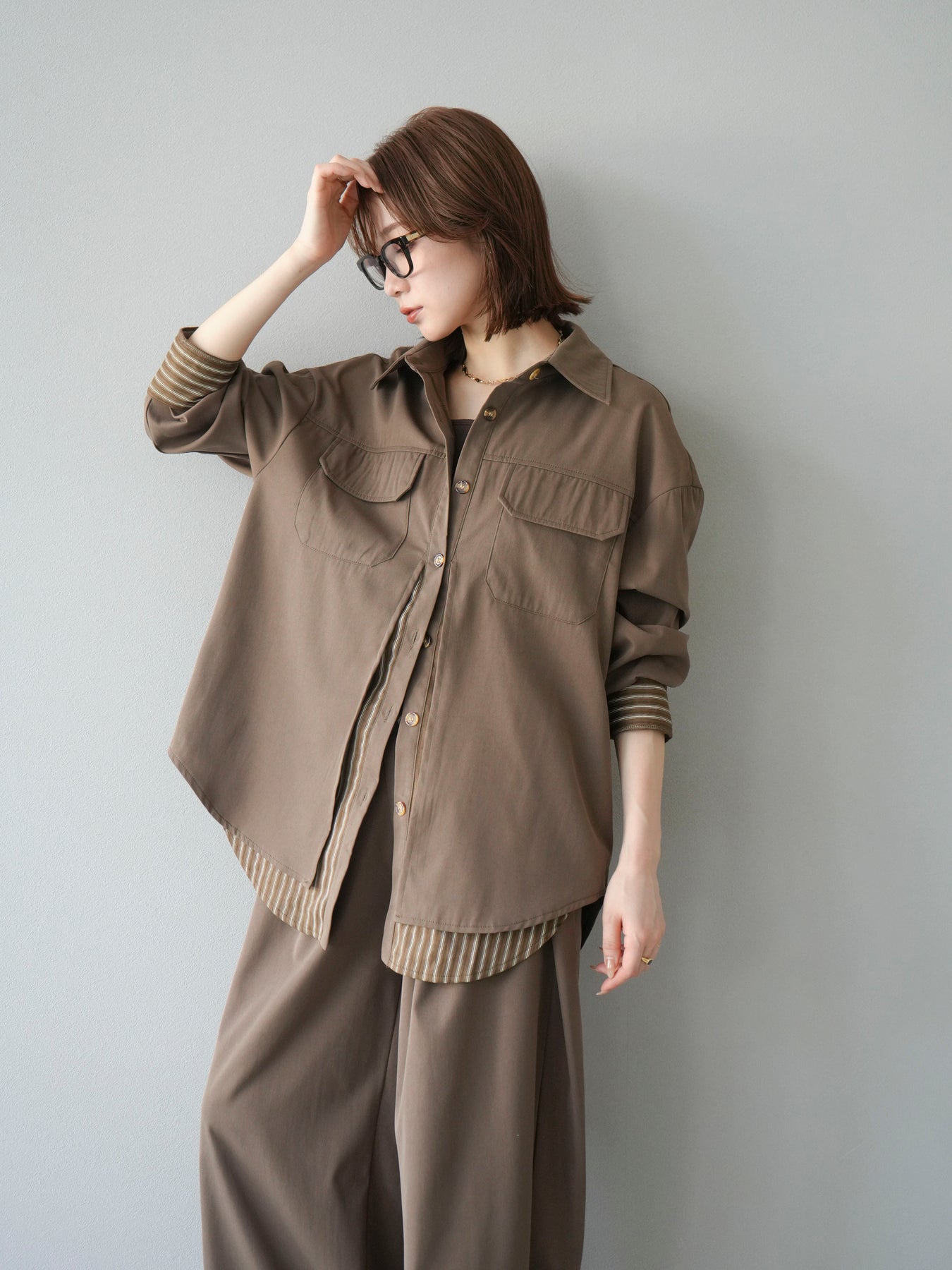 ベーシックなシャツにストライプ柄の裾をレイヤードしたデザインシャツ。フロントのフラップポケットが程よいカジュアル感を添えつつ、レイヤード部分がスタイリングにアクセントを加えてくれます。1枚で着映えする存在感があり、パンツにもスカートにも合わせやすい万能アイテム。羽織りとしても活躍し、季節の変わり目に重宝する一着です。 ※ボトムス、キャミソール(インナー)以外の商品は一律でインナーは付属していません。
