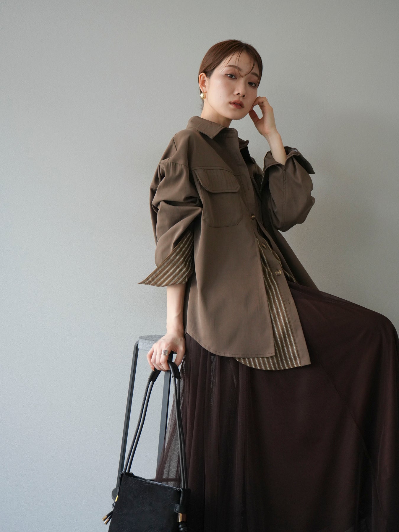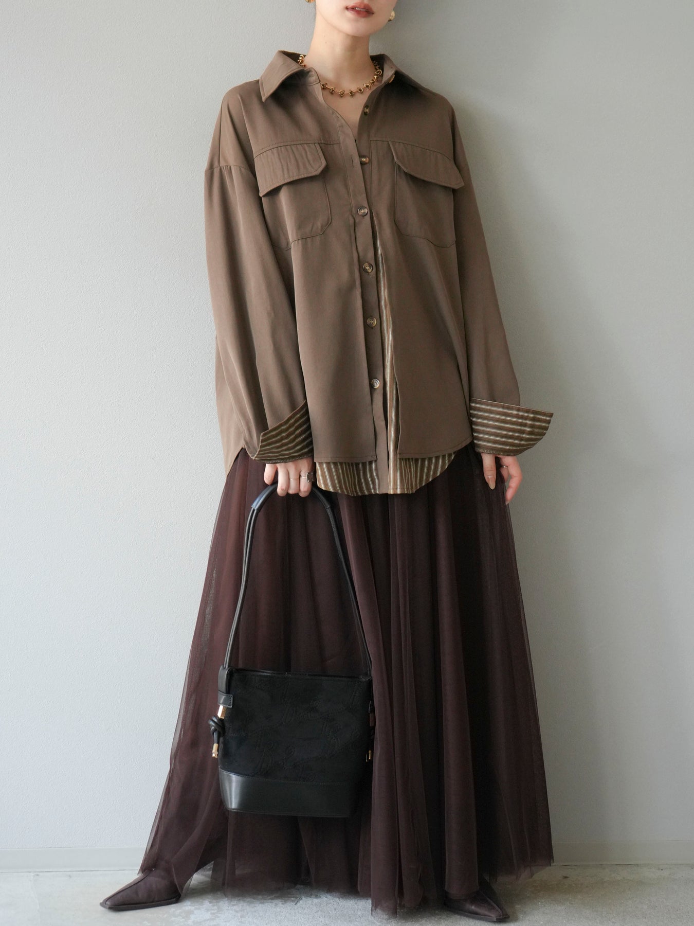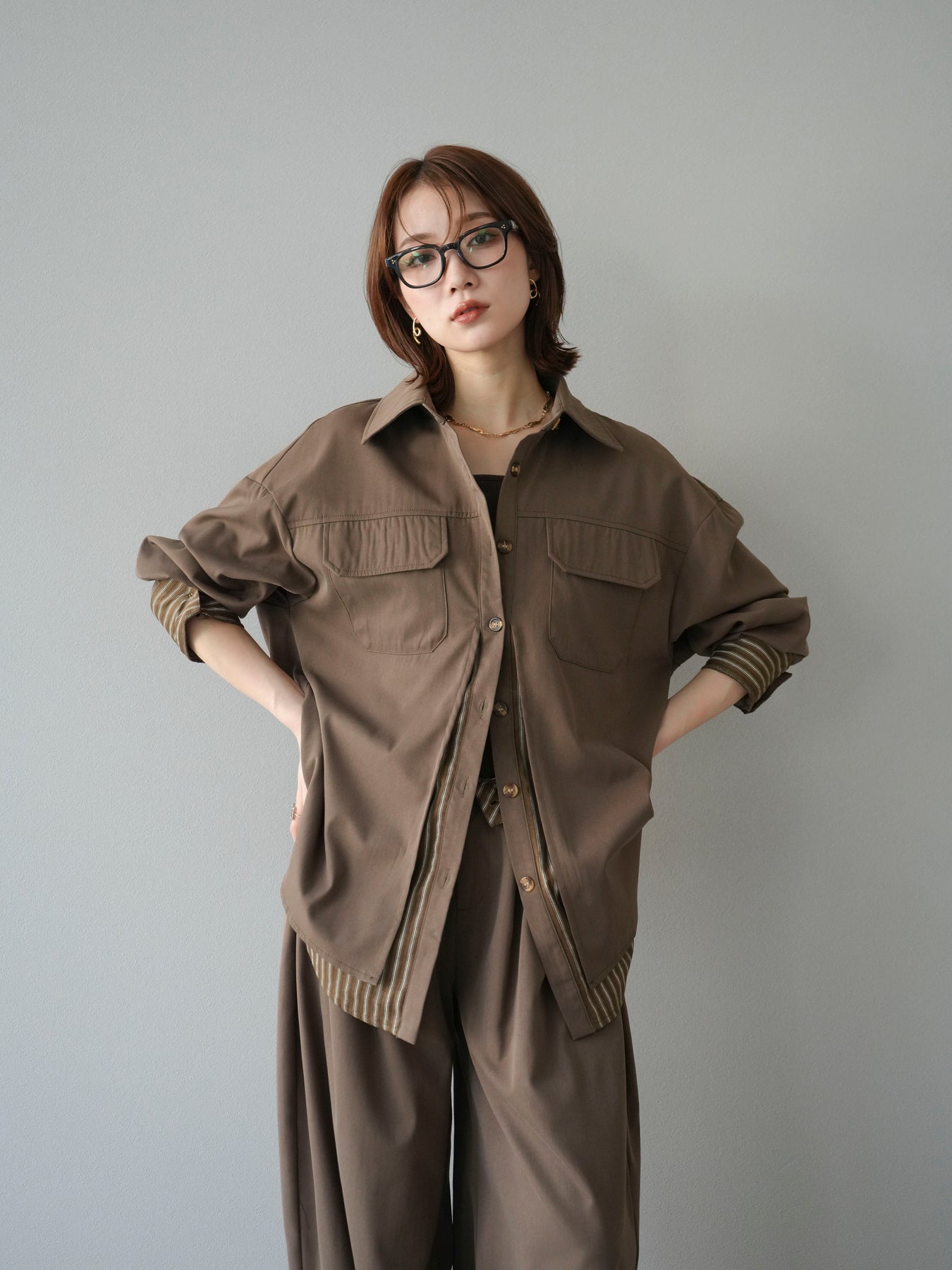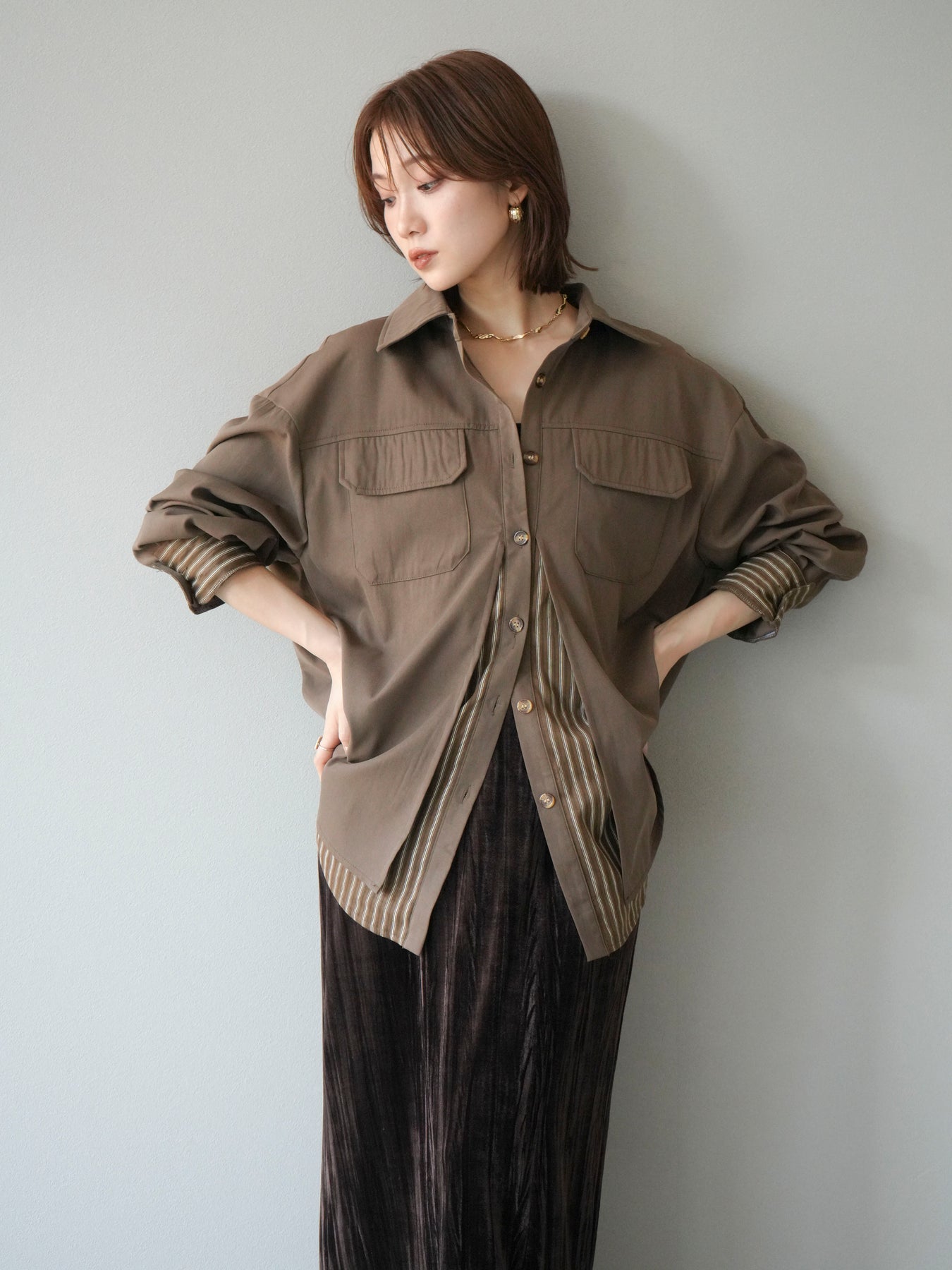 ベーシックなシャツにストライプ柄の裾をレイヤードしたデザインシャツ。フロントのフラップポケットが程よいカジュアル感を添えつつ、レイヤード部分がスタイリングにアクセントを加えてくれます。1枚で着映えする存在感があり、パンツにもスカートにも合わせやすい万能アイテム。羽織りとしても活躍し、季節の変わり目に重宝する一着です。 ※ボトムス、キャミソール(インナー)以外の商品は一律でインナーは付属していません。