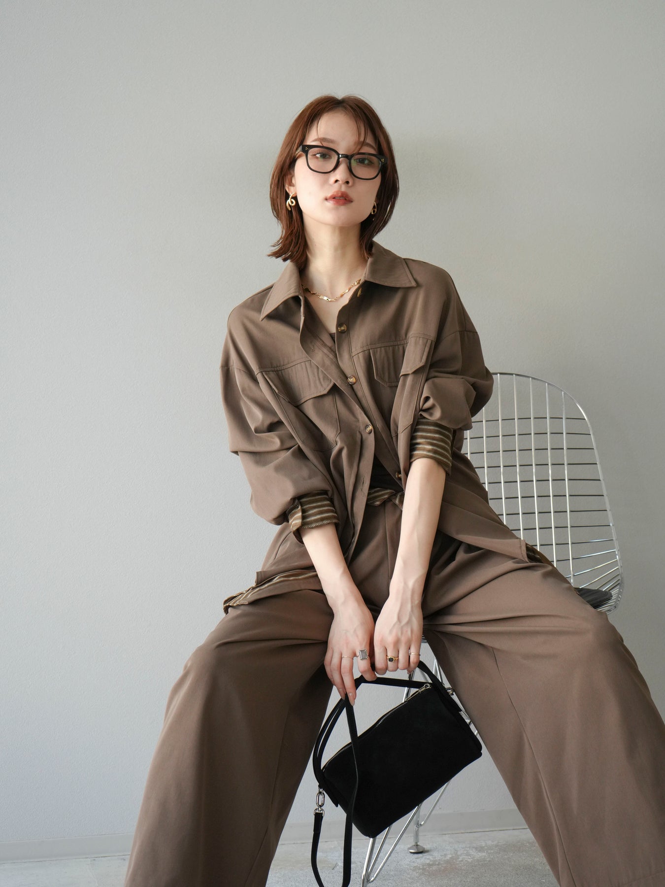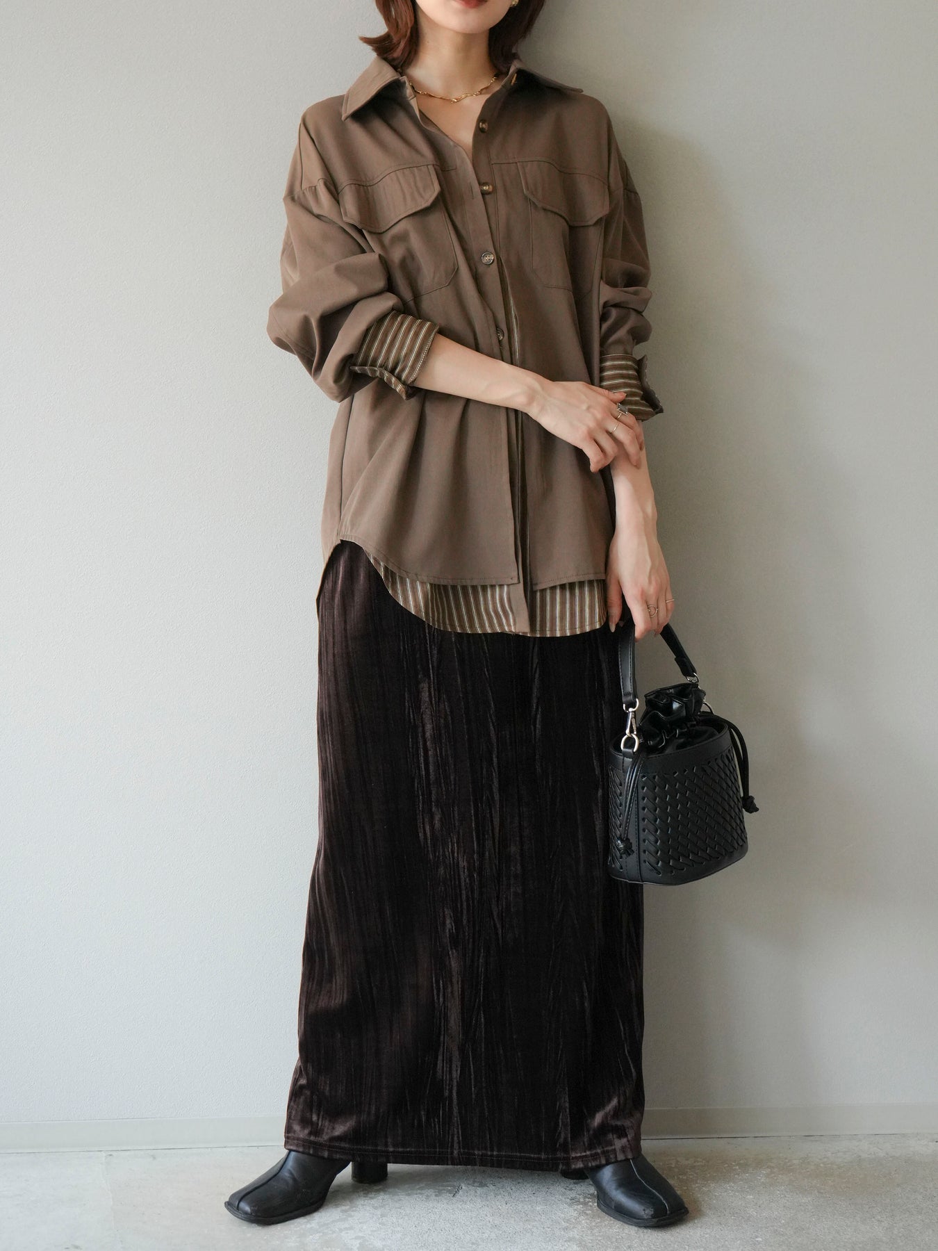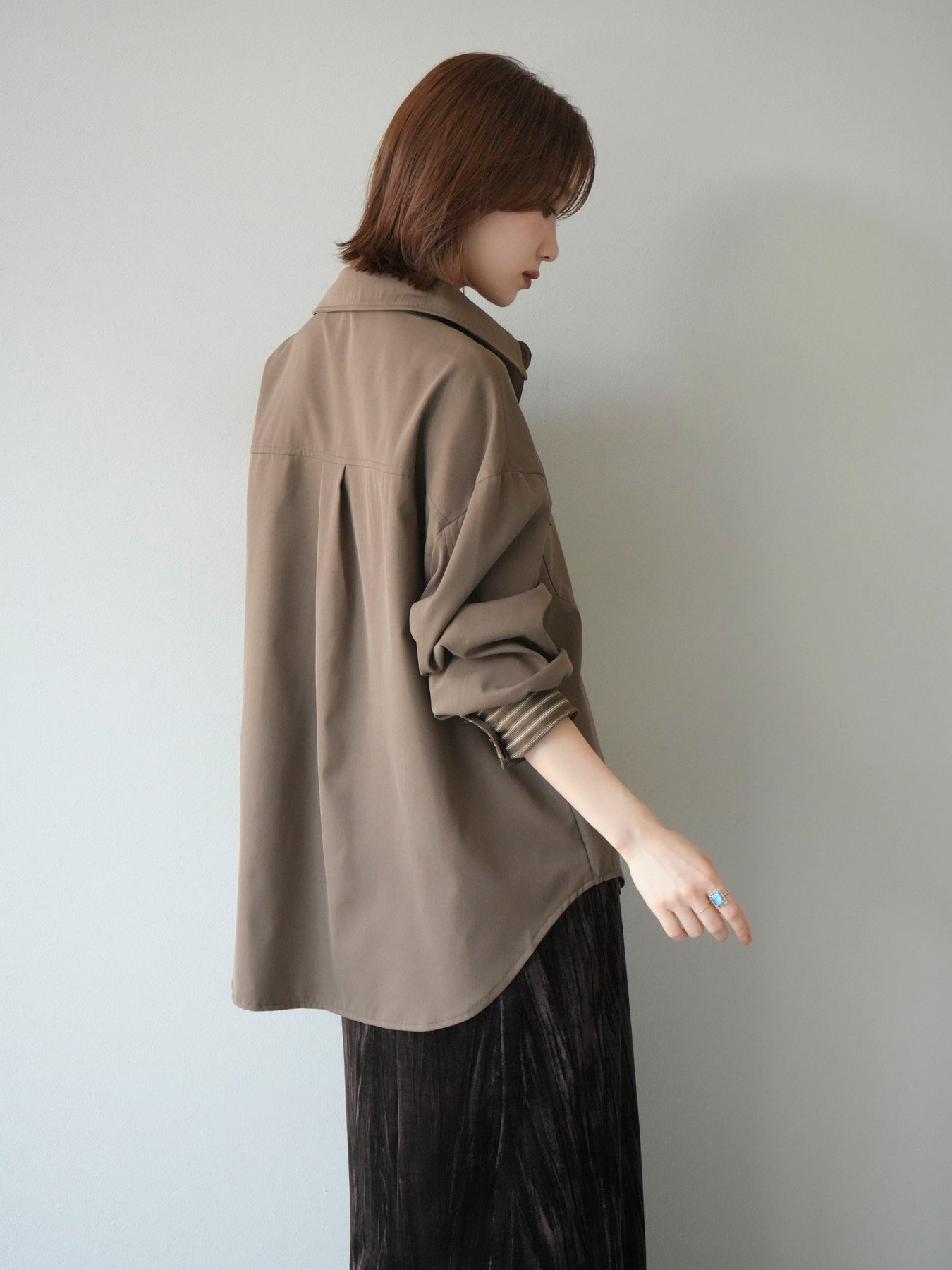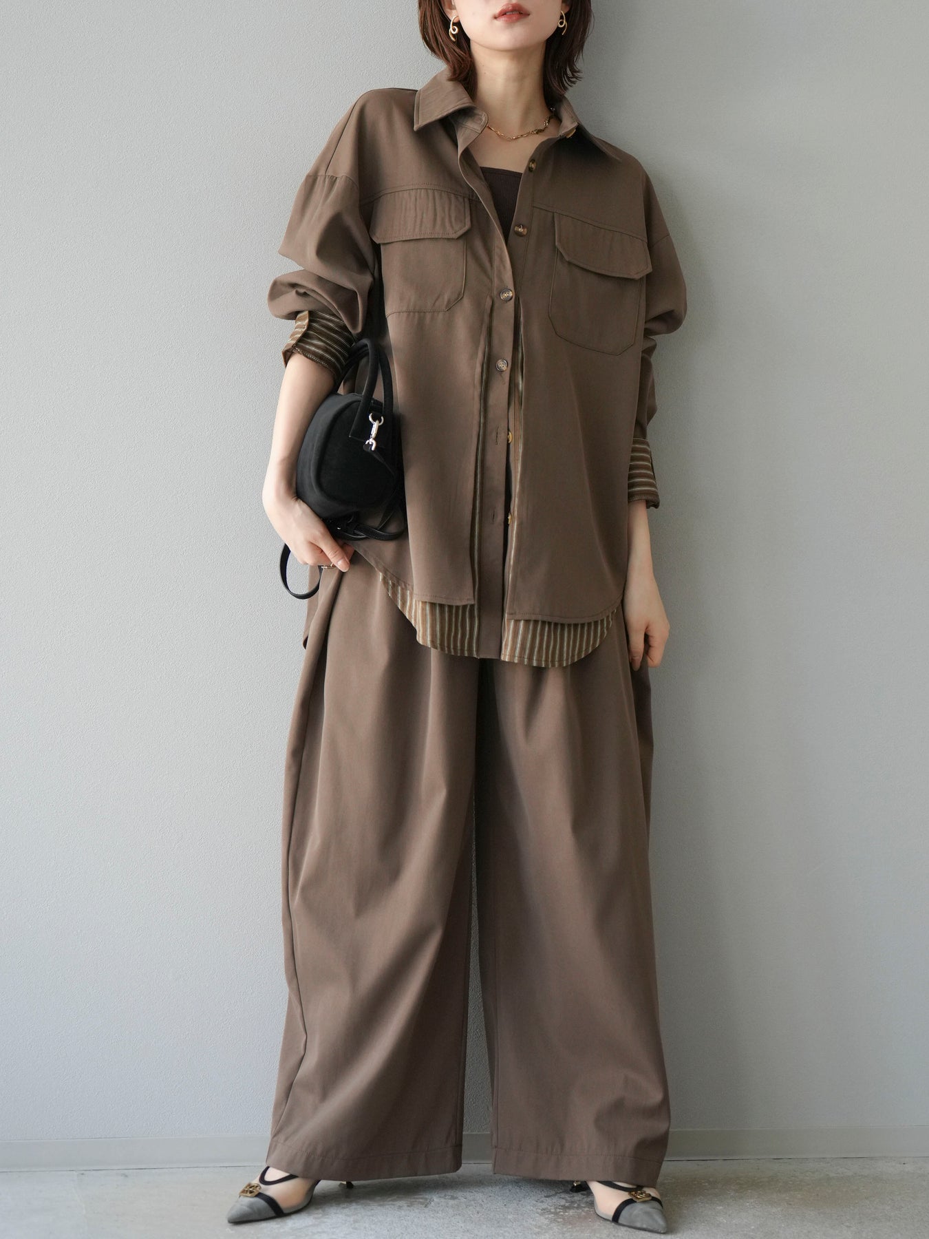 ベーシックなシャツにストライプ柄の裾をレイヤードしたデザインシャツ。フロントのフラップポケットが程よいカジュアル感を添えつつ、レイヤード部分がスタイリングにアクセントを加えてくれます。1枚で着映えする存在感があり、パンツにもスカートにも合わせやすい万能アイテム。羽織りとしても活躍し、季節の変わり目に重宝する一着です。 ※ボトムス、キャミソール(インナー)以外の商品は一律でインナーは付属していません。