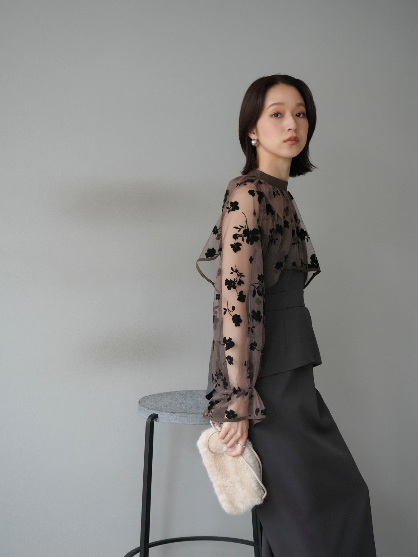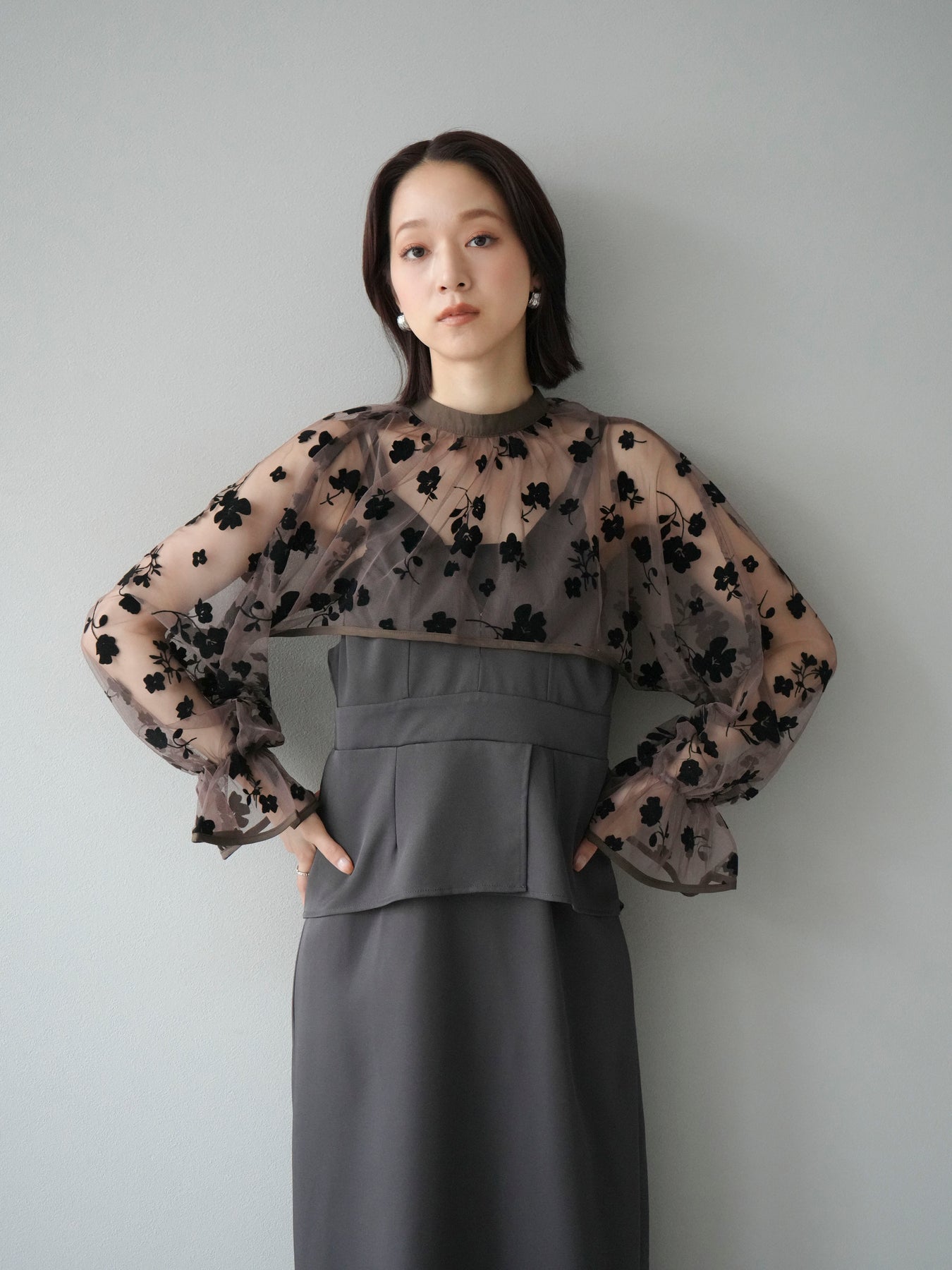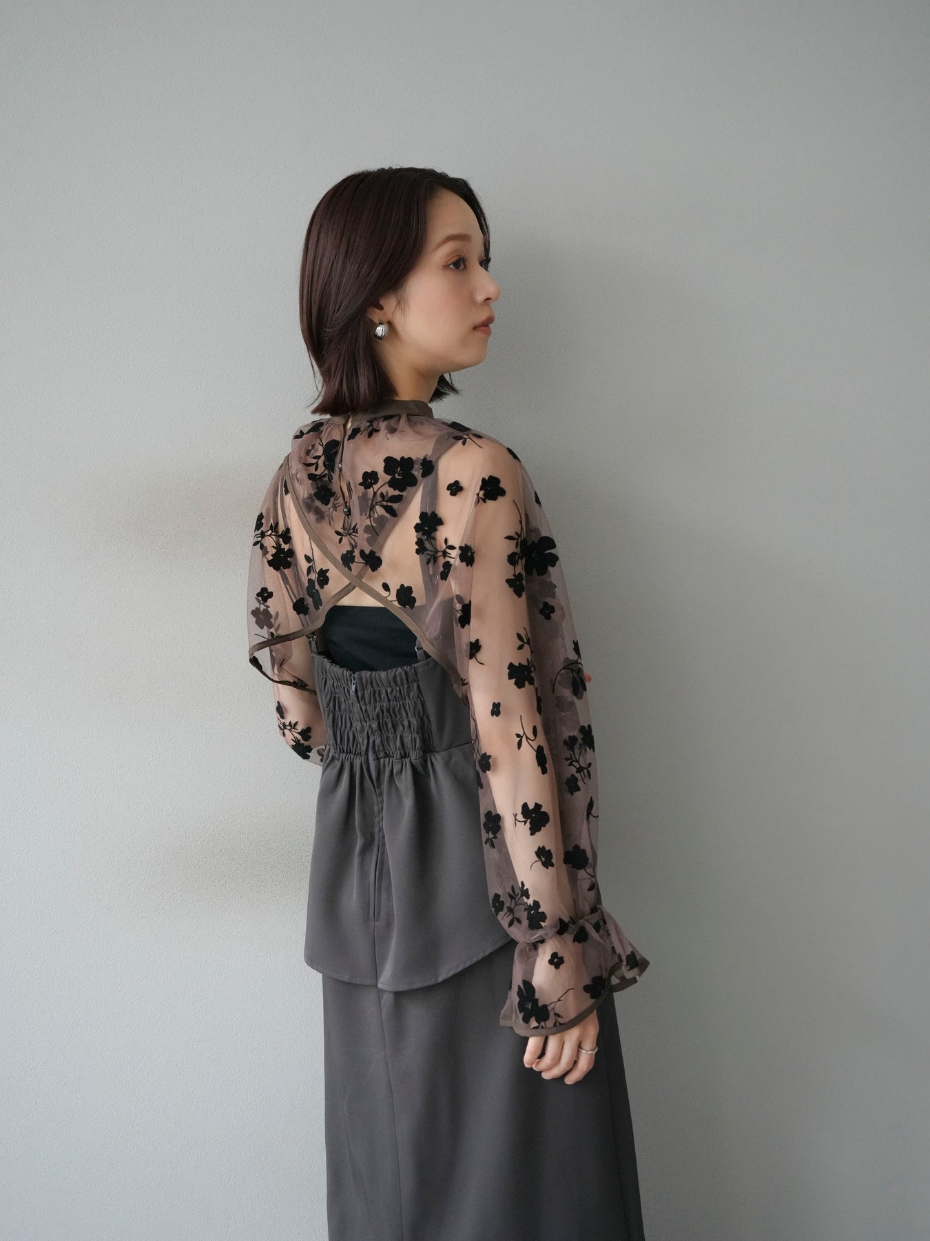 [予約]チュールフラワーフロッキーショートブラウス/ブラウン
