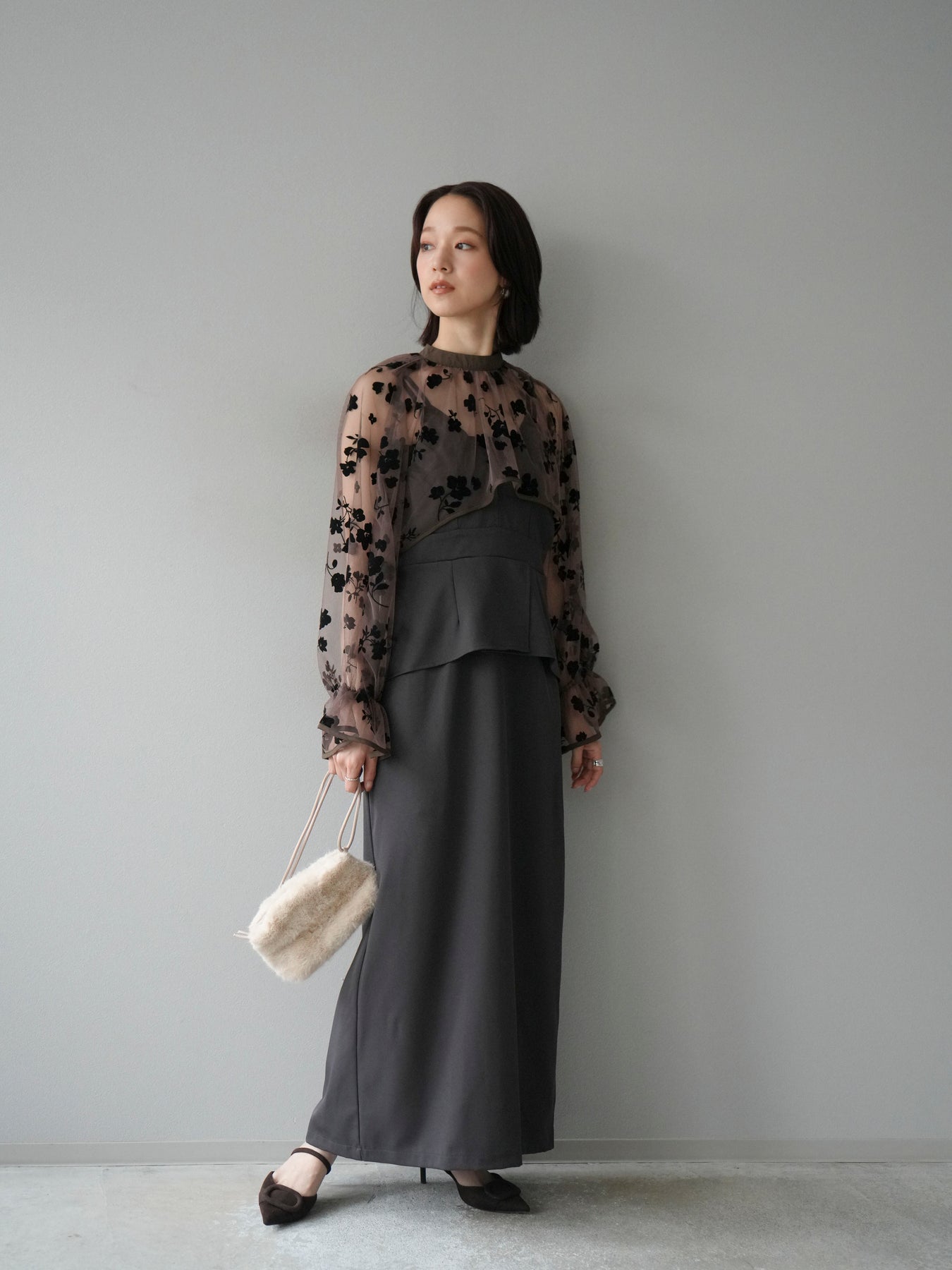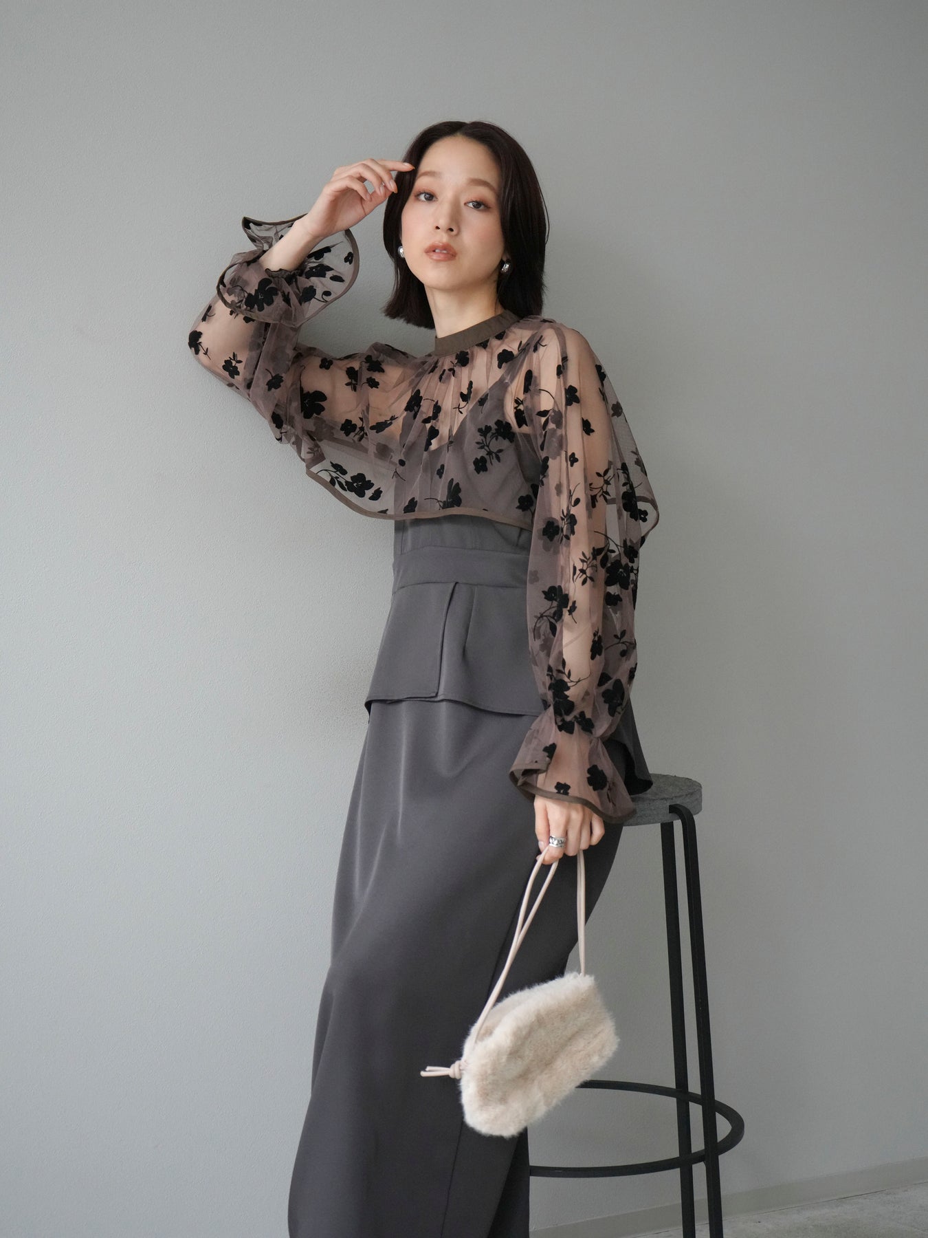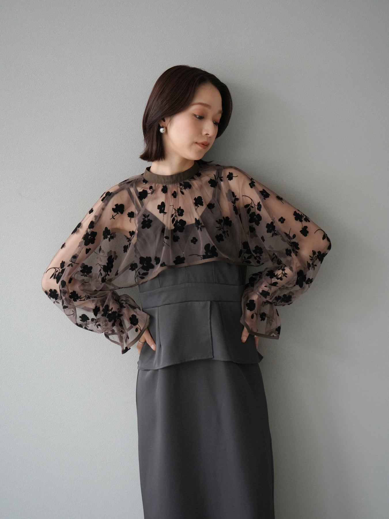 [予約]チュールフラワーフロッキーショートブラウス/ブラウン