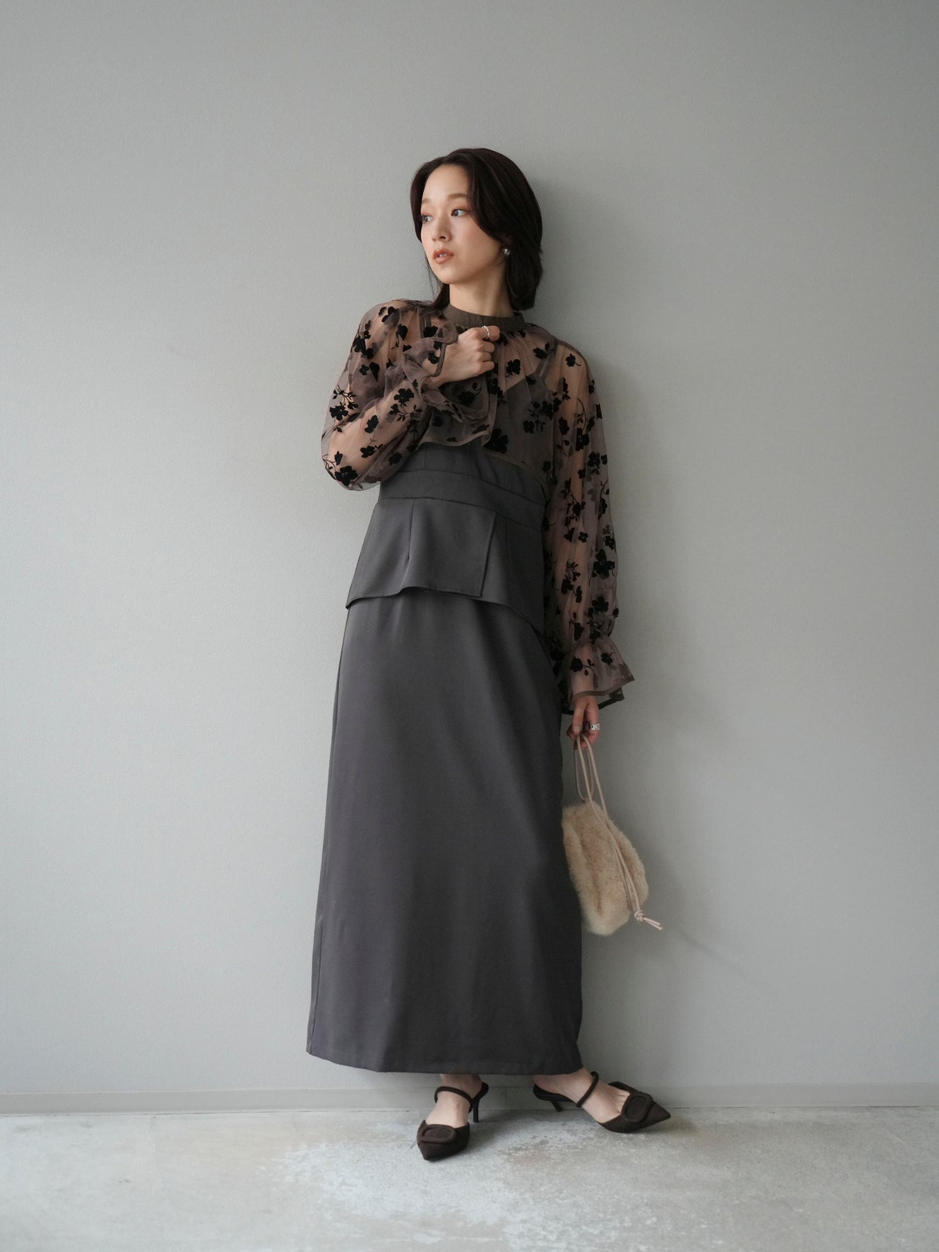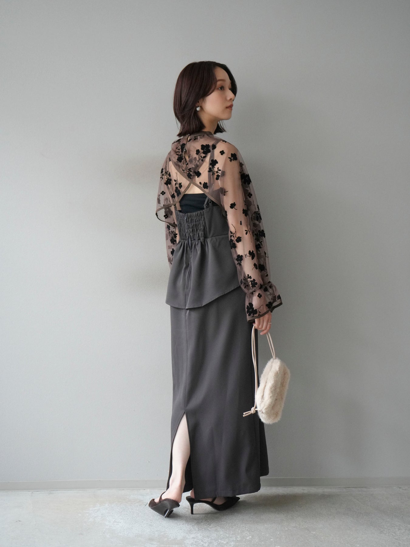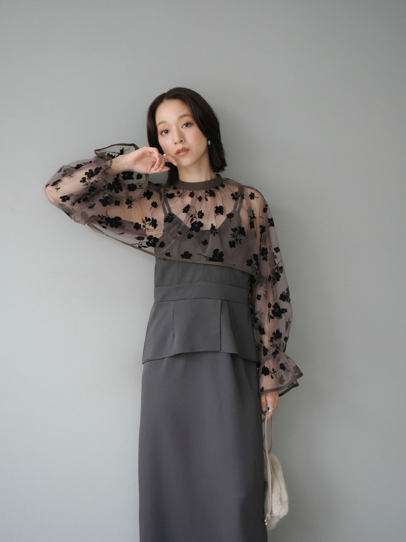 繊細なチュール生地にフロッキー加工のフラワーモチーフを施したショートブラウス。程よい透け感と立体的な質感が女性らしさを引き立て、スタイリングに華やかさをプラスします。コンパクトな丈感でバランスが取りやすく、ワンピースやキャミソールとのレイヤードにも最適。袖口にかけて広がるフレアスリーブが、上品で軽やかな印象を与えます。特別なシーンにも映える上質なデザインブラウスです。 ※ボトムス、キャミソール(インナー)以外の商品は一律でインナーは付属していません。