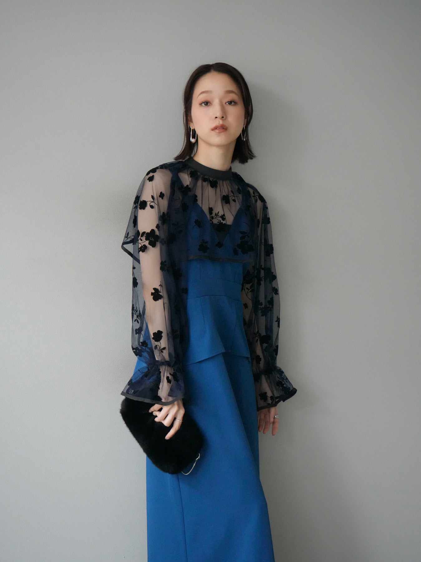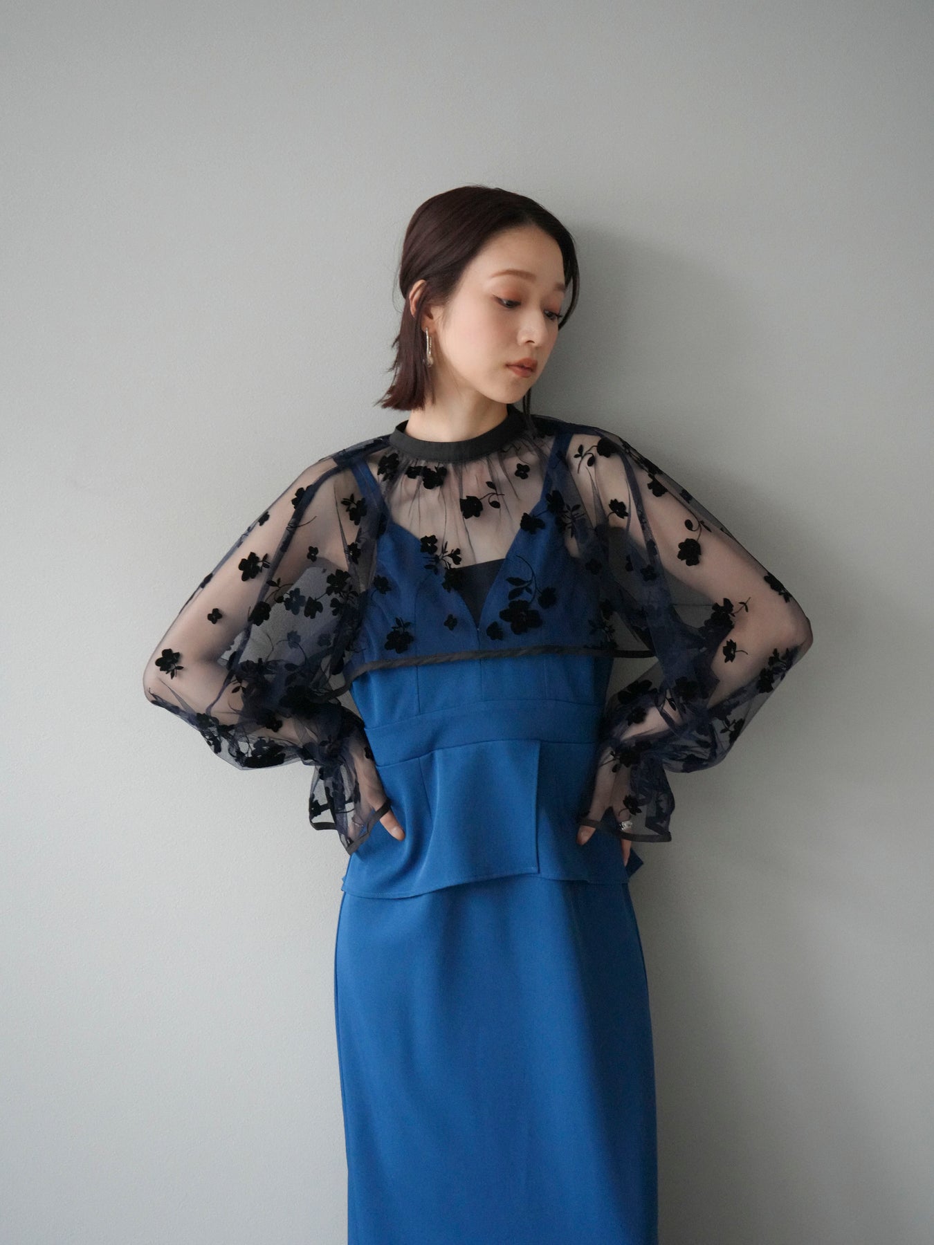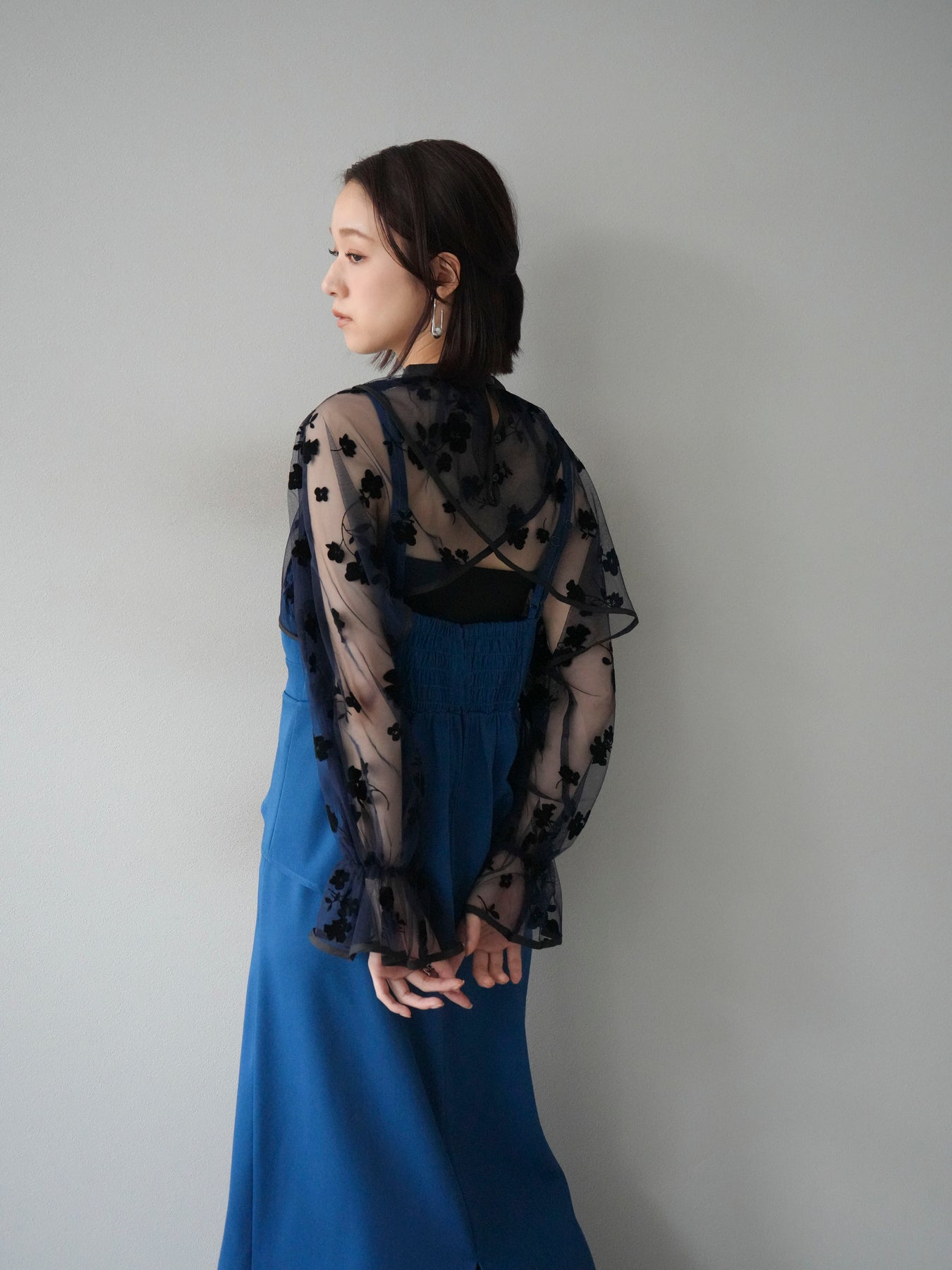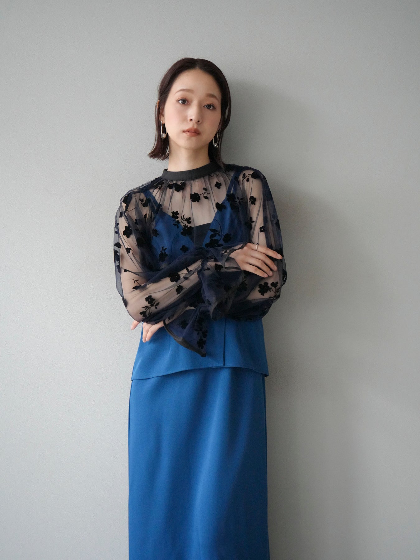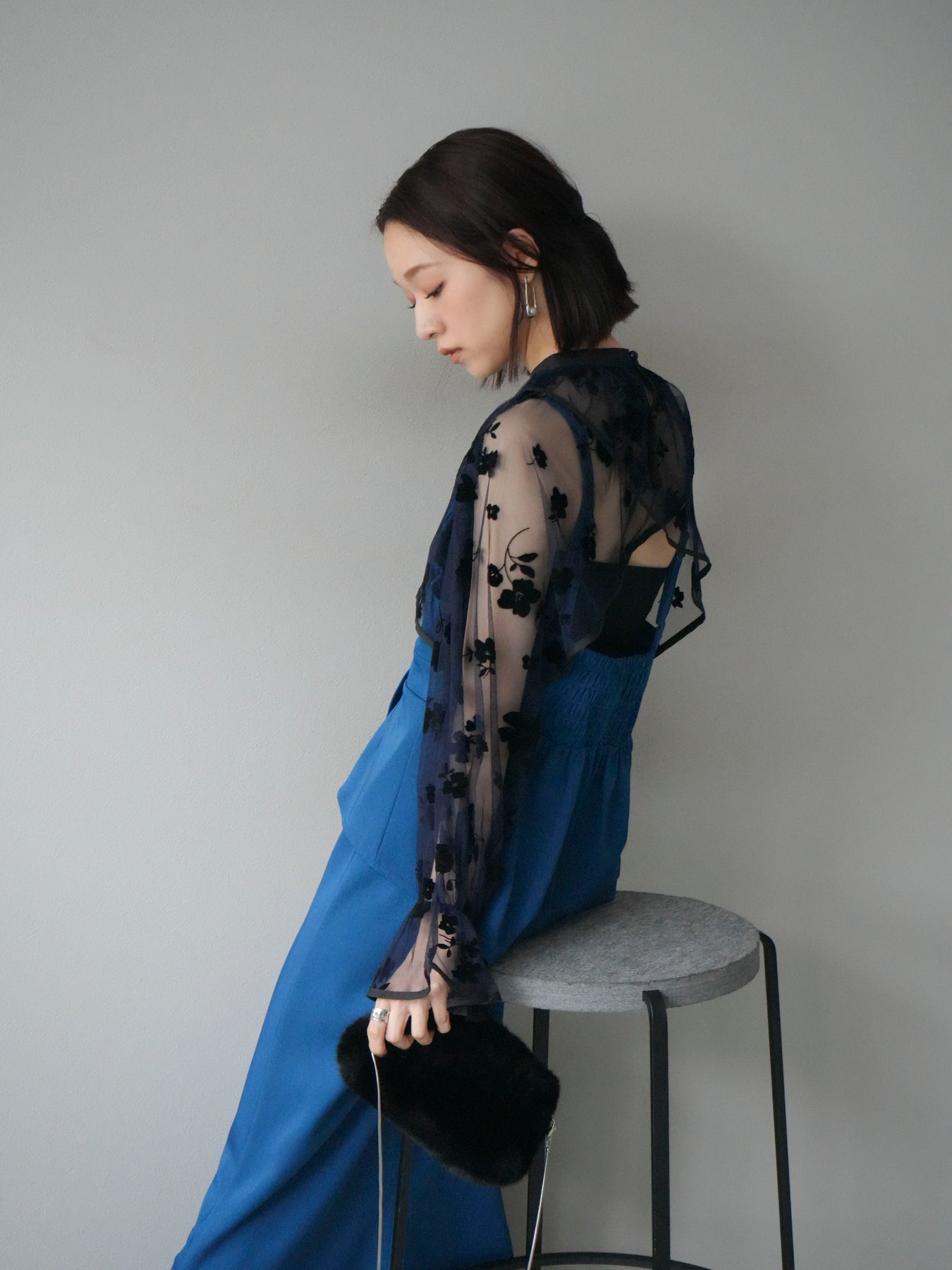 [予約]チュールフラワーフロッキーショートブラウス/ネイビー