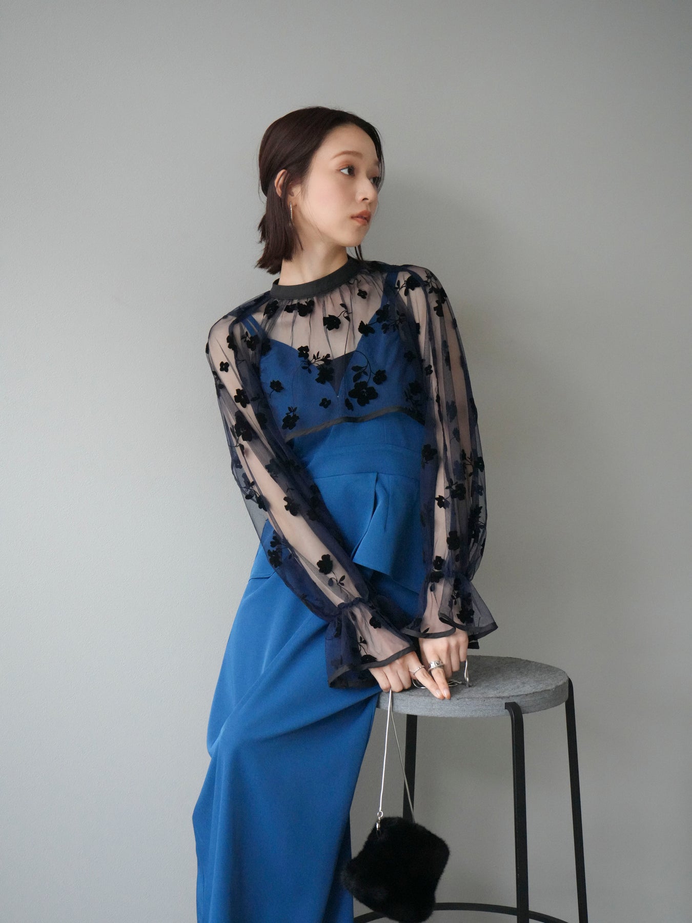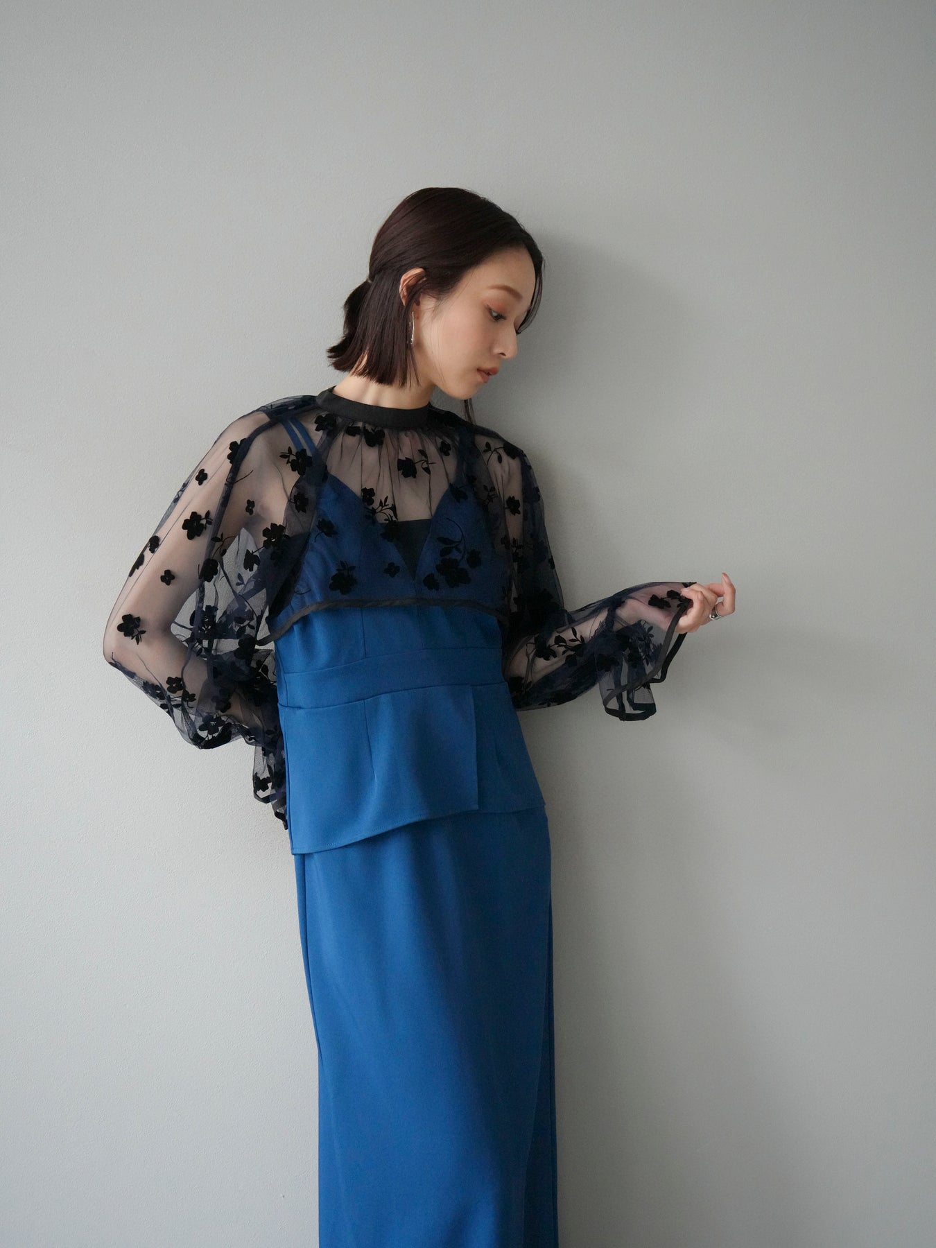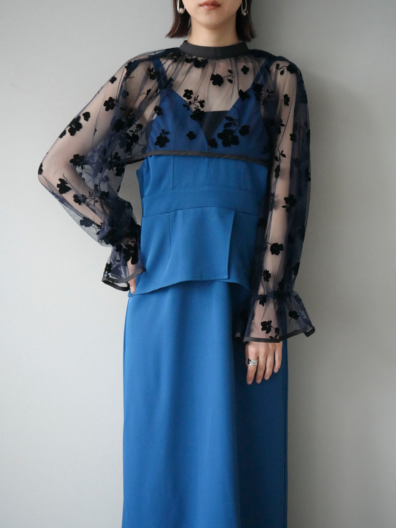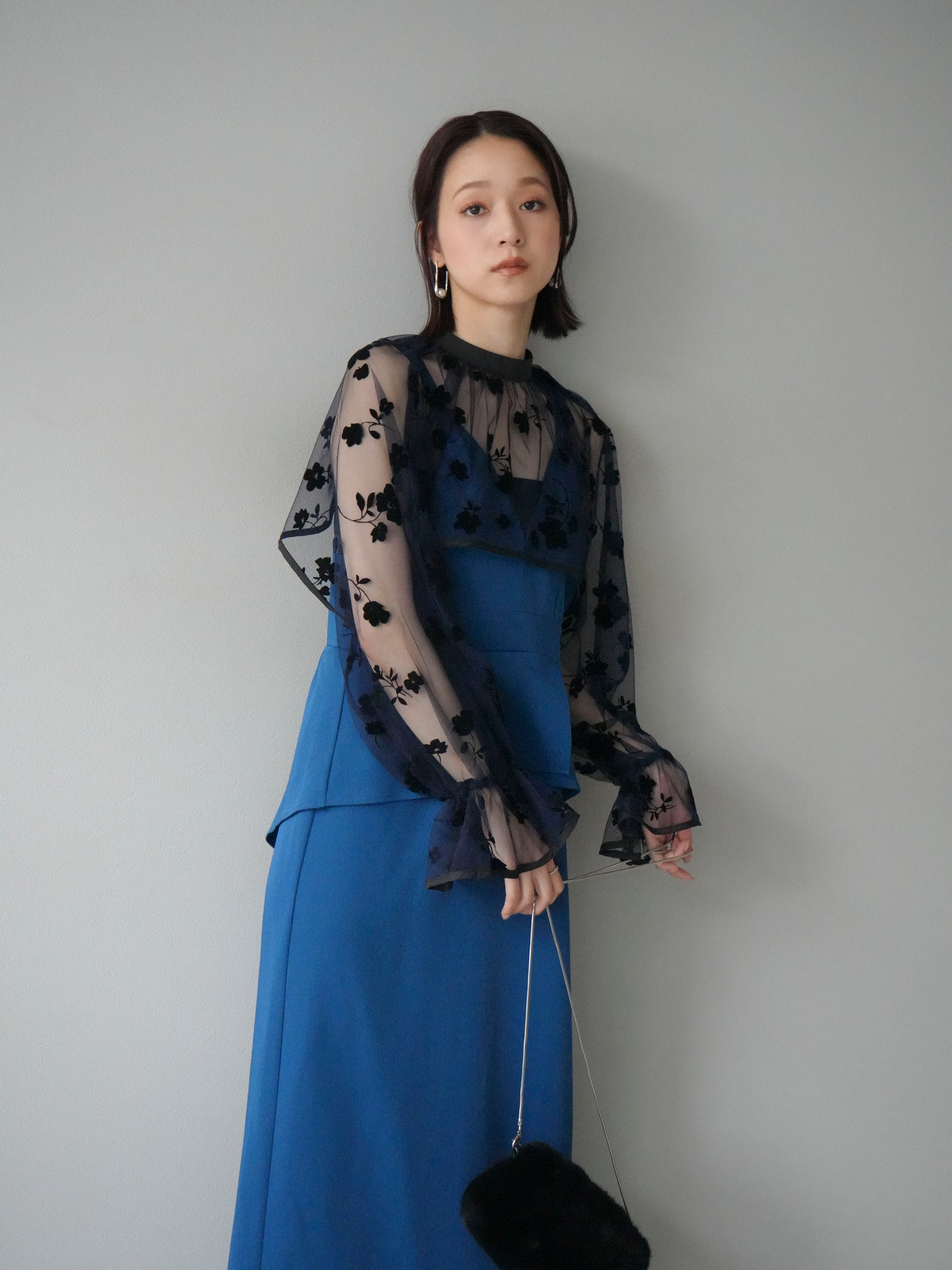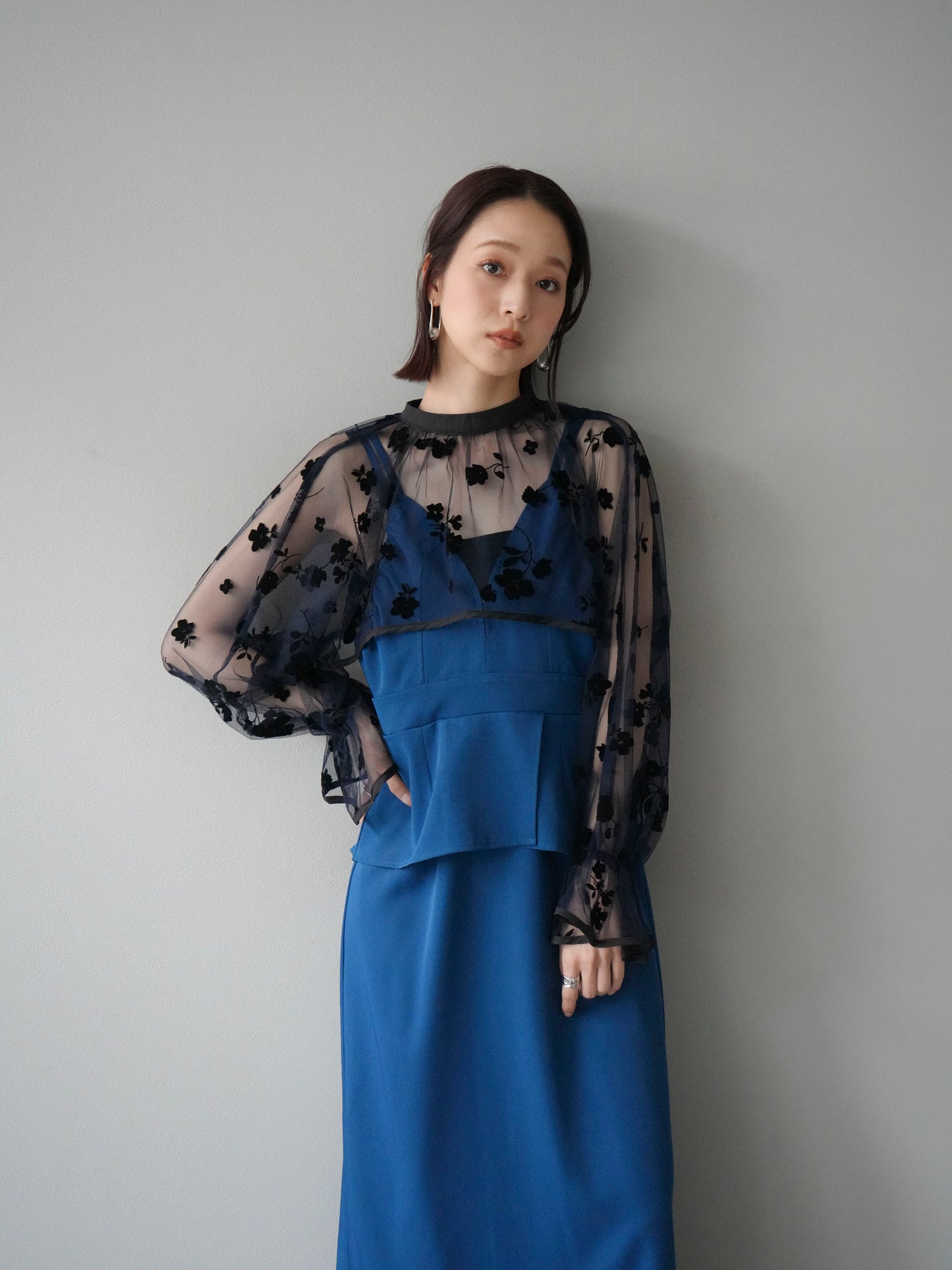 [予約]チュールフラワーフロッキーショートブラウス/ネイビー