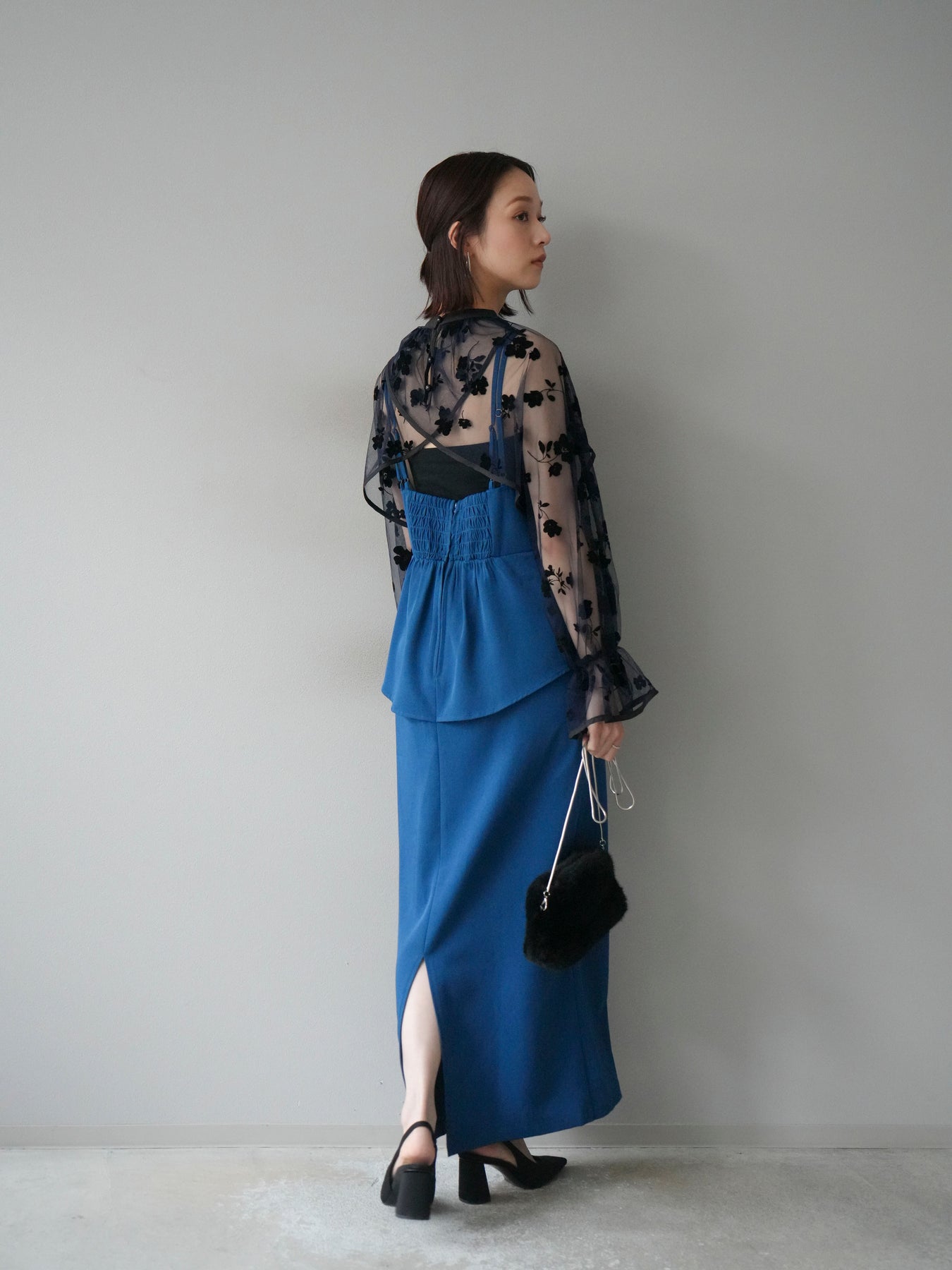 繊細なチュール生地にフロッキー加工のフラワーモチーフを施したショートブラウス。程よい透け感と立体的な質感が女性らしさを引き立て、スタイリングに華やかさをプラスします。コンパクトな丈感でバランスが取りやすく、ワンピースやキャミソールとのレイヤードにも最適。袖口にかけて広がるフレアスリーブが、上品で軽やかな印象を与えます。特別なシーンにも映える上質なデザインブラウスです。 ※ボトムス、キャミソール(インナー)以外の商品は一律でインナーは付属していません。