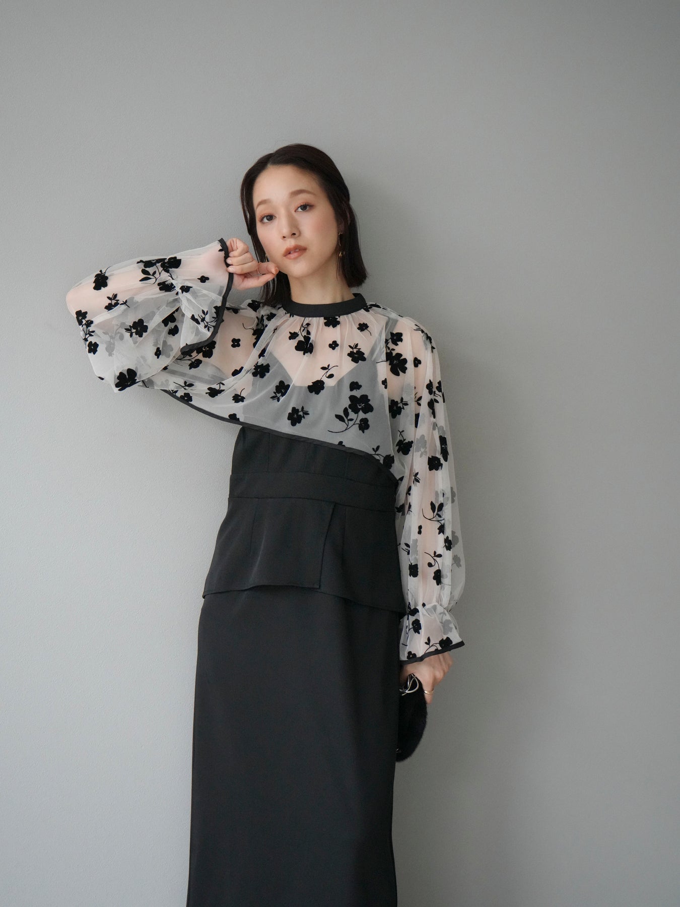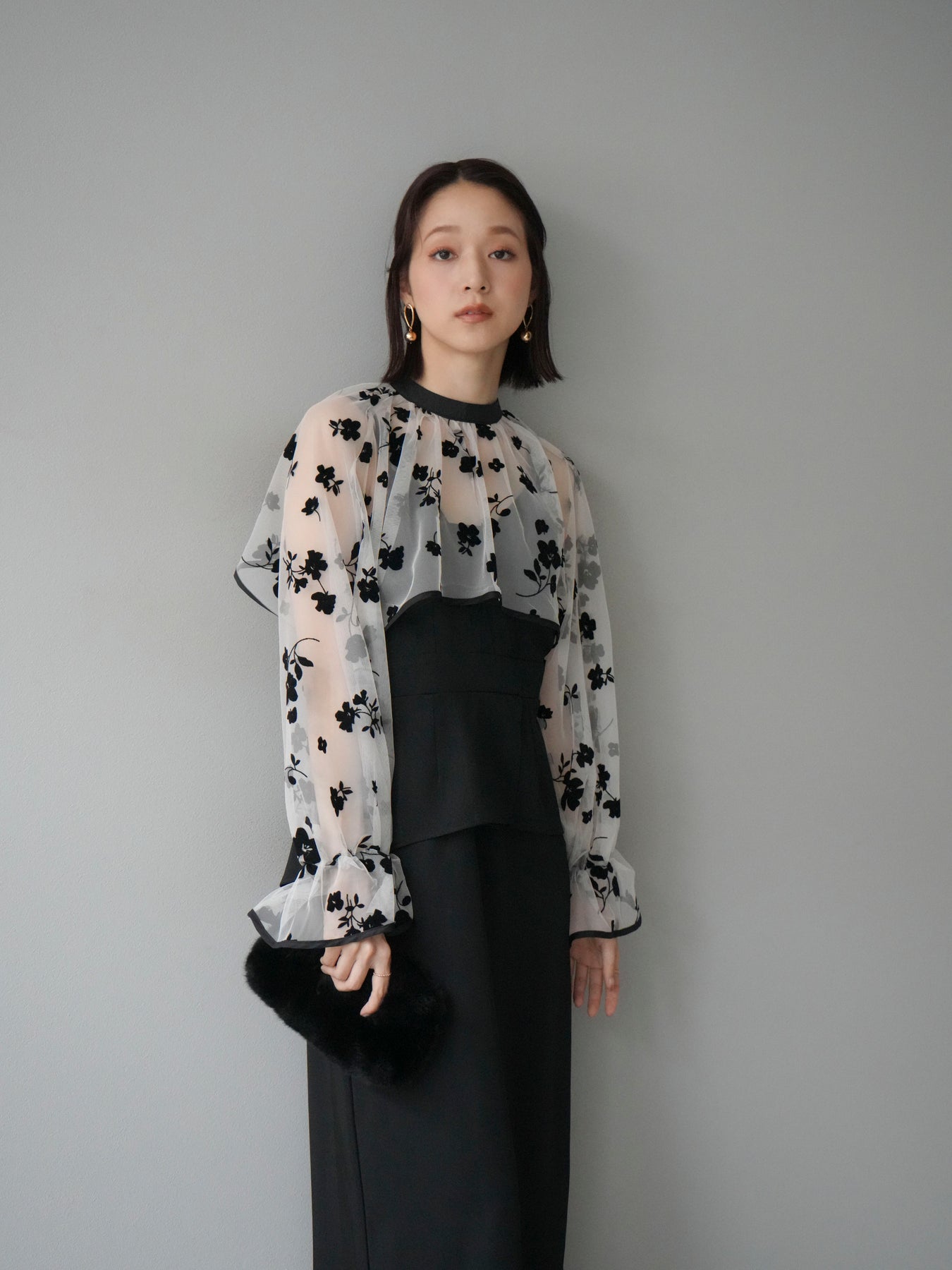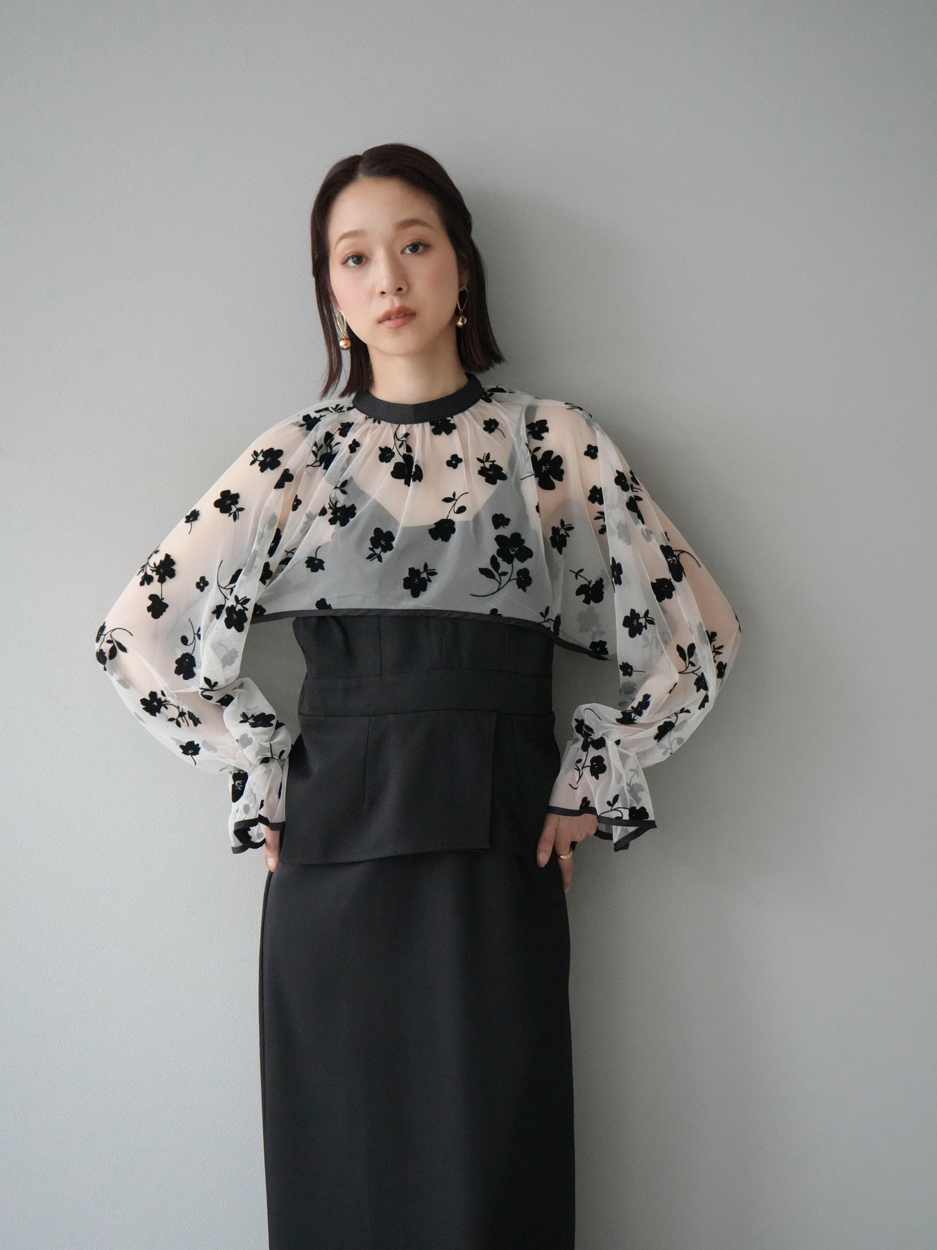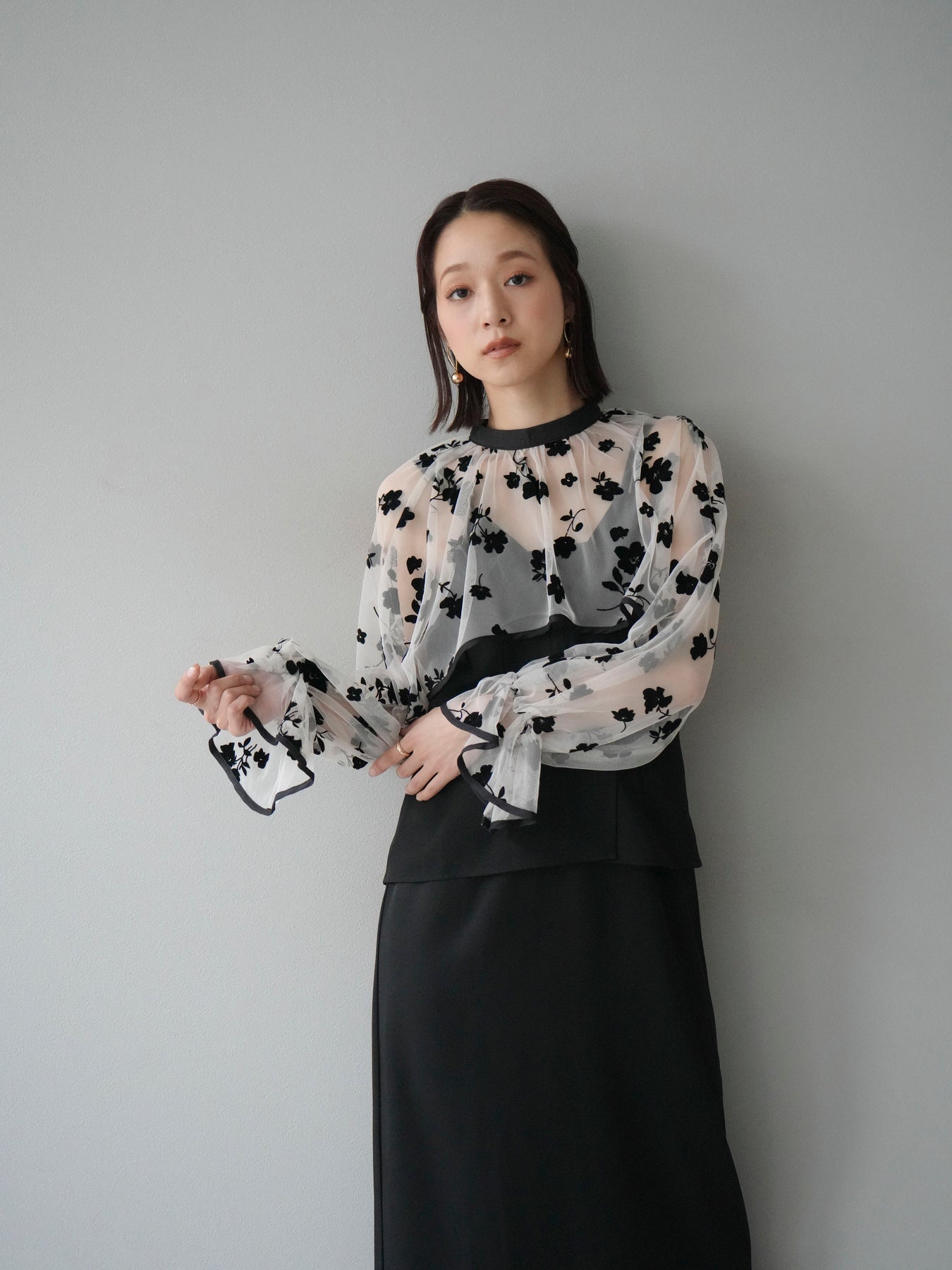 繊細なチュール生地にフロッキー加工のフラワーモチーフを施したショートブラウス。程よい透け感と立体的な質感が女性らしさを引き立て、スタイリングに華やかさをプラスします。コンパクトな丈感でバランスが取りやすく、ワンピースやキャミソールとのレイヤードにも最適。袖口にかけて広がるフレアスリーブが、上品で軽やかな印象を与えます。特別なシーンにも映える上質なデザインブラウスです。 ※ボトムス、キャミソール(インナー)以外の商品は一律でインナーは付属していません。