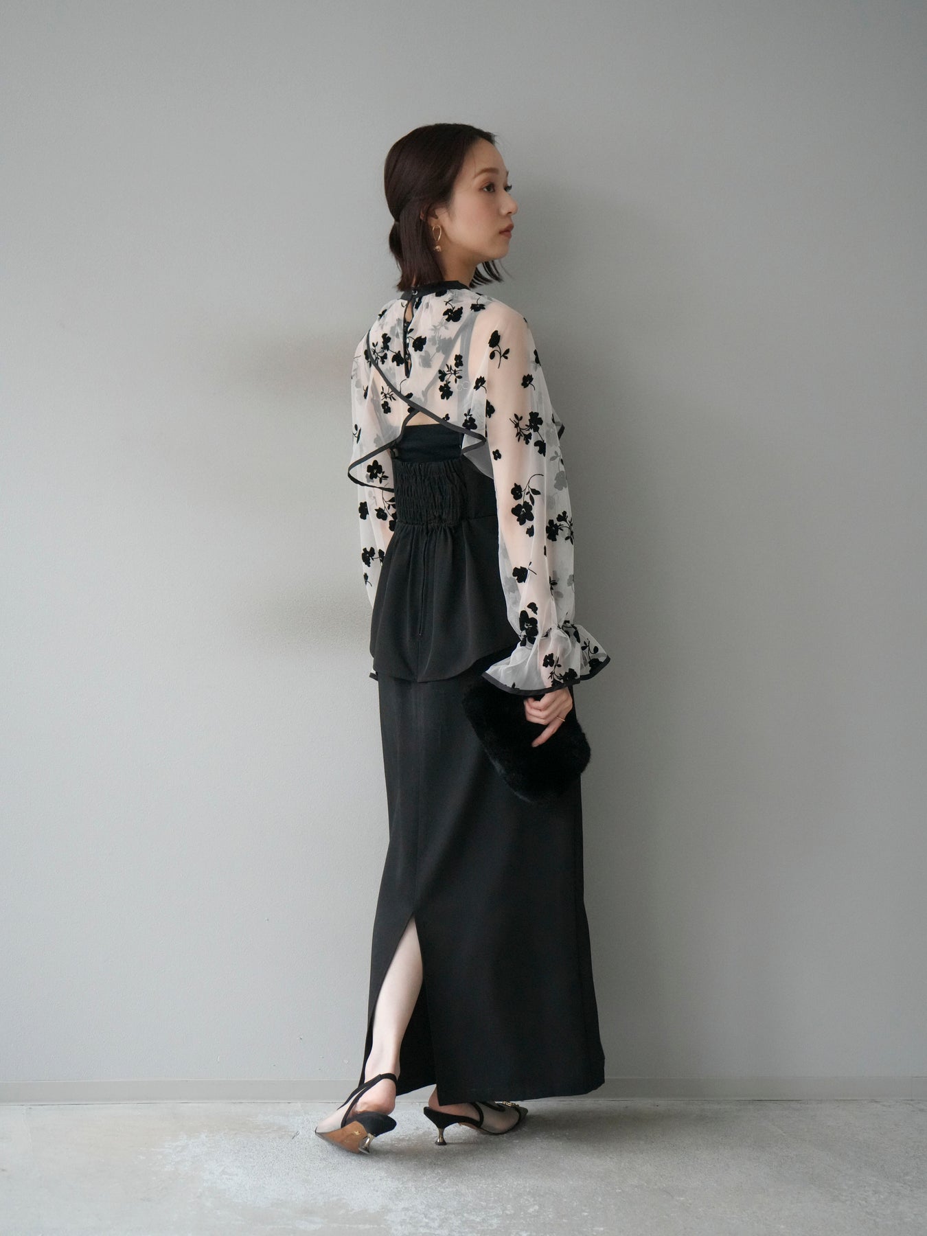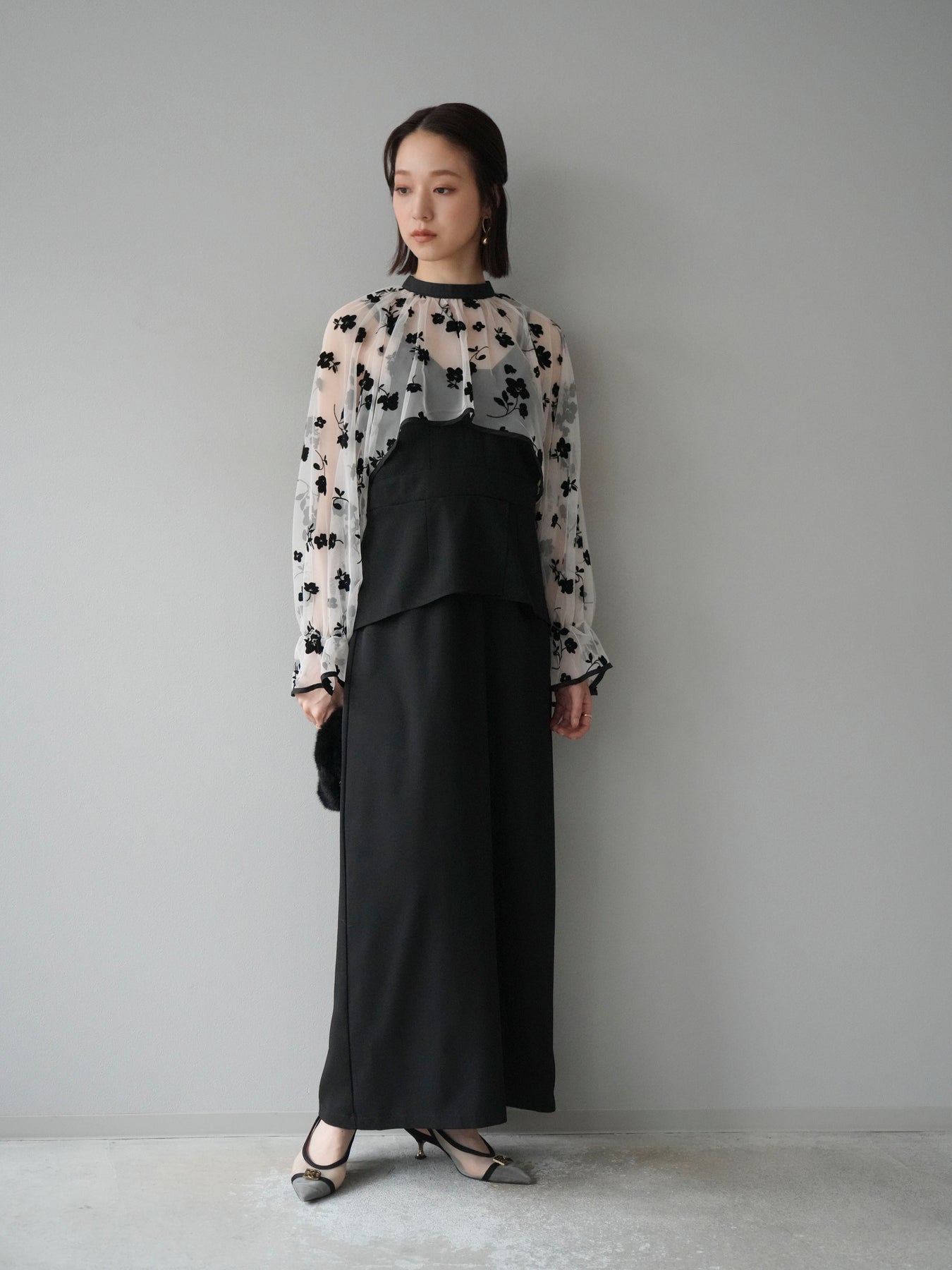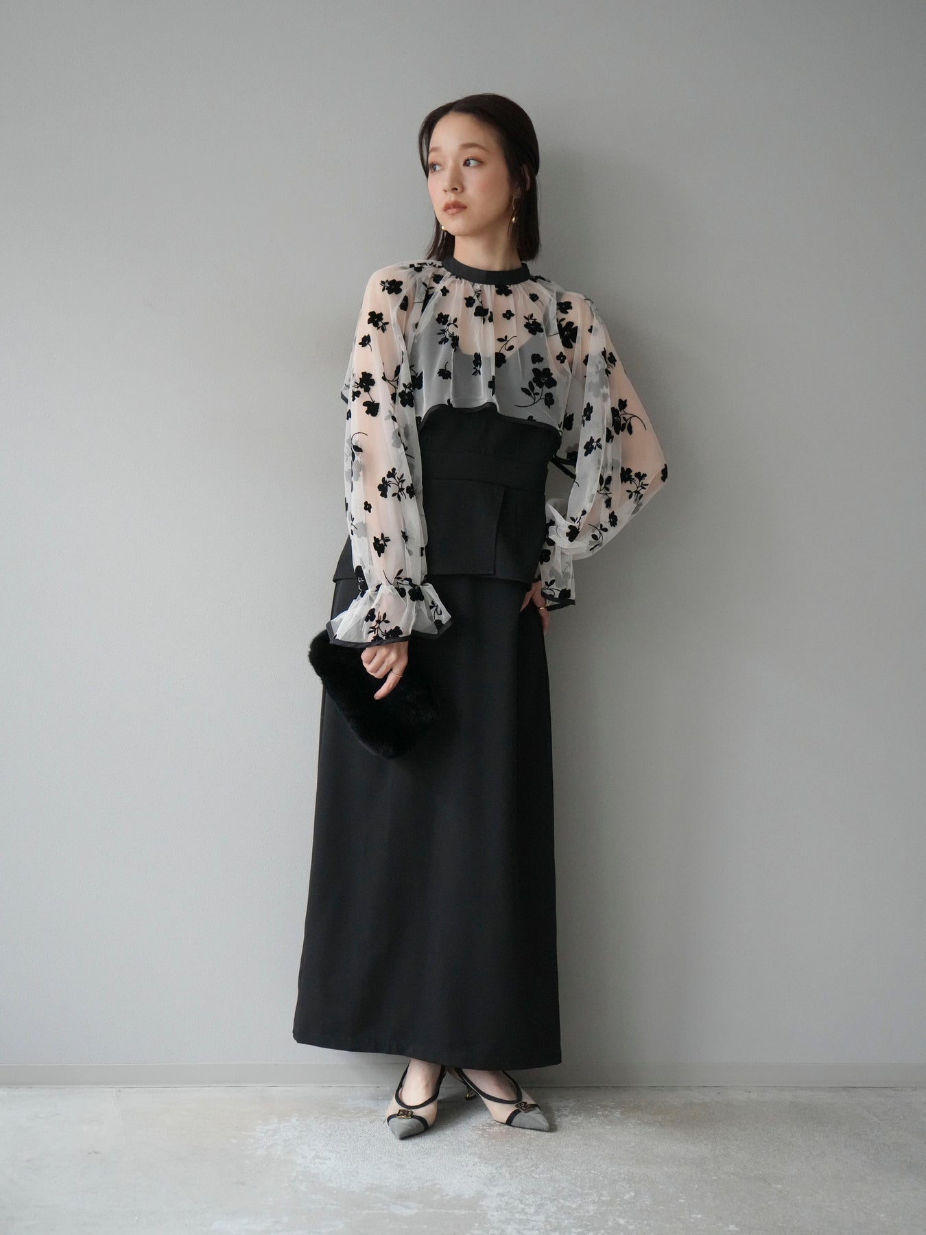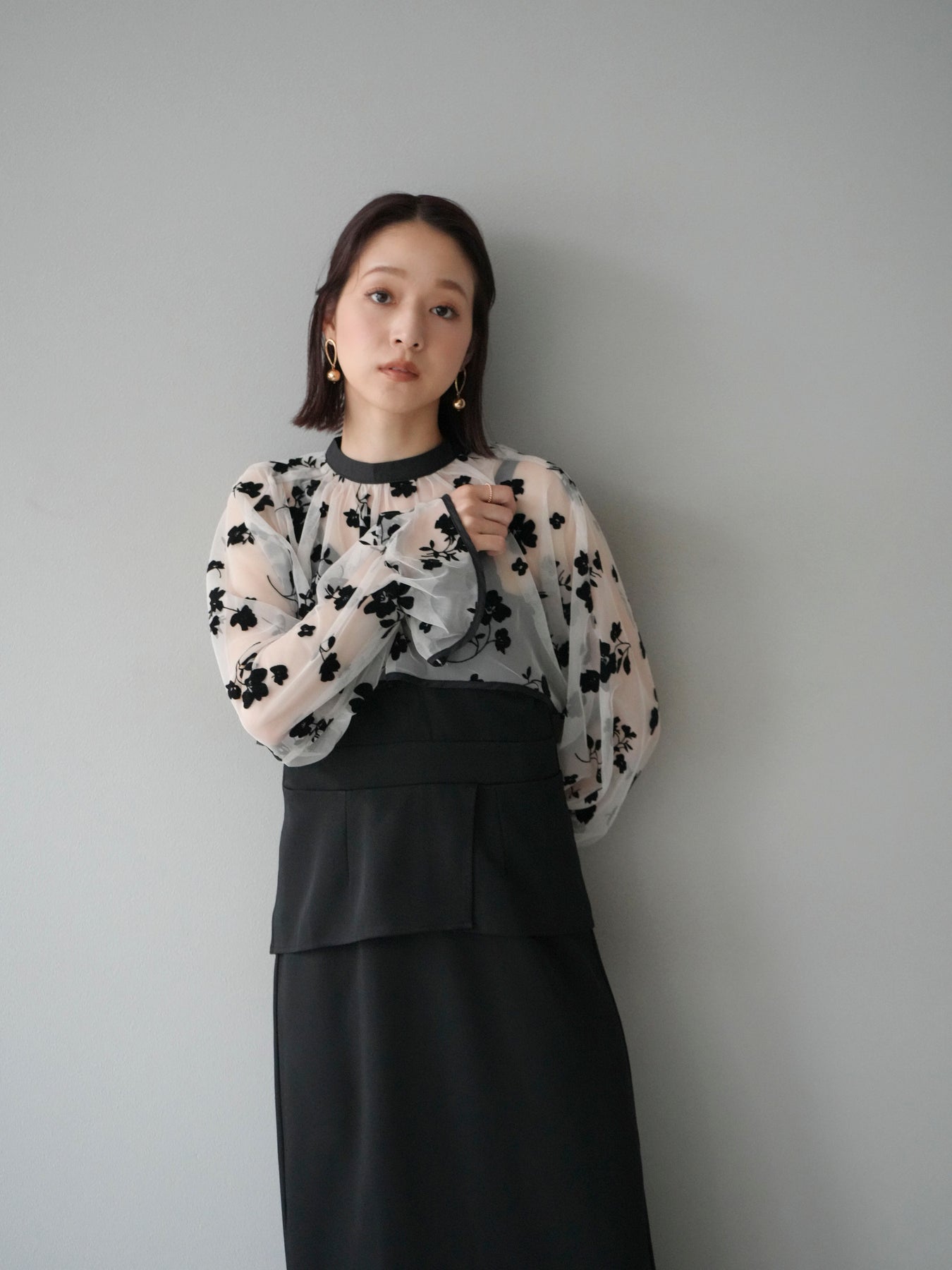 繊細なチュール生地にフロッキー加工のフラワーモチーフを施したショートブラウス。程よい透け感と立体的な質感が女性らしさを引き立て、スタイリングに華やかさをプラスします。コンパクトな丈感でバランスが取りやすく、ワンピースやキャミソールとのレイヤードにも最適。袖口にかけて広がるフレアスリーブが、上品で軽やかな印象を与えます。特別なシーンにも映える上質なデザインブラウスです。 ※ボトムス、キャミソール(インナー)以外の商品は一律でインナーは付属していません。