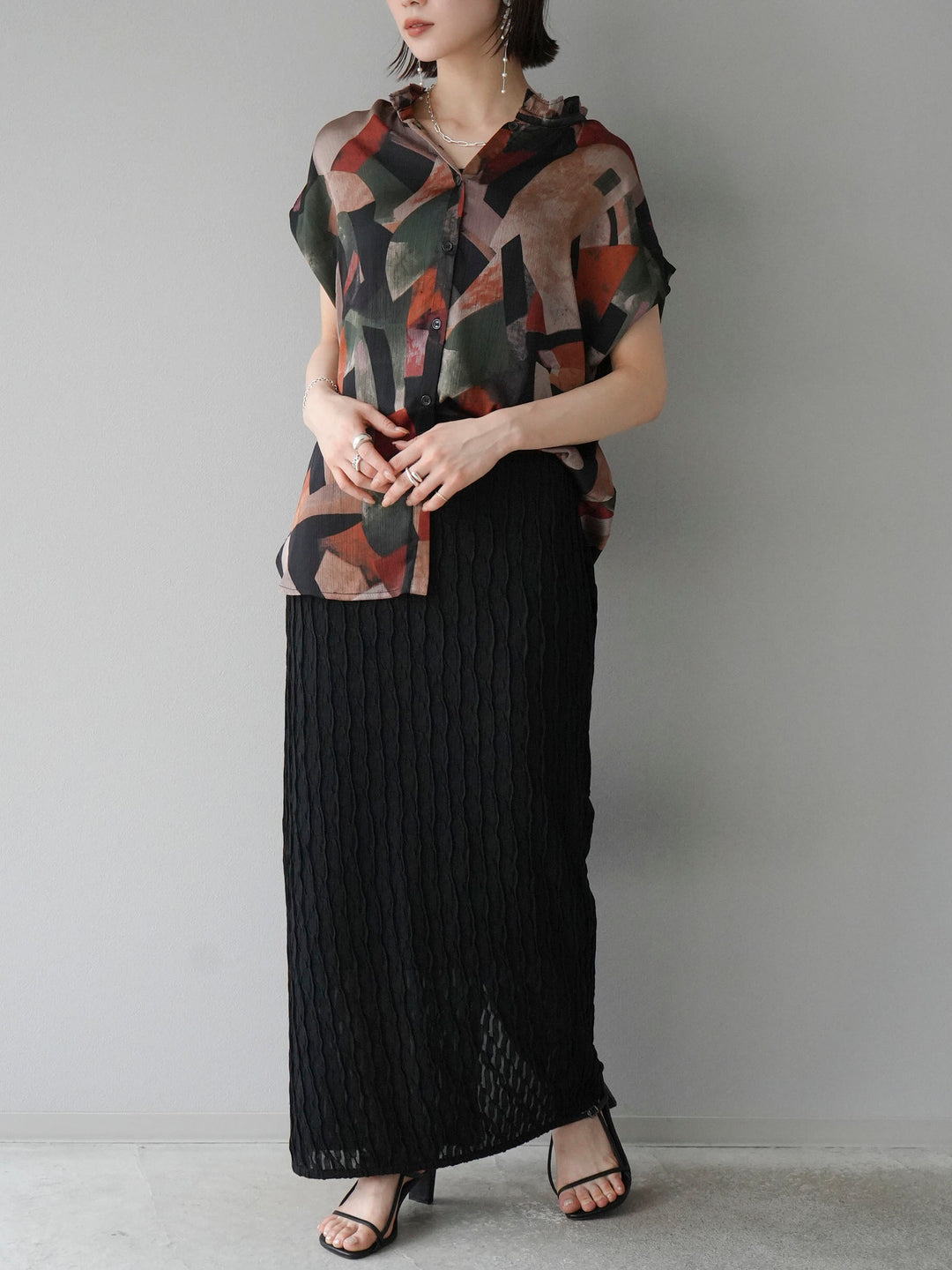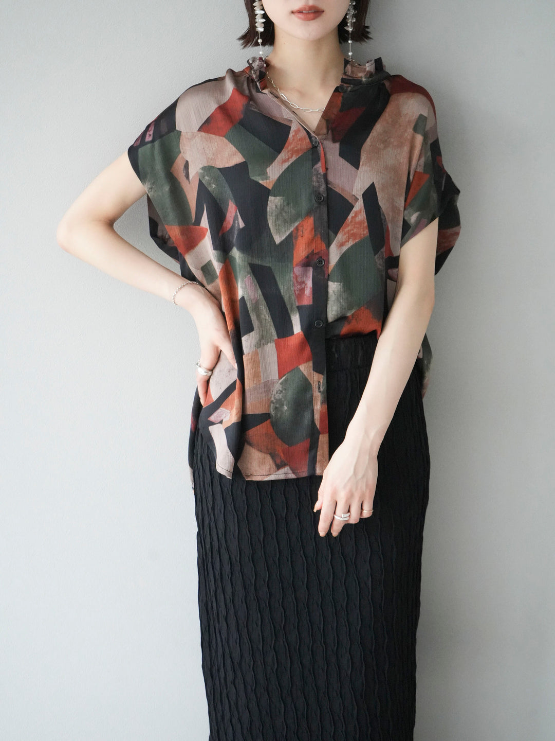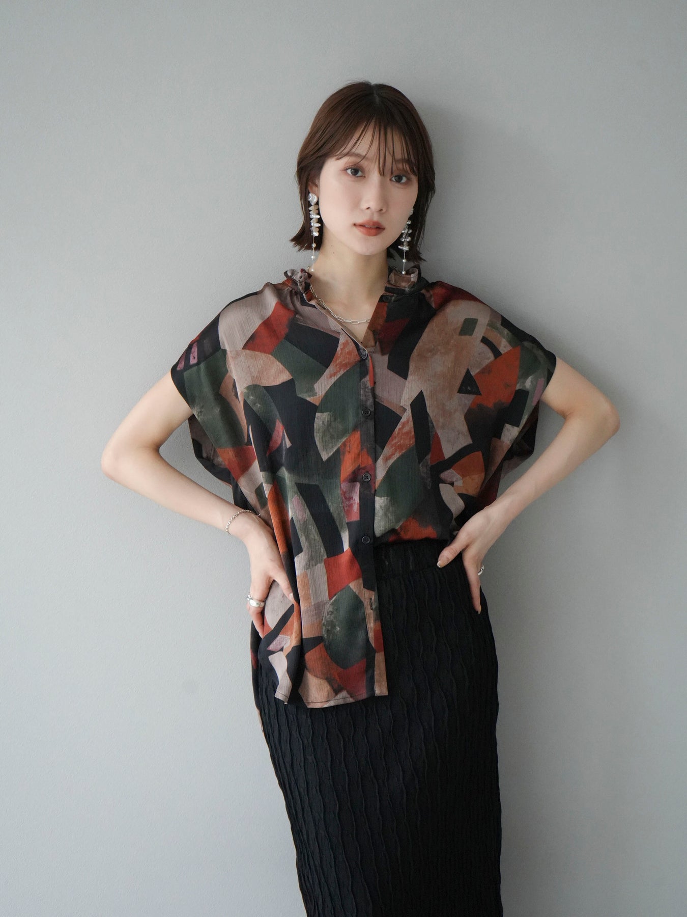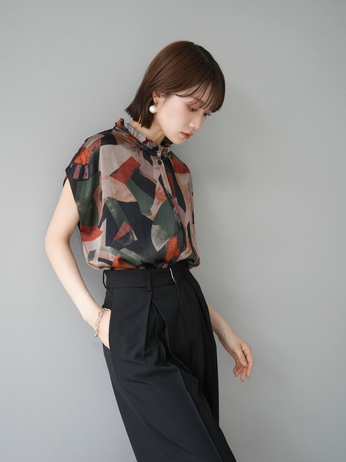 個性的なレトロプリントが目を引くノースリーブブラウス。軽やかな素材感とゆったりとしたシルエットで、快適な着心地を実現します。カジュアルなコーディネートにも、シンプルなパンツやスカートと合わせるだけで洗練されたスタイルが完成します。