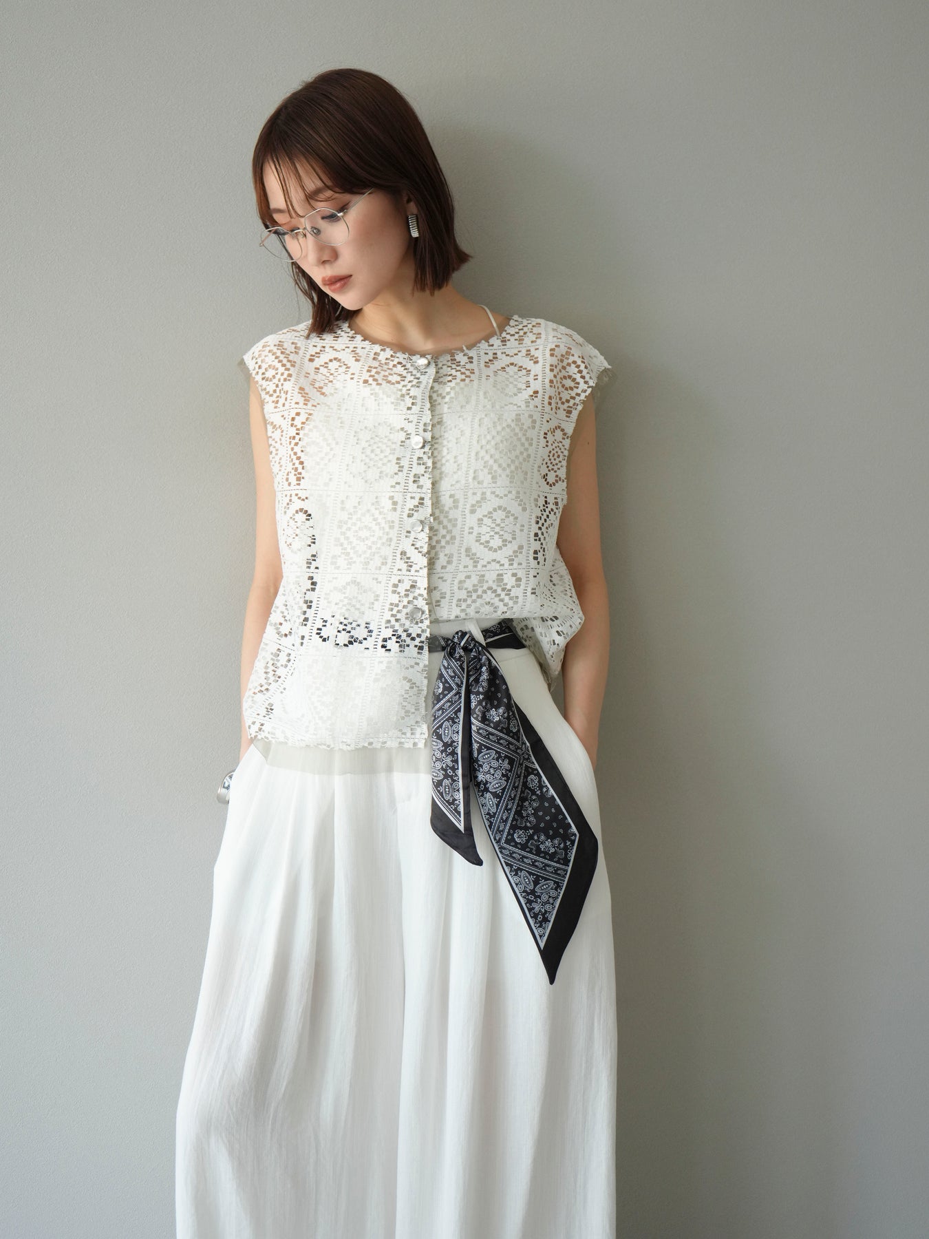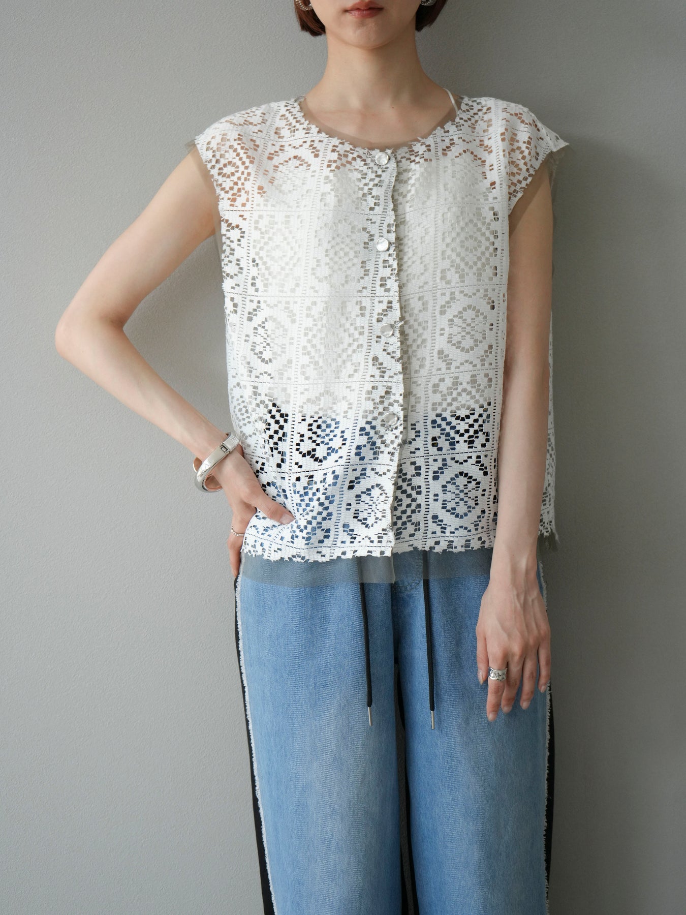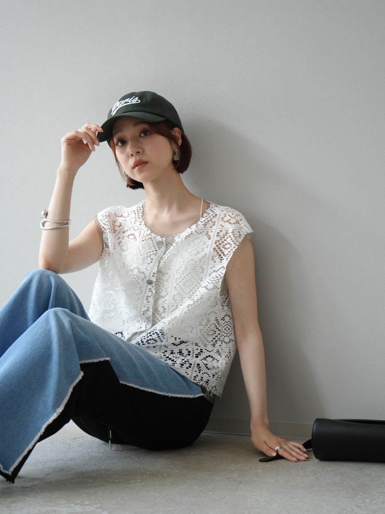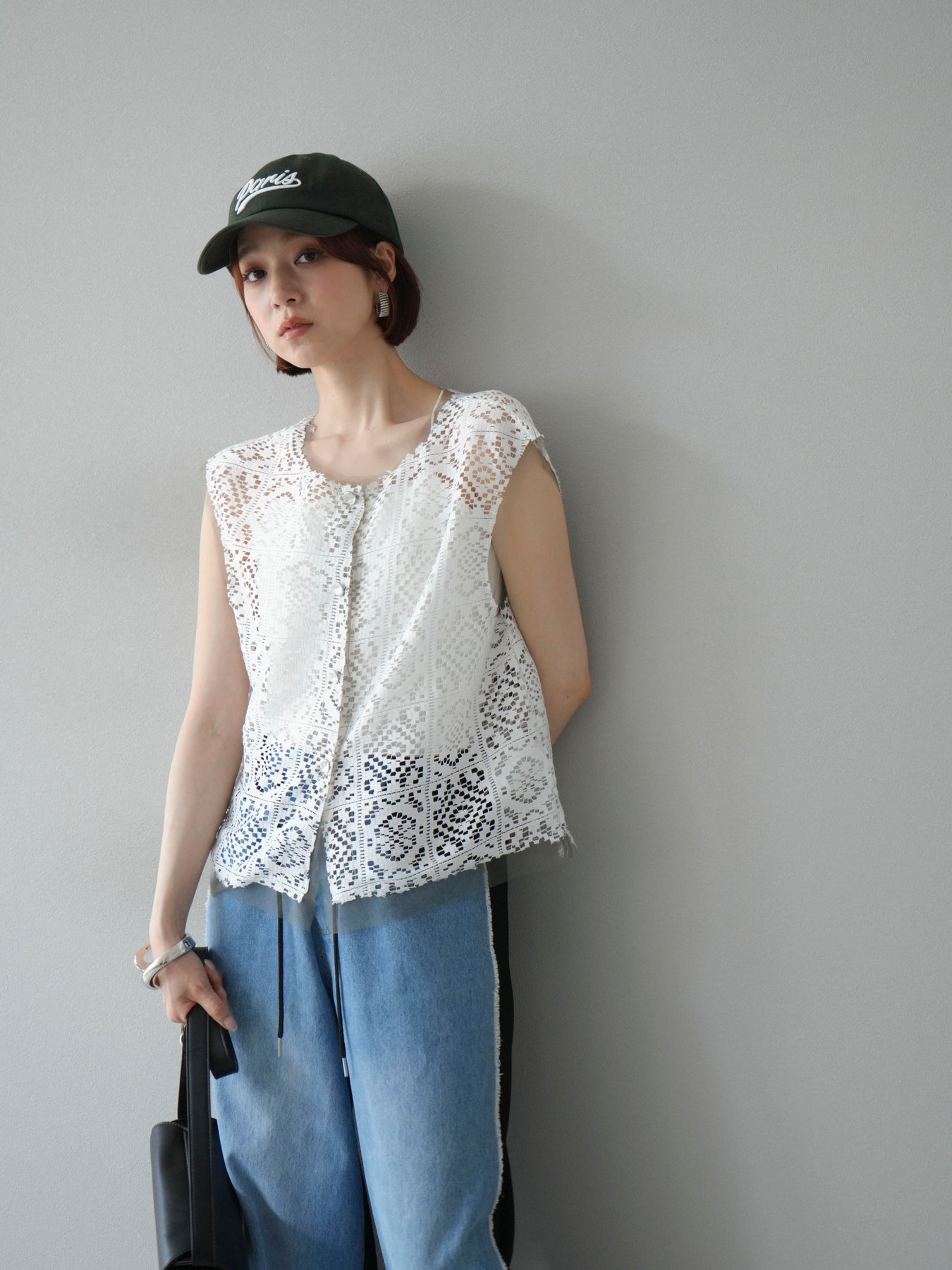 幾何学的なパターンが特徴のブロックレースを使用した、涼しげで華やかな印象のベスト。透け感のある軽やかな素材感で、シーズンムードを高めつつ、レイヤードスタイルにもぴったりな一枚です。 前開き仕様で、ボタンを留めても外しても着こなしの幅が広がり、インナーにTシャツやキャミソールを合わせることで抜け感のあるスタイルが完成します。 パンツにもスカートにも合わせやすく、デイリーはもちろん、リゾートやイベントスタイルにもおすすめです。 ※ボトムス、キャミソール(インナー)以外の商品は一律でインナーは付属していません。