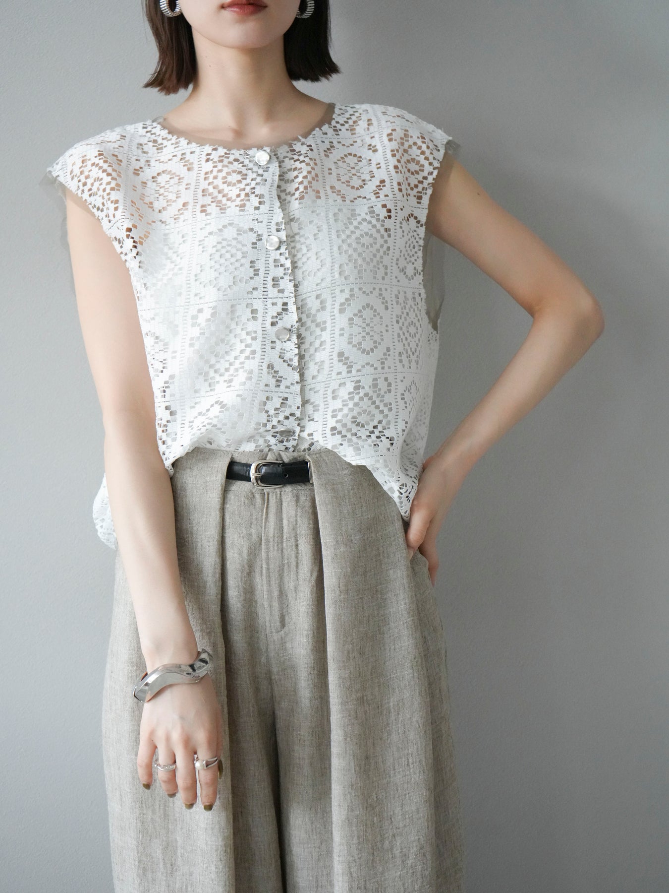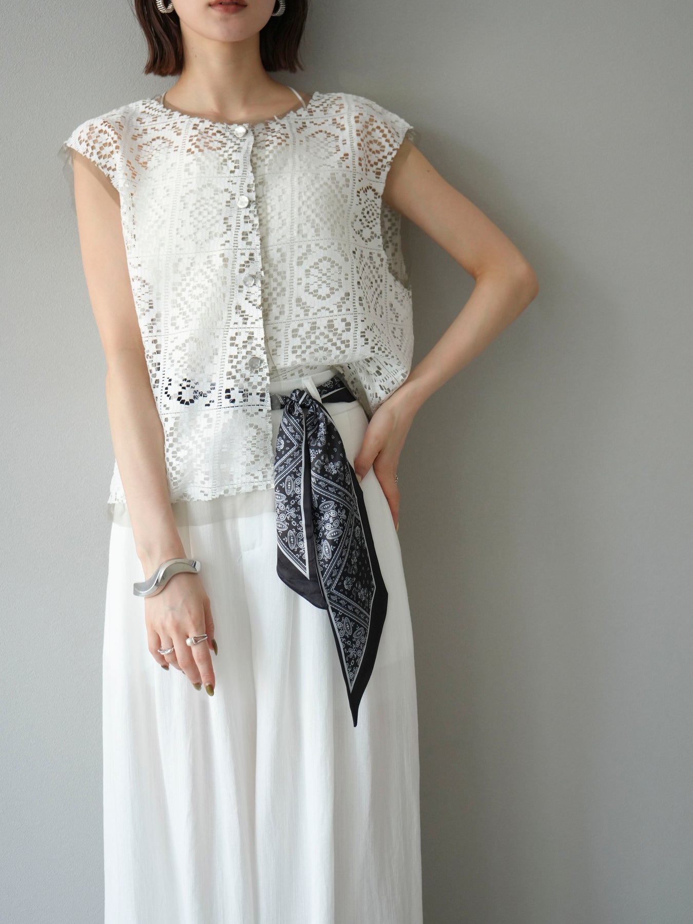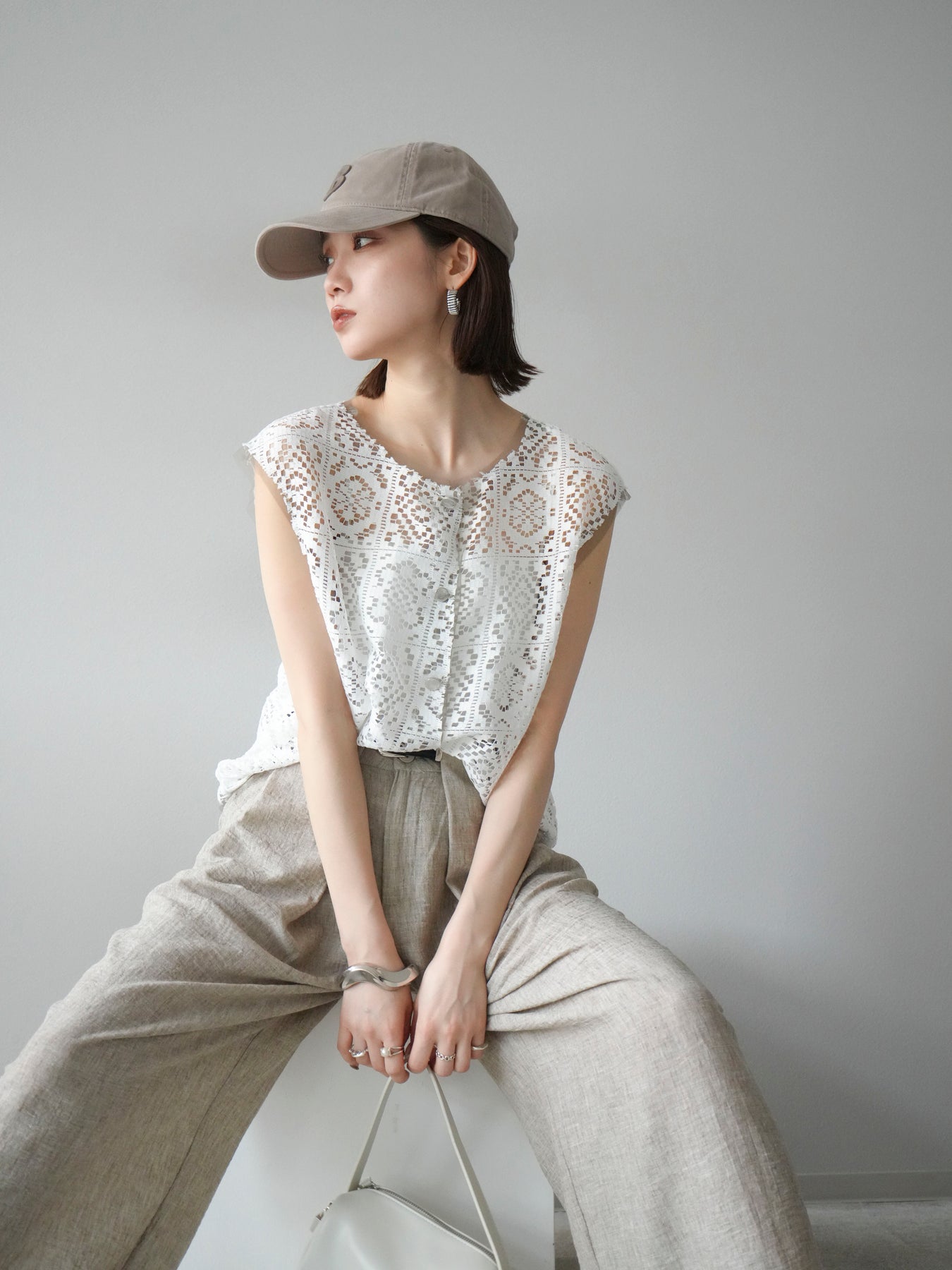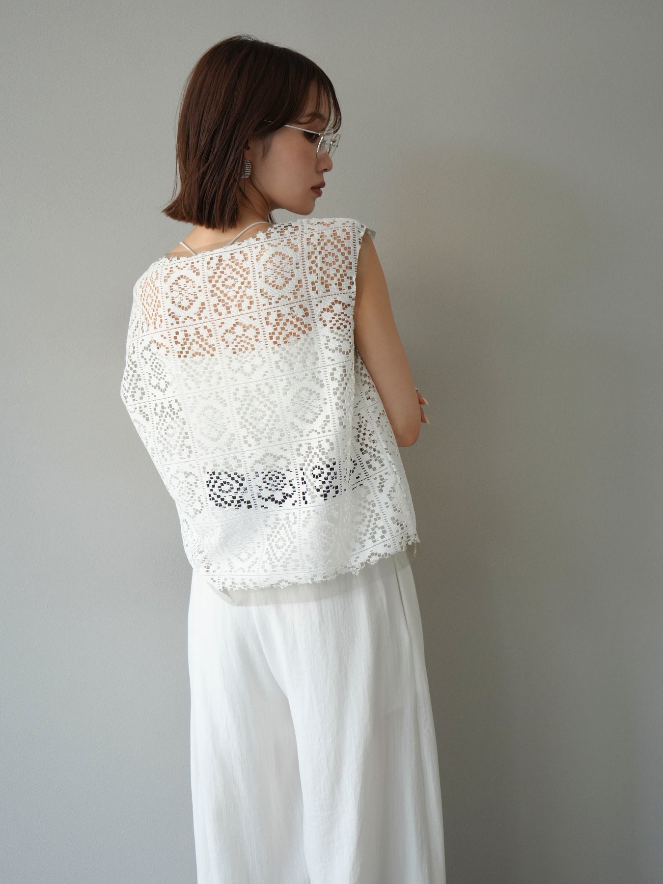 幾何学的なパターンが特徴のブロックレースを使用した、涼しげで華やかな印象のベスト。透け感のある軽やかな素材感で、シーズンムードを高めつつ、レイヤードスタイルにもぴったりな一枚です。 前開き仕様で、ボタンを留めても外しても着こなしの幅が広がり、インナーにTシャツやキャミソールを合わせることで抜け感のあるスタイルが完成します。 パンツにもスカートにも合わせやすく、デイリーはもちろん、リゾートやイベントスタイルにもおすすめです。 ※ボトムス、キャミソール(インナー)以外の商品は一律でインナーは付属していません。