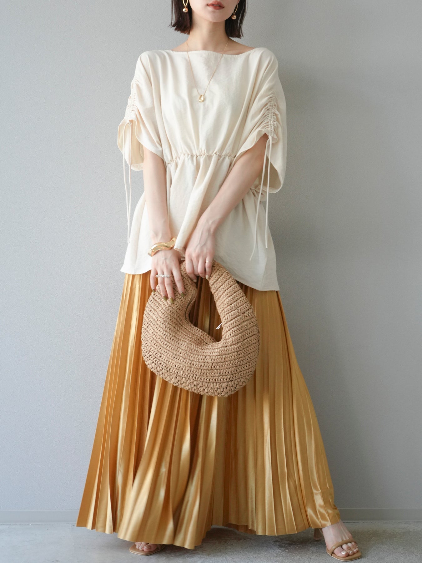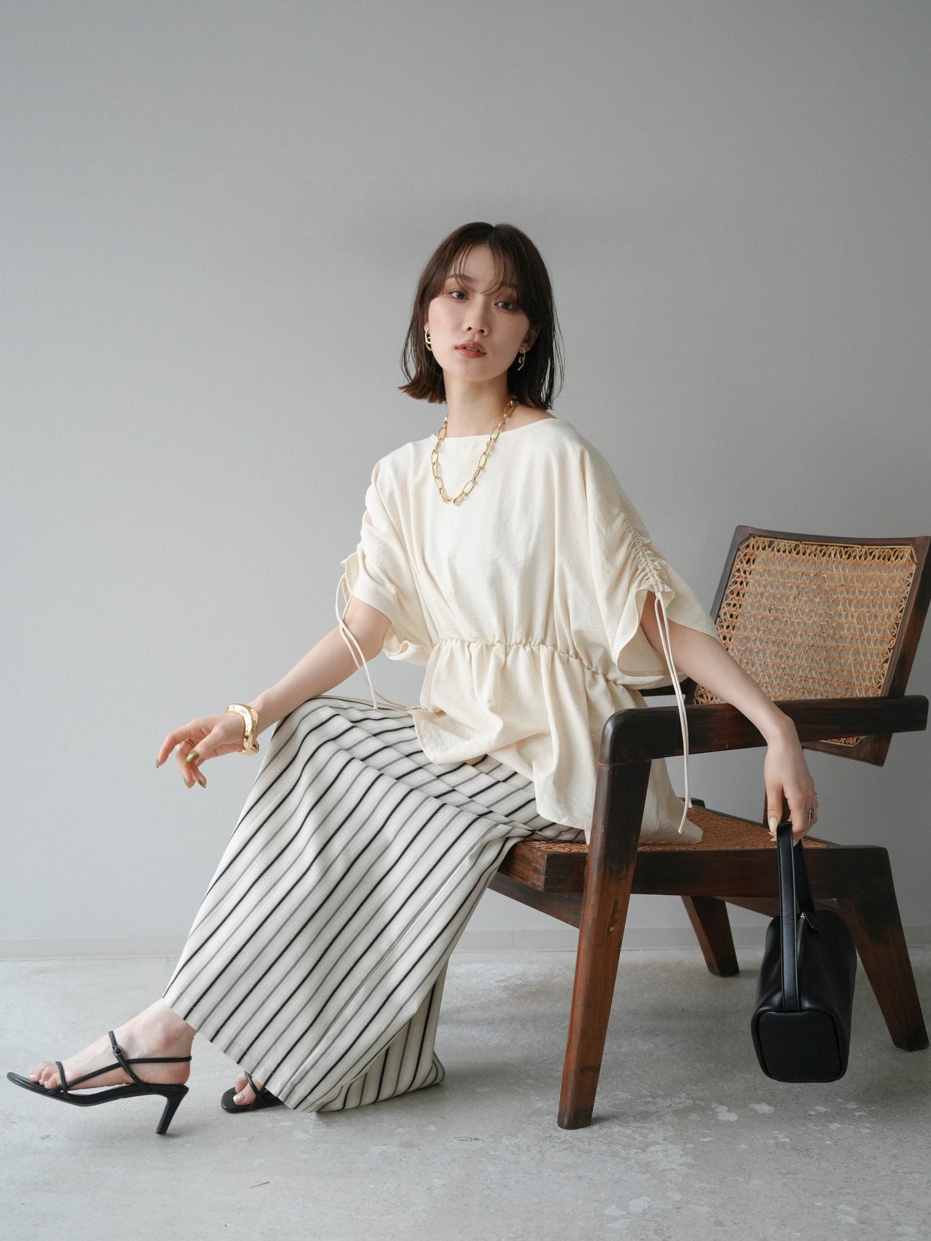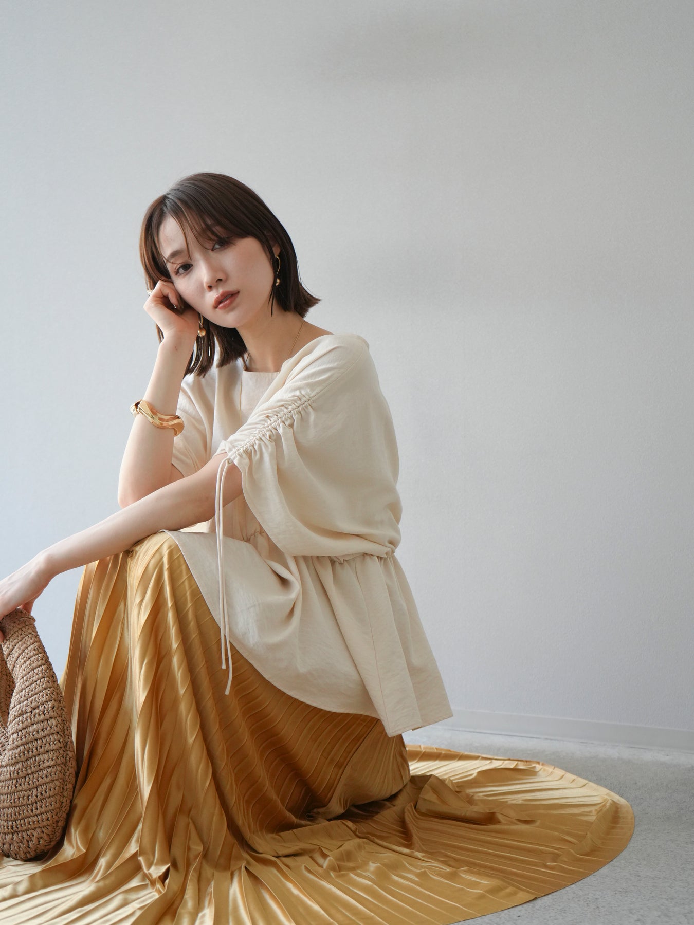 柔らかく落ち感のある素材に、ウエストと袖に施したシャーリングがアクセントになったデザインブラウス。ギャザーの寄せ具合でシルエットに動きを生み出し、ナチュラルながらも女性らしい印象に仕上がります。 腰まわりを自然にカバーするチュニック丈で、体のラインを拾いにくく、リラクシーな着心地も魅力。ボトムスを選ばず、デニムやワイドパンツ、柄物とのスタイリングにも映える一着です。 一枚で着映えが叶う、デイリーにもお出かけにも活躍するアイテムです。 ※ボトムス、キャミソール(インナー)以外の商品は一律でインナーは付属していません。