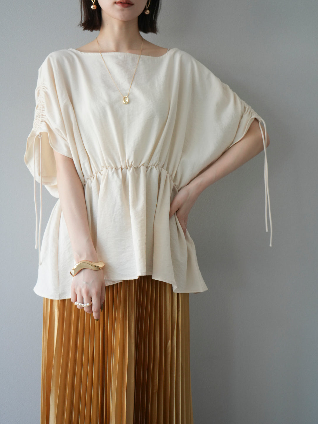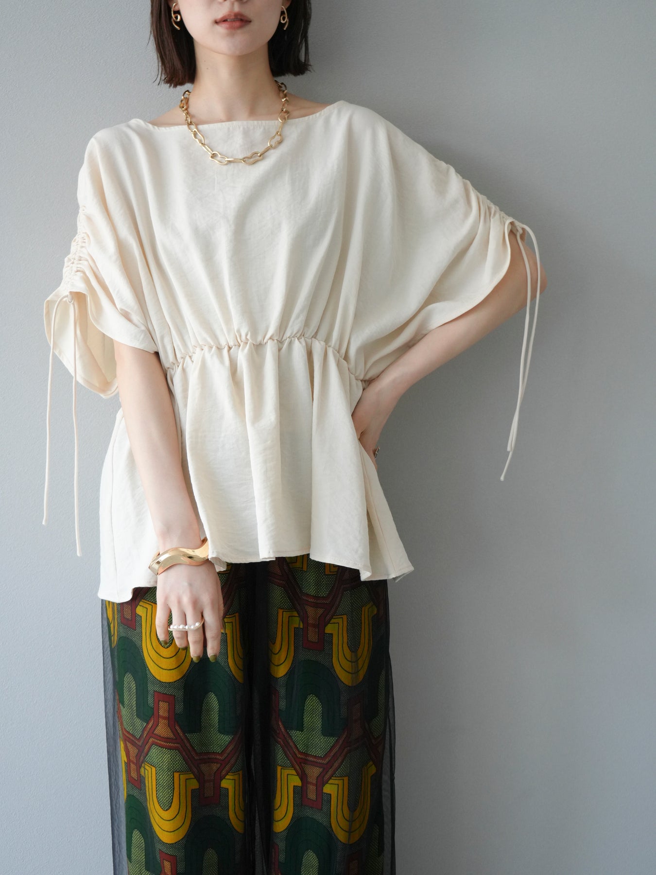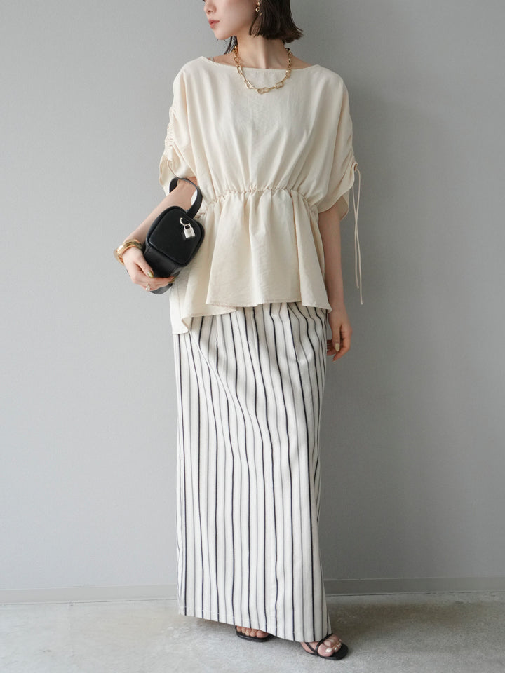 柔らかく落ち感のある素材に、ウエストと袖に施したシャーリングがアクセントになったデザインブラウス。ギャザーの寄せ具合でシルエットに動きを生み出し、ナチュラルながらも女性らしい印象に仕上がります。 腰まわりを自然にカバーするチュニック丈で、体のラインを拾いにくく、リラクシーな着心地も魅力。ボトムスを選ばず、デニムやワイドパンツ、柄物とのスタイリングにも映える一着です。 一枚で着映えが叶う、デイリーにもお出かけにも活躍するアイテムです。 ※ボトムス、キャミソール(インナー)以外の商品は一律でインナーは付属していません。