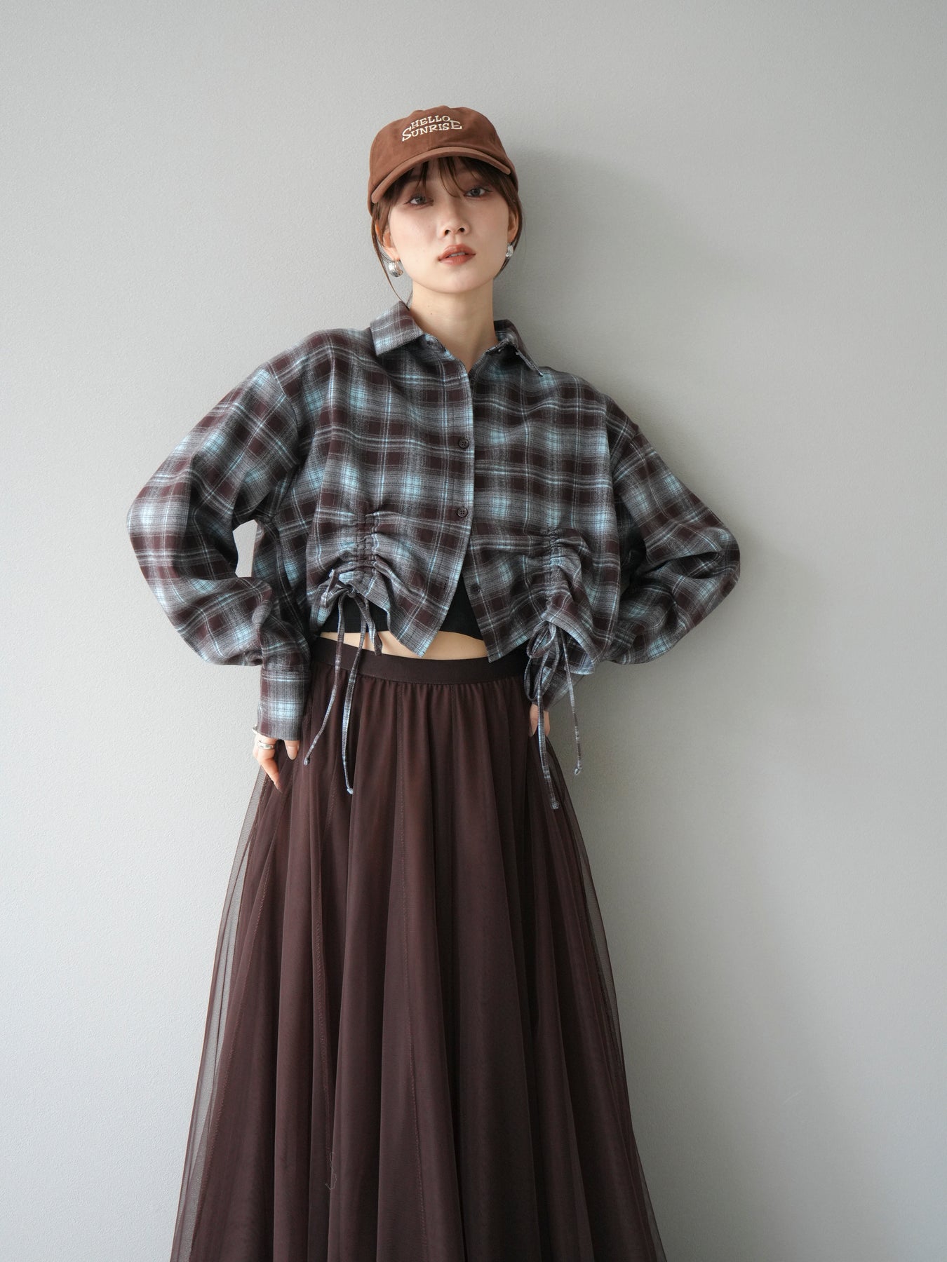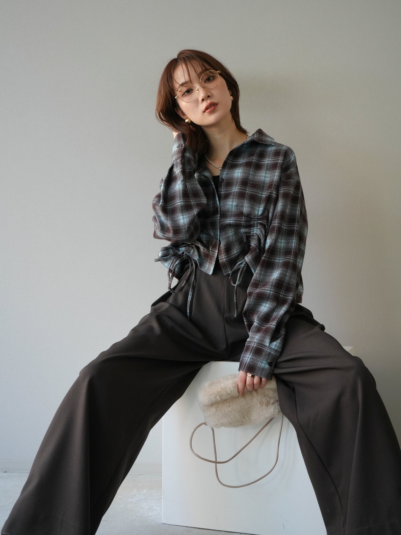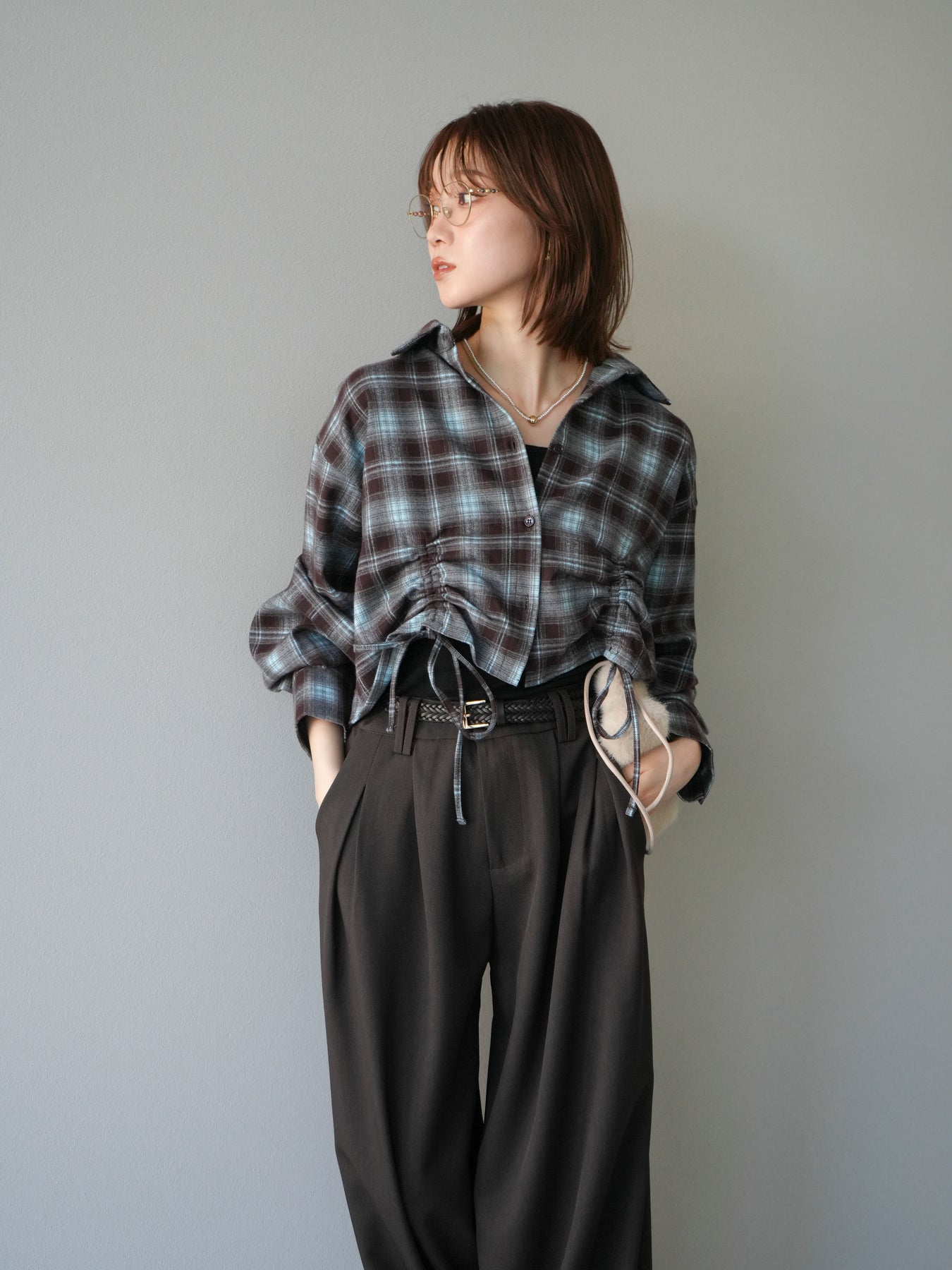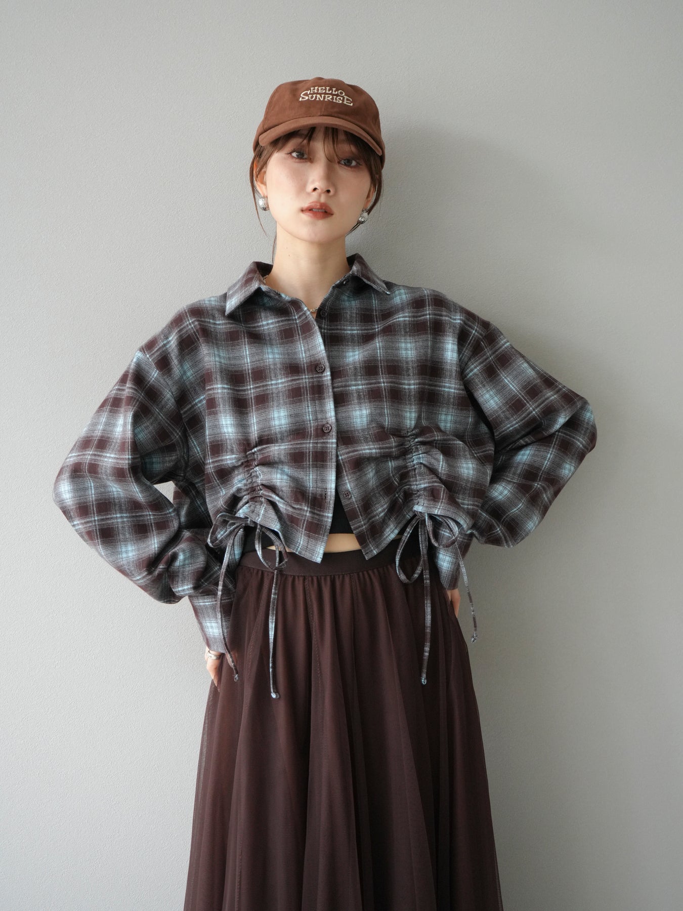 起毛感のあるネル素材で仕立てたチェックシャツ。クロップド丈に仕上げ、ウエスト部分にはドロストデザインを施すことでシルエットの変化を楽しめる一枚です。トレンド感のある短めの丈感は、ハイウエストボトムと好相性でスタイルアップ効果も抜群。カジュアルなチェック柄ながらも女性らしいバランスで着こなせる、デイリーに活躍するアイテムです。 ※ボトムス、キャミソール(インナー)以外の商品は一律でインナーは付属していません。
