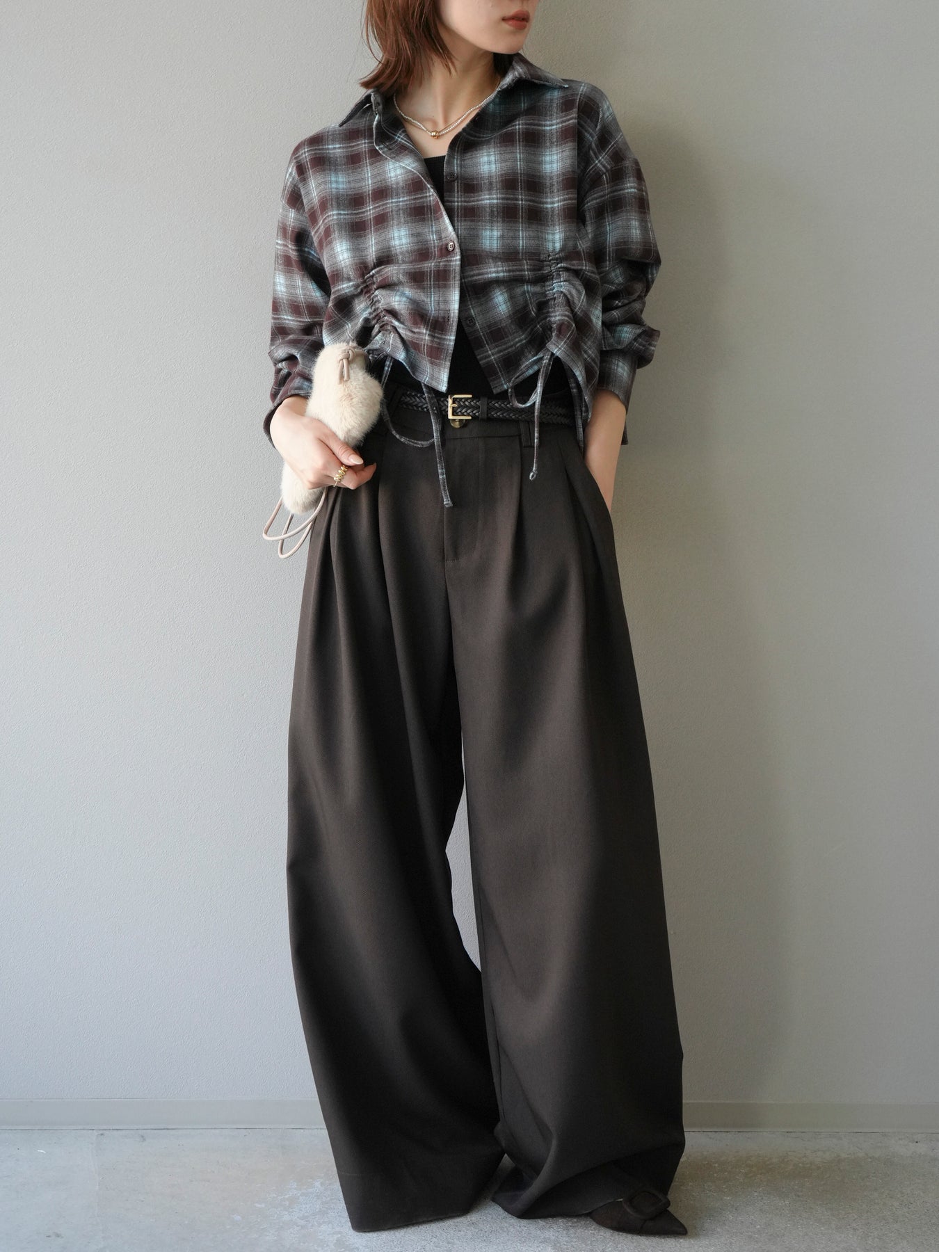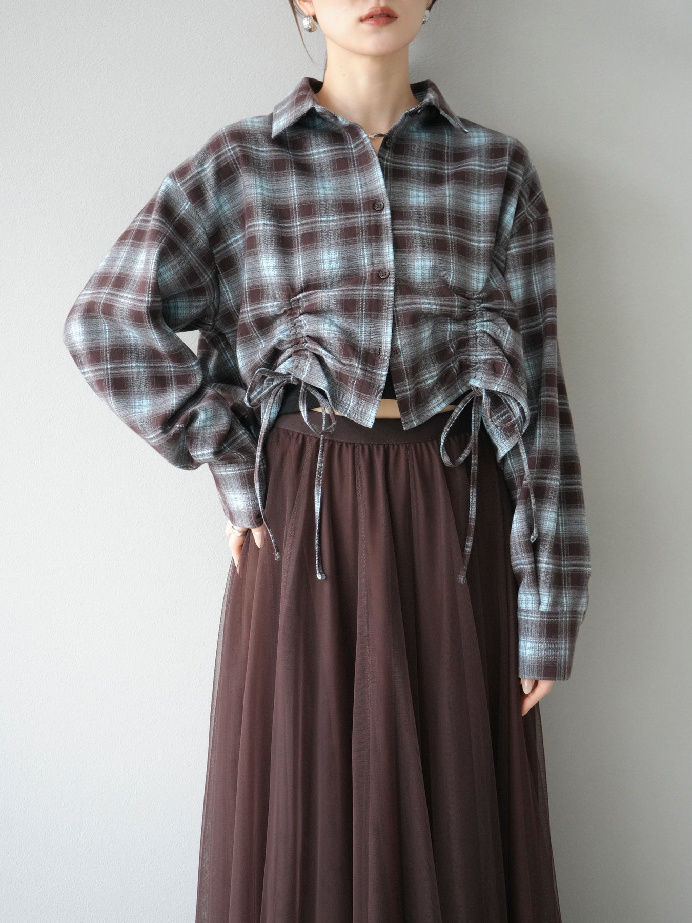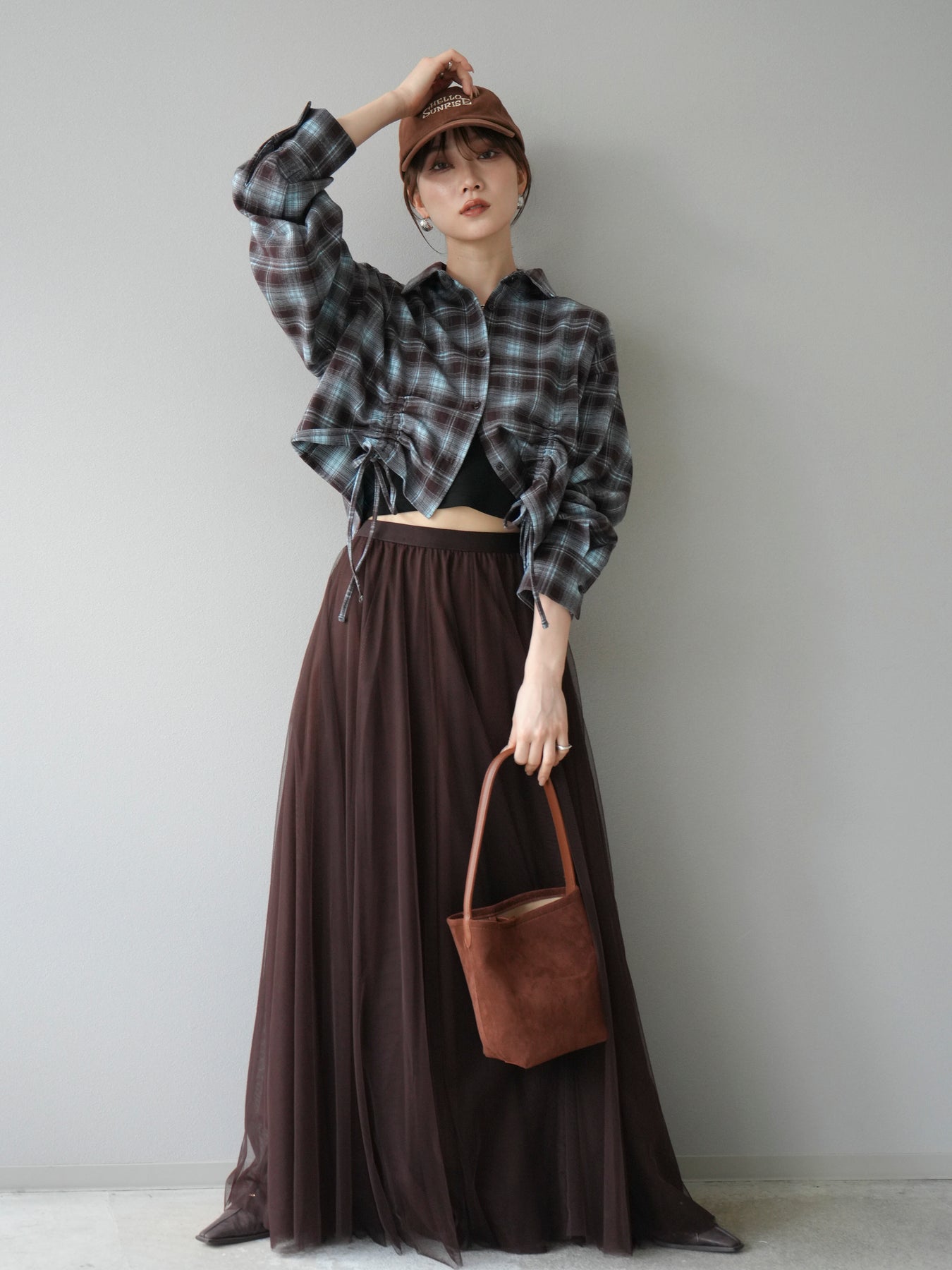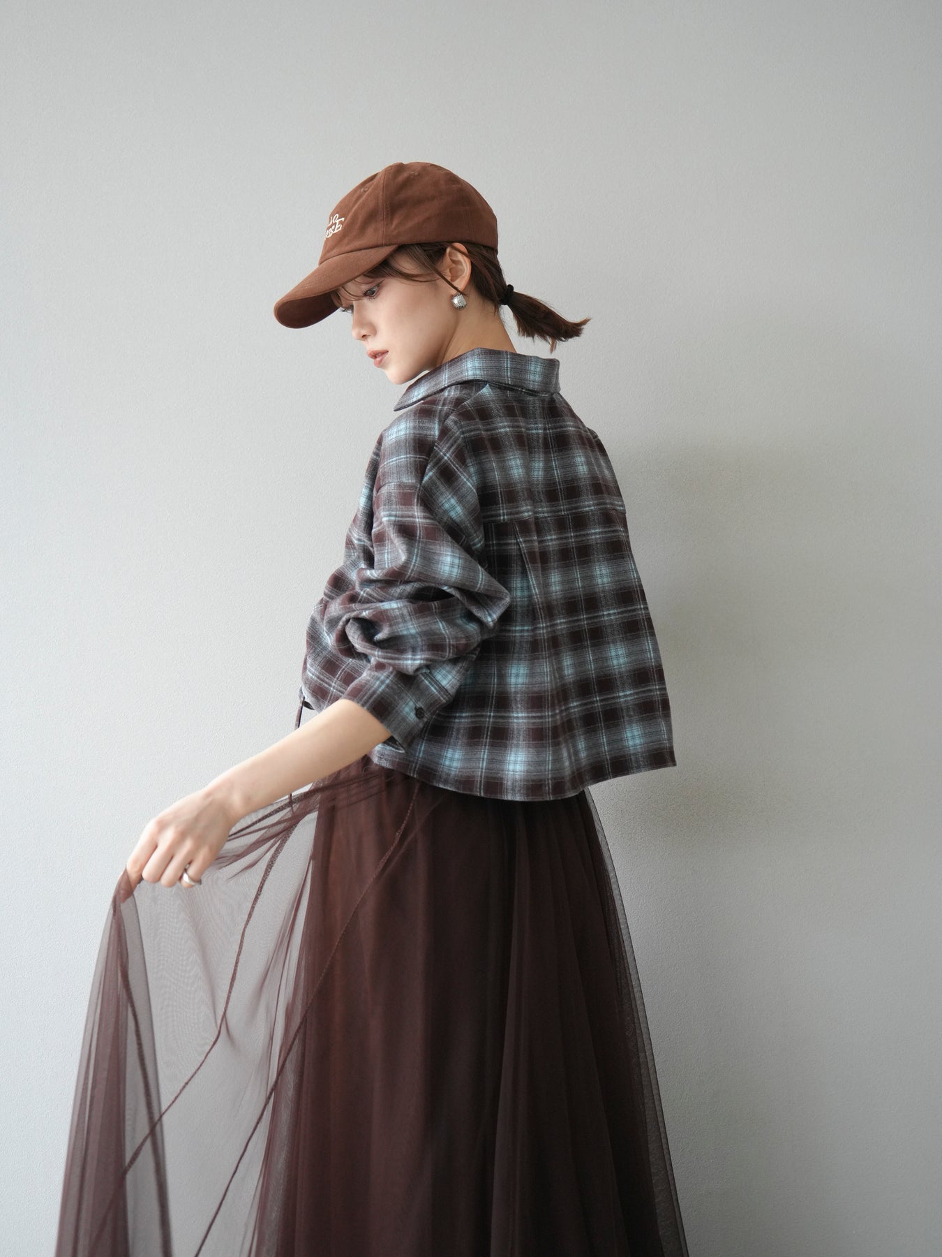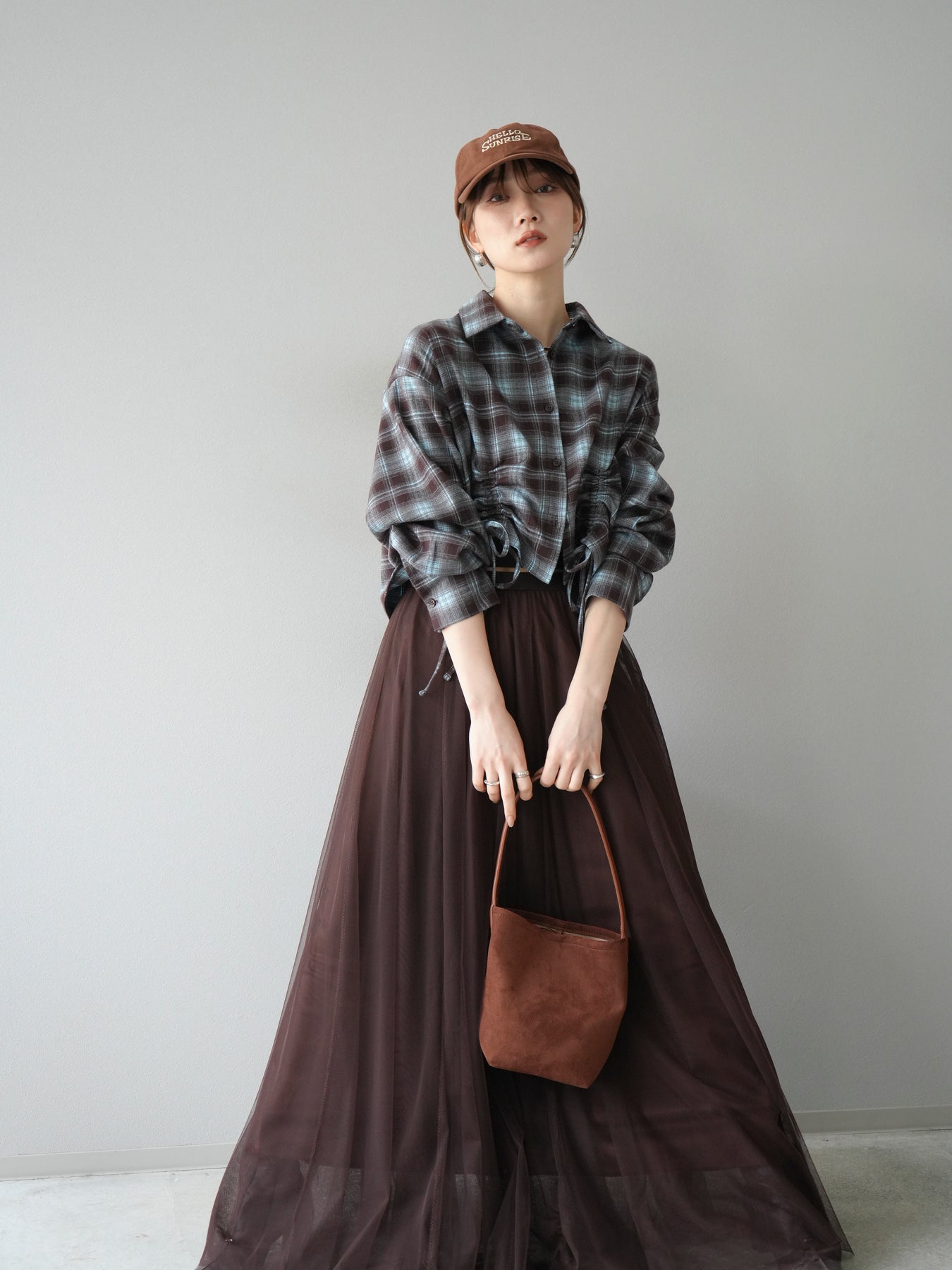 起毛感のあるネル素材で仕立てたチェックシャツ。クロップド丈に仕上げ、ウエスト部分にはドロストデザインを施すことでシルエットの変化を楽しめる一枚です。トレンド感のある短めの丈感は、ハイウエストボトムと好相性でスタイルアップ効果も抜群。カジュアルなチェック柄ながらも女性らしいバランスで着こなせる、デイリーに活躍するアイテムです。 ※ボトムス、キャミソール(インナー)以外の商品は一律でインナーは付属していません。
