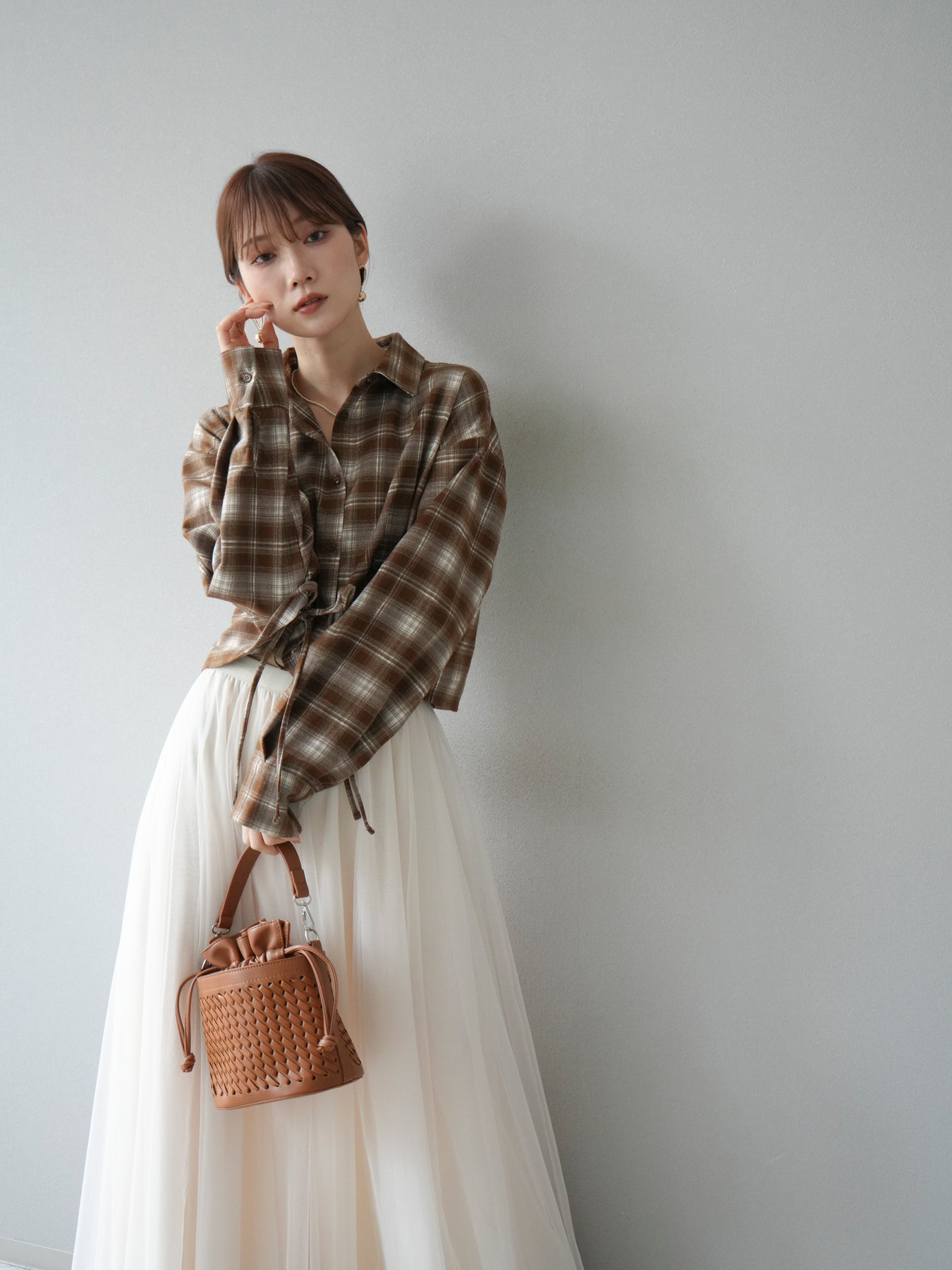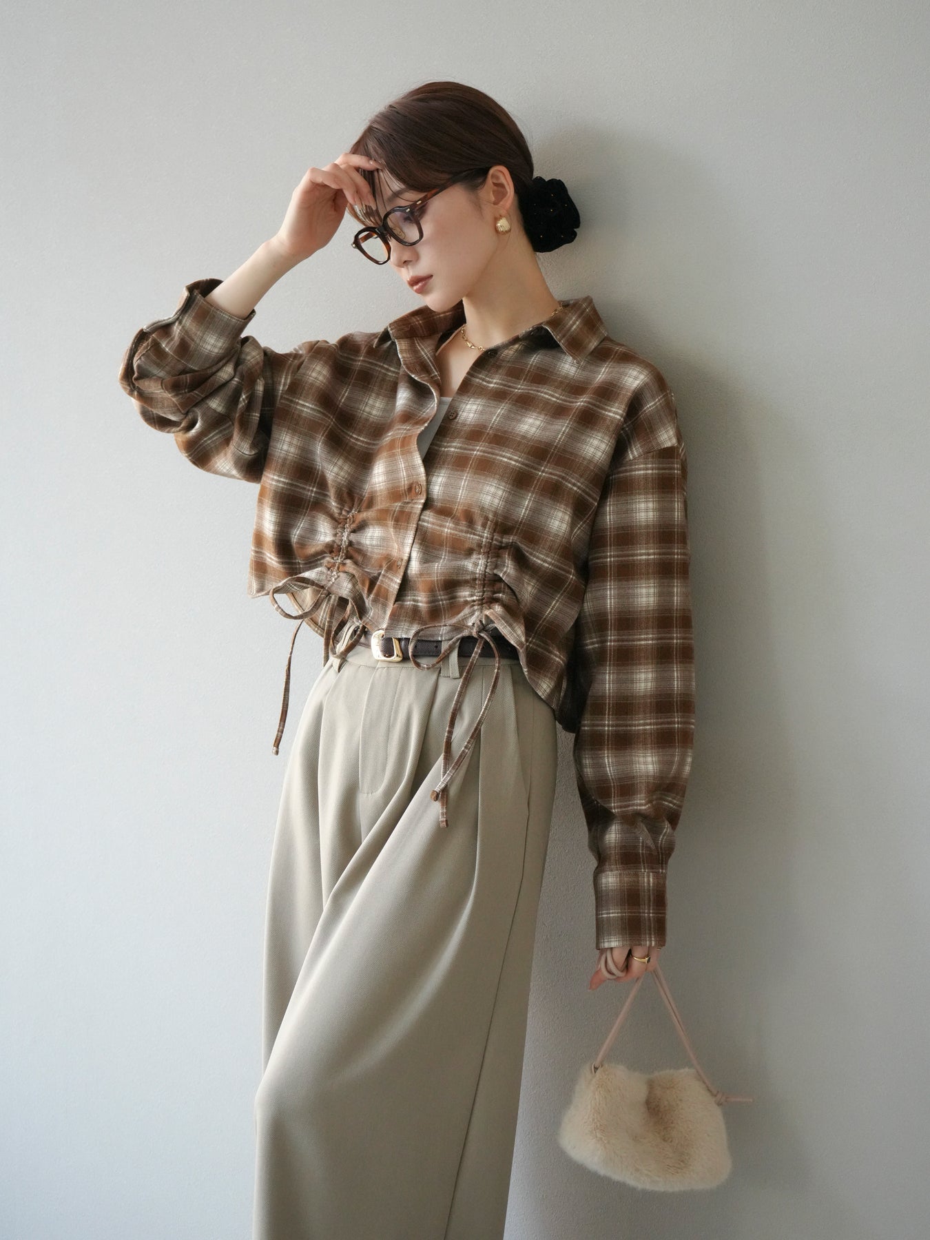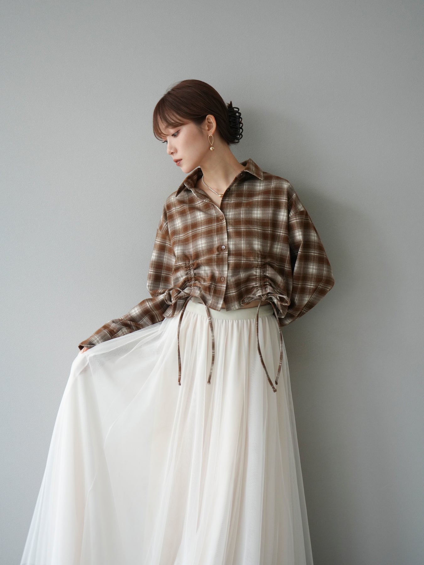 起毛感のあるネル素材で仕立てたチェックシャツ。クロップド丈に仕上げ、ウエスト部分にはドロストデザインを施すことでシルエットの変化を楽しめる一枚です。トレンド感のある短めの丈感は、ハイウエストボトムと好相性でスタイルアップ効果も抜群。カジュアルなチェック柄ながらも女性らしいバランスで着こなせる、デイリーに活躍するアイテムです。 ※ボトムス、キャミソール(インナー)以外の商品は一律でインナーは付属していません。