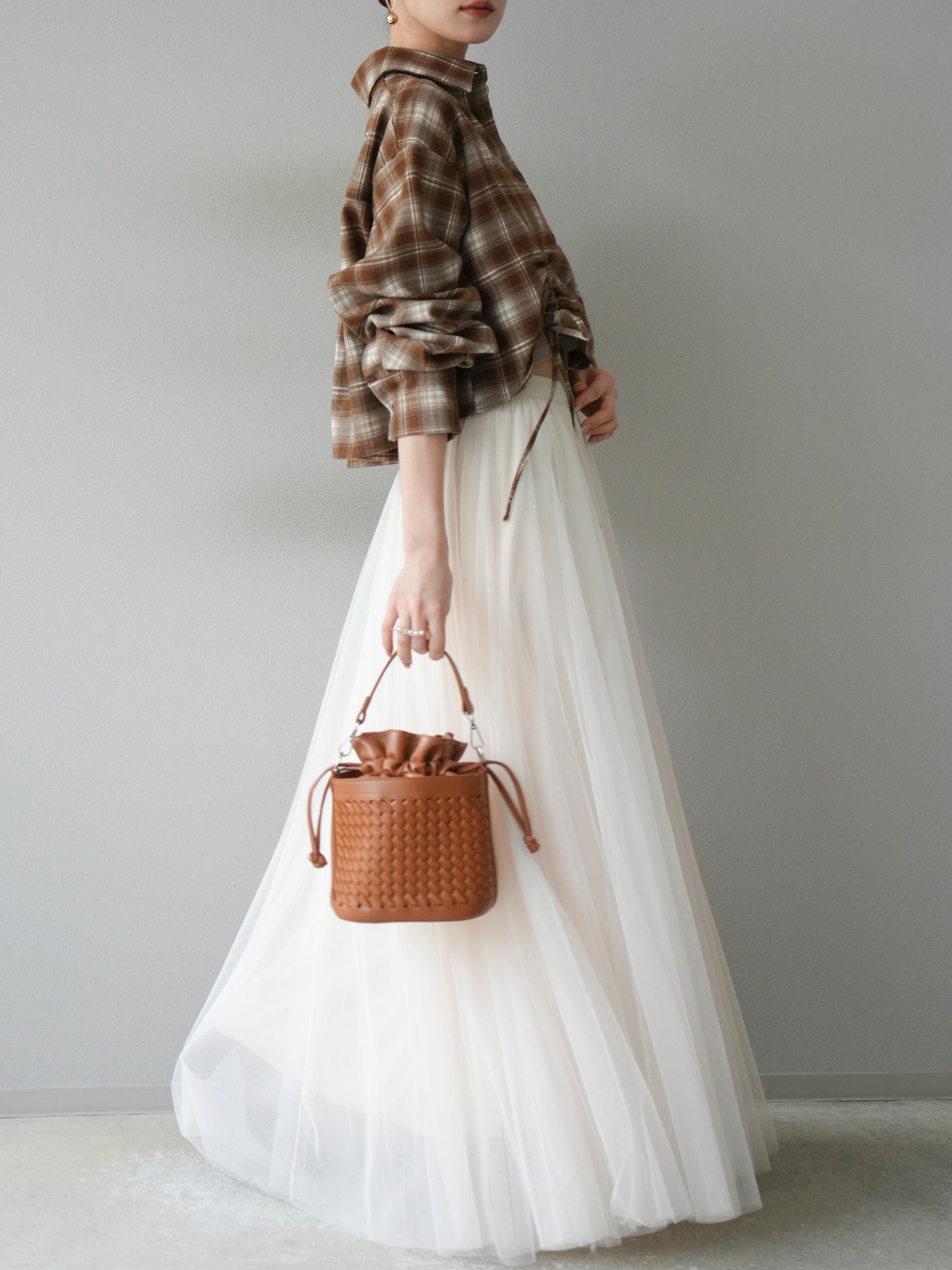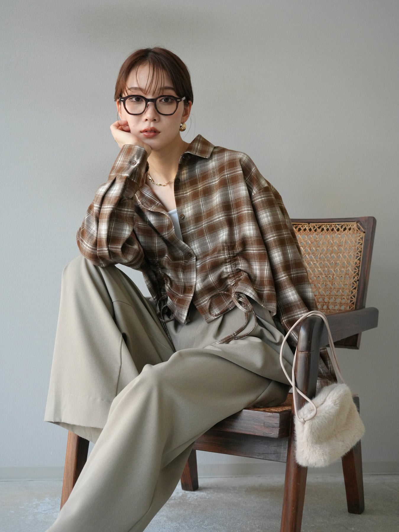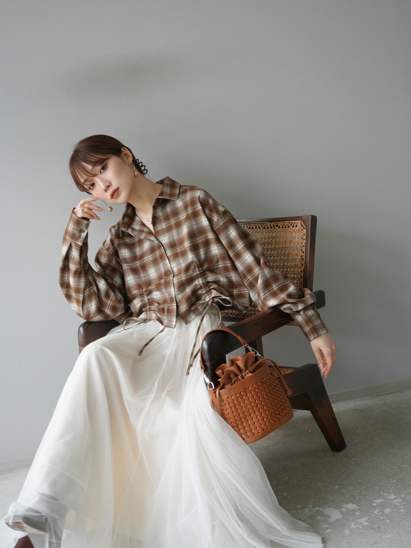 起毛感のあるネル素材で仕立てたチェックシャツ。クロップド丈に仕上げ、ウエスト部分にはドロストデザインを施すことでシルエットの変化を楽しめる一枚です。トレンド感のある短めの丈感は、ハイウエストボトムと好相性でスタイルアップ効果も抜群。カジュアルなチェック柄ながらも女性らしいバランスで着こなせる、デイリーに活躍するアイテムです。 ※ボトムス、キャミソール(インナー)以外の商品は一律でインナーは付属していません。