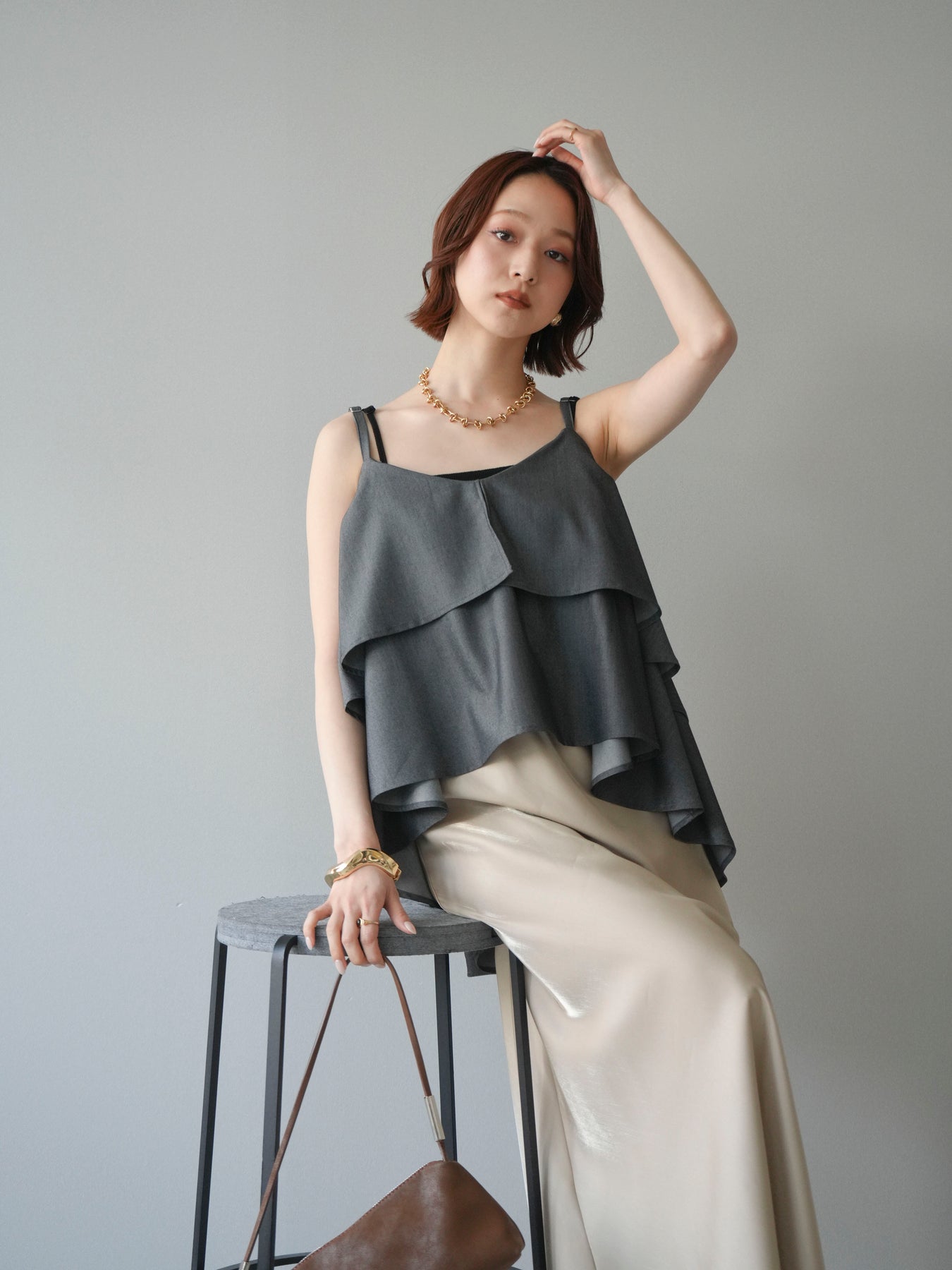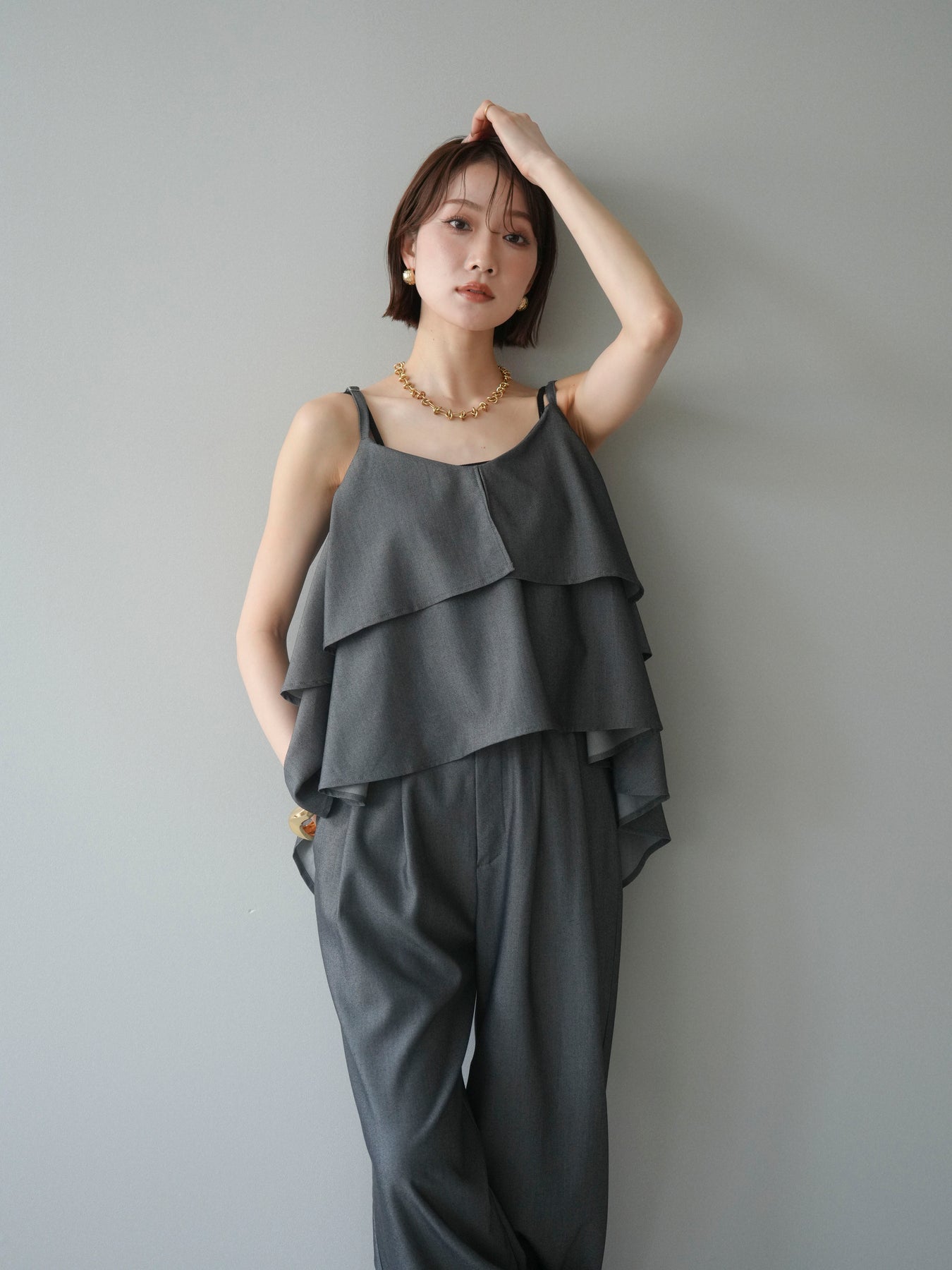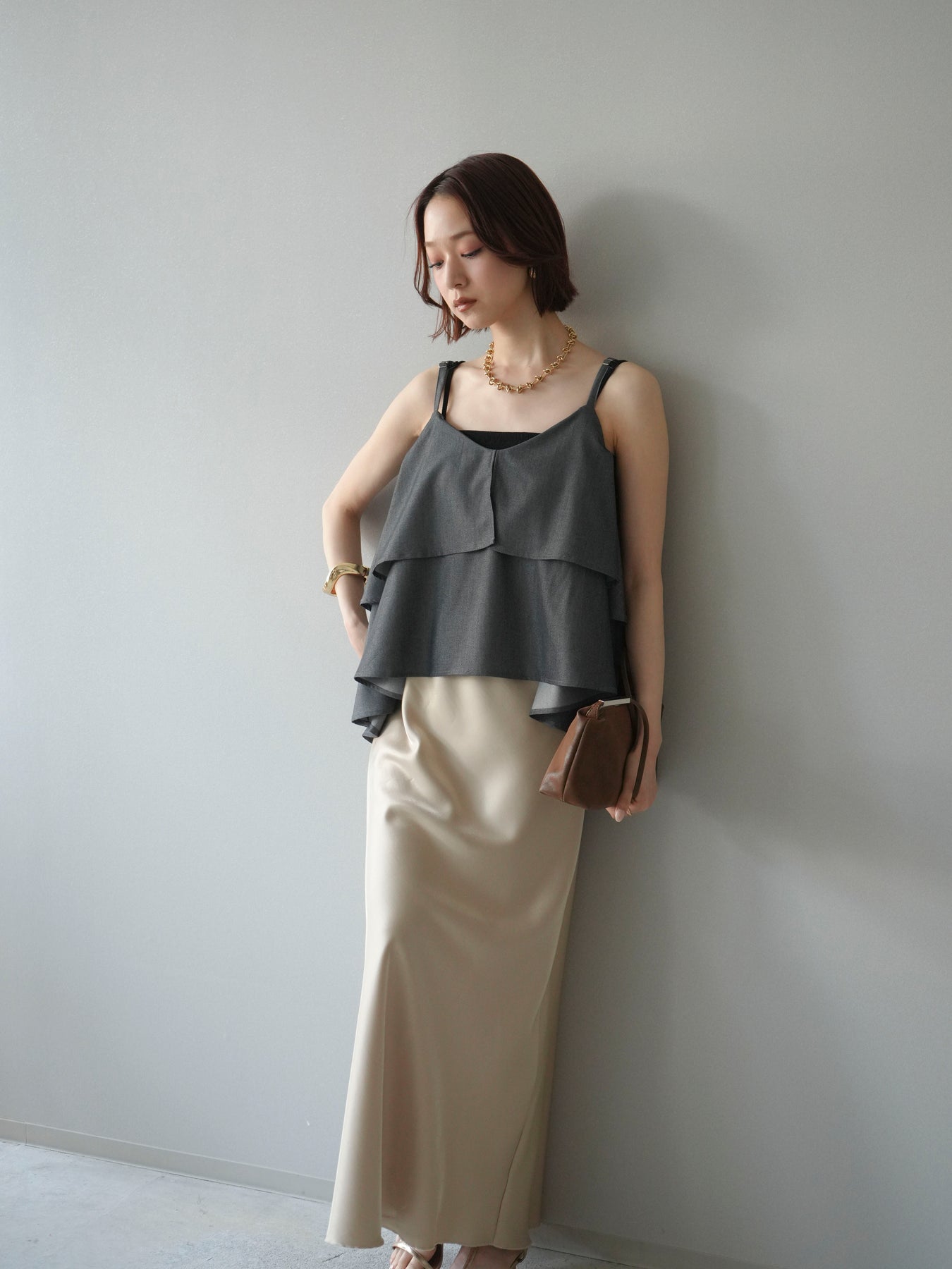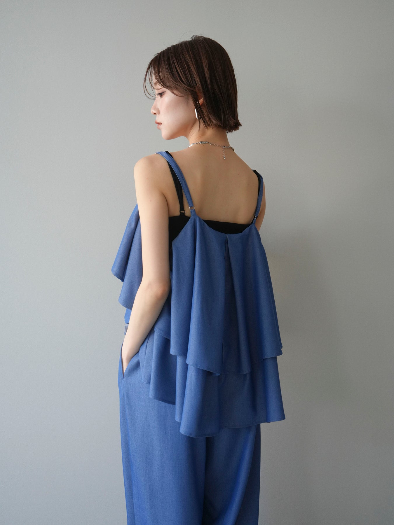 軽やかに重なるティアードデザインが印象的なキャミソール。動きに合わせてふんわりと揺れるシルエットが、女性らしい柔らかさと華やかさを演出します。程よく広がるフレアラインが身体のラインを拾いにくく、リラックス感のある着心地も魅力。華奢なストラップが抜け感をプラスし、レイヤードスタイルにも取り入れやすいデザインに仕上がっています。シンプルなボトムスと合わせるだけでコーディネートに立体感が生まれ、デイリーからきれいめなシーンまで幅広く活躍する一着です。 ※ボトムス、キャミソール(インナー)以外の商品は一律でインナーは付属していません。