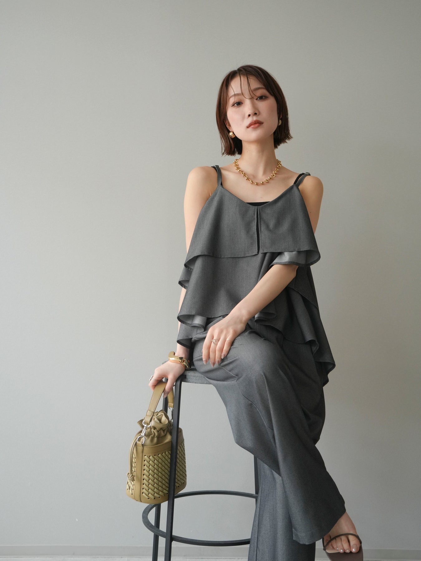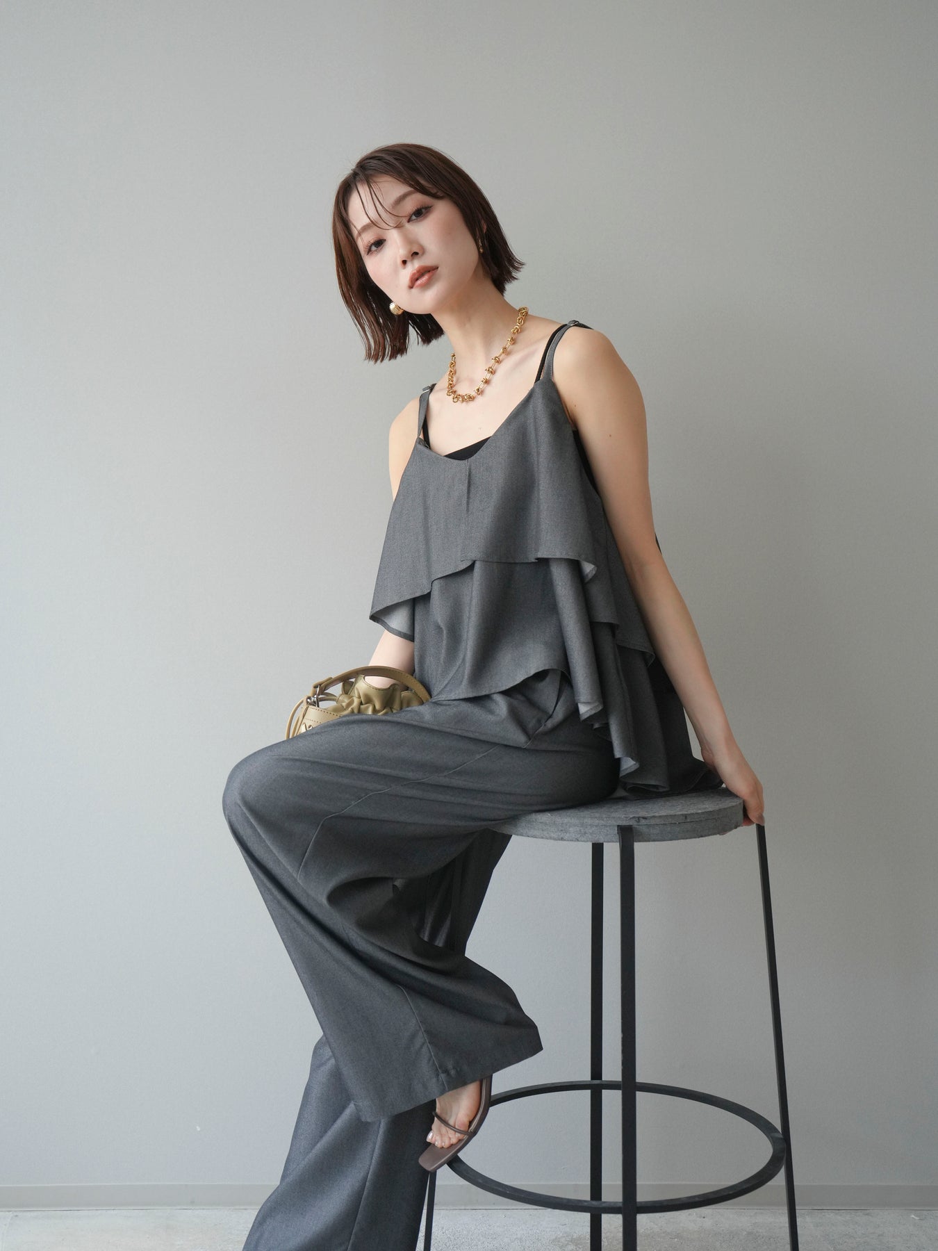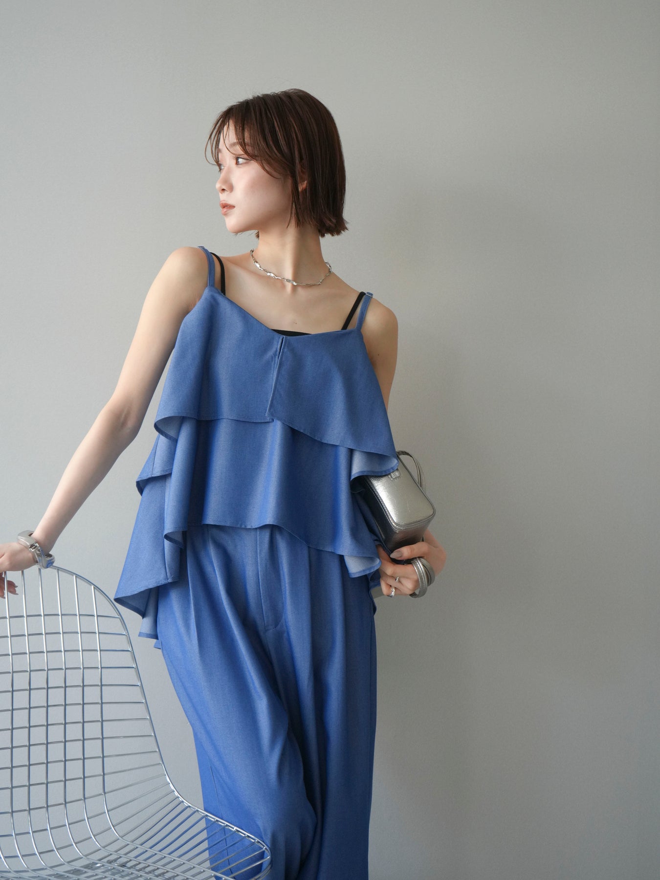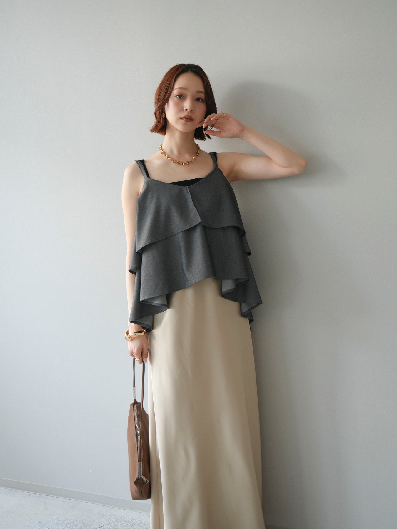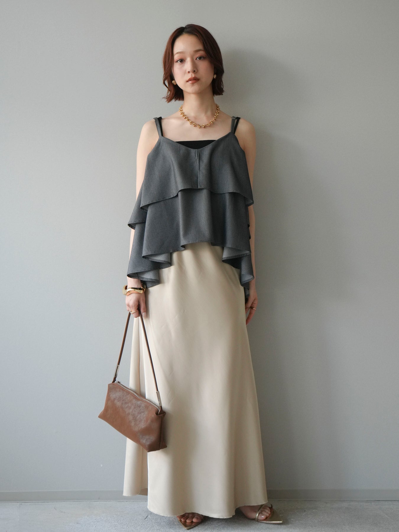 軽やかに重なるティアードデザインが印象的なキャミソール。動きに合わせてふんわりと揺れるシルエットが、女性らしい柔らかさと華やかさを演出します。程よく広がるフレアラインが身体のラインを拾いにくく、リラックス感のある着心地も魅力。華奢なストラップが抜け感をプラスし、レイヤードスタイルにも取り入れやすいデザインに仕上がっています。シンプルなボトムスと合わせるだけでコーディネートに立体感が生まれ、デイリーからきれいめなシーンまで幅広く活躍する一着です。 ※ボトムス、キャミソール(インナー)以外の商品は一律でインナーは付属していません。