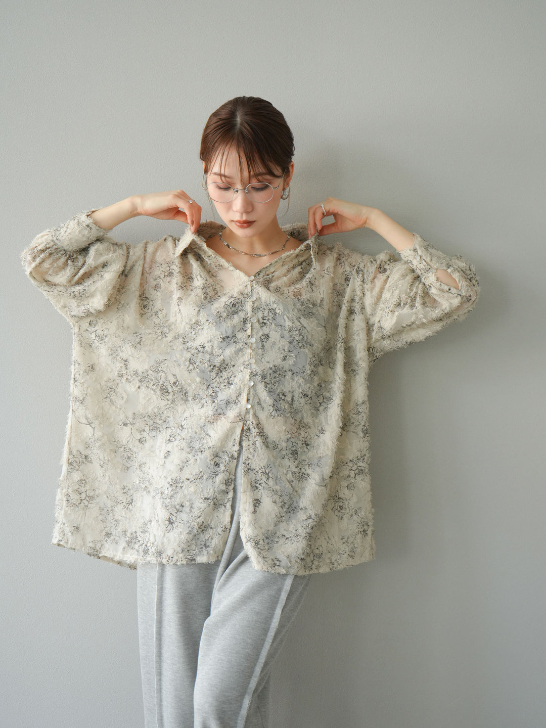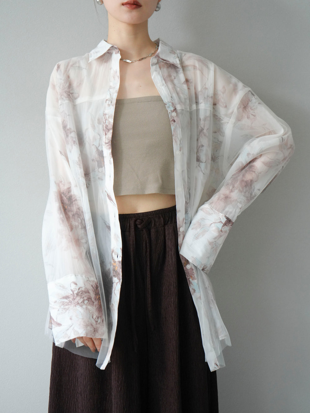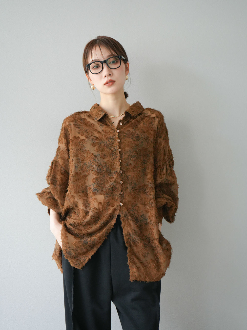[予約]チュールドッキングフラワー柄オーバーサイズシャツ/ブラウン