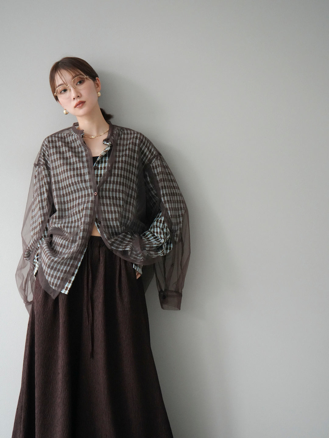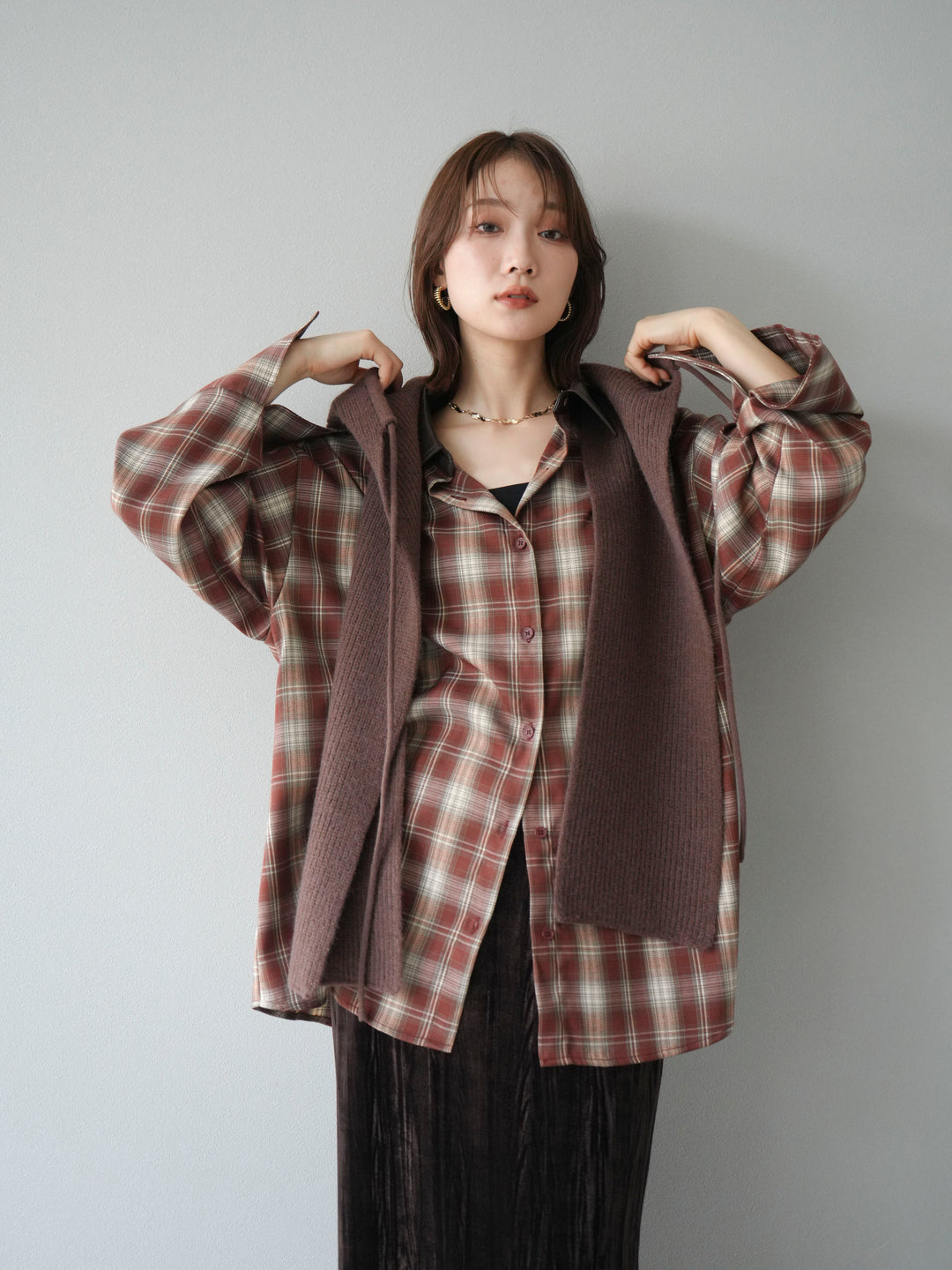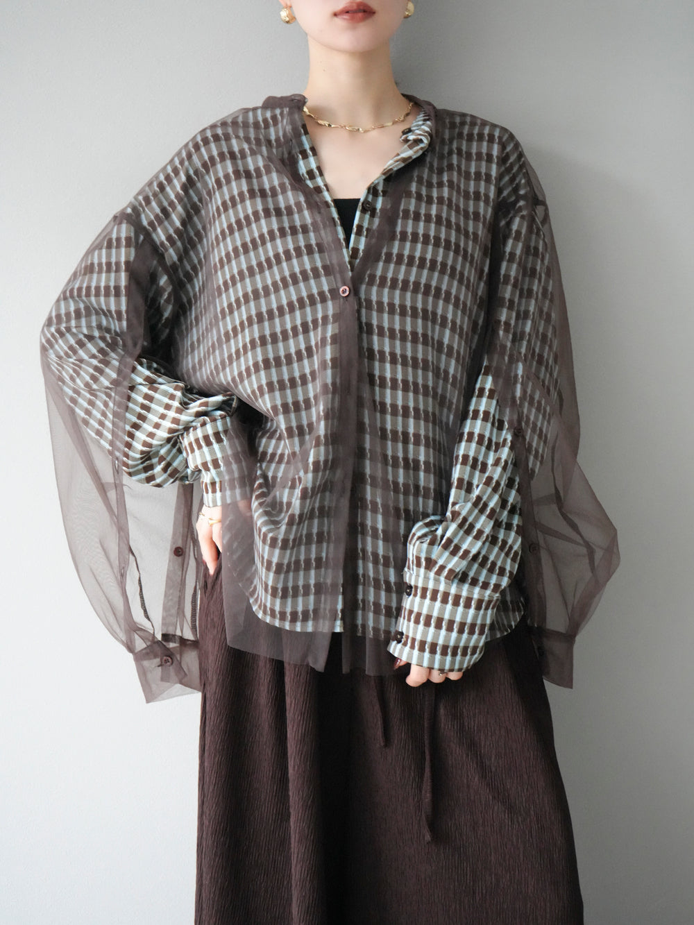 [予約]チュールドッキングチェック柄オーバーサイズシャツ/ブラウン