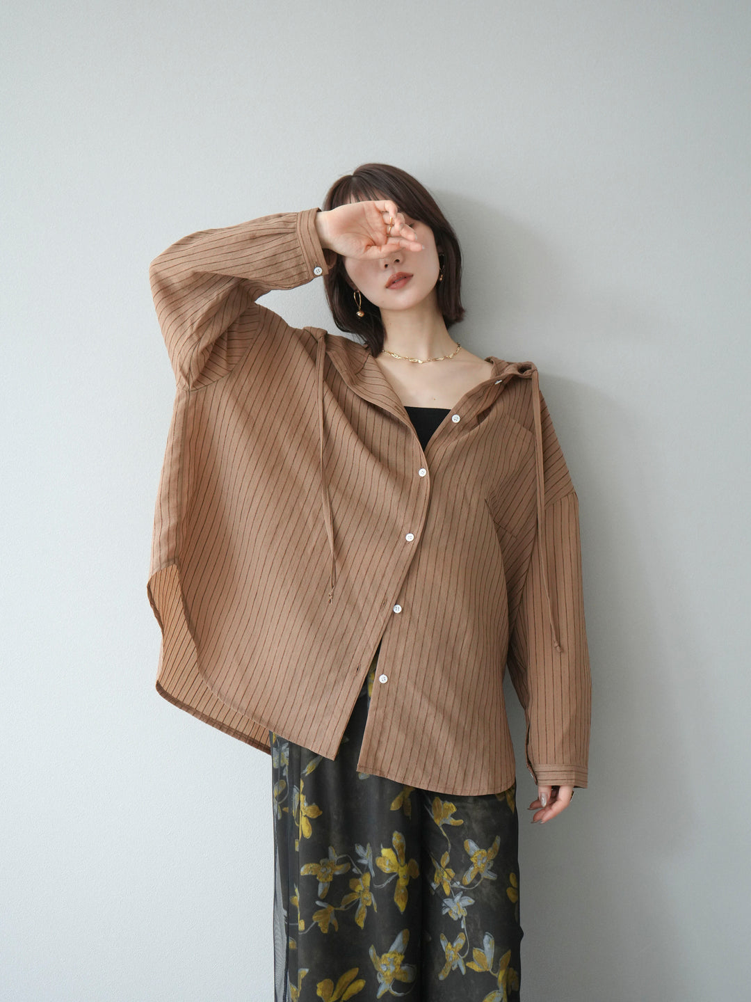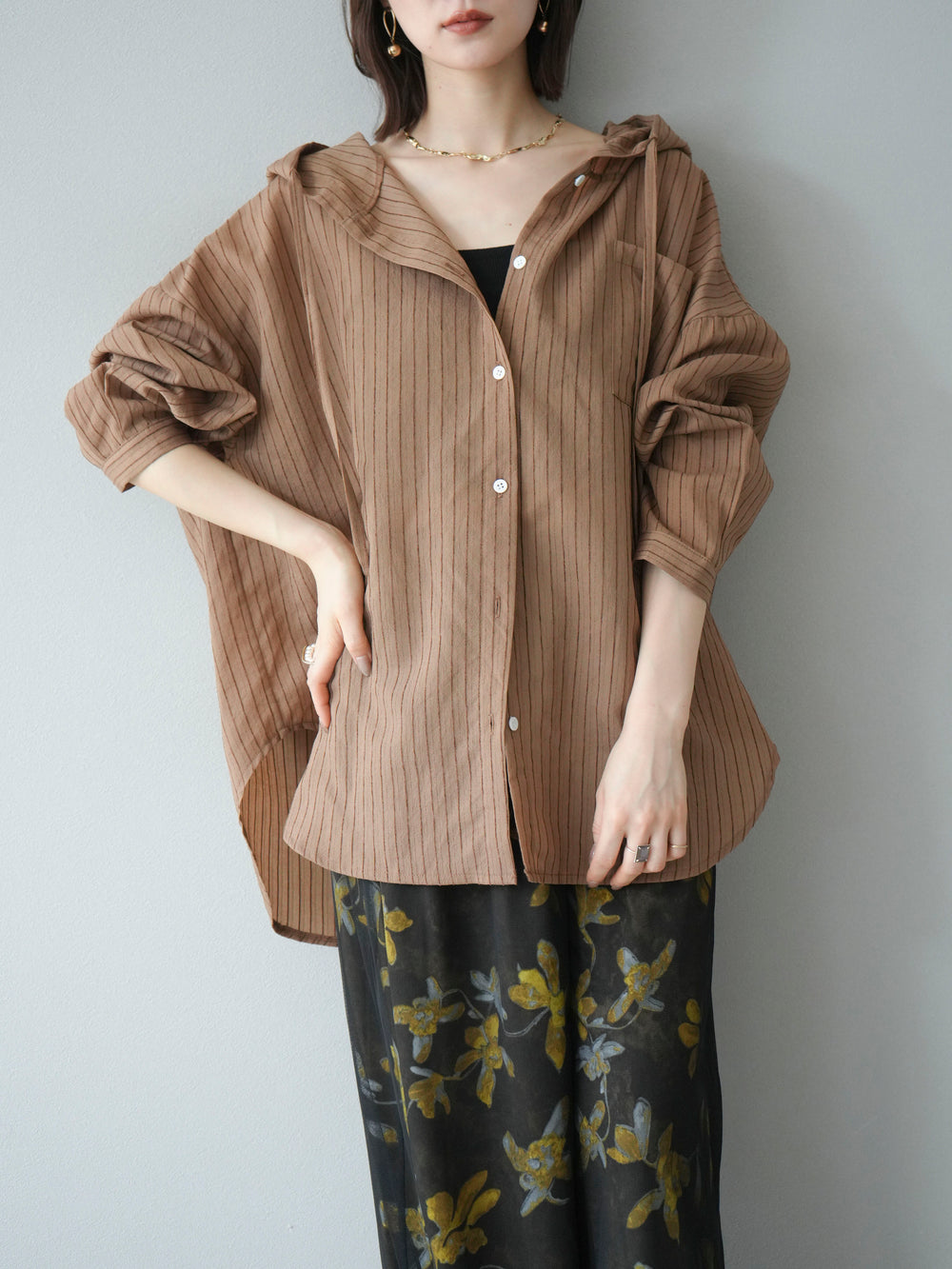 [予約]ワッシャーストライプフーディーシャツ/ブラウン