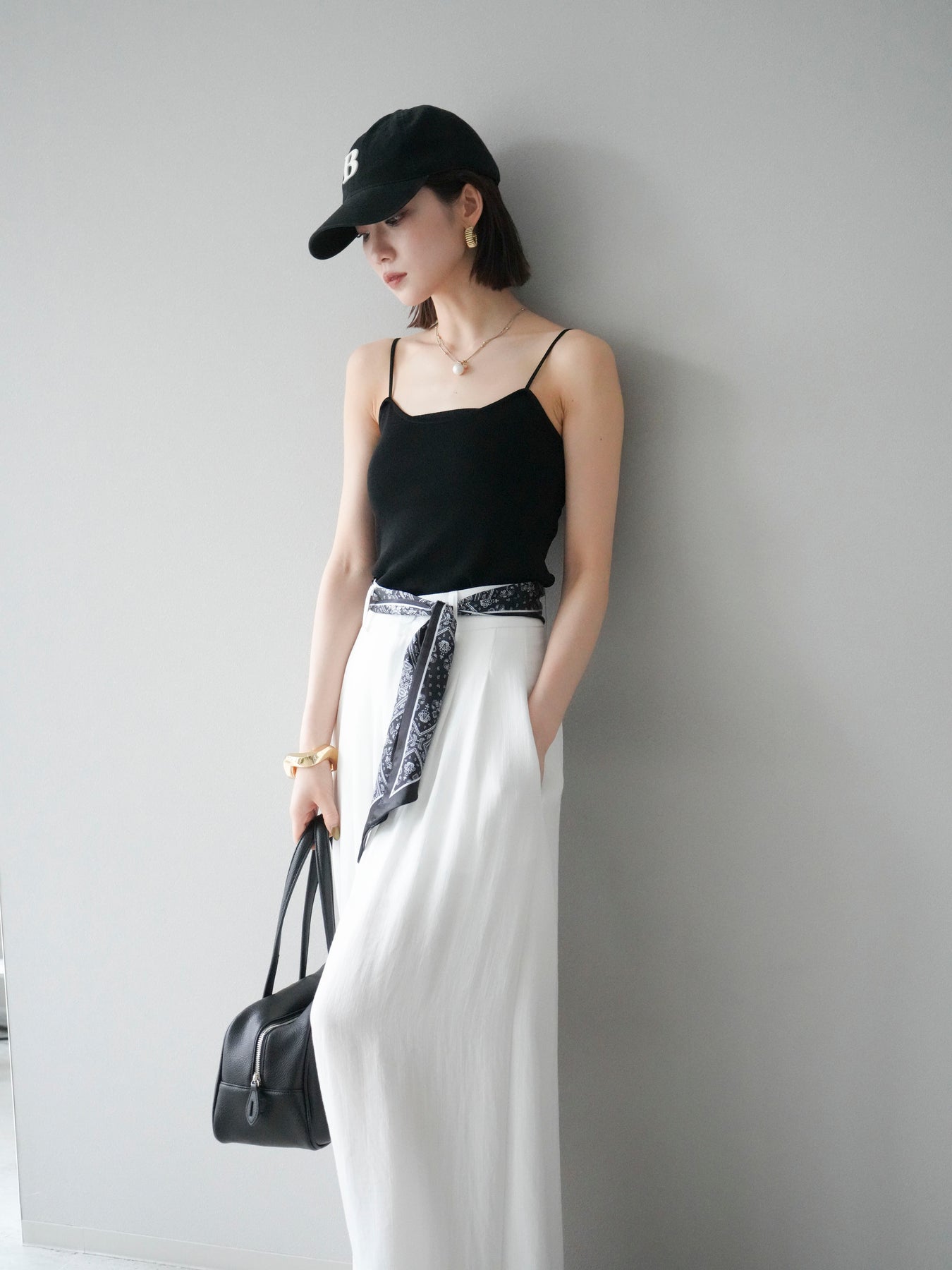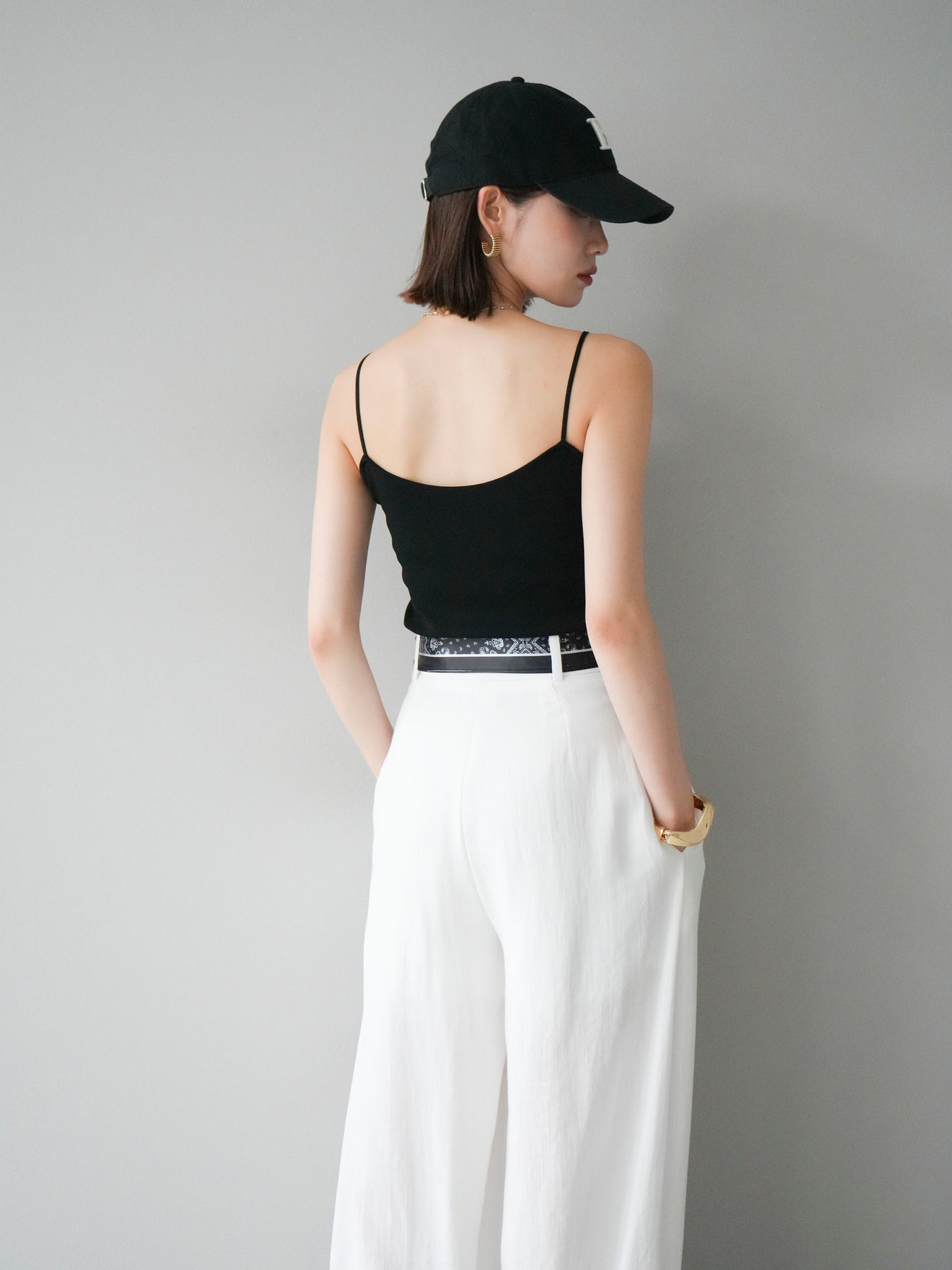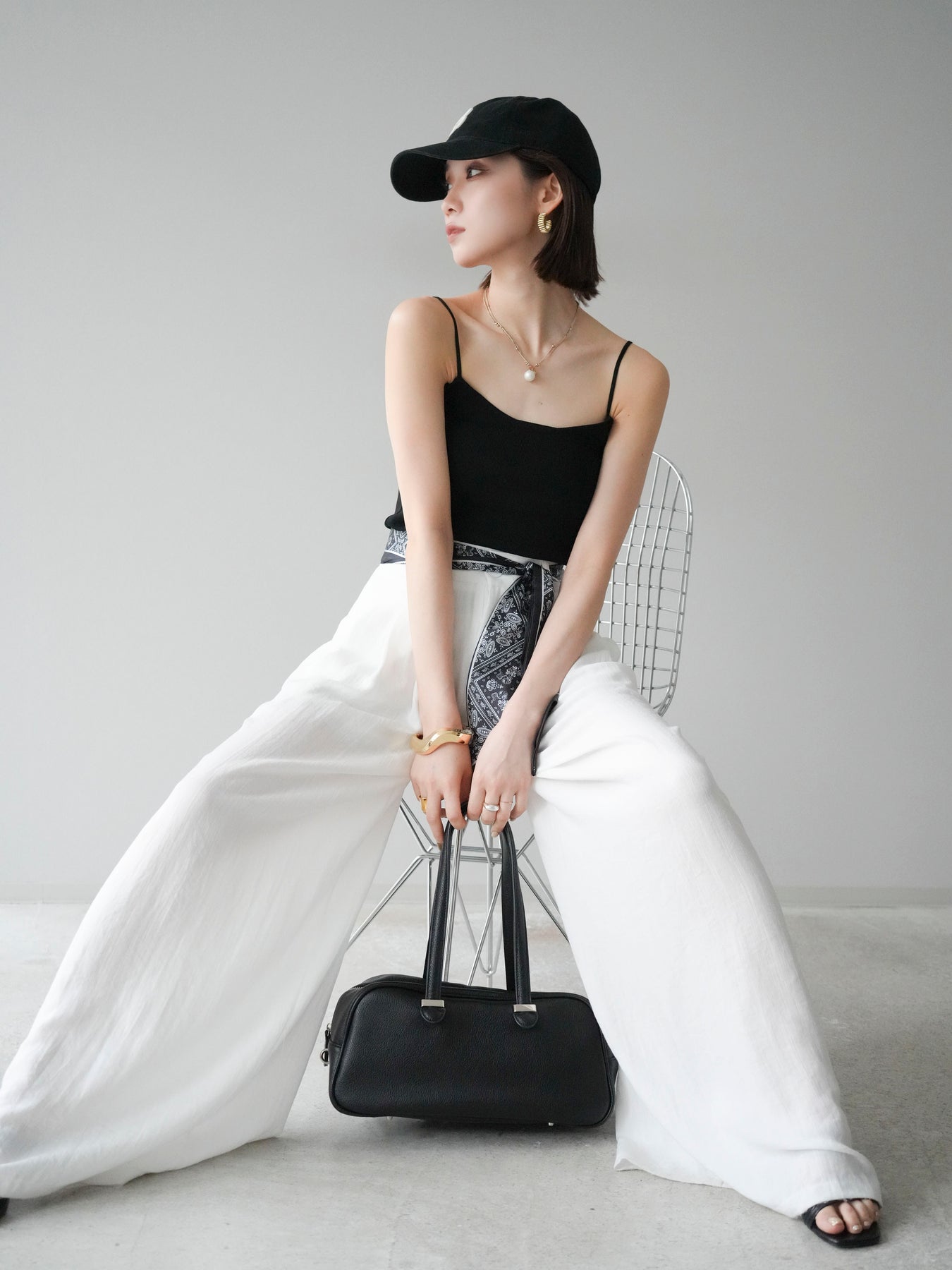 柔らかく滑らかな肌触りが魅力のレーヨン混ニット素材を使用した、シンプルながらも品のあるキャミソール。程よいフィット感と広めのネックラインで、インナーとしても一枚着としても活躍する万能アイテムです。 華奢なストラップが女性らしい印象を与え、シャツやジャケットのインナー使いはもちろん、カーディガンの下に重ねるスタイルにも最適。伸縮性にも優れ、快適な着心地をキープします。 ベーシックだからこそ、1枚あると重宝するワードローブの定番です。 ※ボトムス、キャミソール(インナー)以外の商品は一律でインナーは付属していません。