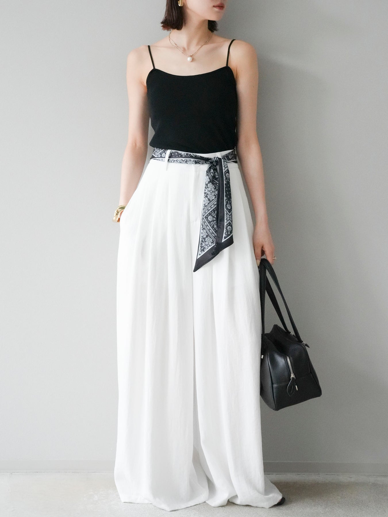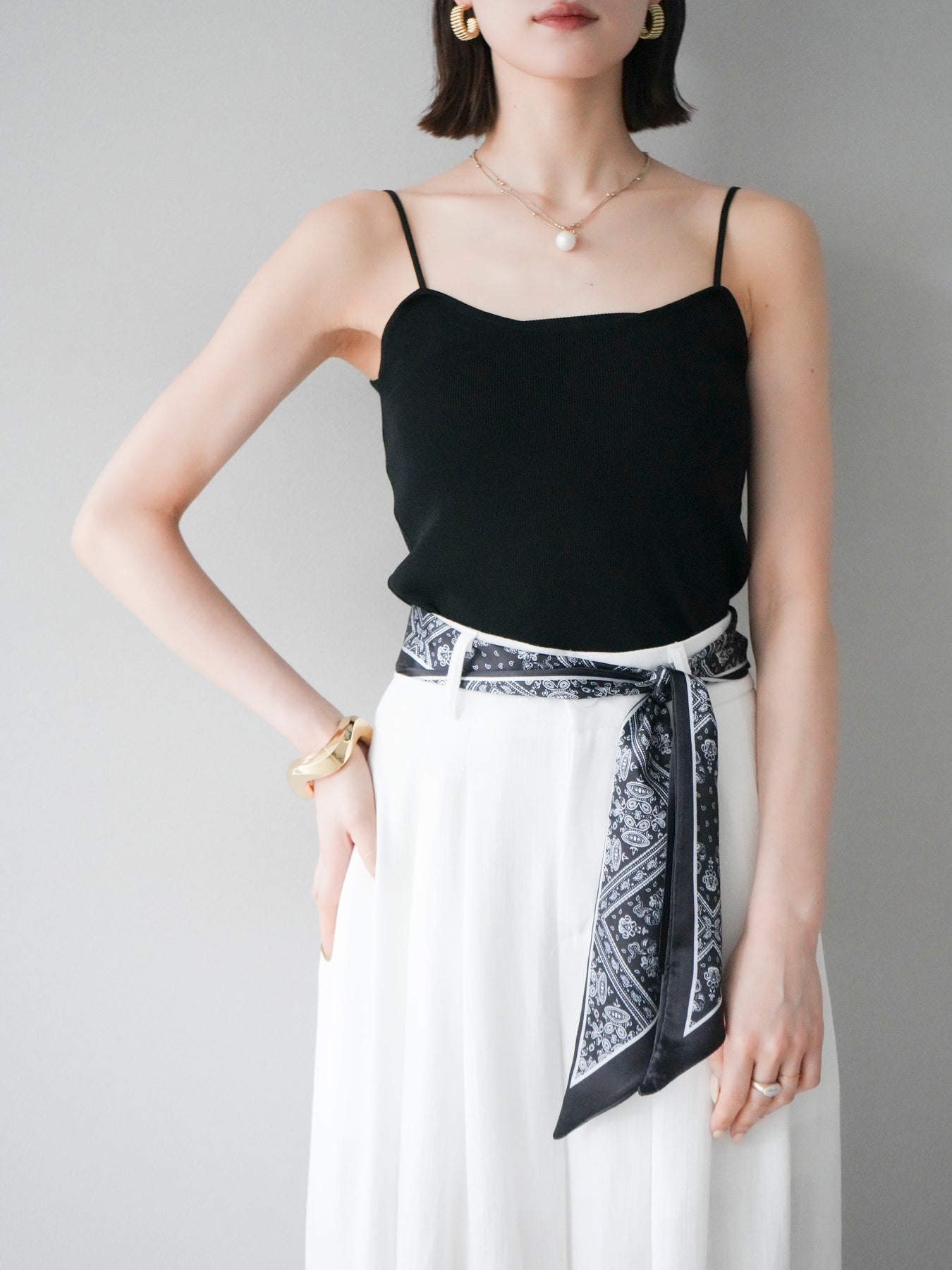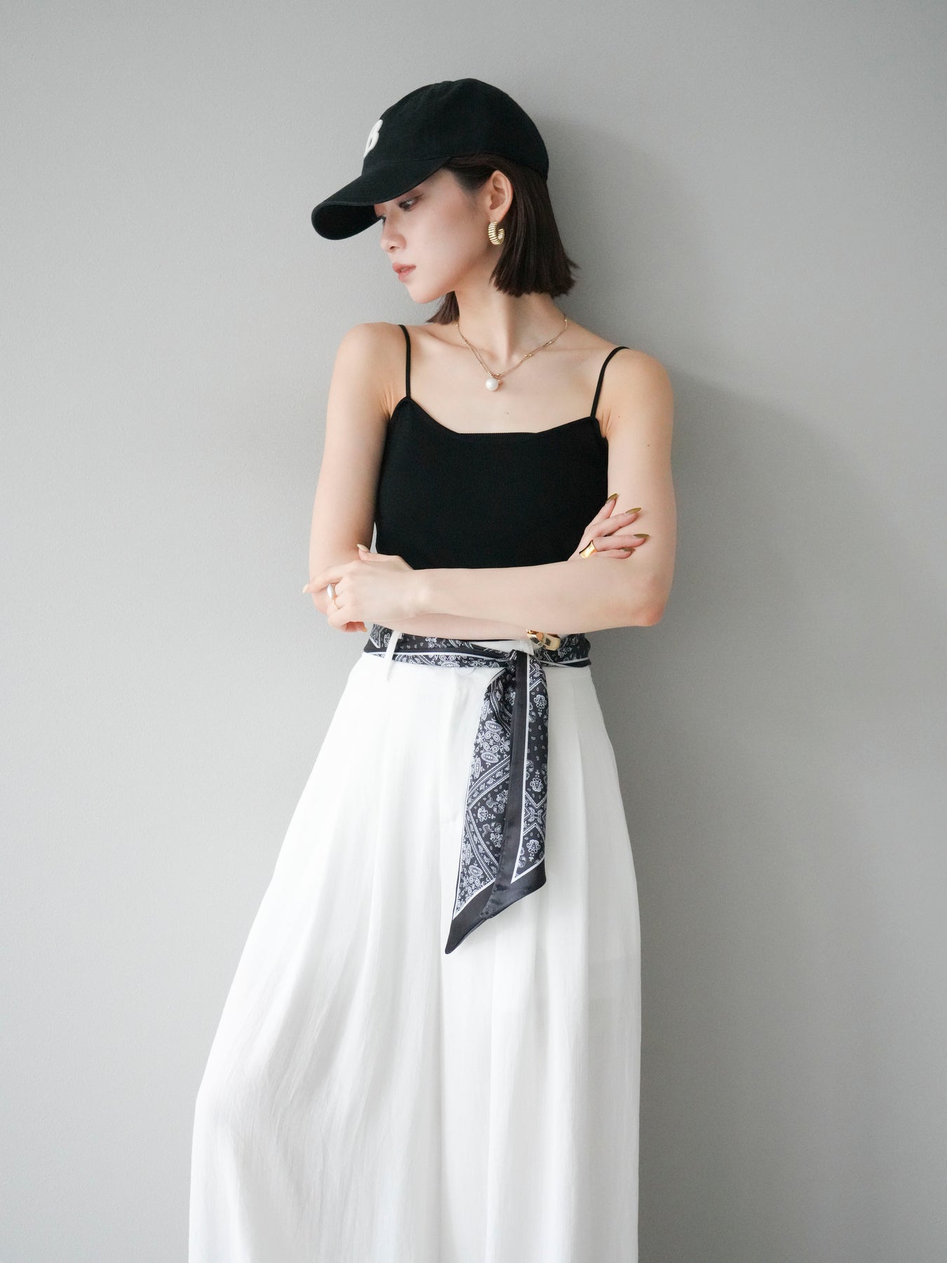 柔らかく滑らかな肌触りが魅力のレーヨン混ニット素材を使用した、シンプルながらも品のあるキャミソール。程よいフィット感と広めのネックラインで、インナーとしても一枚着としても活躍する万能アイテムです。 華奢なストラップが女性らしい印象を与え、シャツやジャケットのインナー使いはもちろん、カーディガンの下に重ねるスタイルにも最適。伸縮性にも優れ、快適な着心地をキープします。 ベーシックだからこそ、1枚あると重宝するワードローブの定番です。 ※ボトムス、キャミソール(インナー)以外の商品は一律でインナーは付属していません。