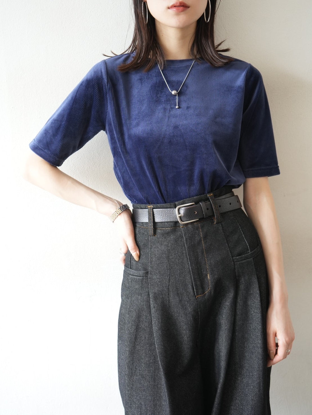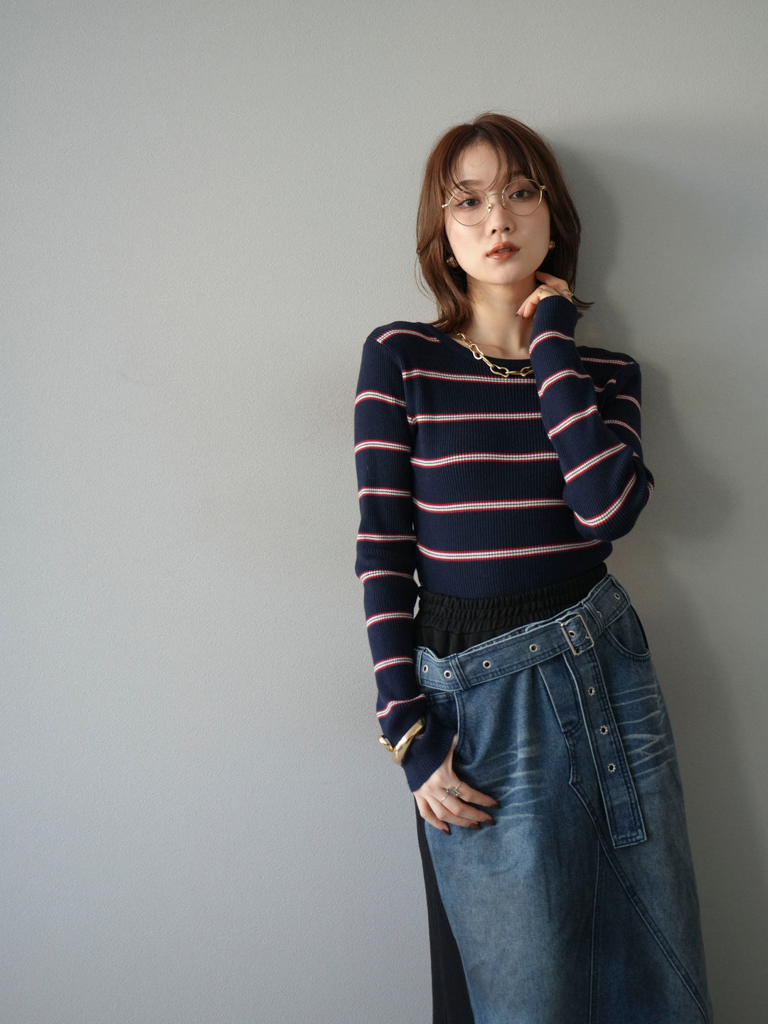 [予約]バックオープンボーダーテレコリブトップス/ネイビー