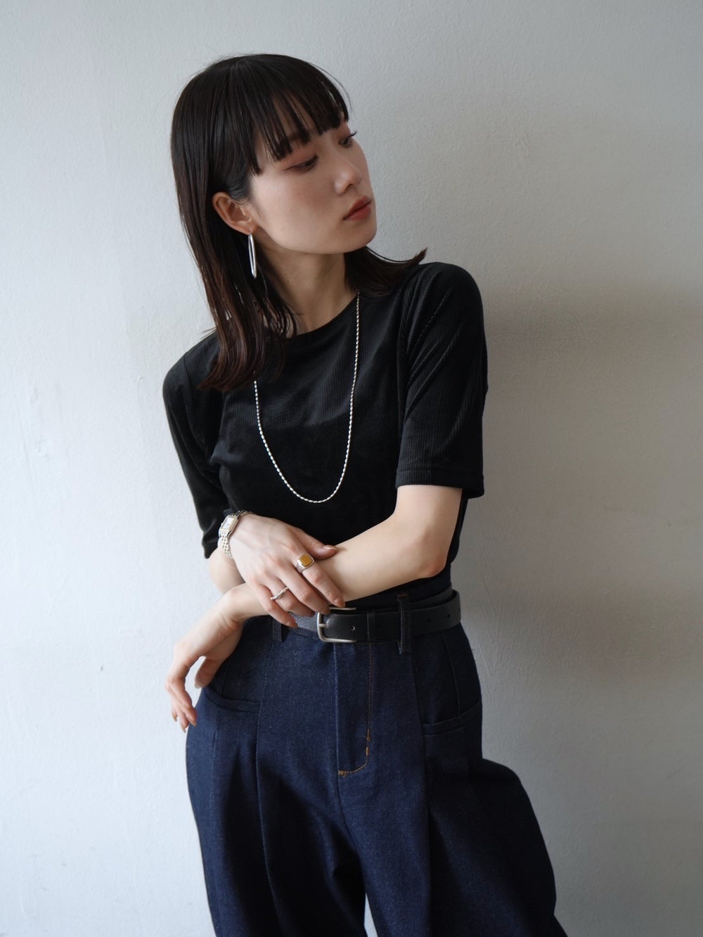 [予約]レザー切替プチネックシアートップス/black