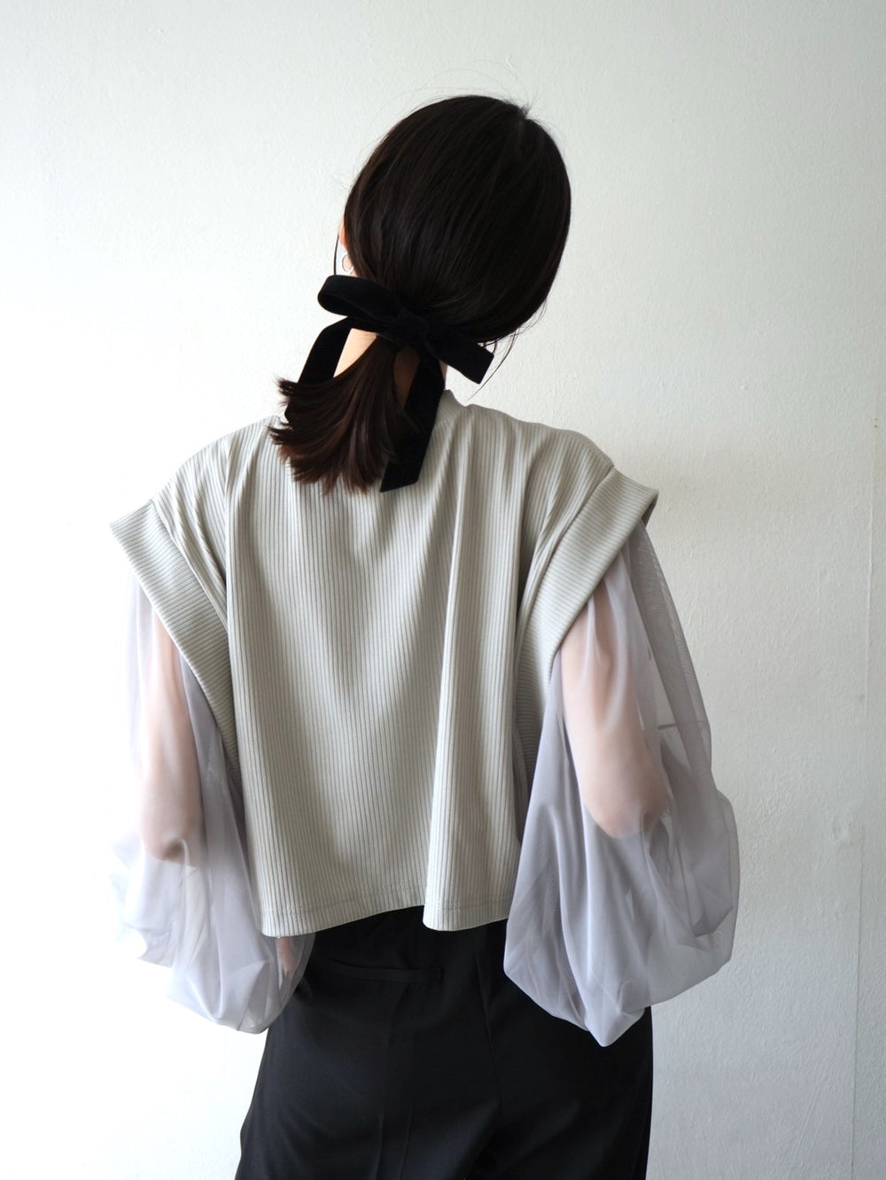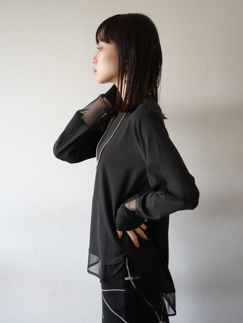 [予約]袖プリーツ配色レイヤードトップス/black