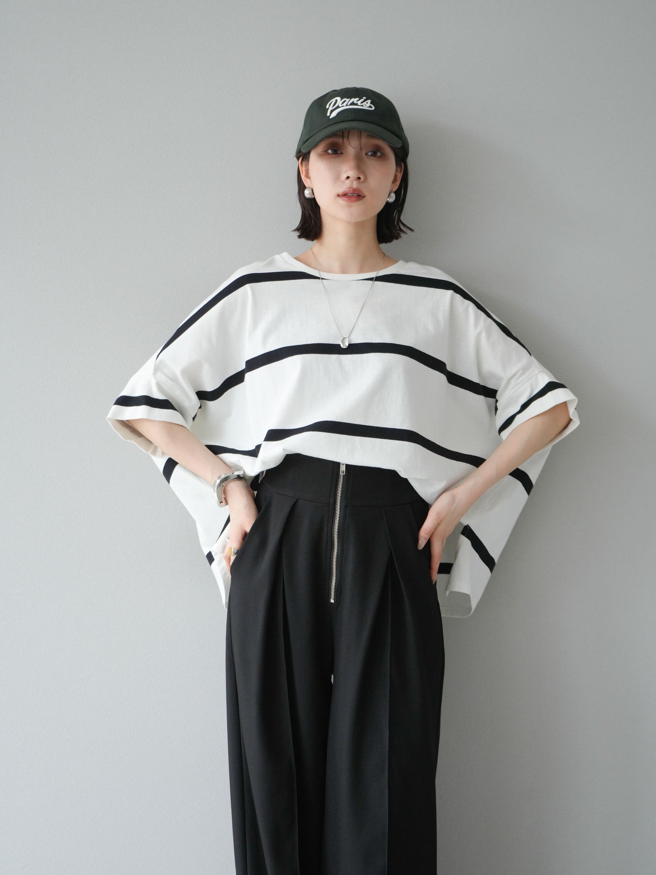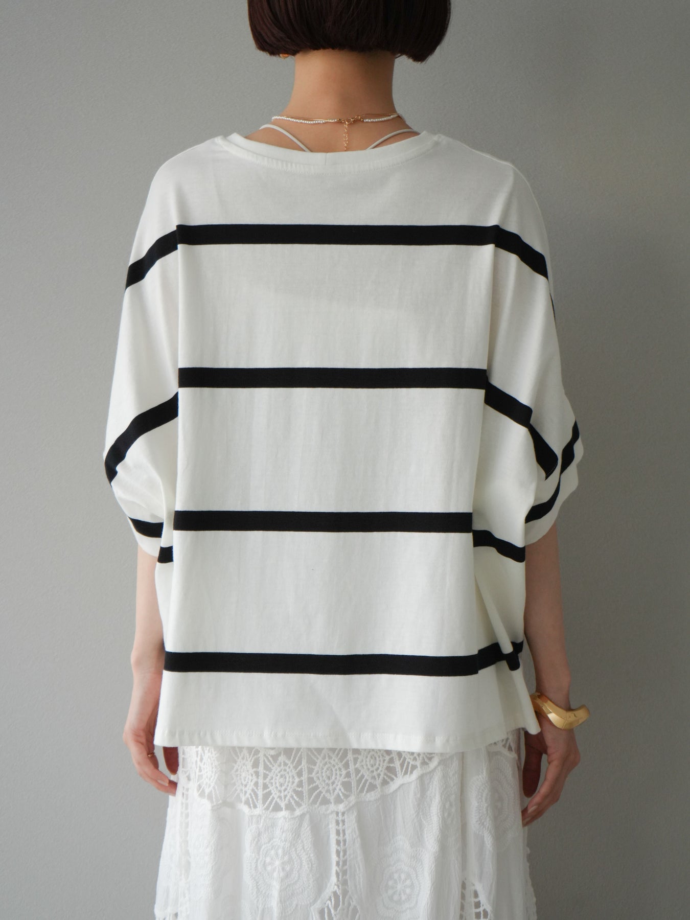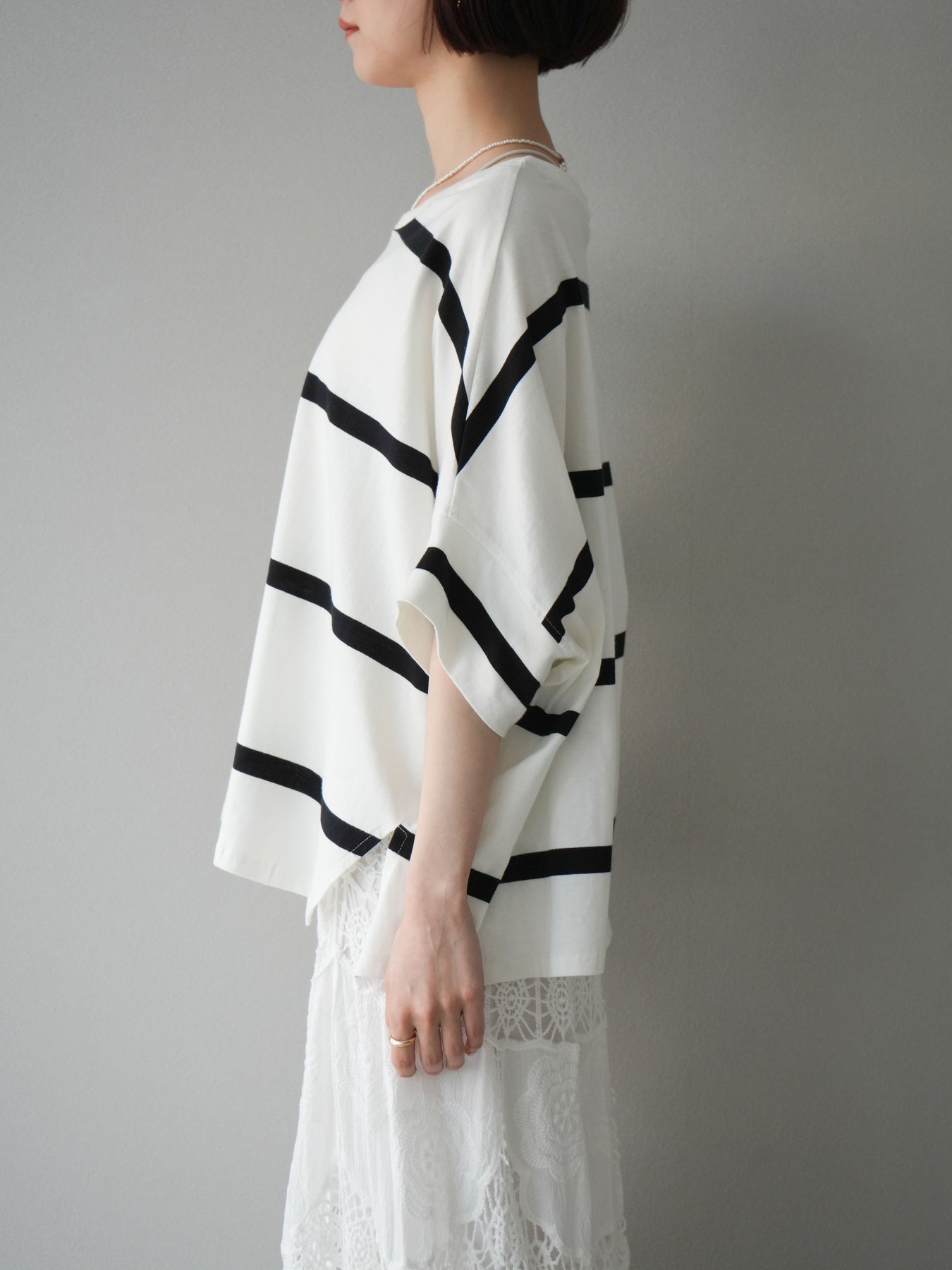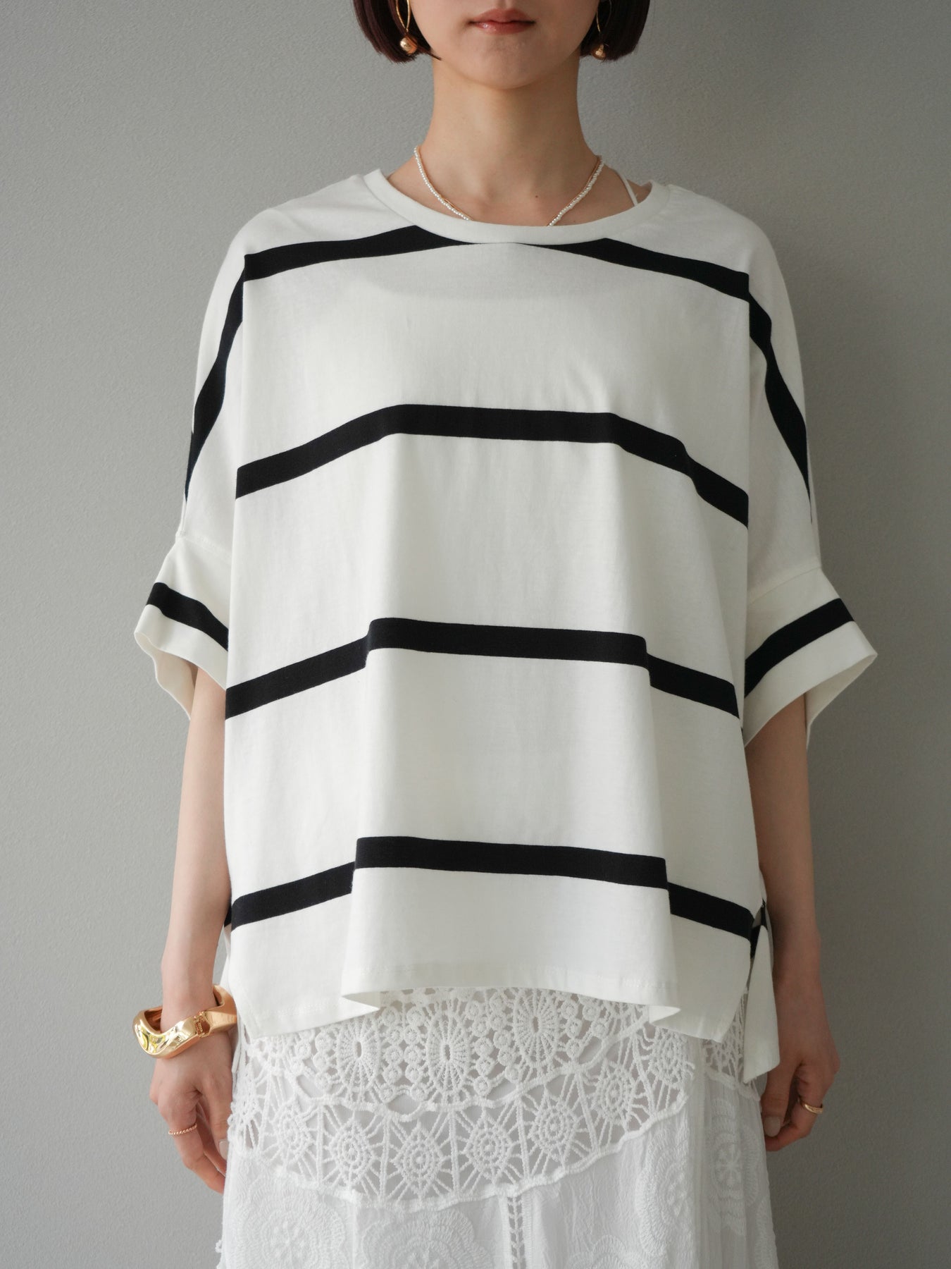 ゆったりとしたシルエットが魅力の、ボーダードルマンBIG Tシャツ。肩のラインを落としたドルマンスリーブが抜け感を演出し、リラクシーながらも大人のこなれ感あるスタイリングに仕上がります。存在感のある太めのボーダー柄は、カジュアルながらも上品な印象を与えてくれるのがポイント。パンツにもスカートにも合わせやすく、タックインでもアウトでもバランスよく決まる万能な一着です。 ※ボトムス、キャミソール(インナー)以外の商品は一律でインナーは付属していません。