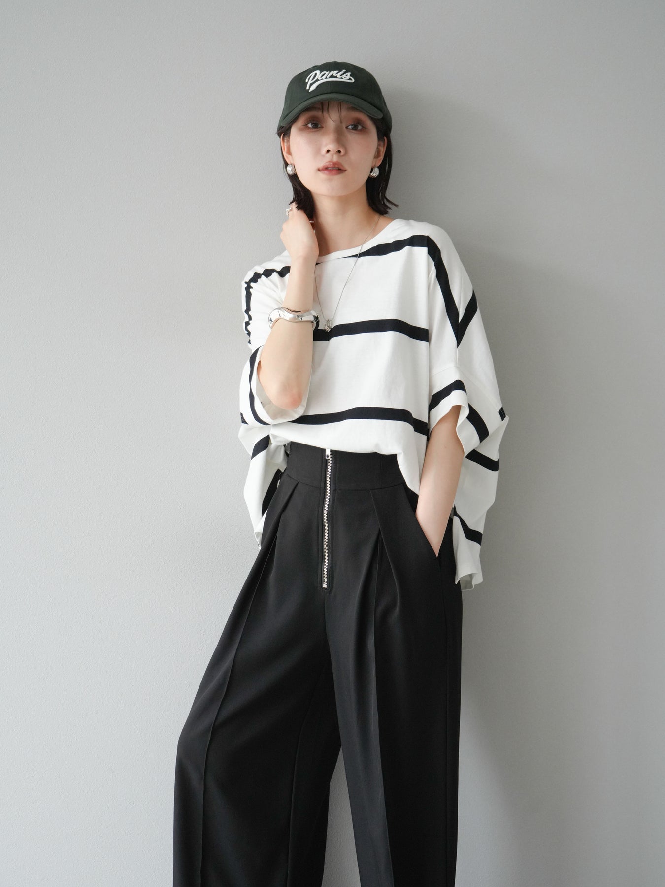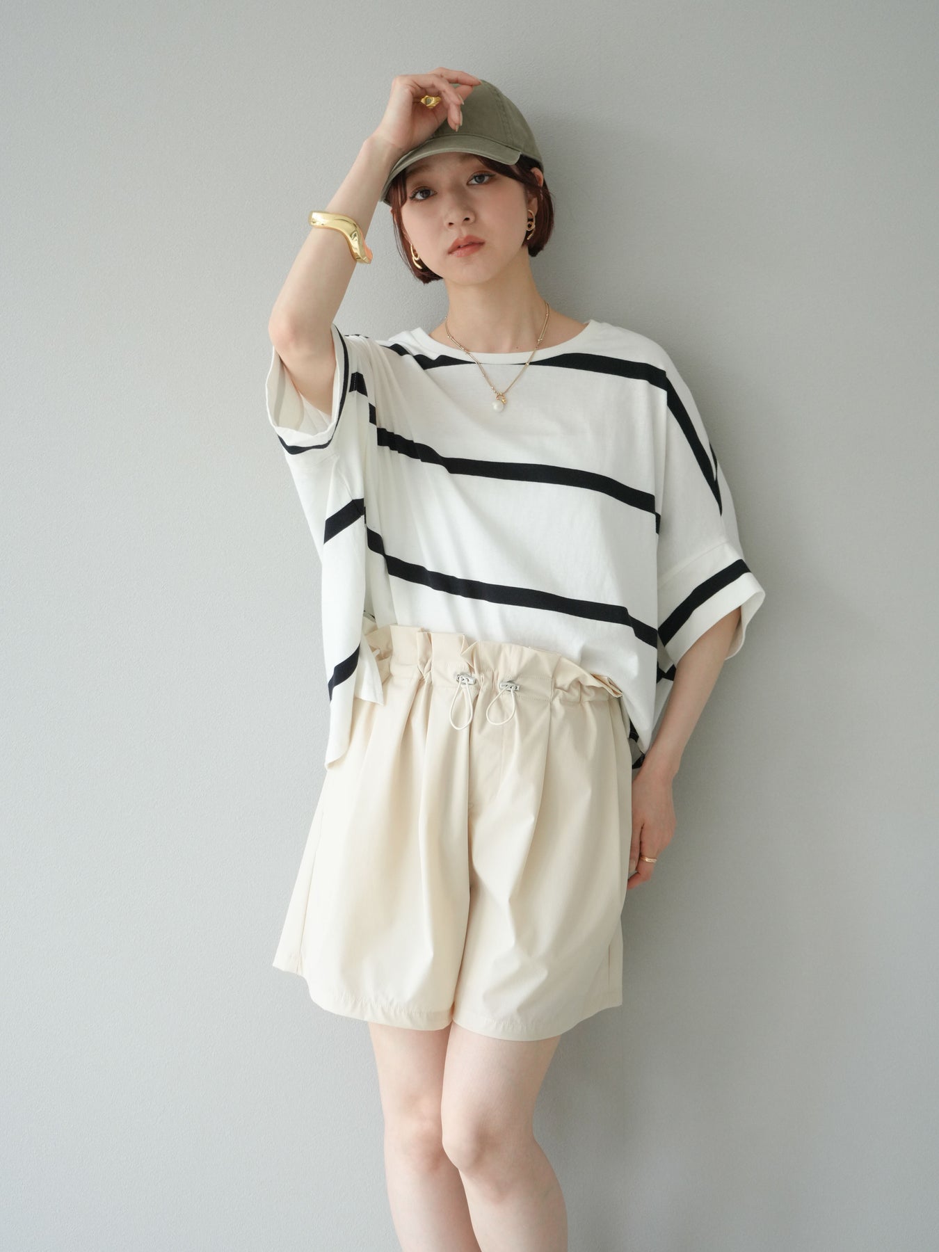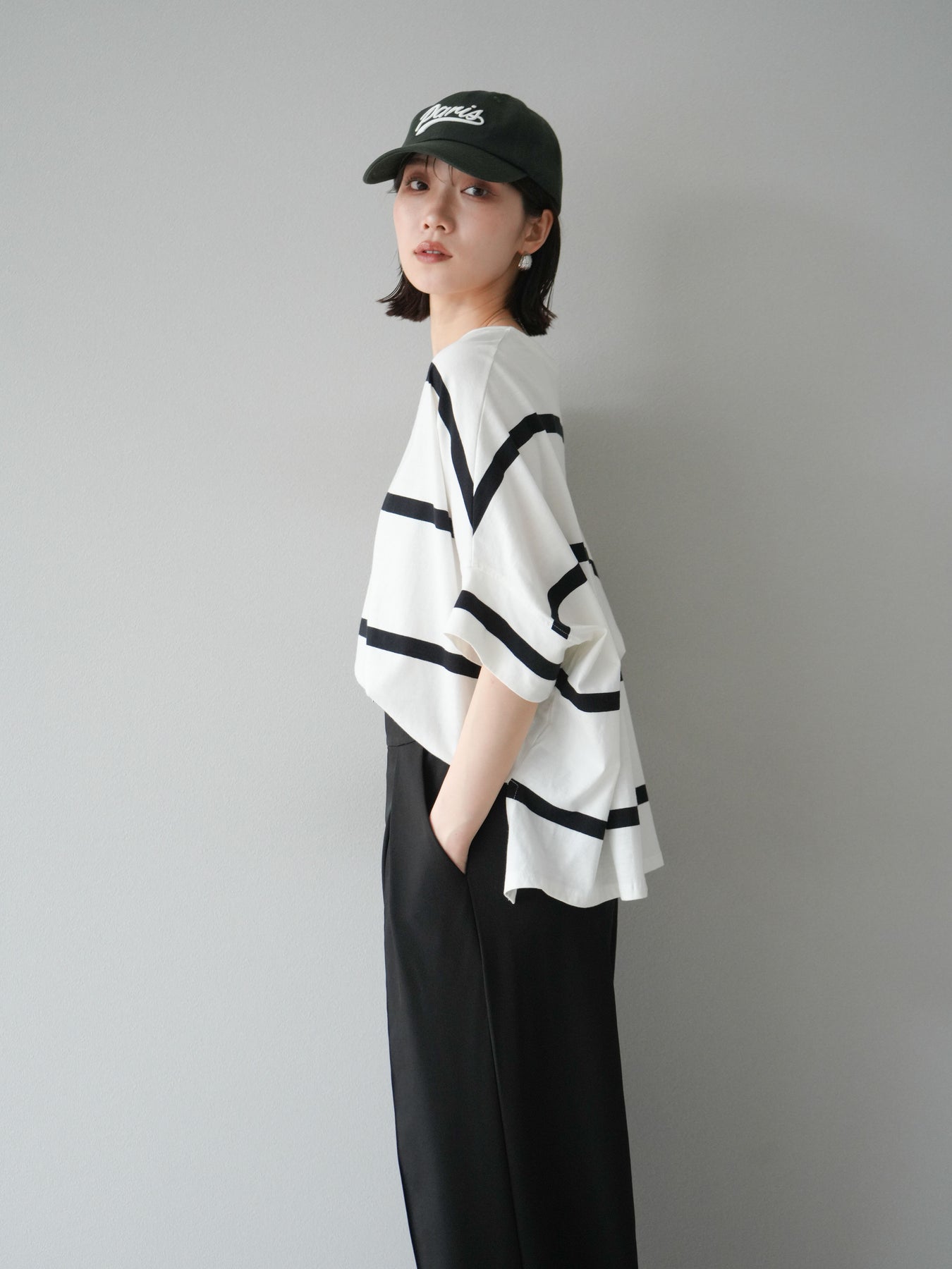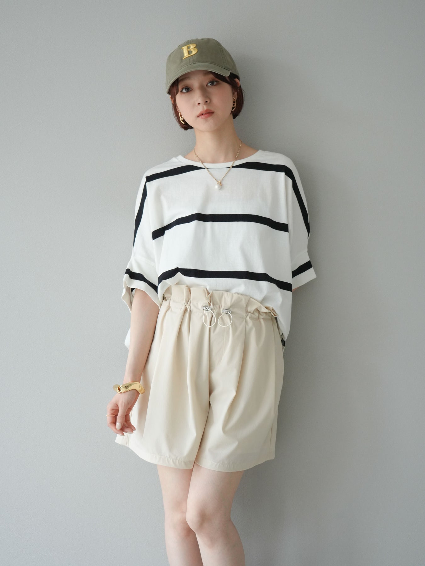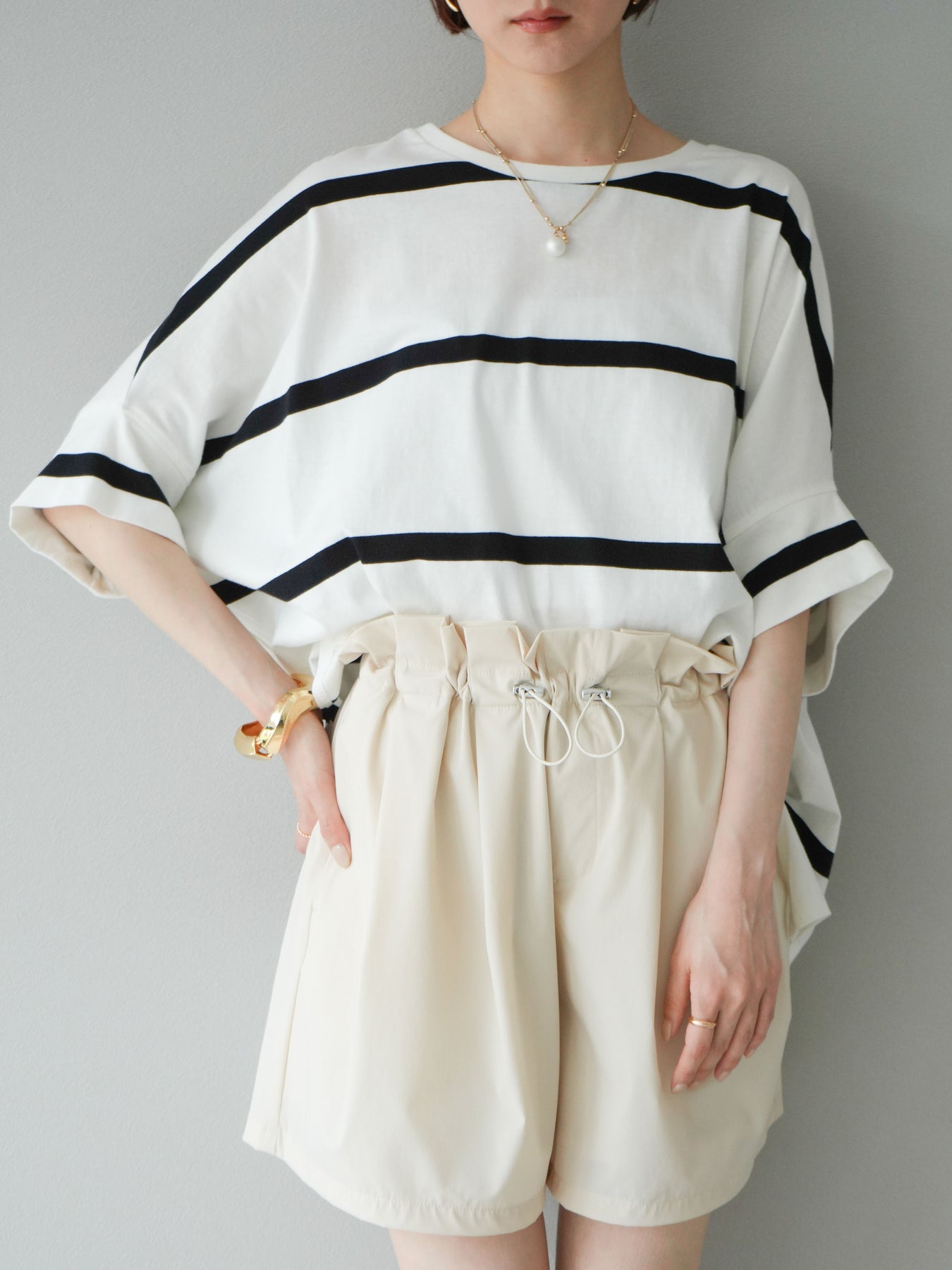 ゆったりとしたシルエットが魅力の、ボーダードルマンBIG Tシャツ。肩のラインを落としたドルマンスリーブが抜け感を演出し、リラクシーながらも大人のこなれ感あるスタイリングに仕上がります。存在感のある太めのボーダー柄は、カジュアルながらも上品な印象を与えてくれるのがポイント。パンツにもスカートにも合わせやすく、タックインでもアウトでもバランスよく決まる万能な一着です。 ※ボトムス、キャミソール(インナー)以外の商品は一律でインナーは付属していません。