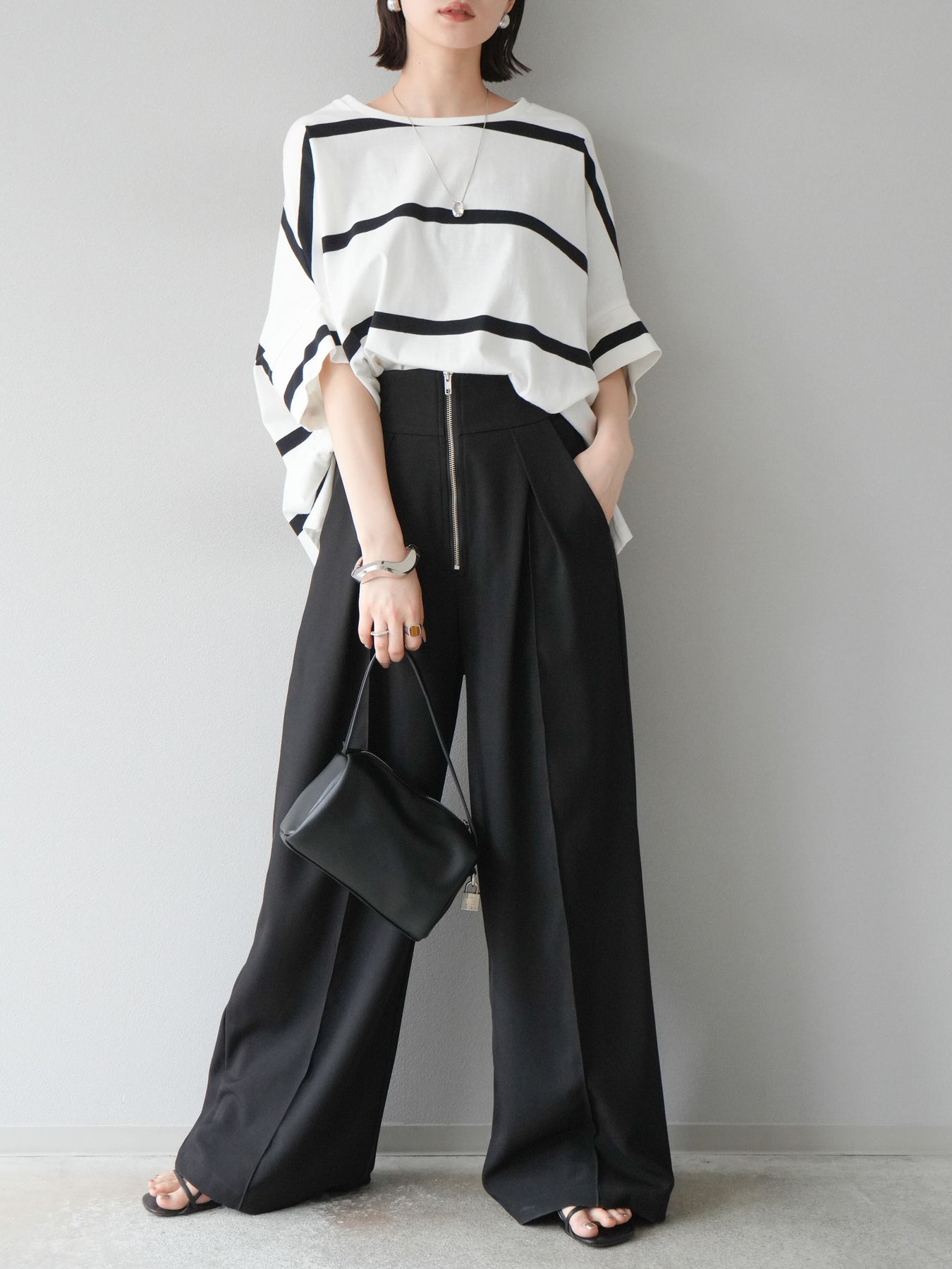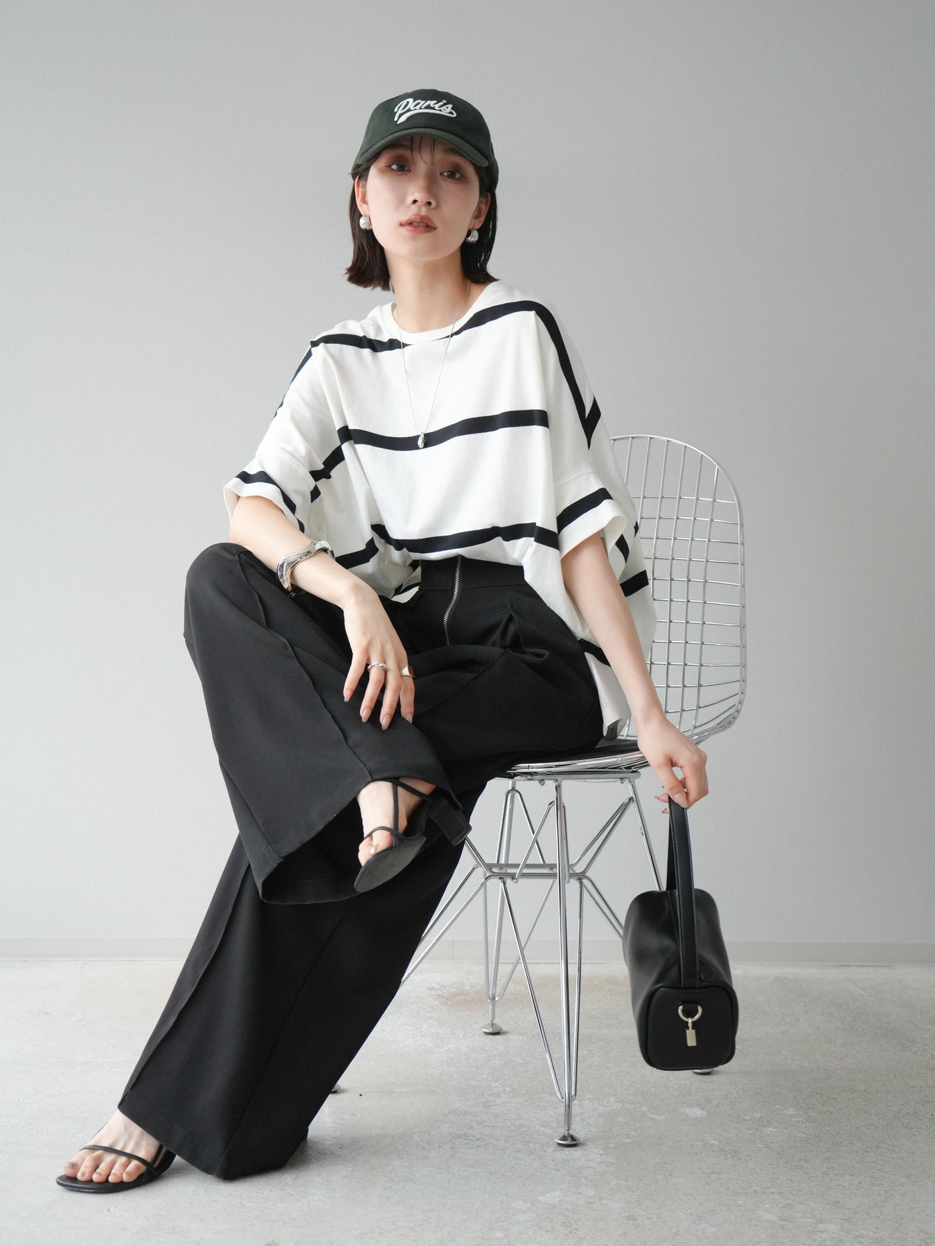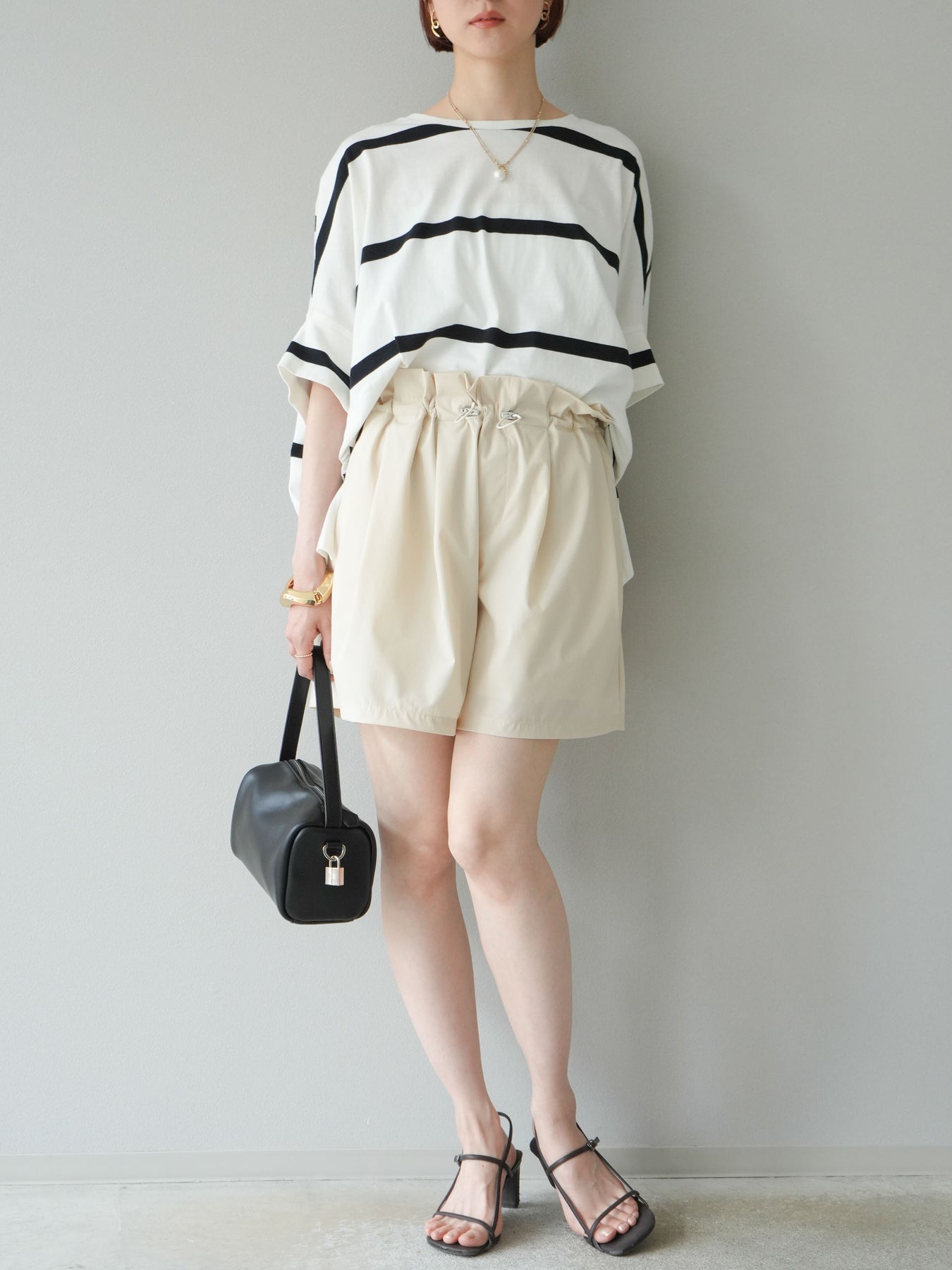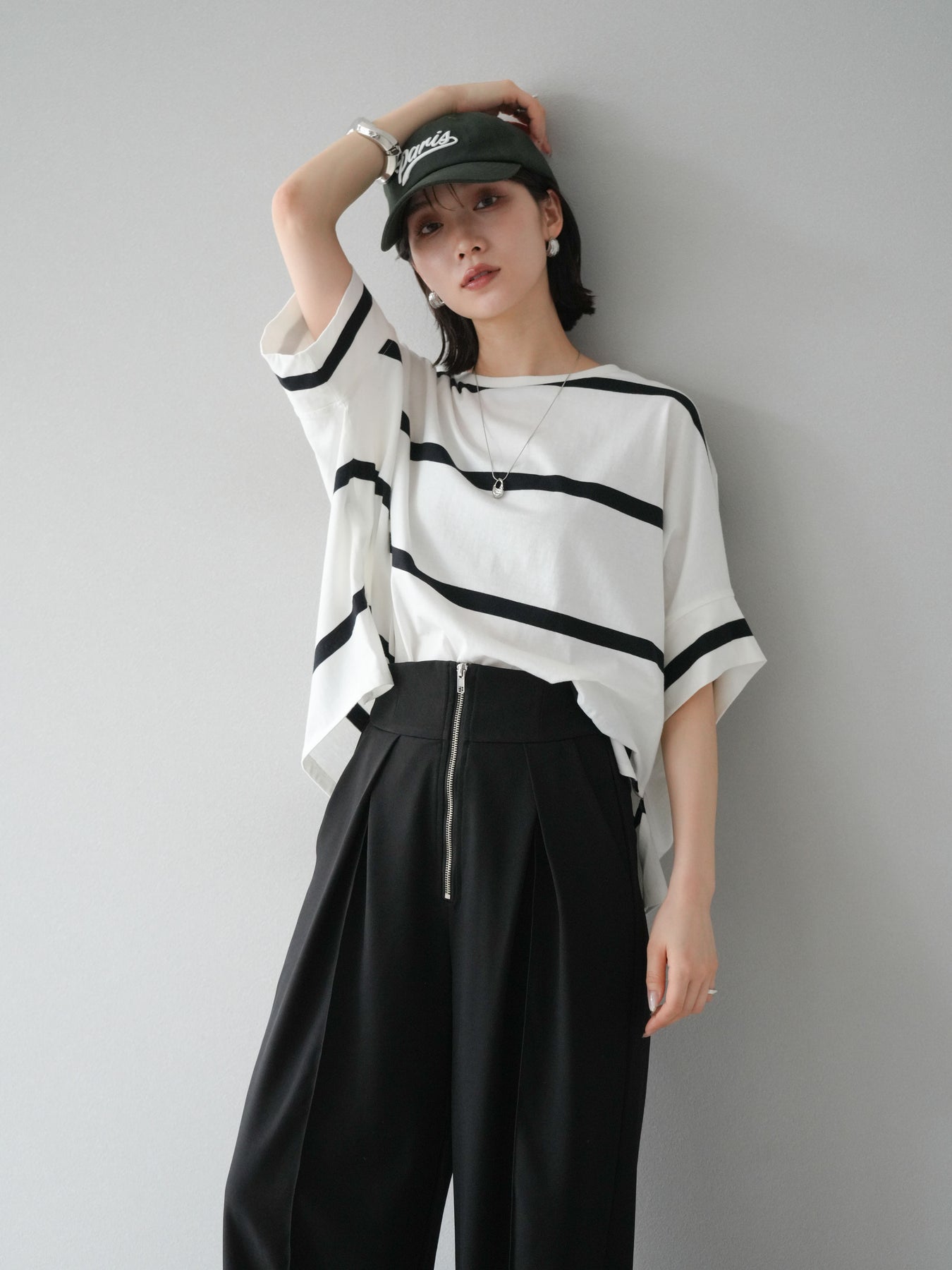 ゆったりとしたシルエットが魅力の、ボーダードルマンBIG Tシャツ。肩のラインを落としたドルマンスリーブが抜け感を演出し、リラクシーながらも大人のこなれ感あるスタイリングに仕上がります。存在感のある太めのボーダー柄は、カジュアルながらも上品な印象を与えてくれるのがポイント。パンツにもスカートにも合わせやすく、タックインでもアウトでもバランスよく決まる万能な一着です。 ※ボトムス、キャミソール(インナー)以外の商品は一律でインナーは付属していません。