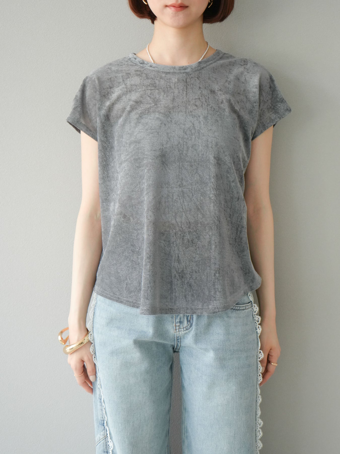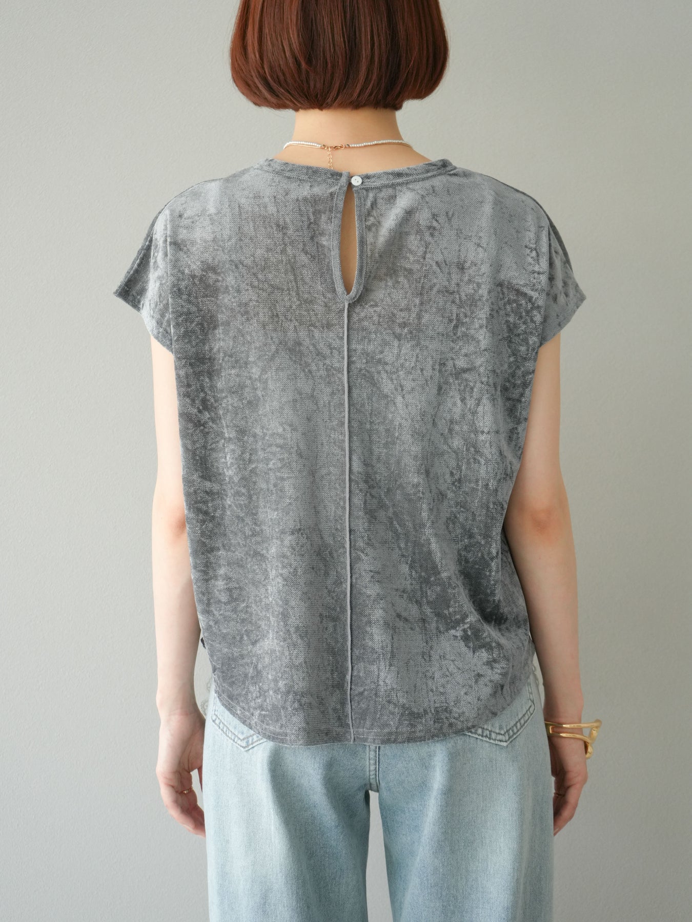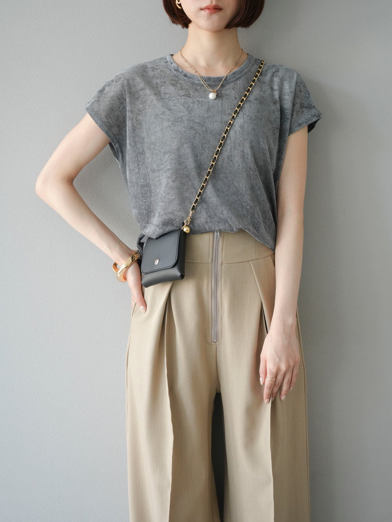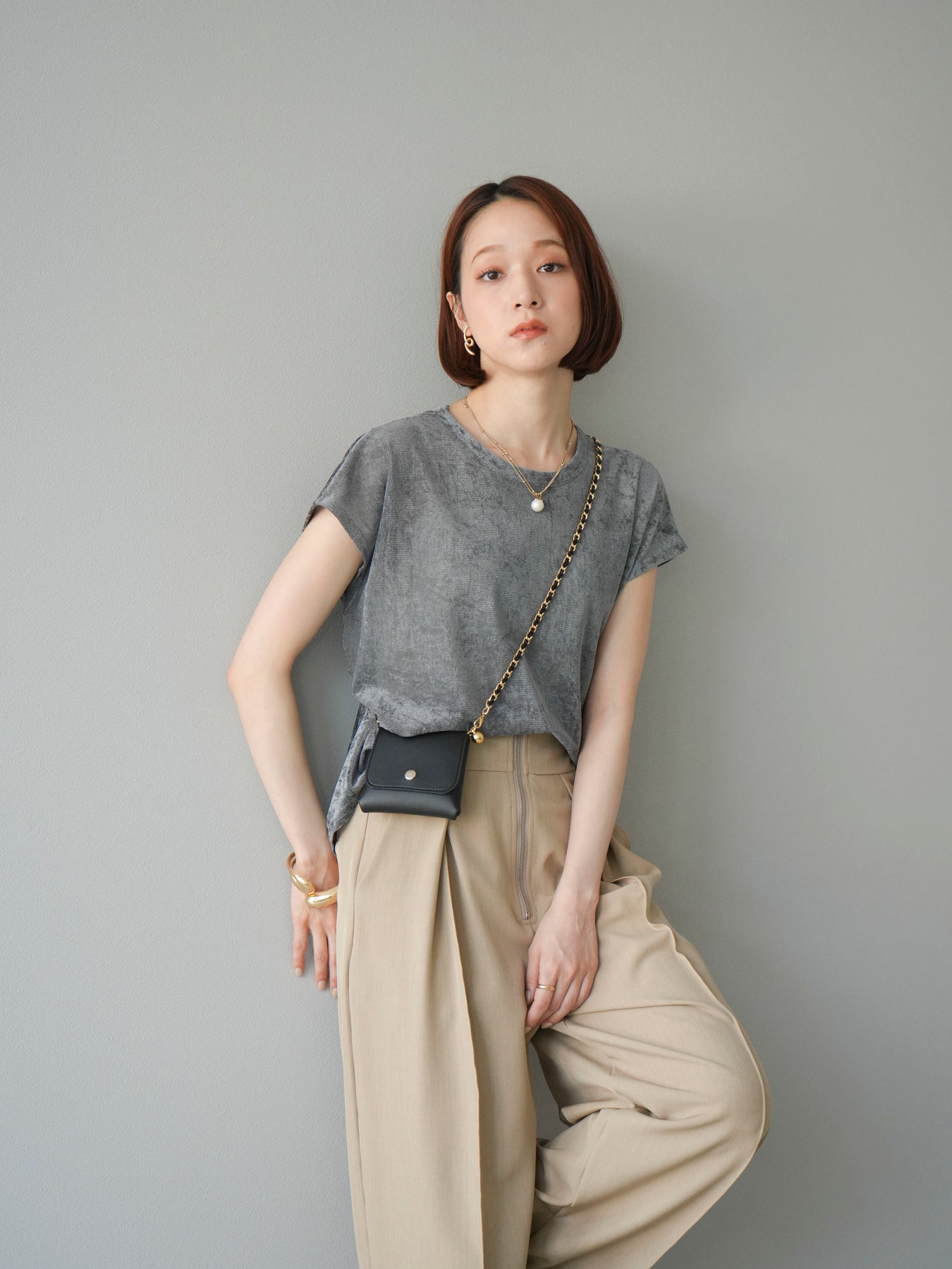 ほんのりとした光沢感と透け感が魅力の、シアーベロア素材を使用したプルオーバー。上品さとカジュアルさを兼ね備えた素材感で、シンプルなシルエットながらもこなれ感を演出してくれる一枚です。落ち感のある柔らかな風合いで着心地も抜群。インナーとのレイヤードで表情を変えられるのもポイントです。デニムやスカートに合わせるだけで、旬なスタイリングが完成する万能トップス。 ※ボトムス、キャミソール(インナー)以外の商品は一律でインナーは付属していません。