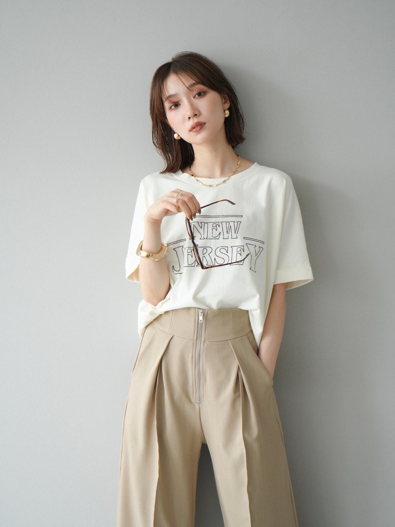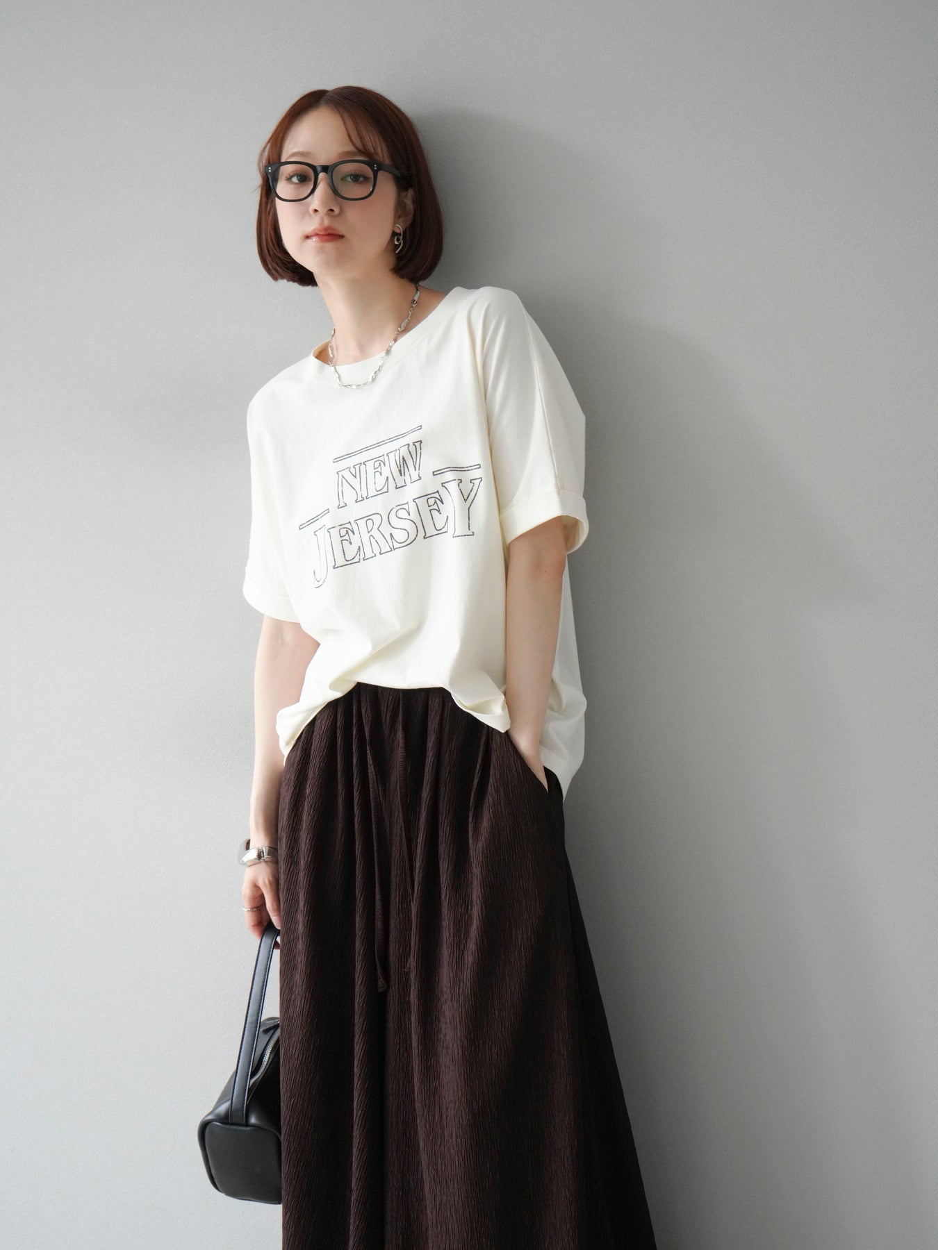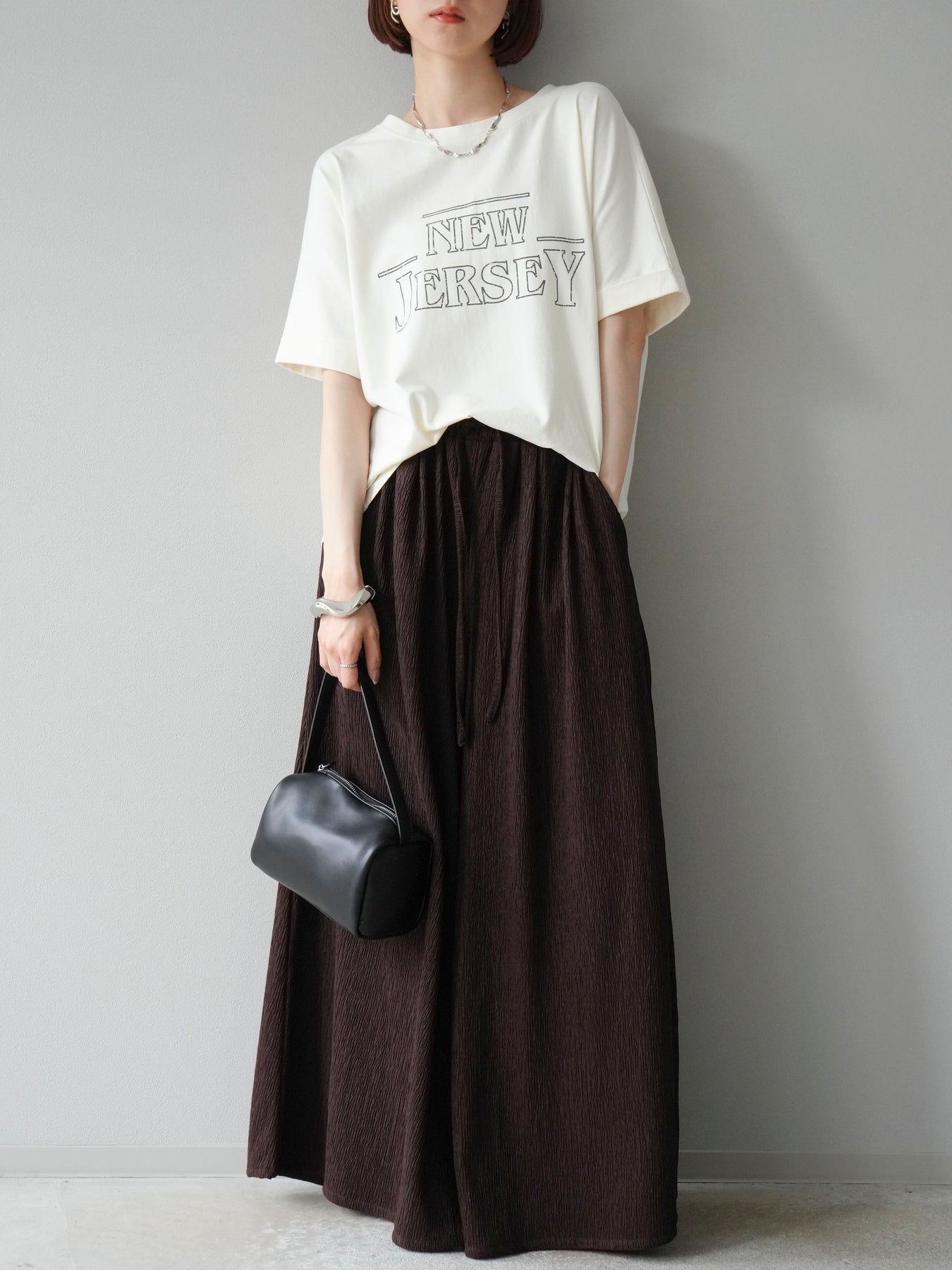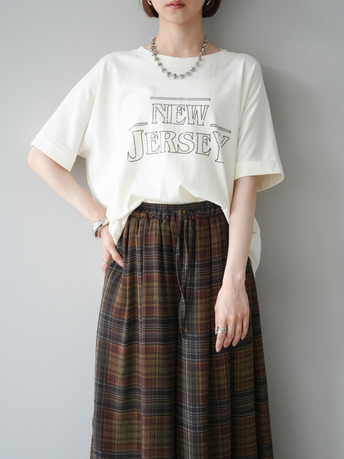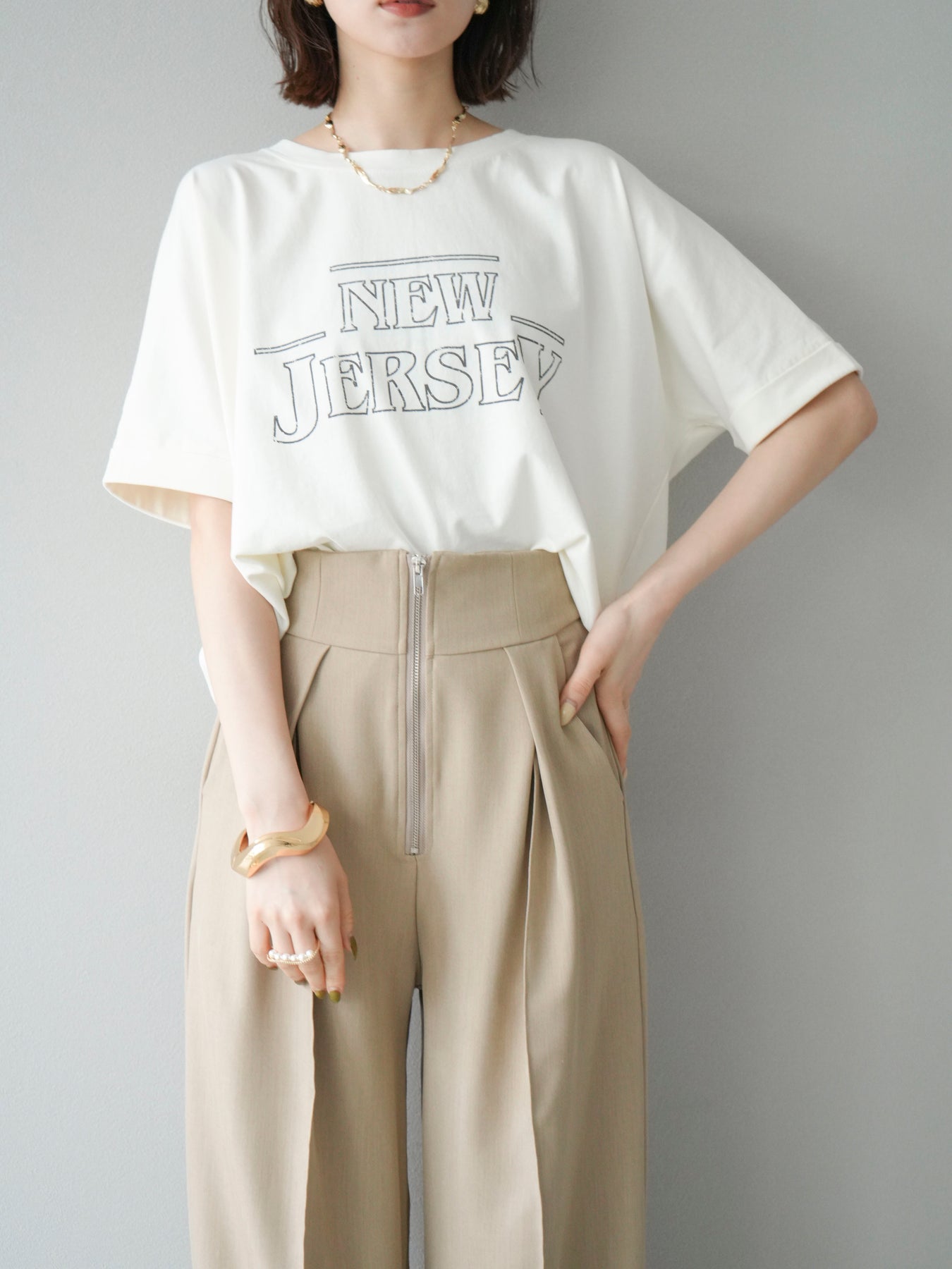 ニュアンス感のあるラインプリントで表現した「NEW JERSEY」ロゴが、こなれた雰囲気を演出するTシャツ。カジュアルながらもビンテージライクな味わいのあるデザインで、1枚で着映えするアイテムです。 程よくゆとりのあるシルエットと、前後差のある裾ラインが抜け感をプラス。パンツにもスカートにも合わせやすく、デイリーコーデに自然と取り入れられます。 デザイン性と着心地を両立した、ワードローブに加えたい大人のロゴTです。 ※ボトムス、キャミソール(インナー)以外の商品は一律でインナーは付属していません。