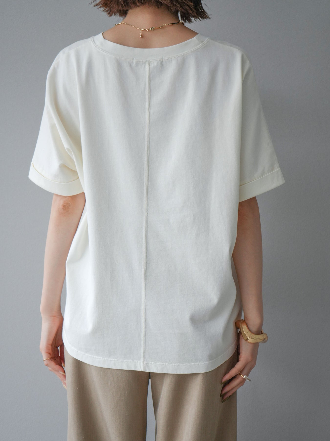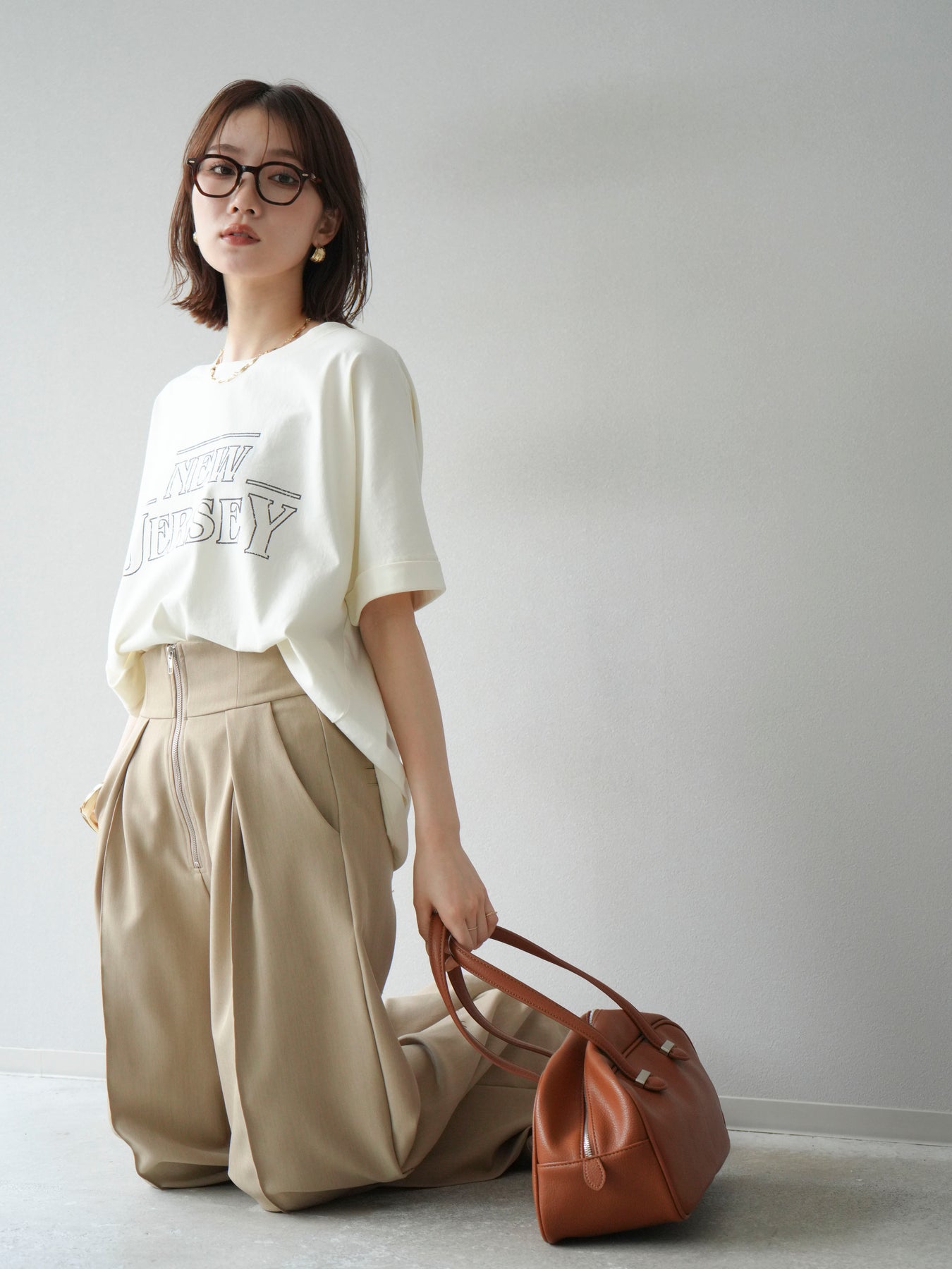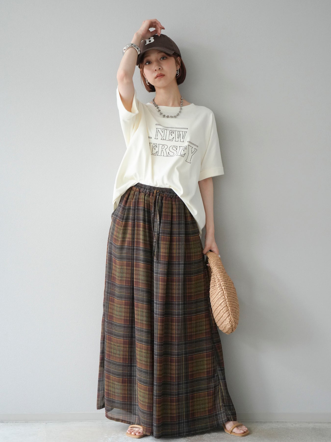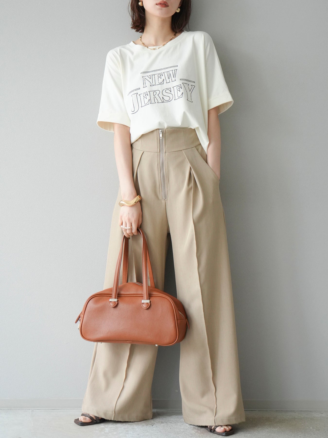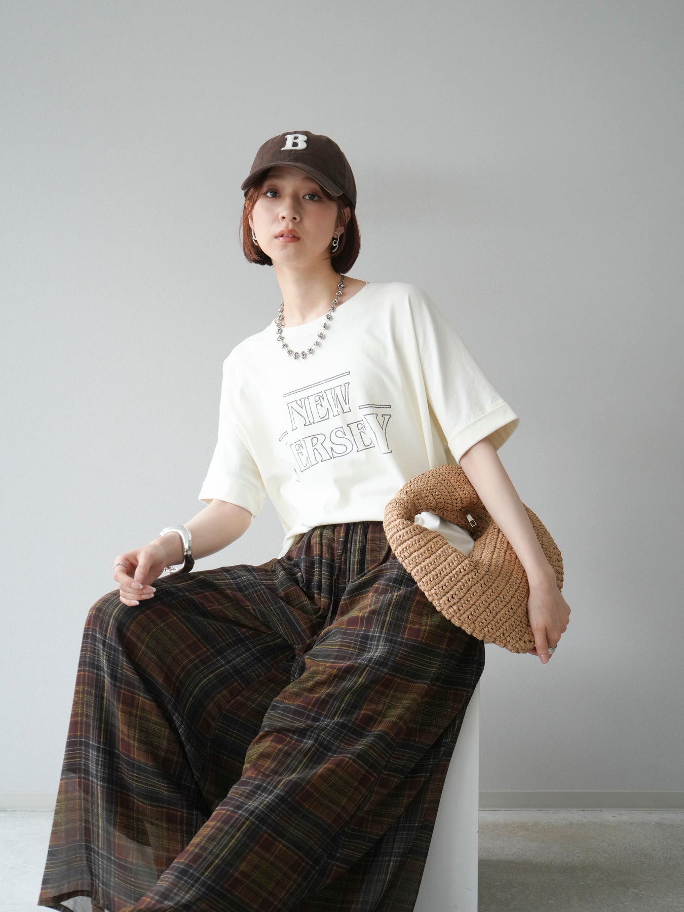 ニュアンス感のあるラインプリントで表現した「NEW JERSEY」ロゴが、こなれた雰囲気を演出するTシャツ。カジュアルながらもビンテージライクな味わいのあるデザインで、1枚で着映えするアイテムです。 程よくゆとりのあるシルエットと、前後差のある裾ラインが抜け感をプラス。パンツにもスカートにも合わせやすく、デイリーコーデに自然と取り入れられます。 デザイン性と着心地を両立した、ワードローブに加えたい大人のロゴTです。 ※ボトムス、キャミソール(インナー)以外の商品は一律でインナーは付属していません。