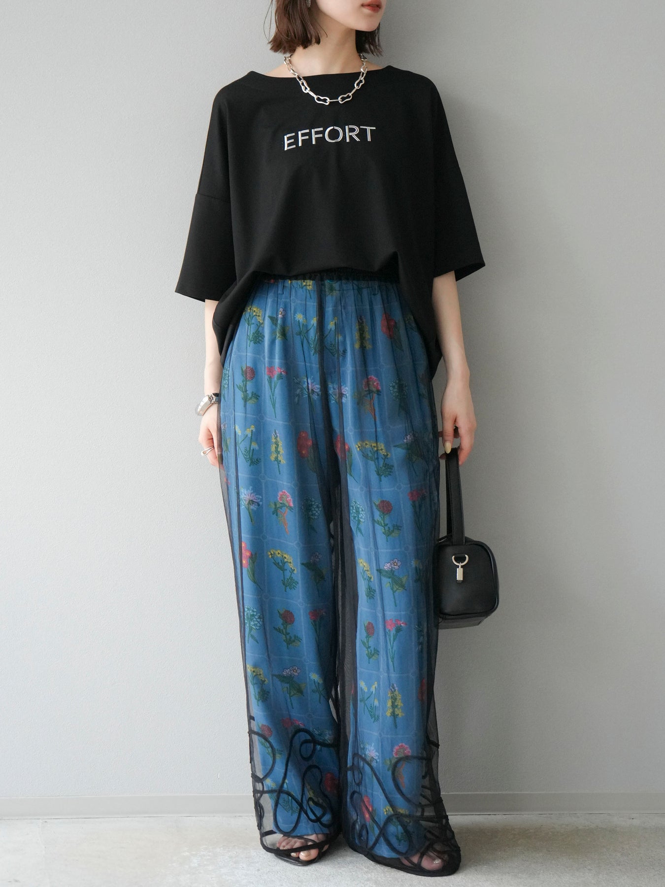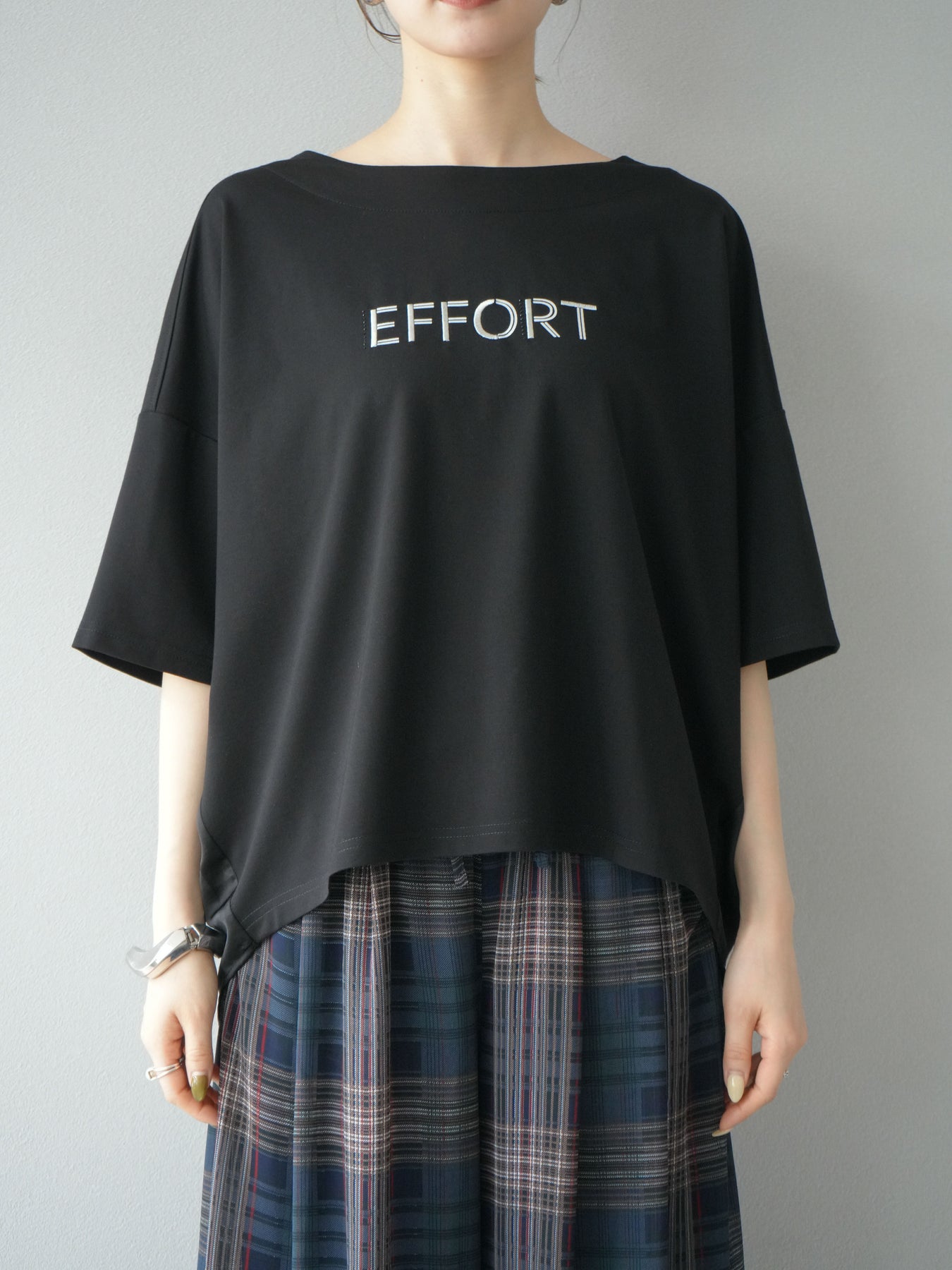 フロントに施された「EFFORT」のロゴが、異素材プリントとメタリック刺繍を組み合わせたデザインで印象的に映えるTシャツ。立体感のあるロゴディテールが、シンプルな中にもモード感をプラスします。 ゆったりとしたドロップショルダーと前後差のあるヘムラインが、こなれた抜け感を演出。肌触りの良いカットソー素材で、デイリーに気兼ねなく着用できます。 カジュアルながらもデザイン性のある1枚で、ボトムを選ばず着回せる優秀アイテムです。 ※ボトムス、キャミソール(インナー)以外の商品は一律でインナーは付属していません。