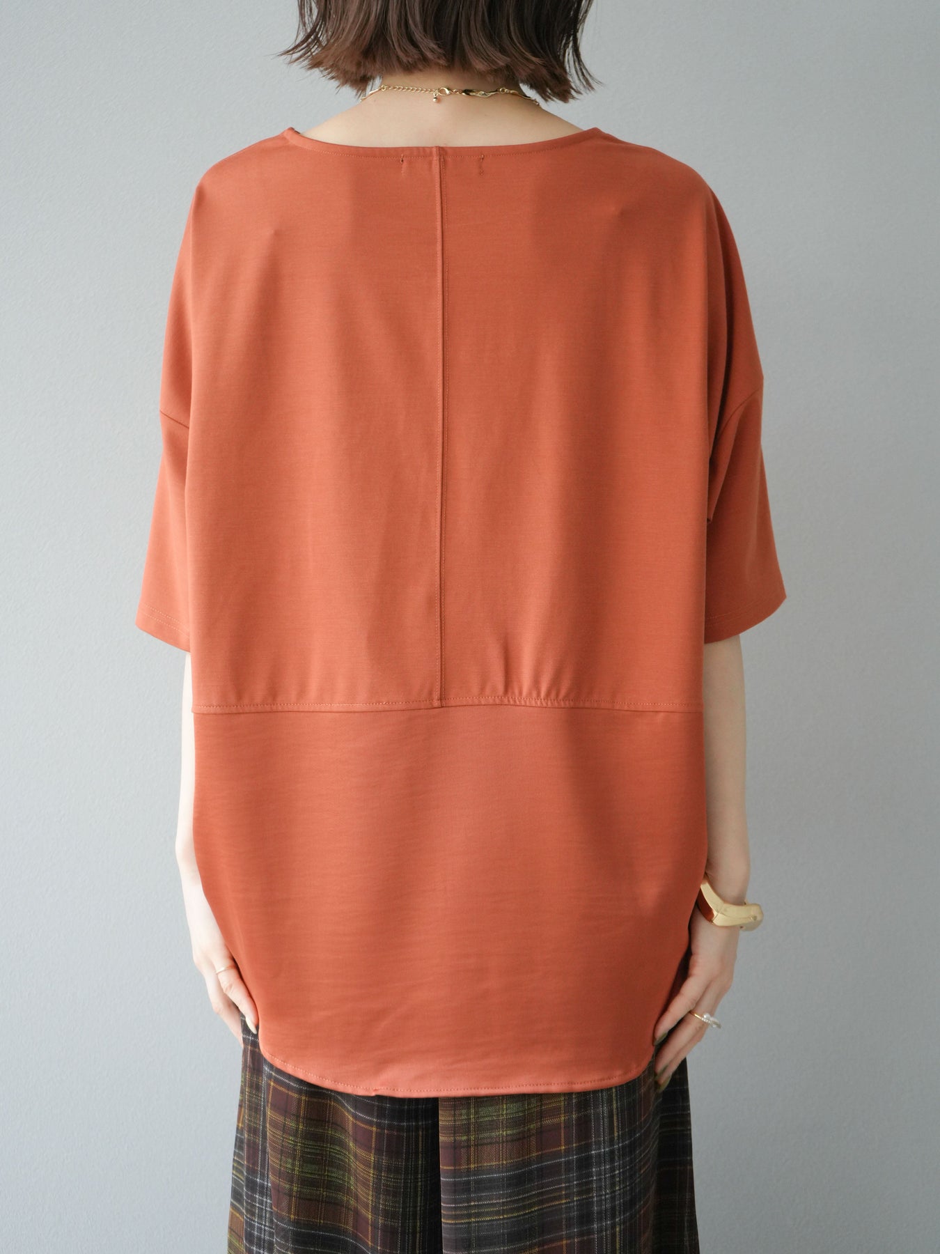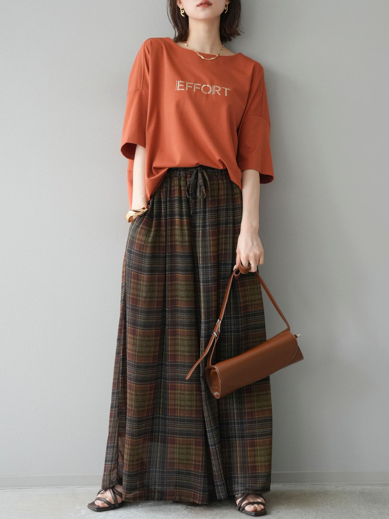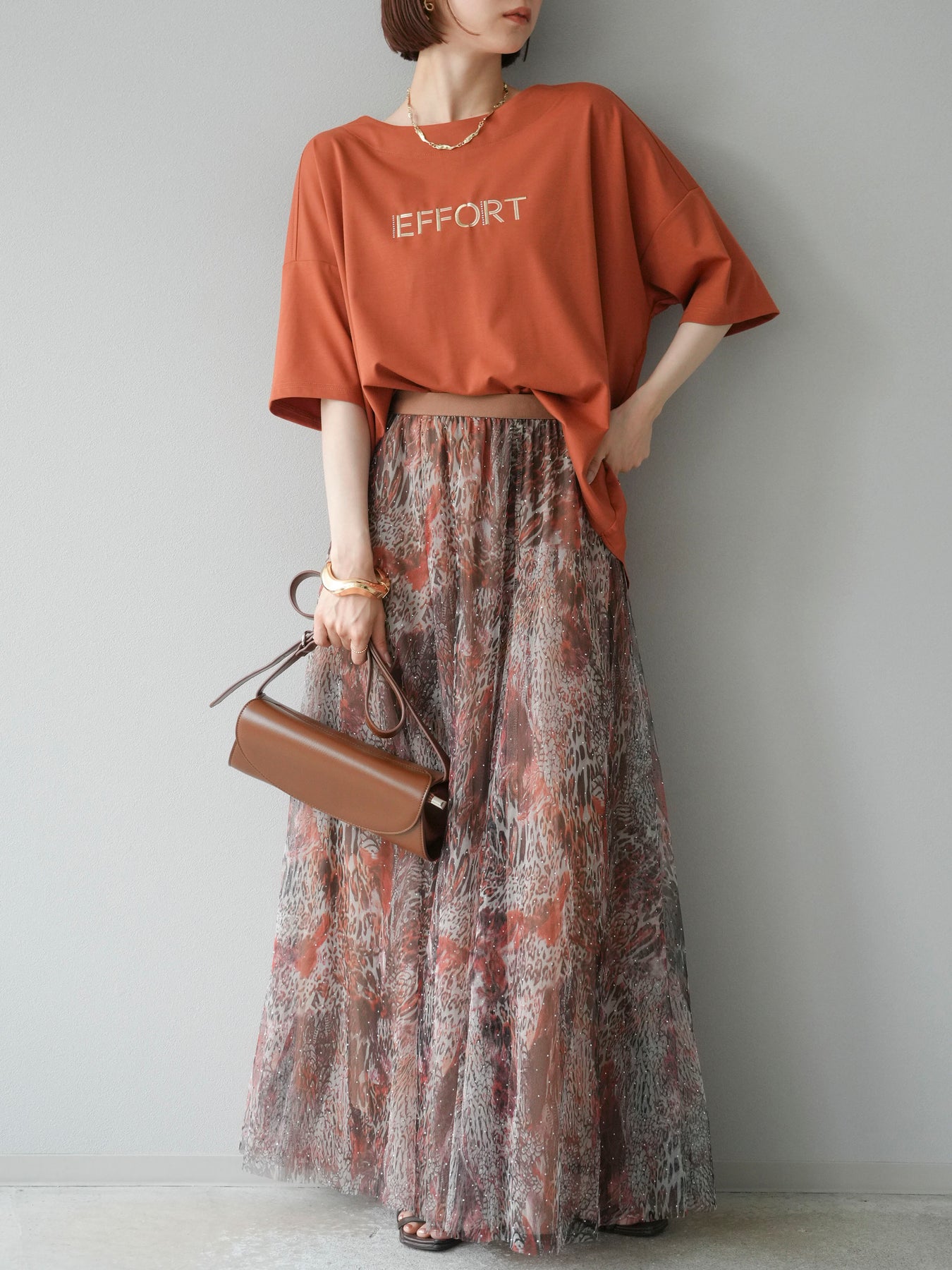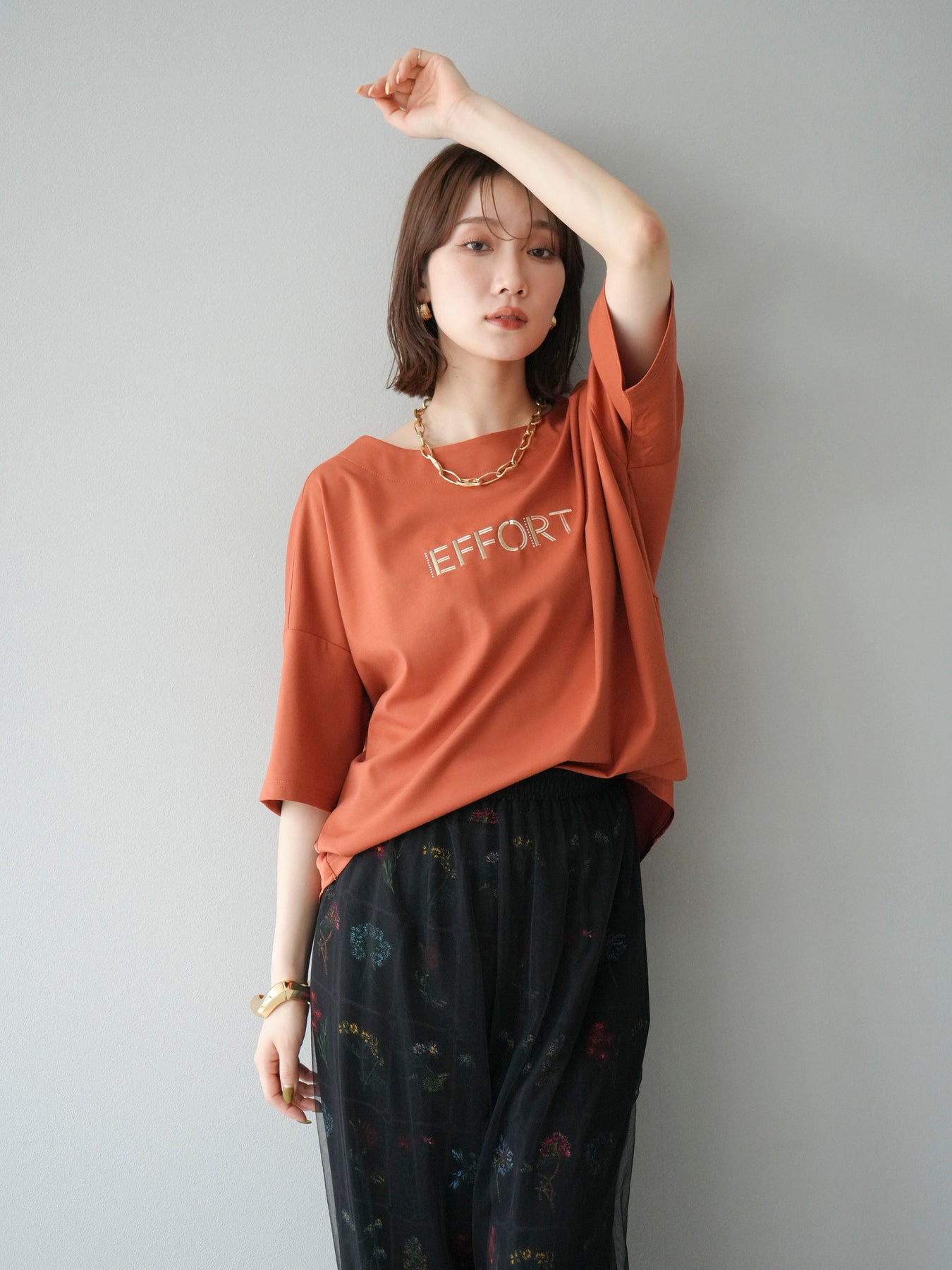 フロントに施された「EFFORT」のロゴが、異素材プリントとメタリック刺繍を組み合わせたデザインで印象的に映えるTシャツ。立体感のあるロゴディテールが、シンプルな中にもモード感をプラスします。 ゆったりとしたドロップショルダーと前後差のあるヘムラインが、こなれた抜け感を演出。肌触りの良いカットソー素材で、デイリーに気兼ねなく着用できます。 カジュアルながらもデザイン性のある1枚で、ボトムを選ばず着回せる優秀アイテムです。 ※ボトムス、キャミソール(インナー)以外の商品は一律でインナーは付属していません。