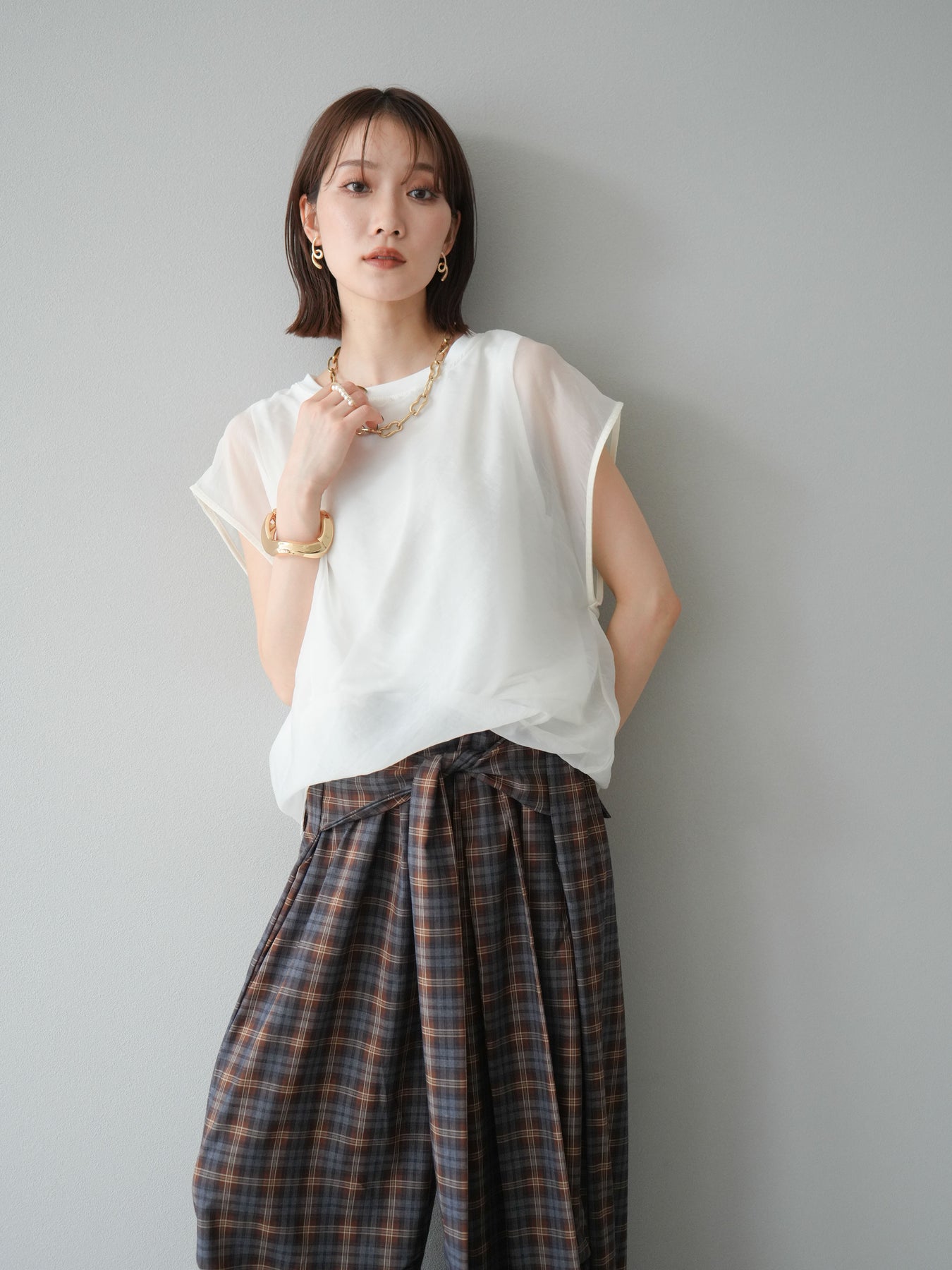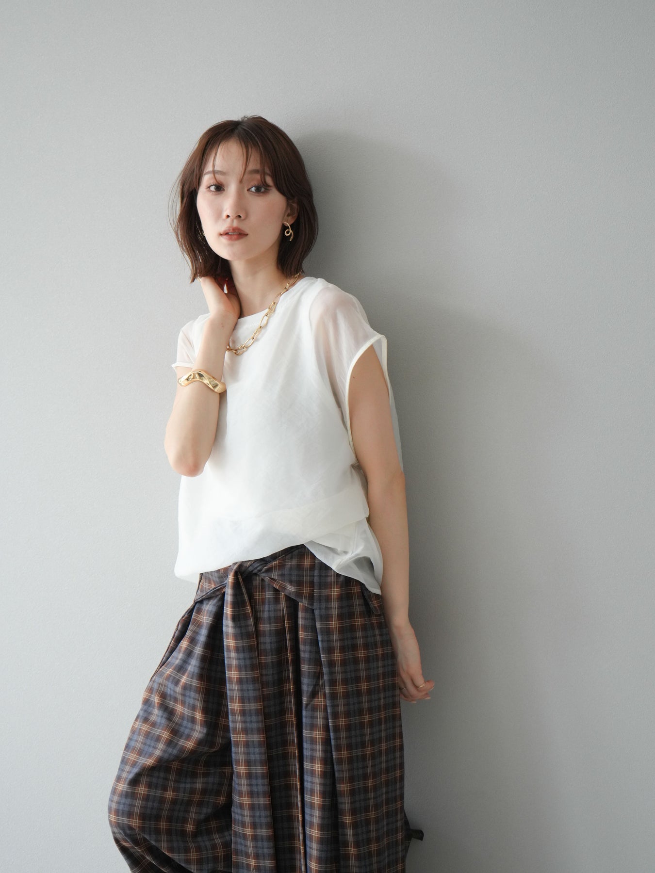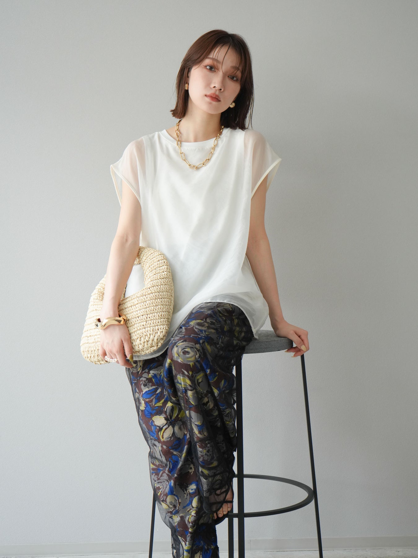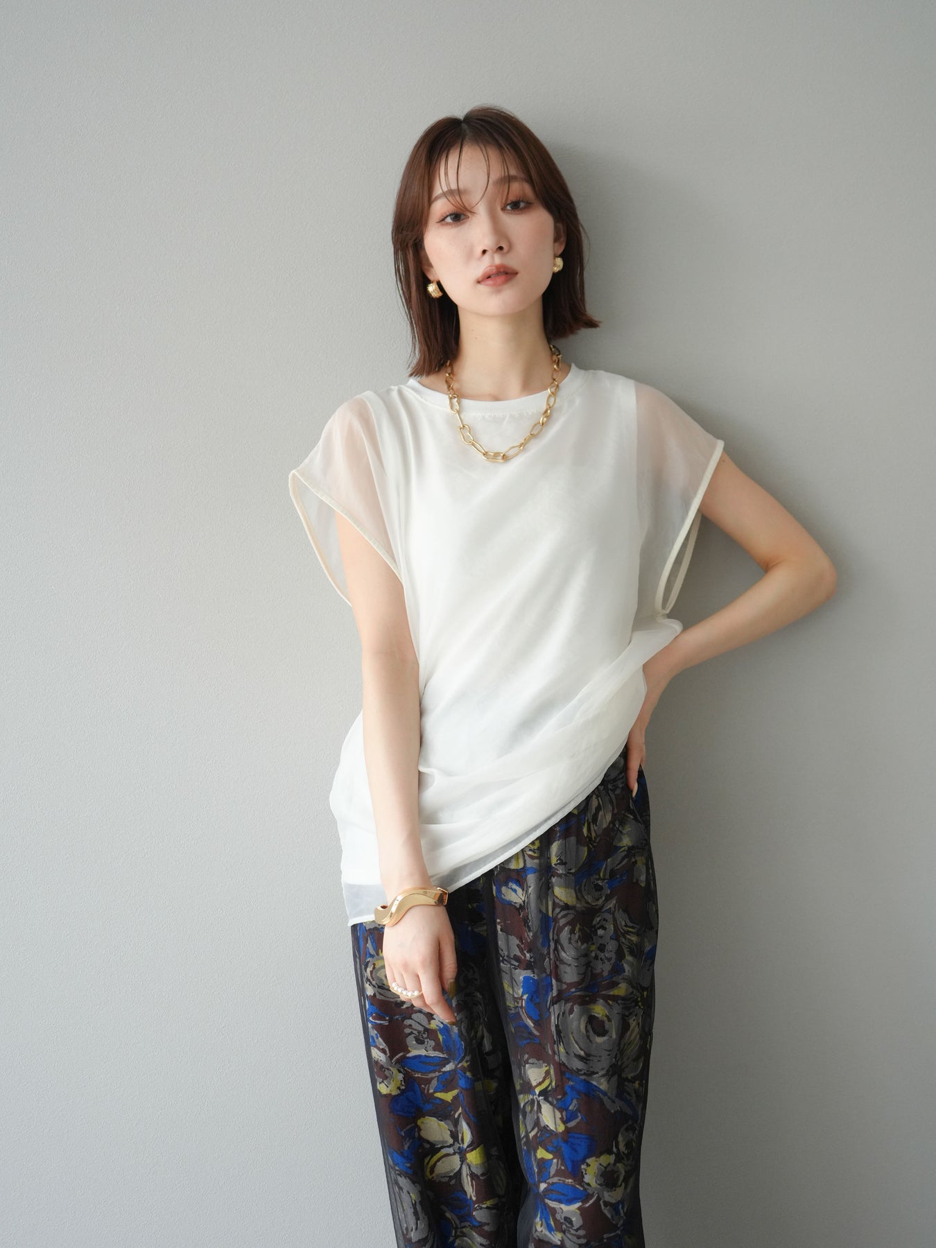 軽やかで透け感のあるシアー素材を重ねた、抜け感たっぷりのレイヤードトップス。程よくゆとりのあるシルエットで体のラインを拾わず、さらっと着るだけでこなれた印象に仕上がります。カットソー素材のインナー付きで、透け感を楽しみながらも安心して着用できるのも嬉しいポイント。デニムやスラックスなど、幅広いボトムスと好相性で、カジュアルにもモードにもマッチする万能アイテムです。 ※ボトムス、キャミソール(インナー)以外の商品は一律でインナーは付属していません。