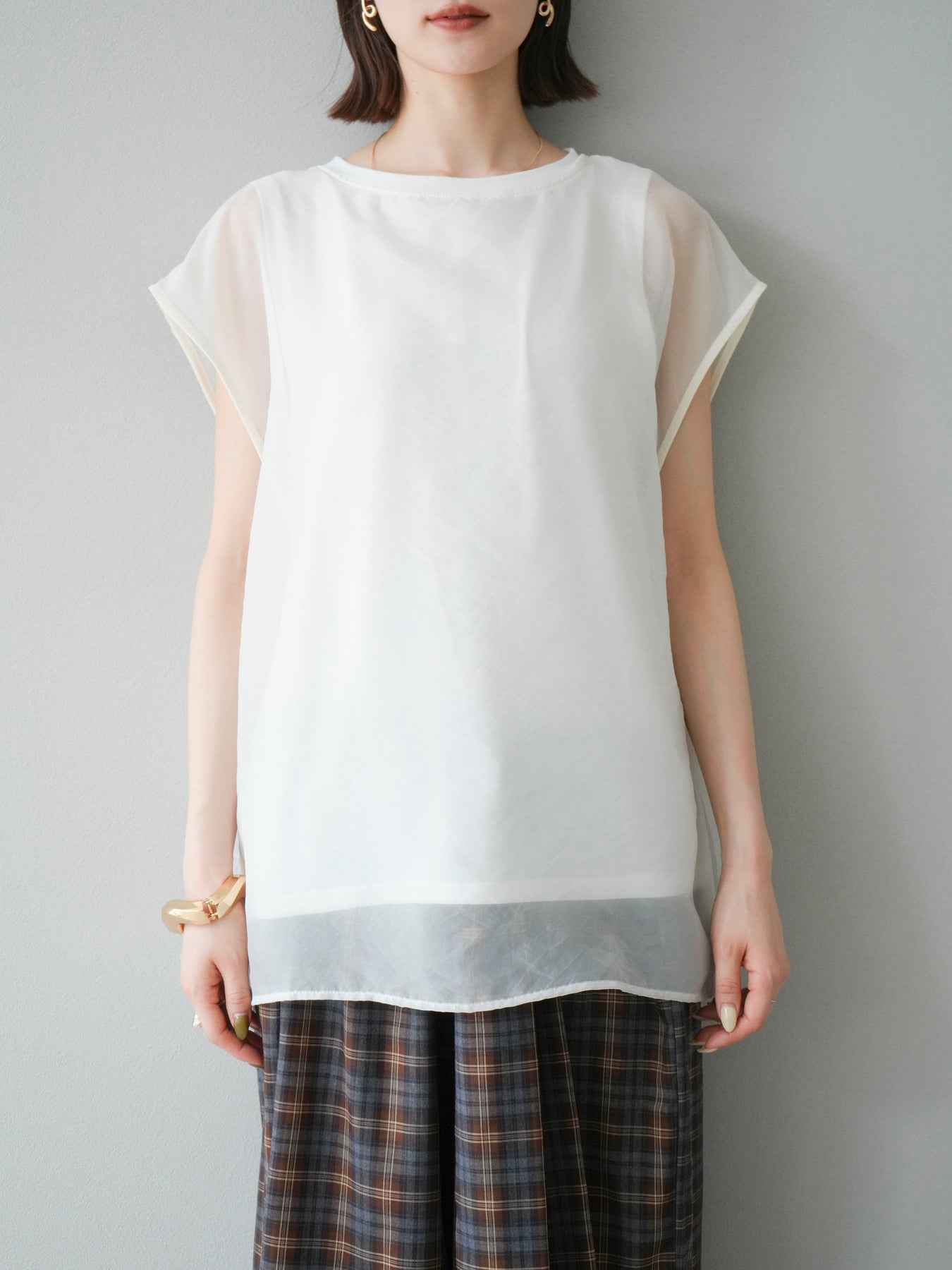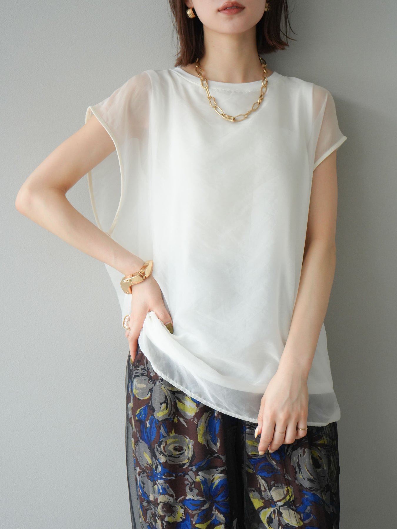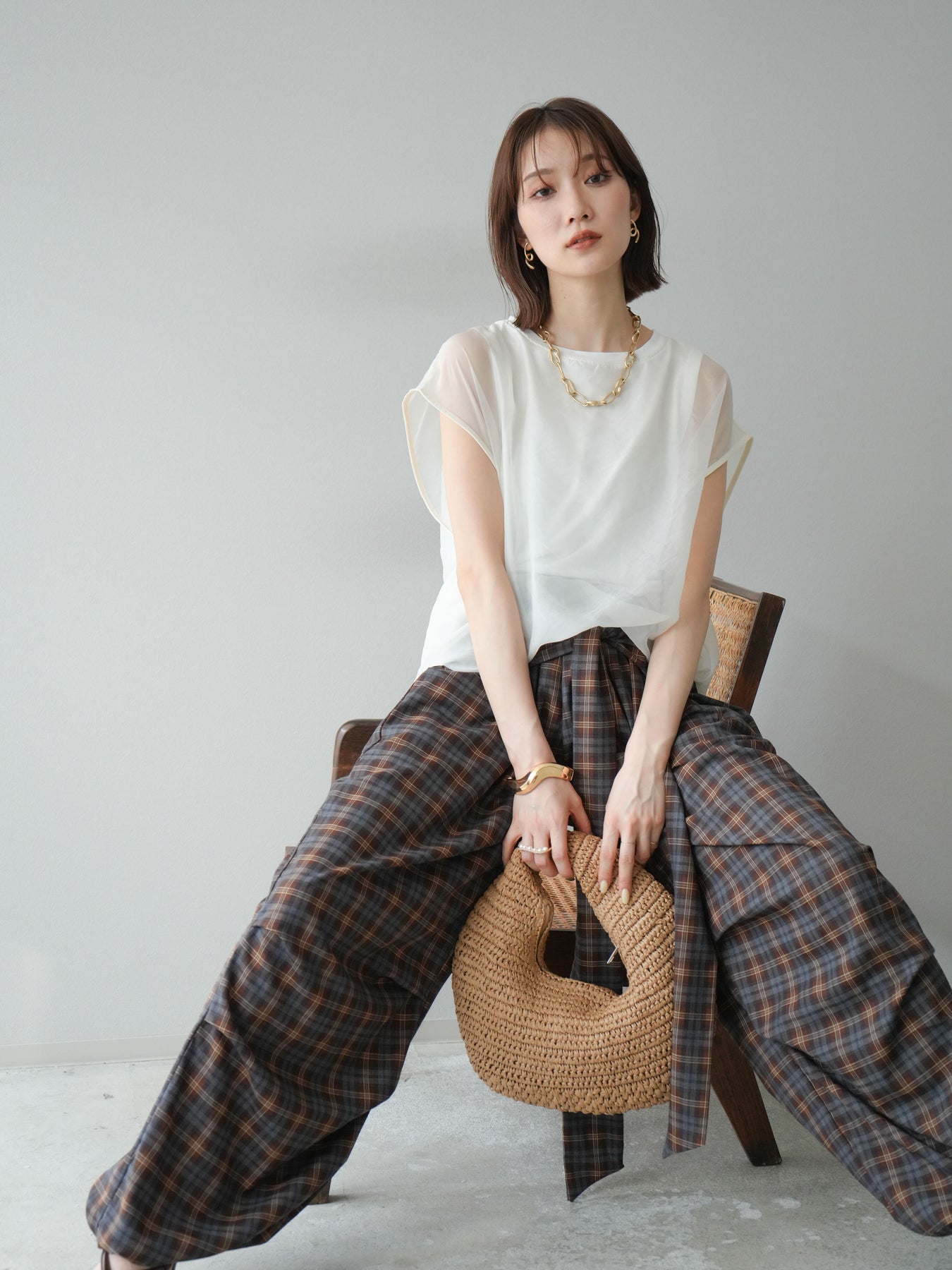 軽やかで透け感のあるシアー素材を重ねた、抜け感たっぷりのレイヤードトップス。程よくゆとりのあるシルエットで体のラインを拾わず、さらっと着るだけでこなれた印象に仕上がります。カットソー素材のインナー付きで、透け感を楽しみながらも安心して着用できるのも嬉しいポイント。デニムやスラックスなど、幅広いボトムスと好相性で、カジュアルにもモードにもマッチする万能アイテムです。 ※ボトムス、キャミソール(インナー)以外の商品は一律でインナーは付属していません。