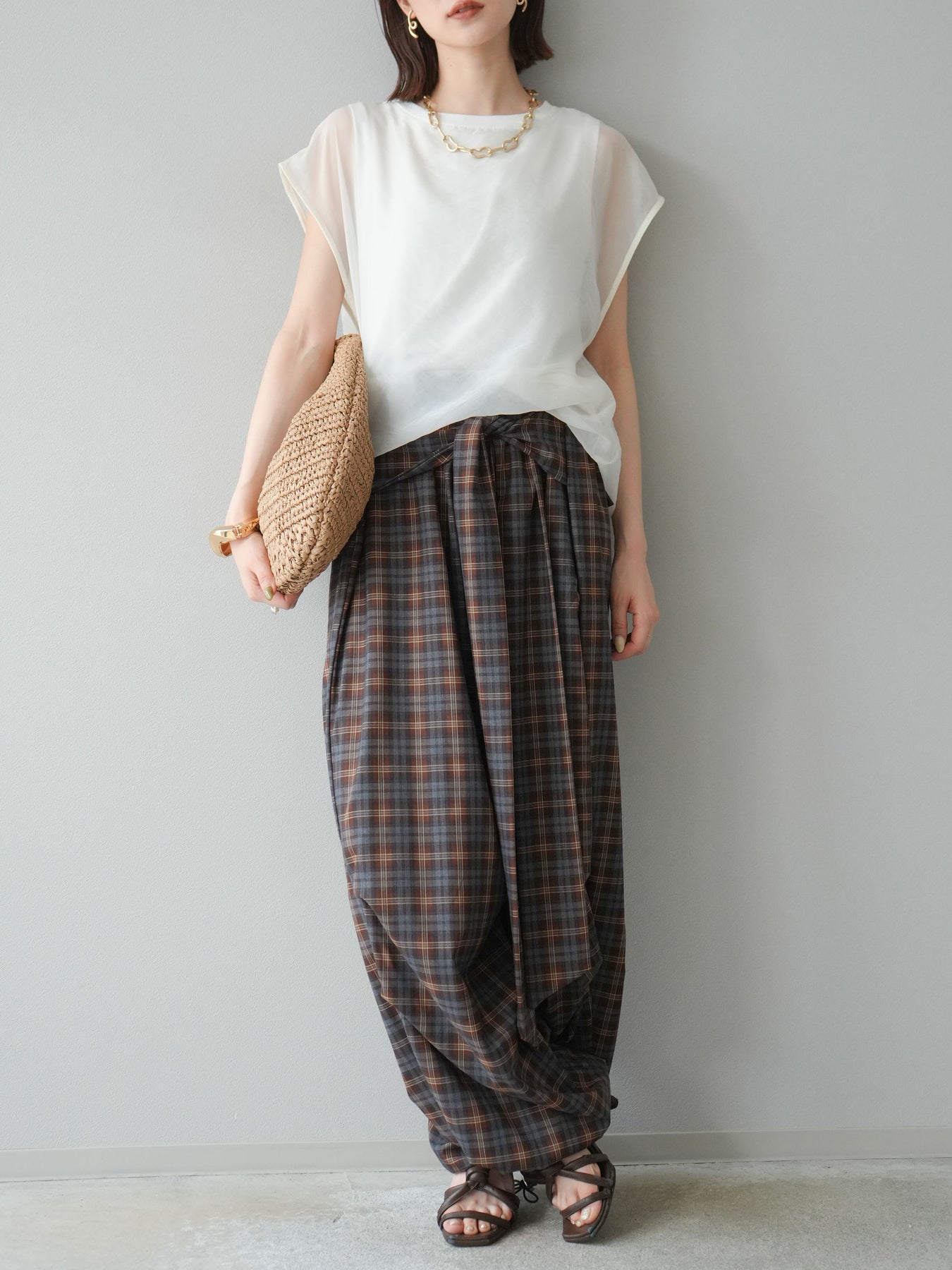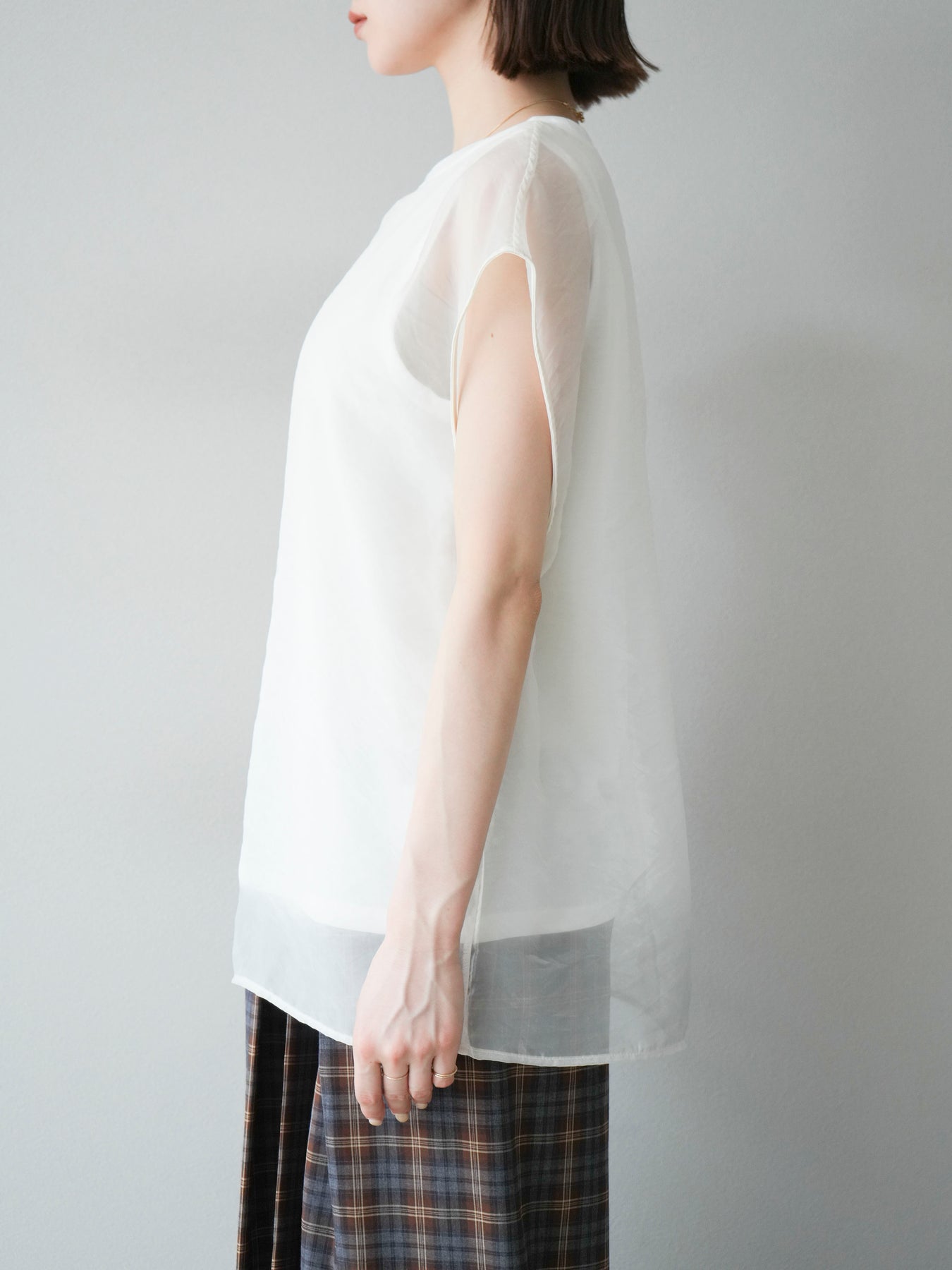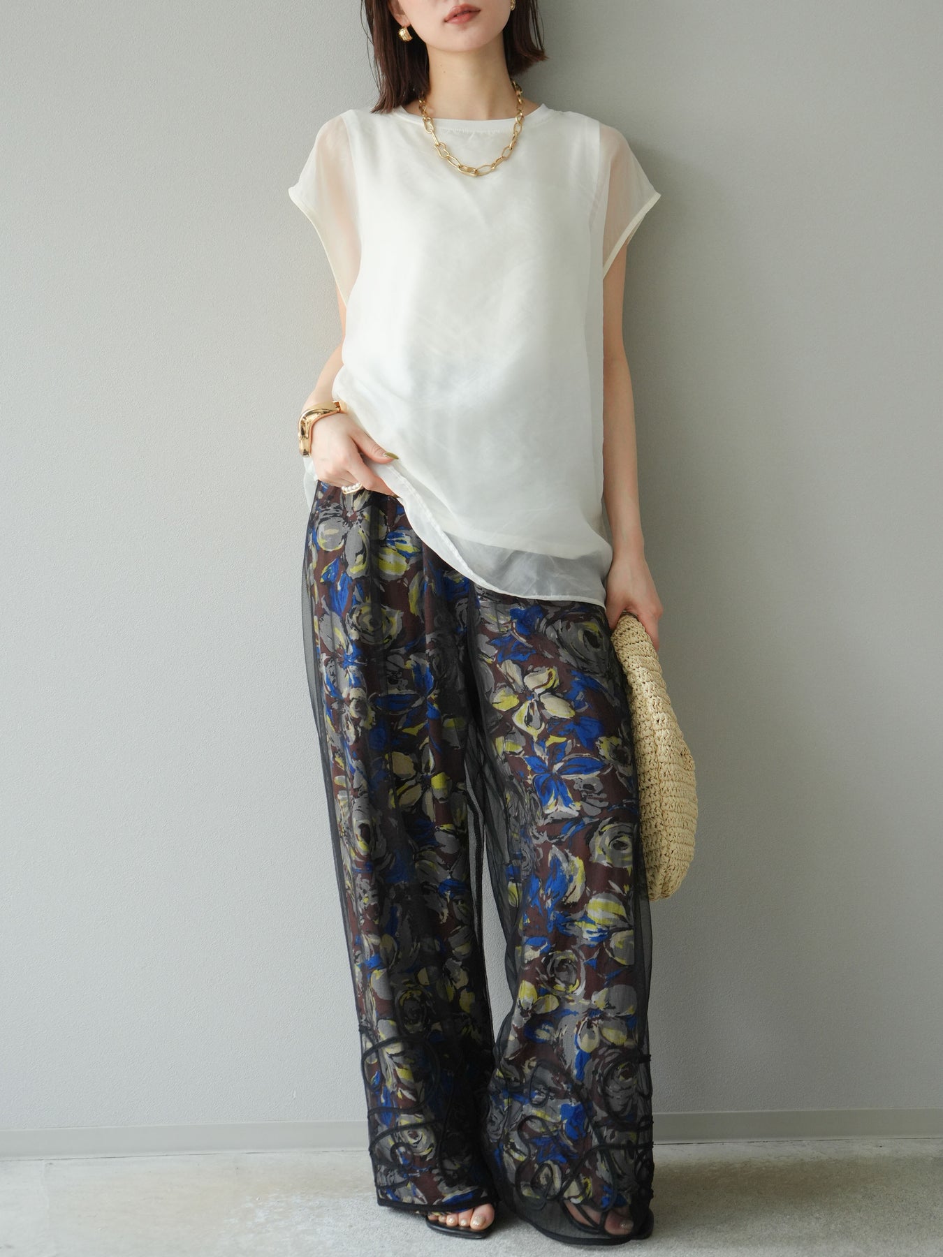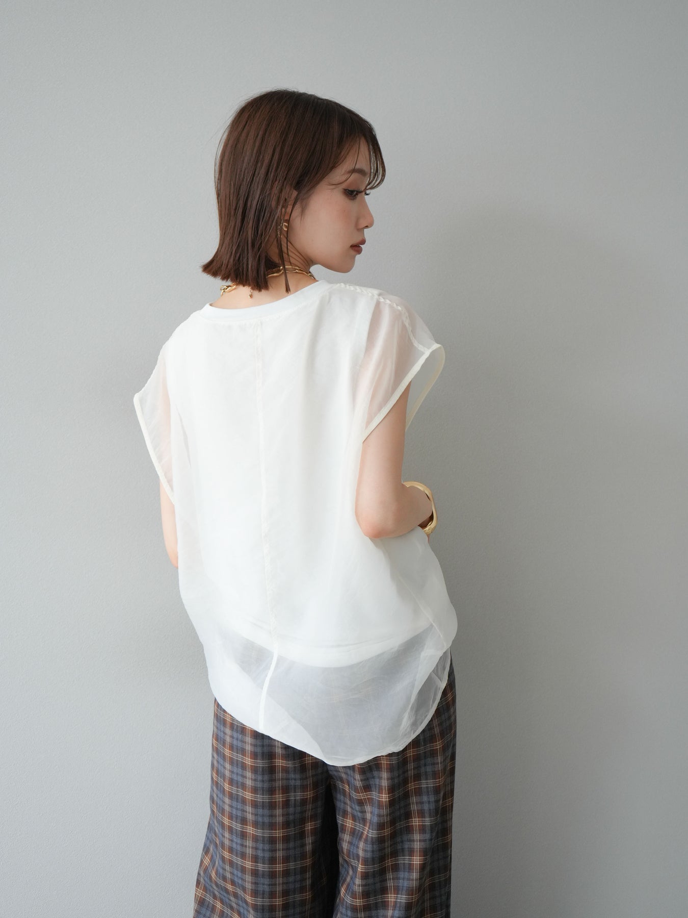 軽やかで透け感のあるシアー素材を重ねた、抜け感たっぷりのレイヤードトップス。程よくゆとりのあるシルエットで体のラインを拾わず、さらっと着るだけでこなれた印象に仕上がります。カットソー素材のインナー付きで、透け感を楽しみながらも安心して着用できるのも嬉しいポイント。デニムやスラックスなど、幅広いボトムスと好相性で、カジュアルにもモードにもマッチする万能アイテムです。 ※ボトムス、キャミソール(インナー)以外の商品は一律でインナーは付属していません。
